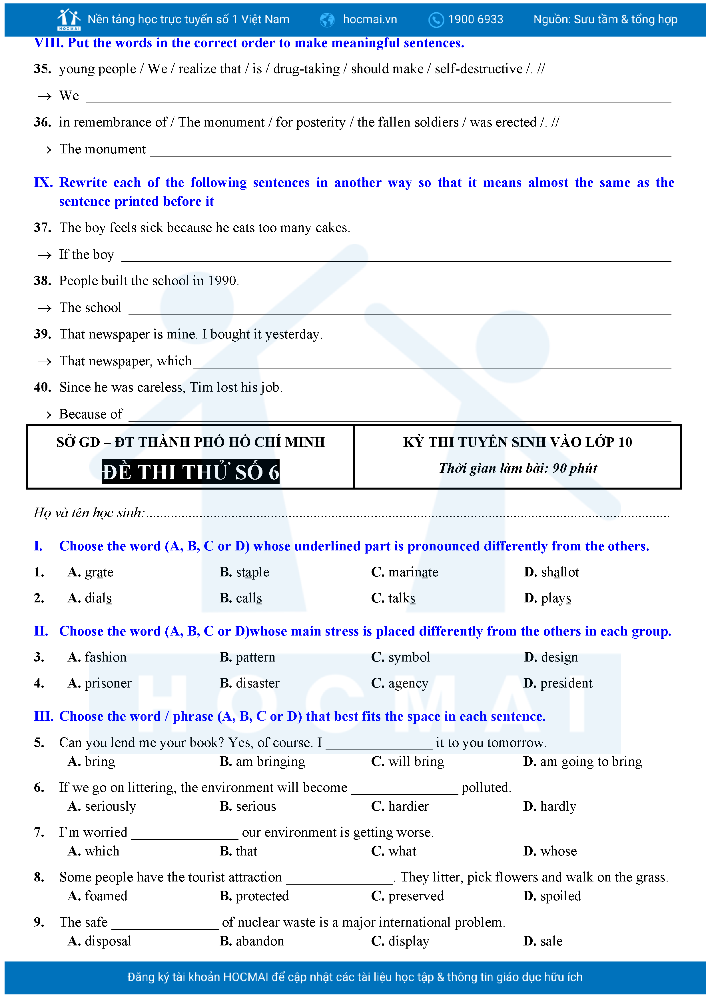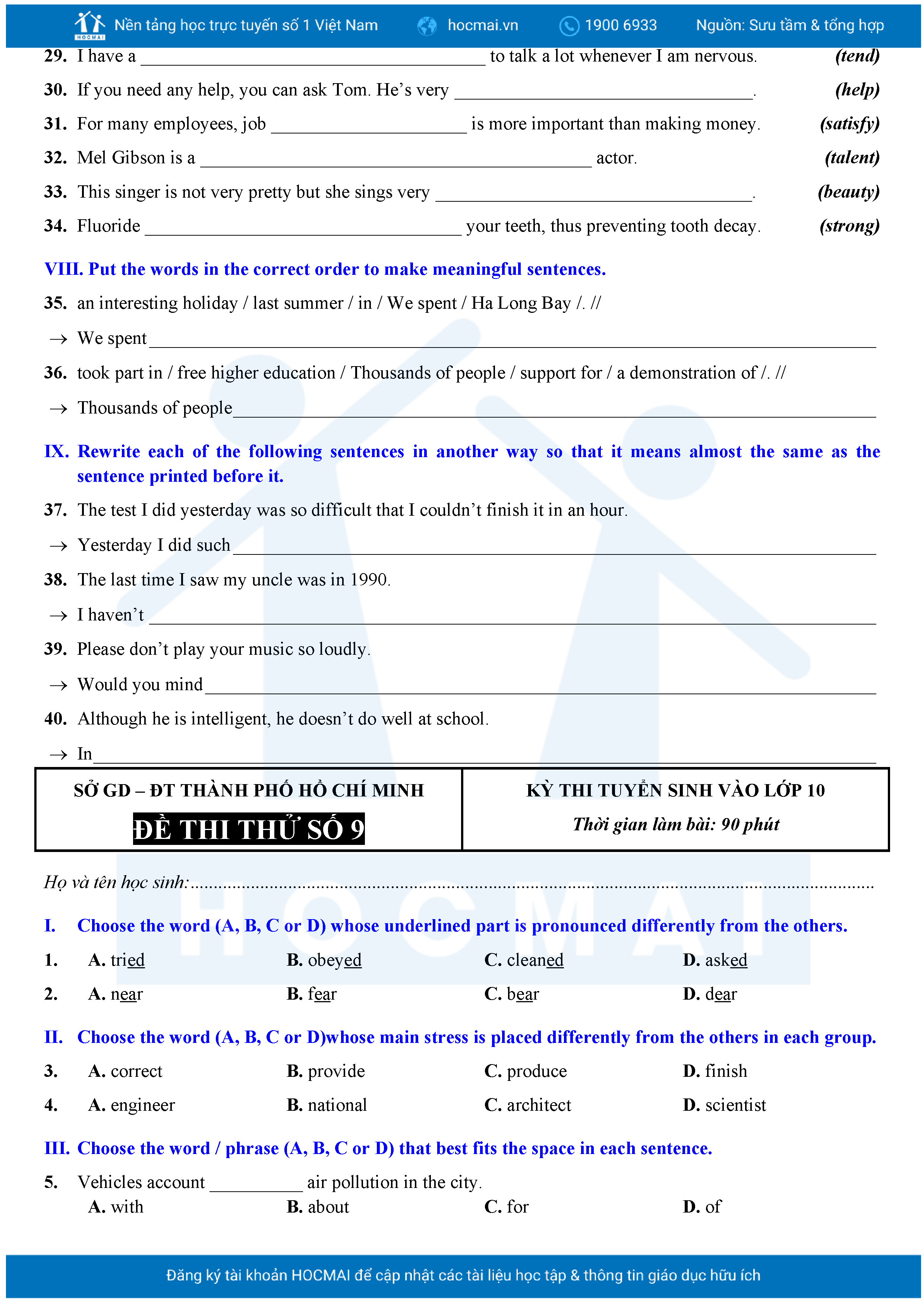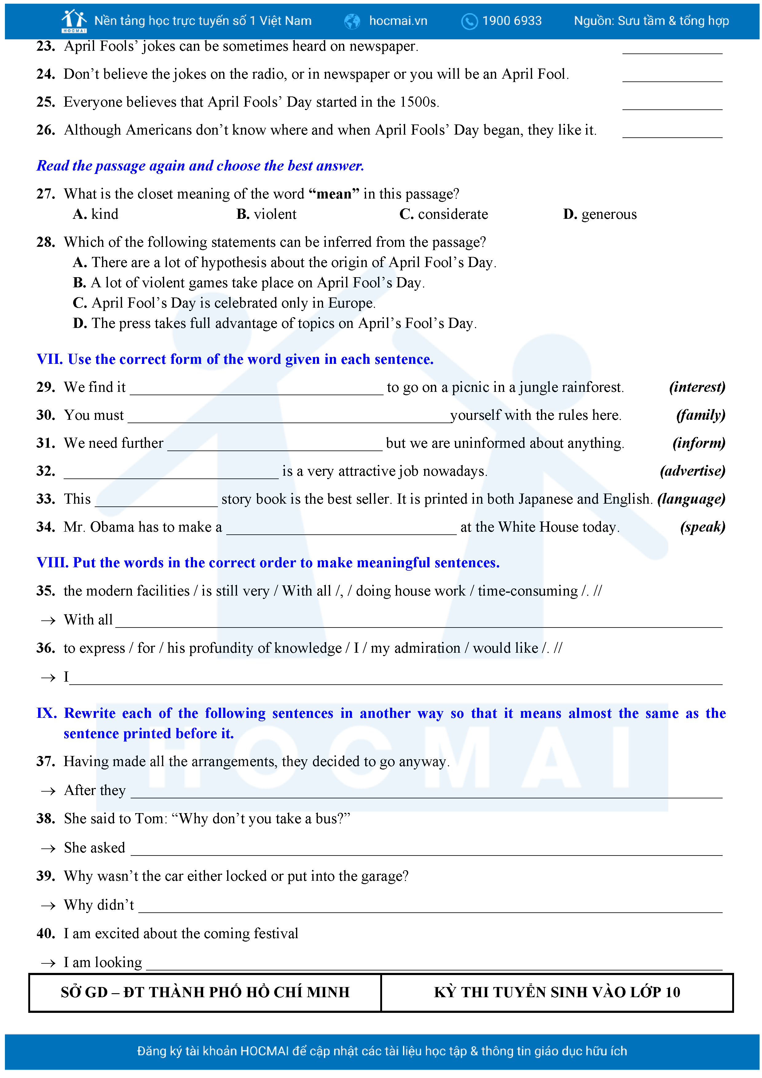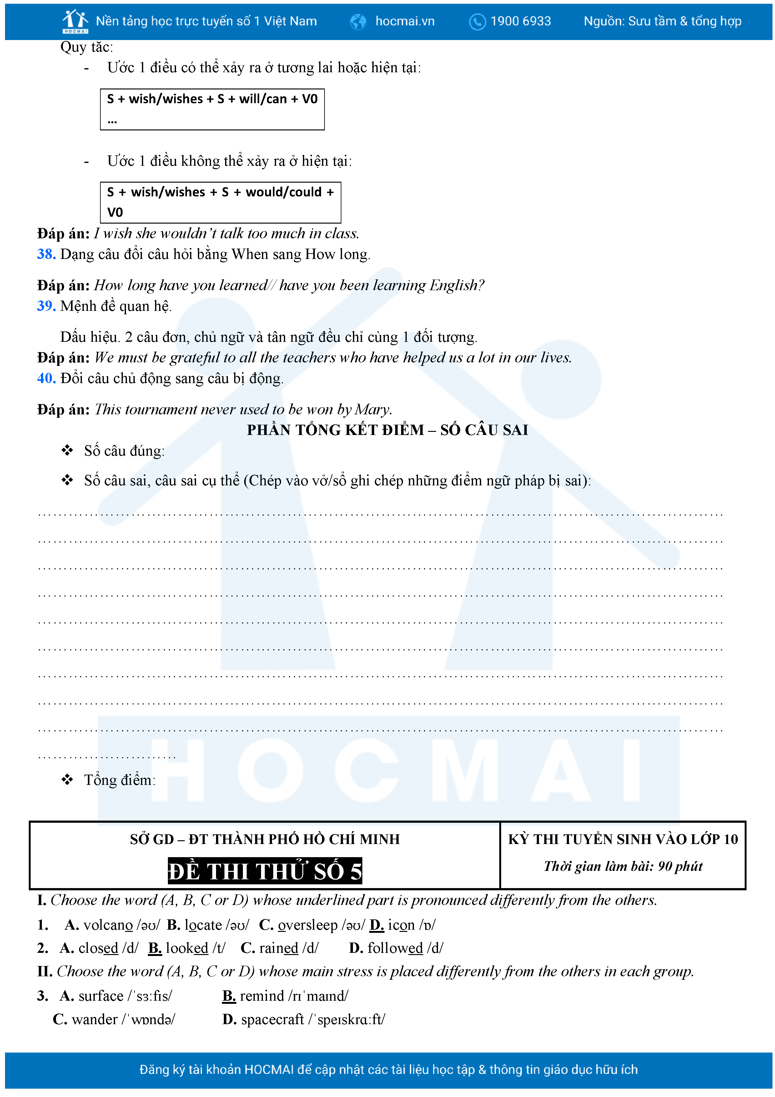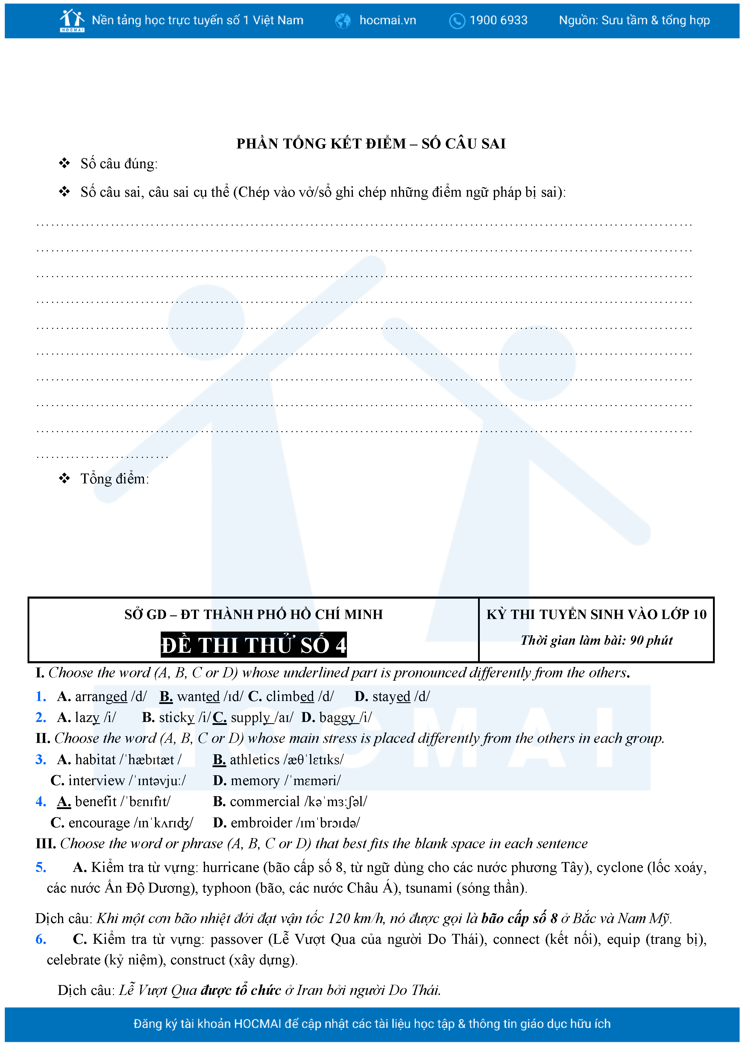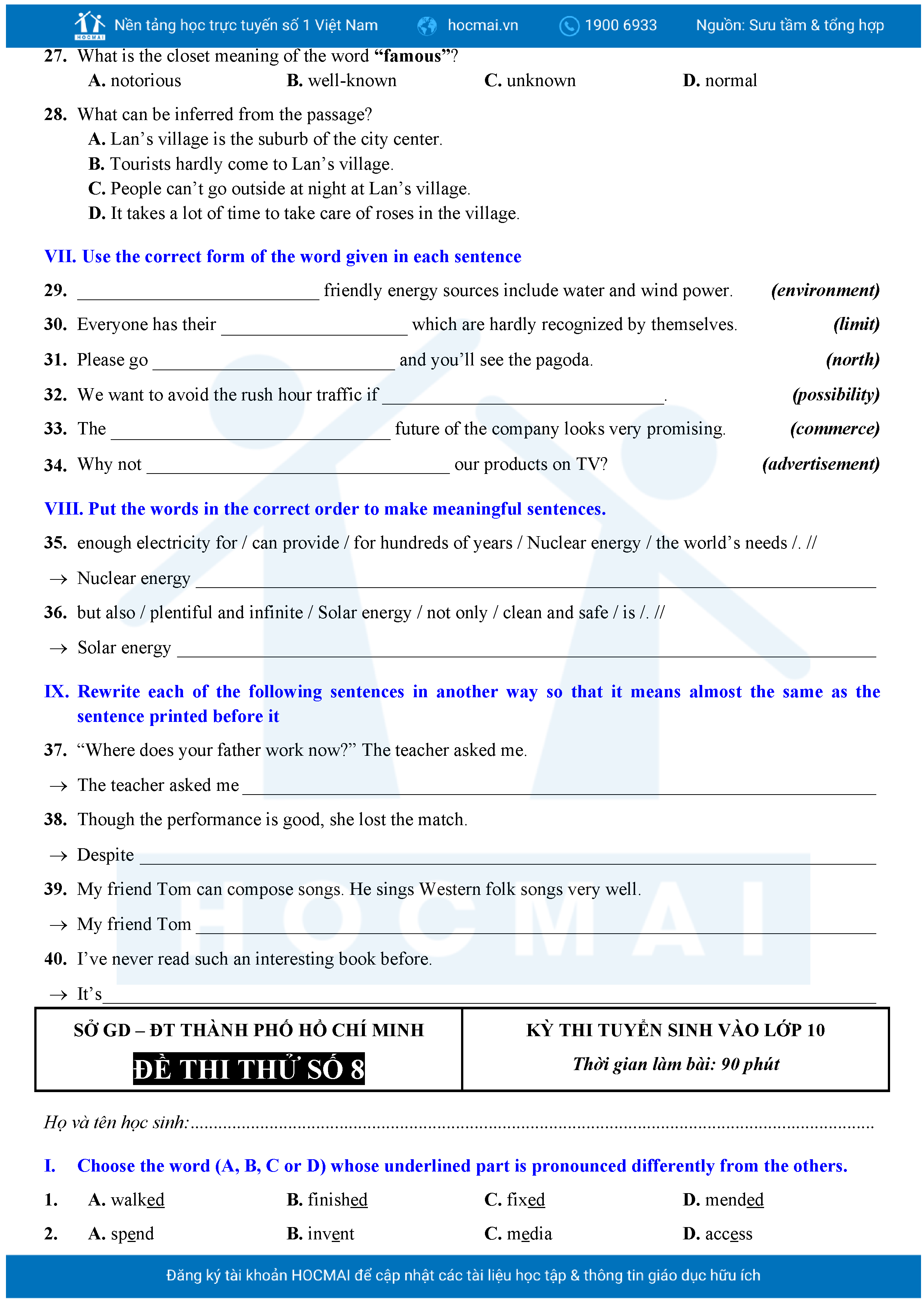 Bộ 10 đề Tiếng Anh ôn thi vào 10 TPHCM kèm lời giải.