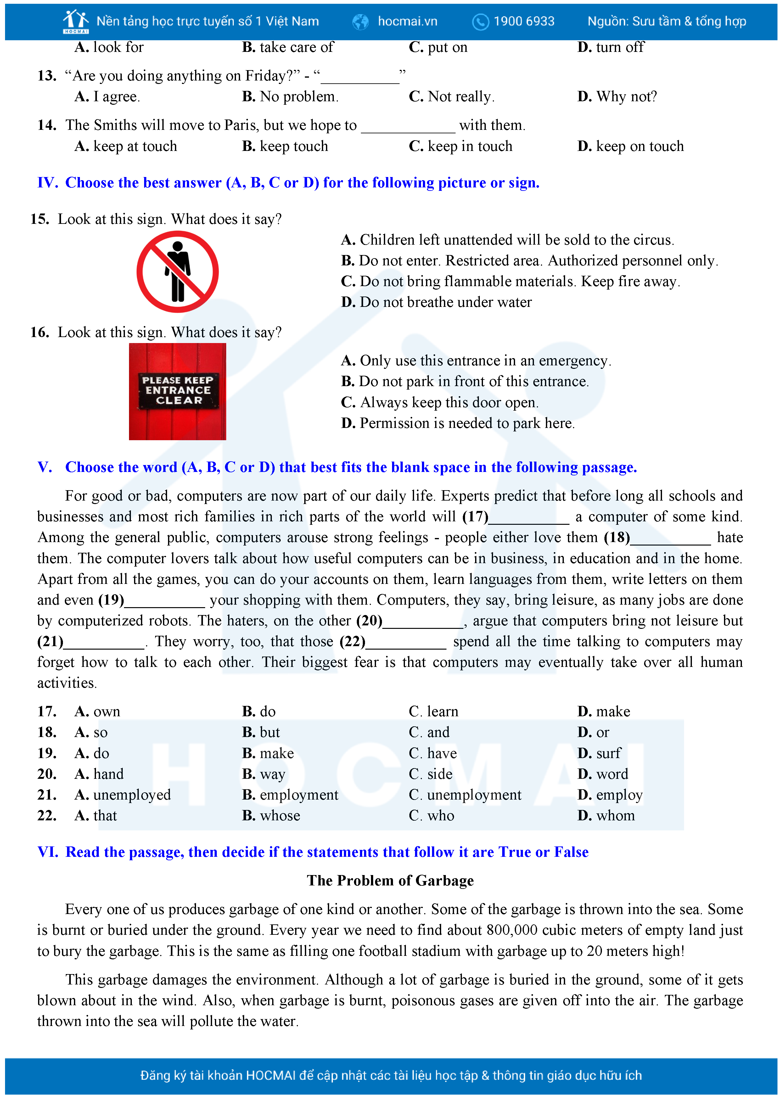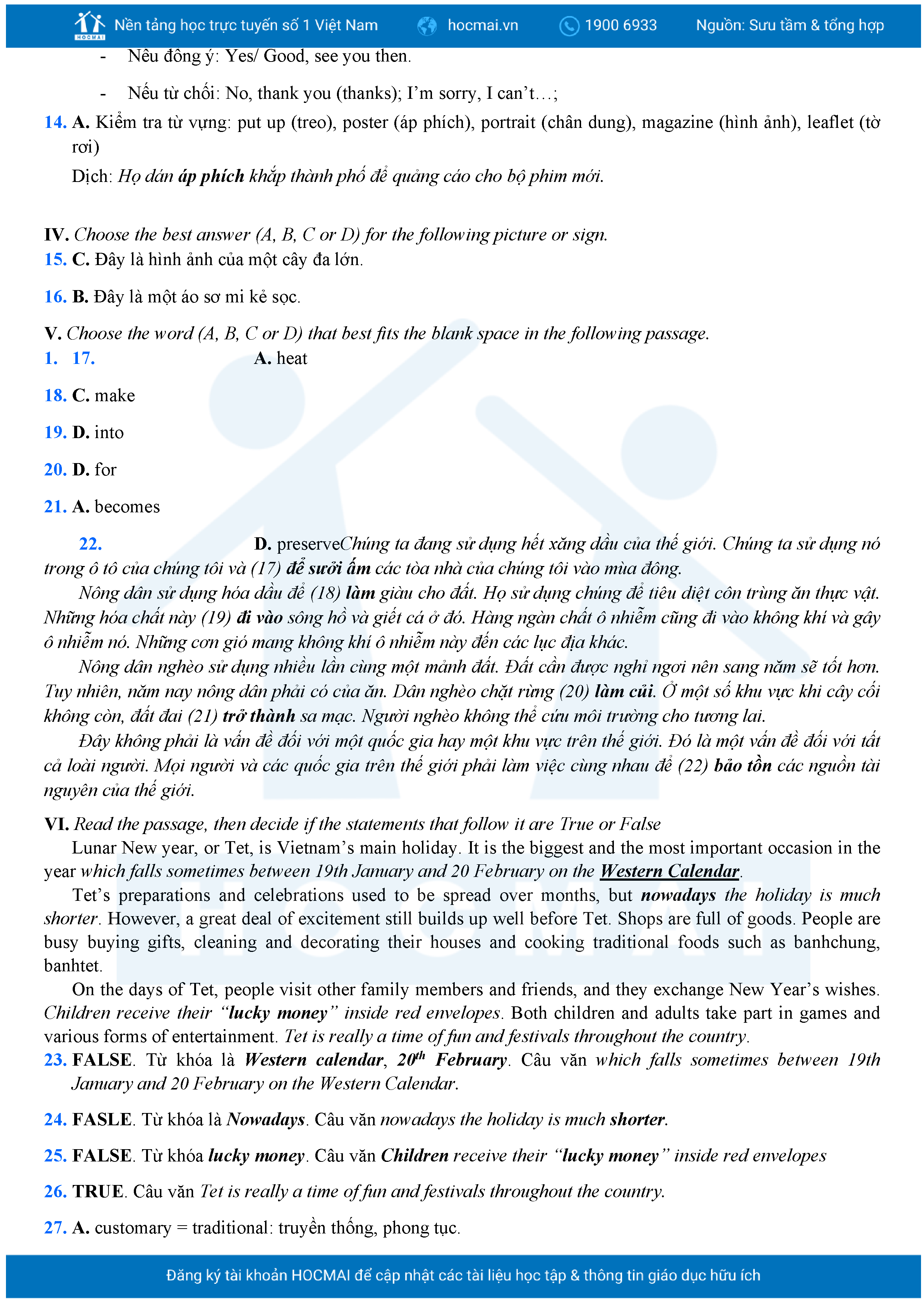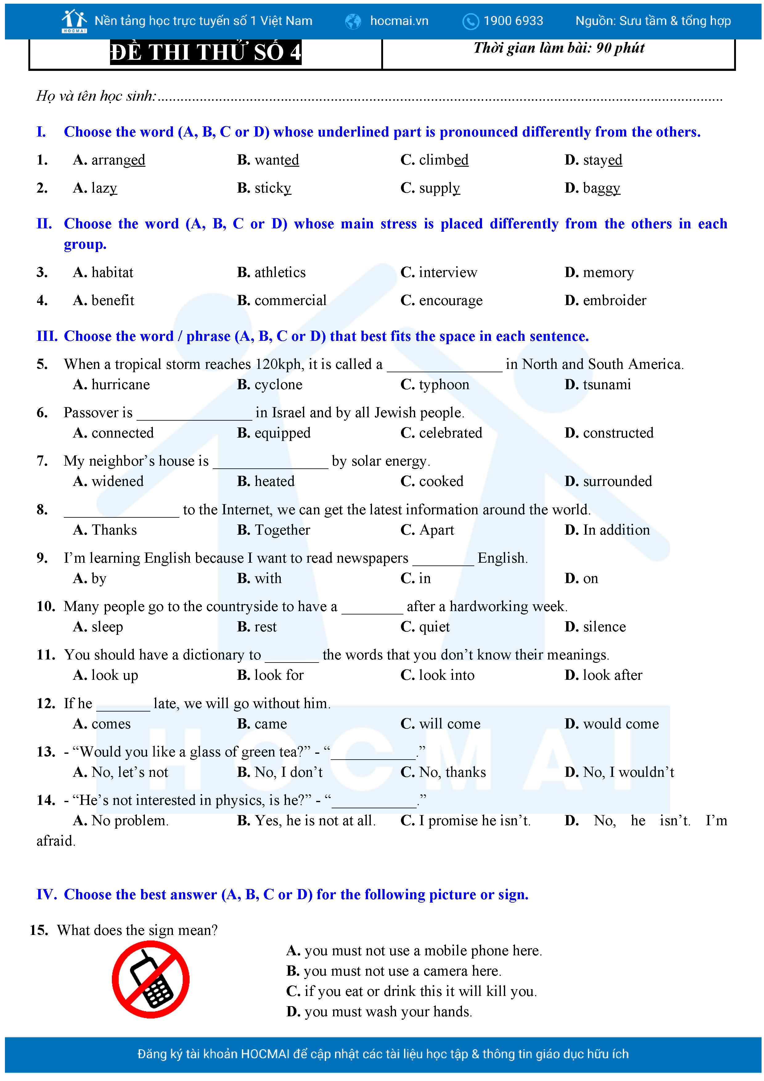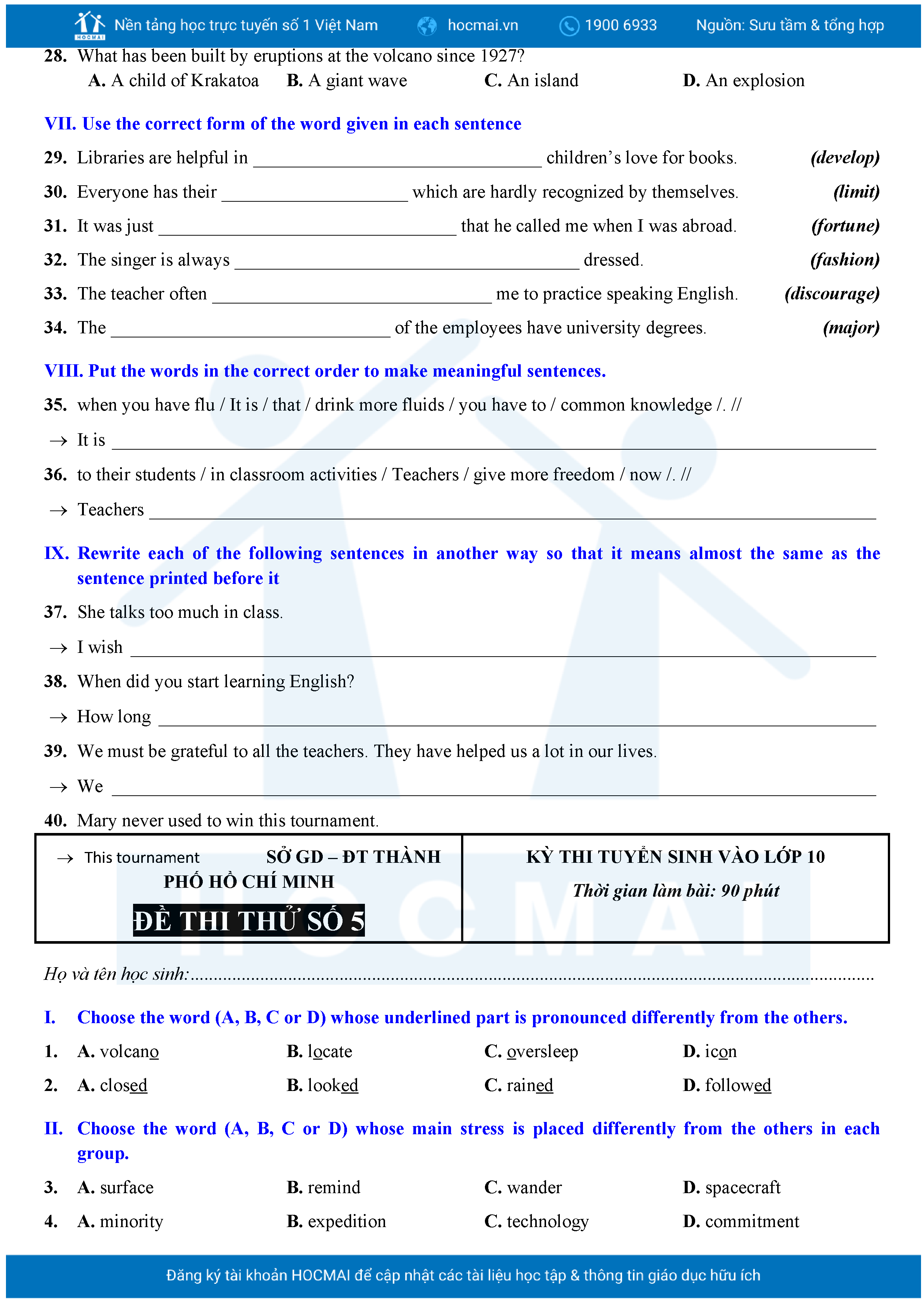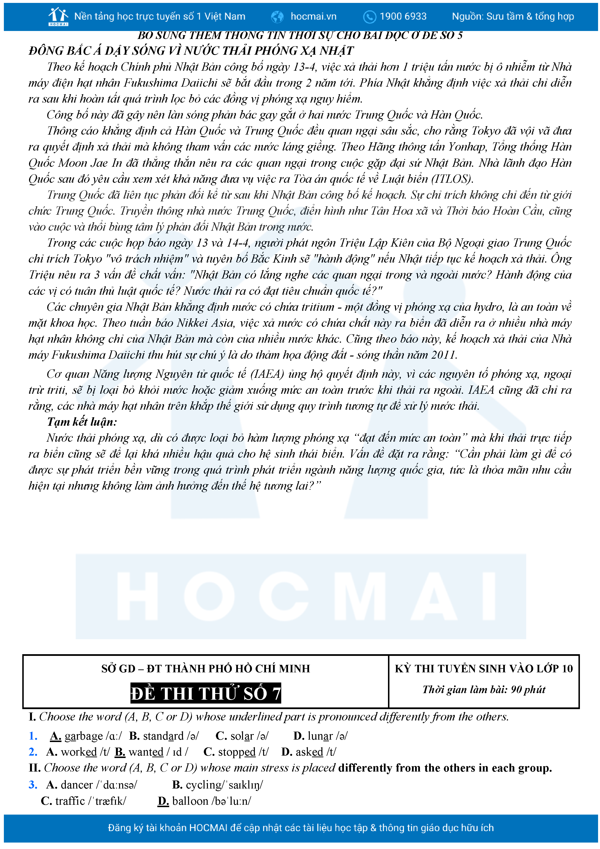 Bộ 10 đề Tiếng Anh ôn thi vào 10 TPHCM kèm lời giải.