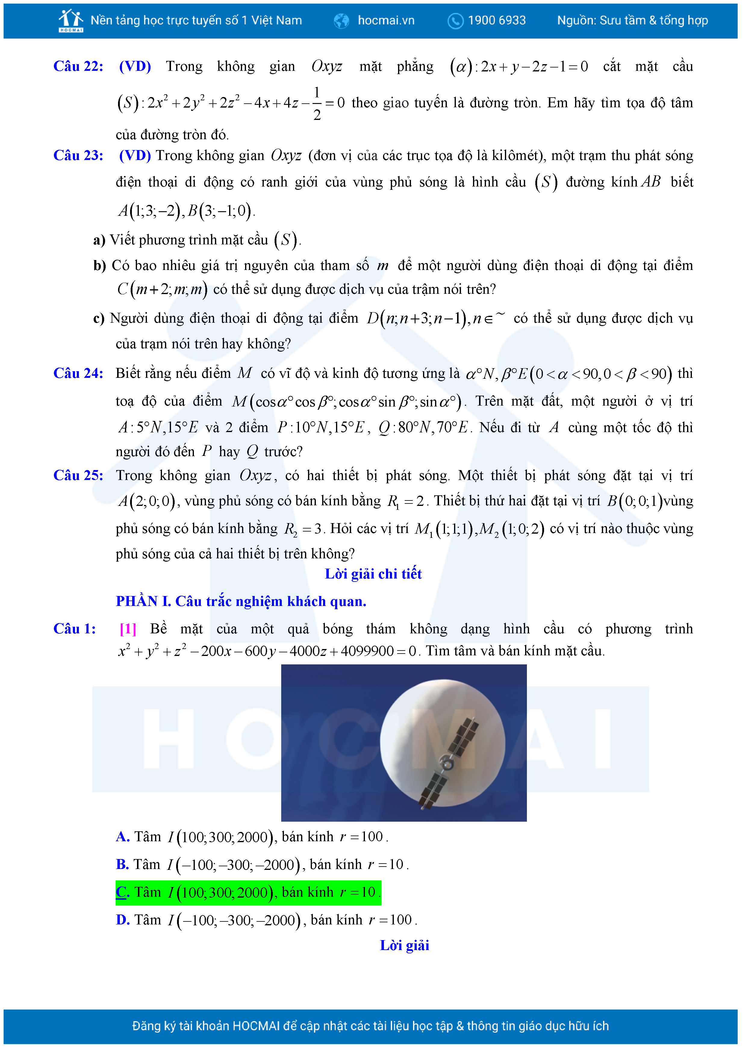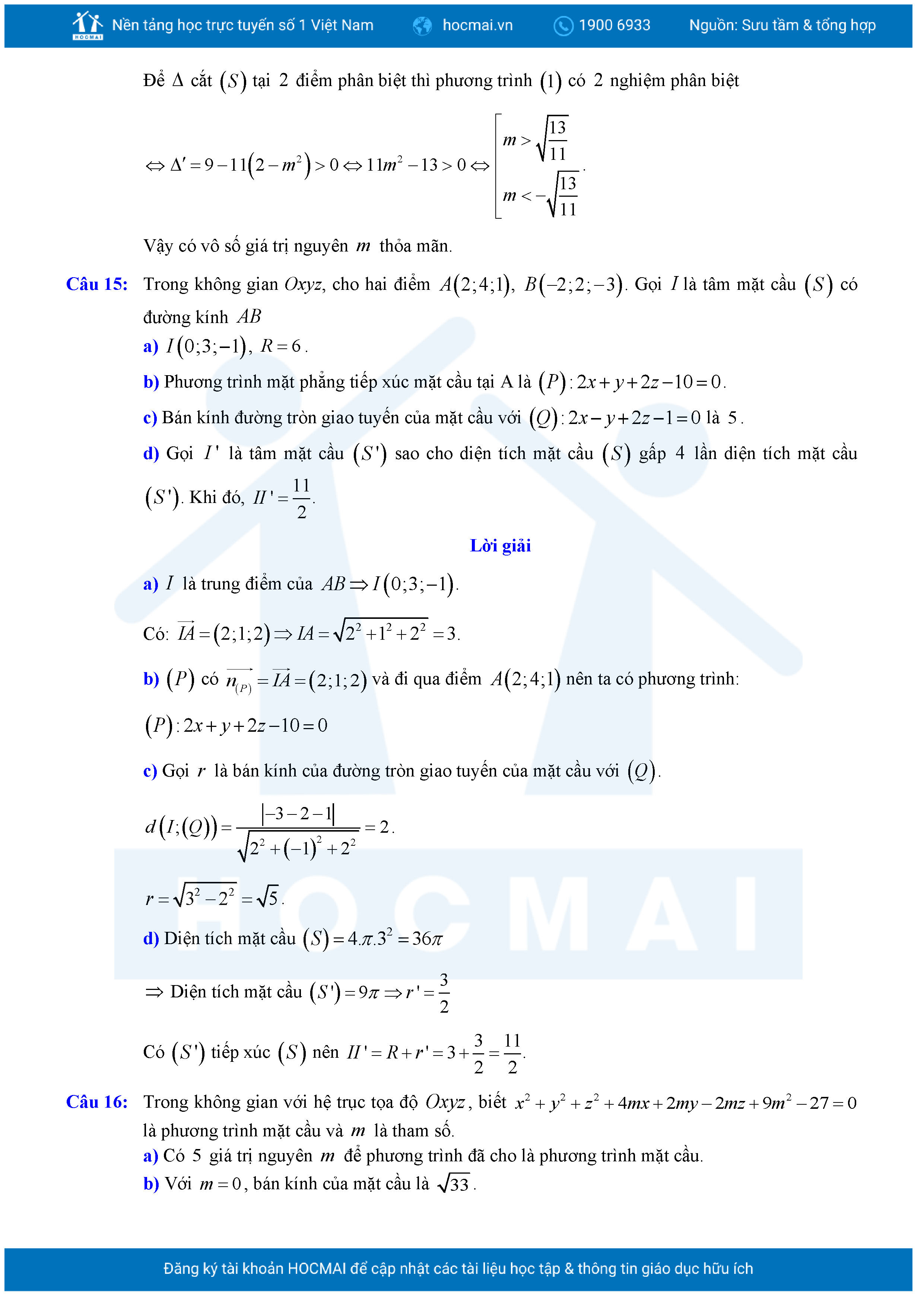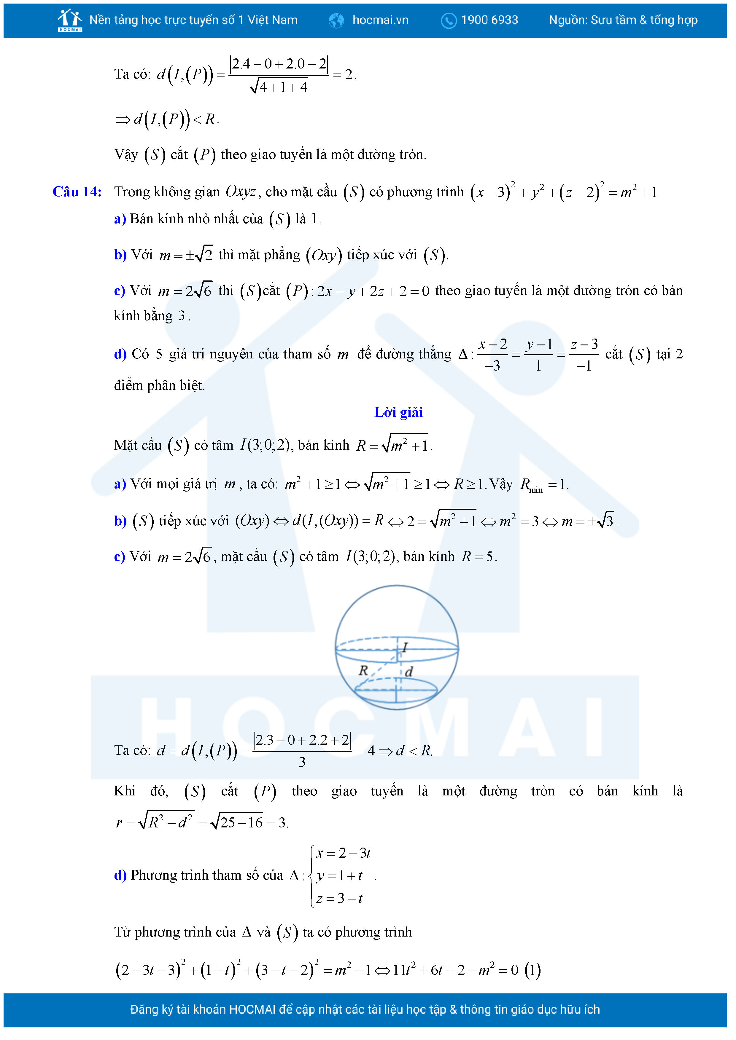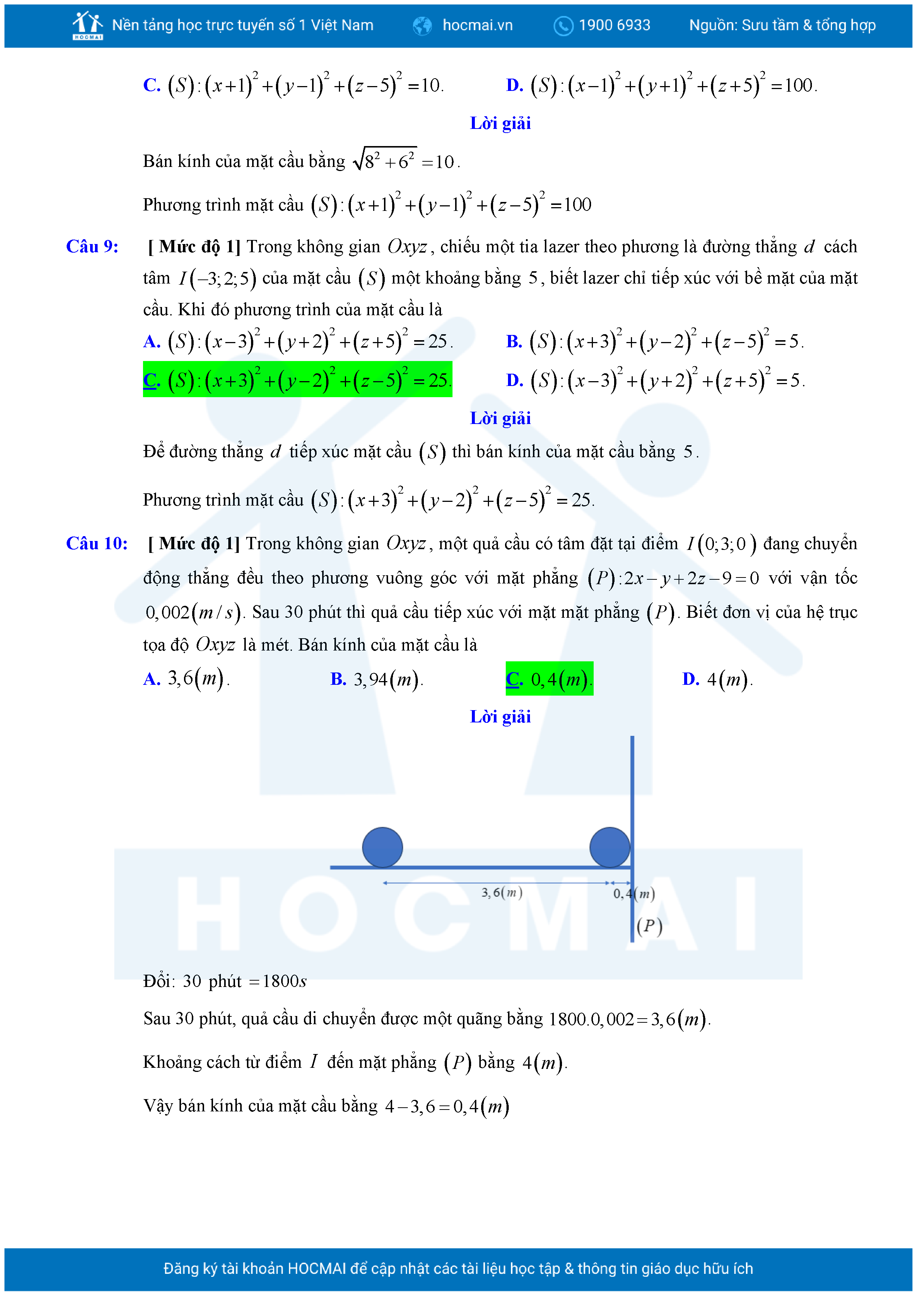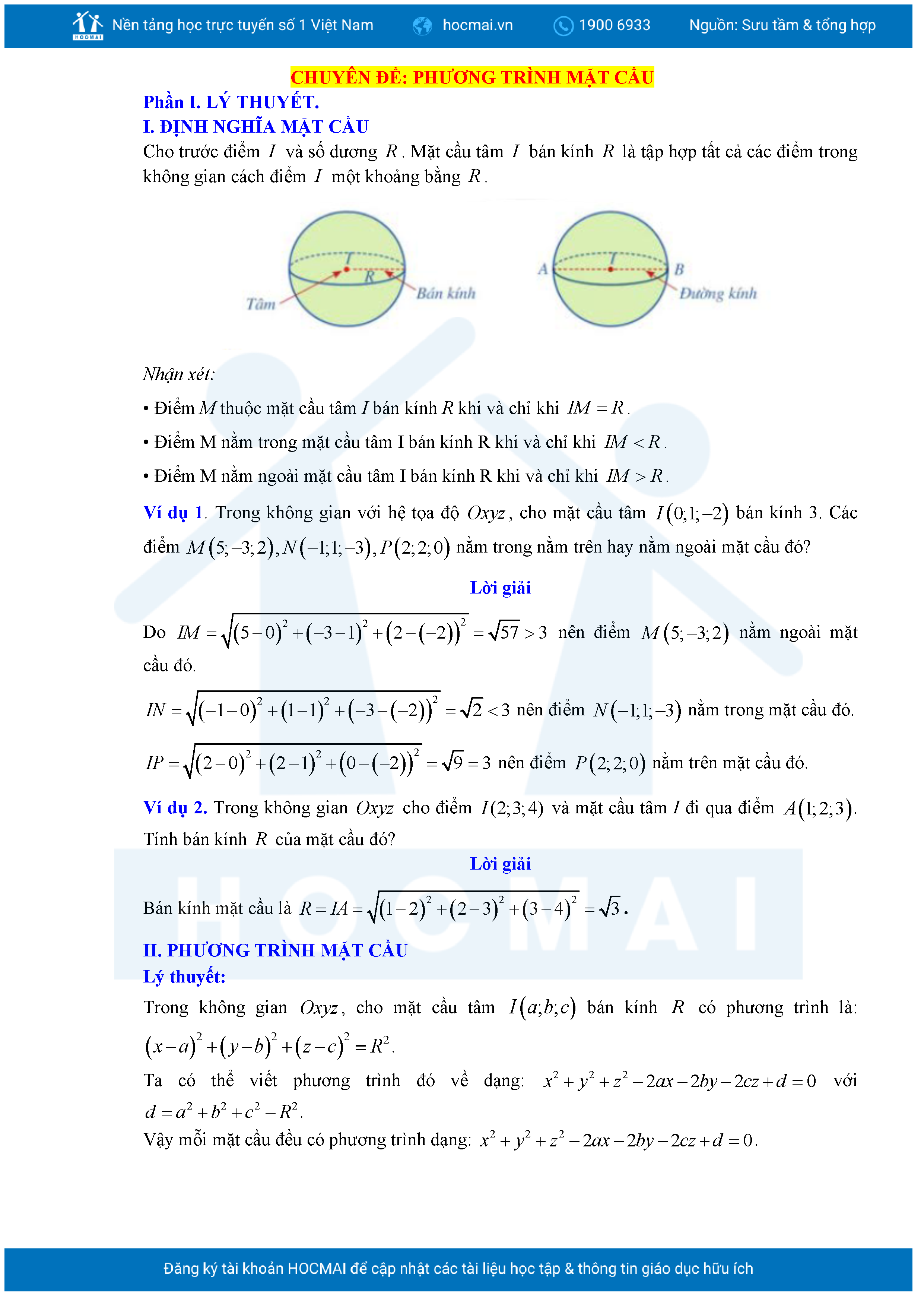 Chuyên đề Phương trình mặt cầu ôn thi tốt nghiệp THPT giải chi tiết