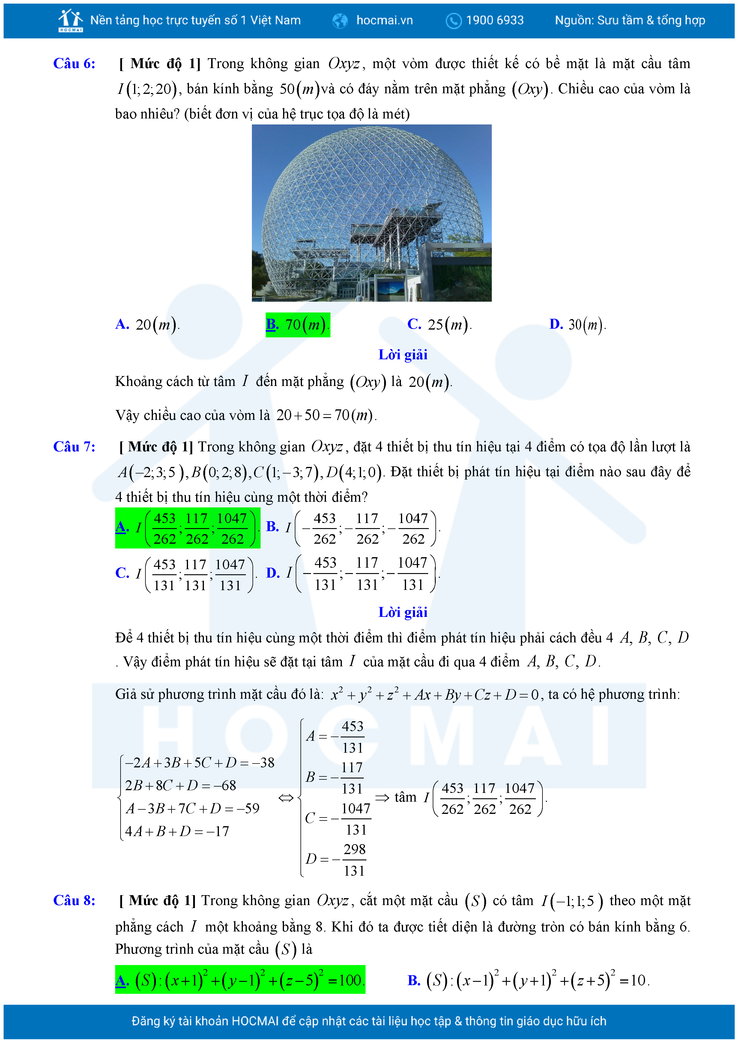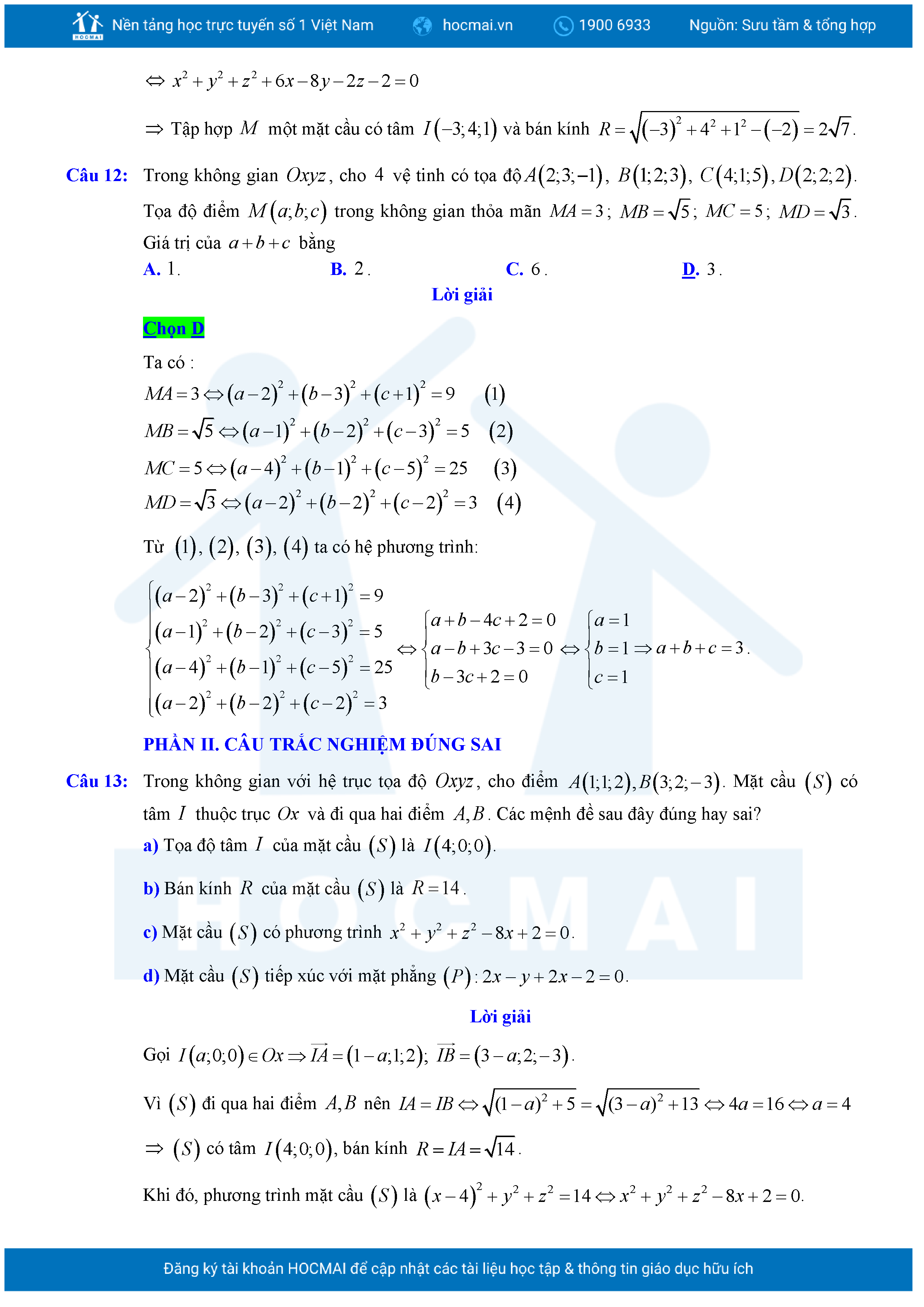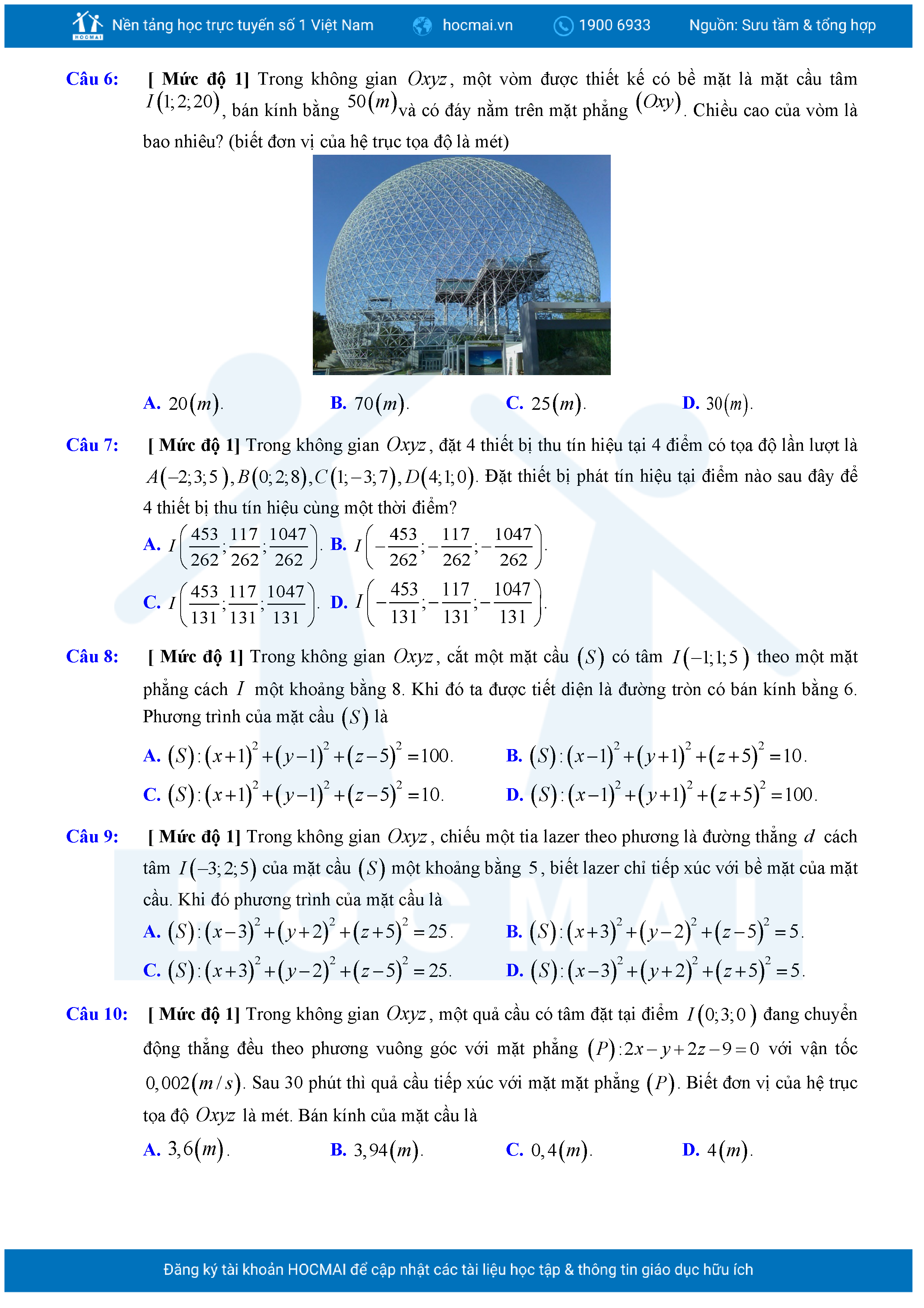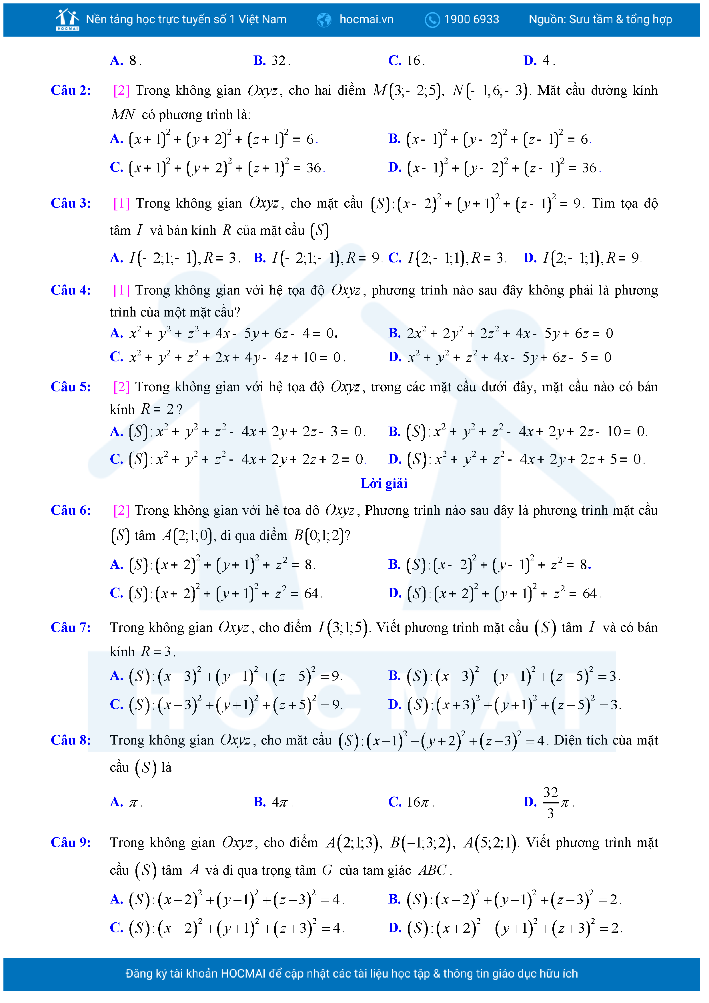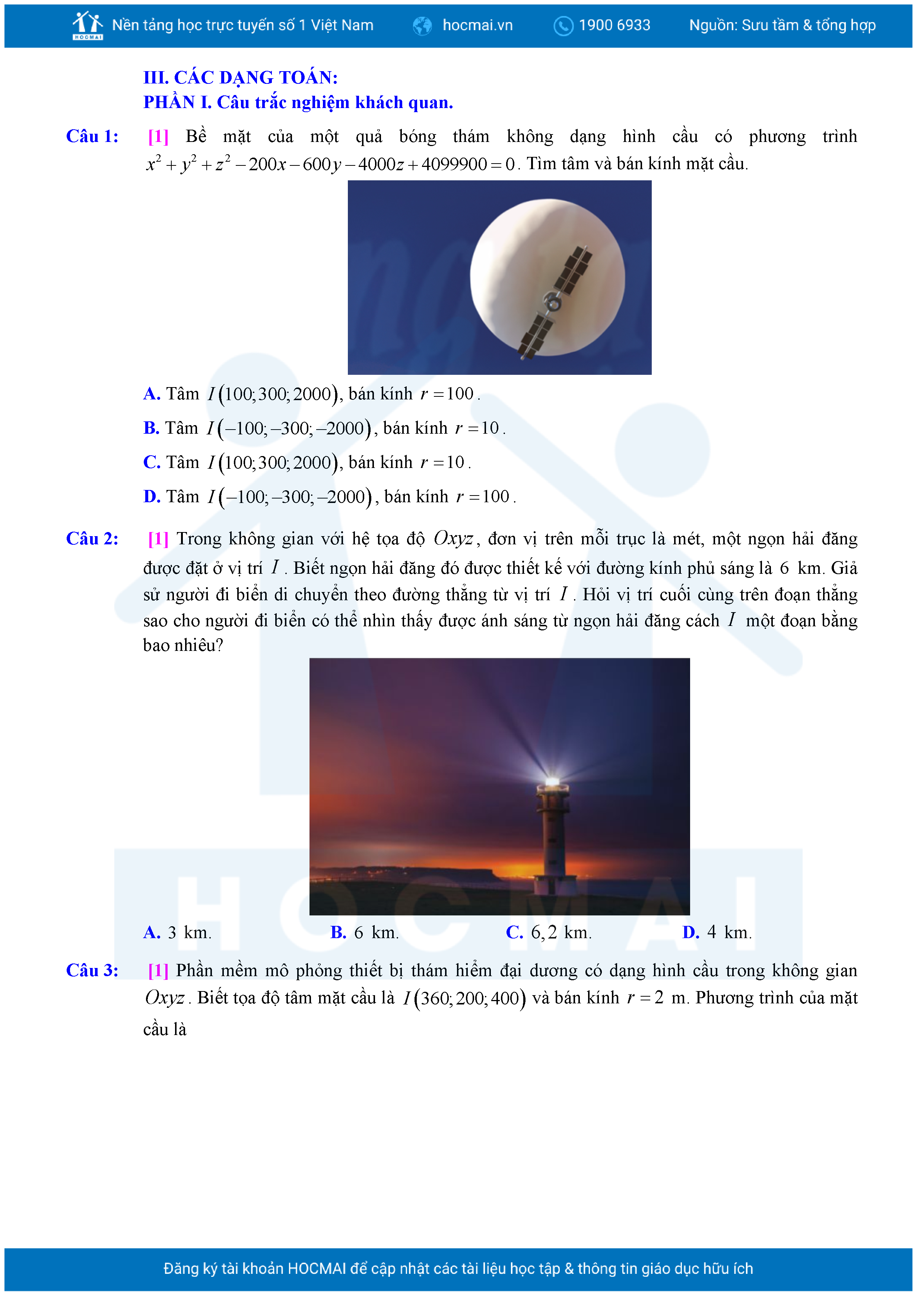Chuyên đề Phương trình mặt cầu ôn thi tốt nghiệp THPT giải chi tiết