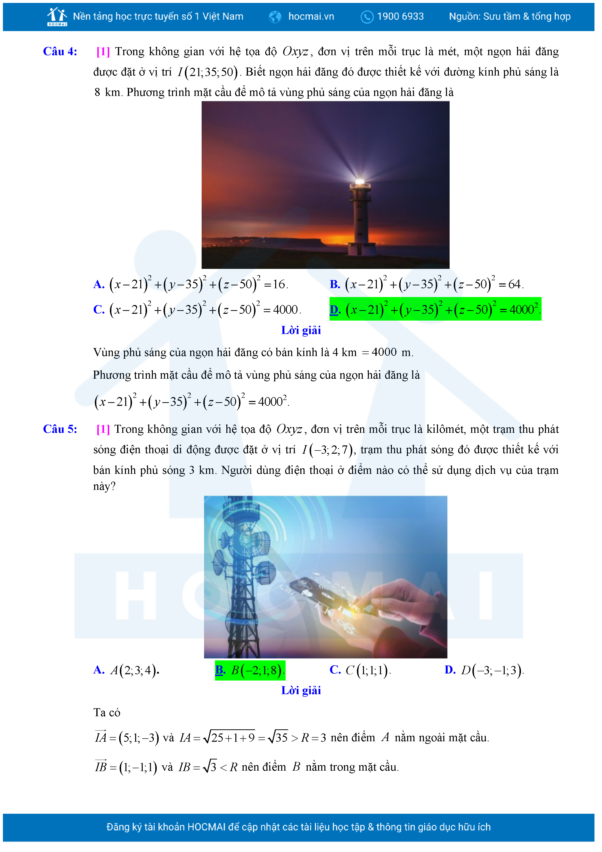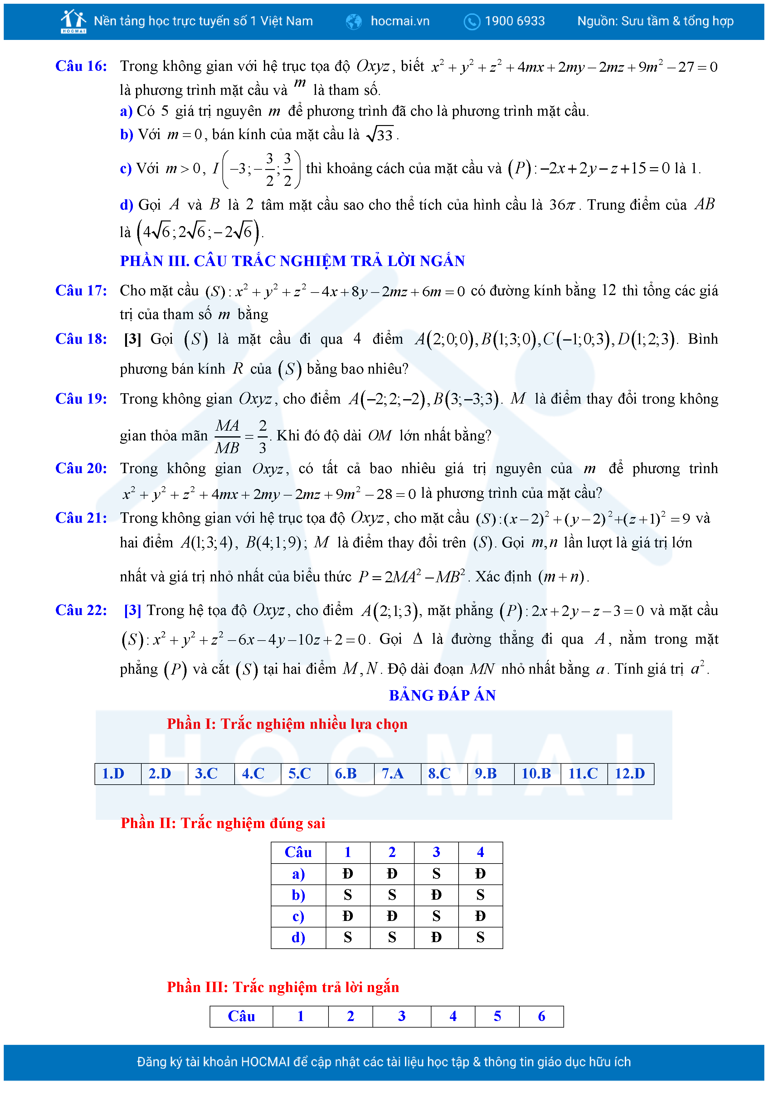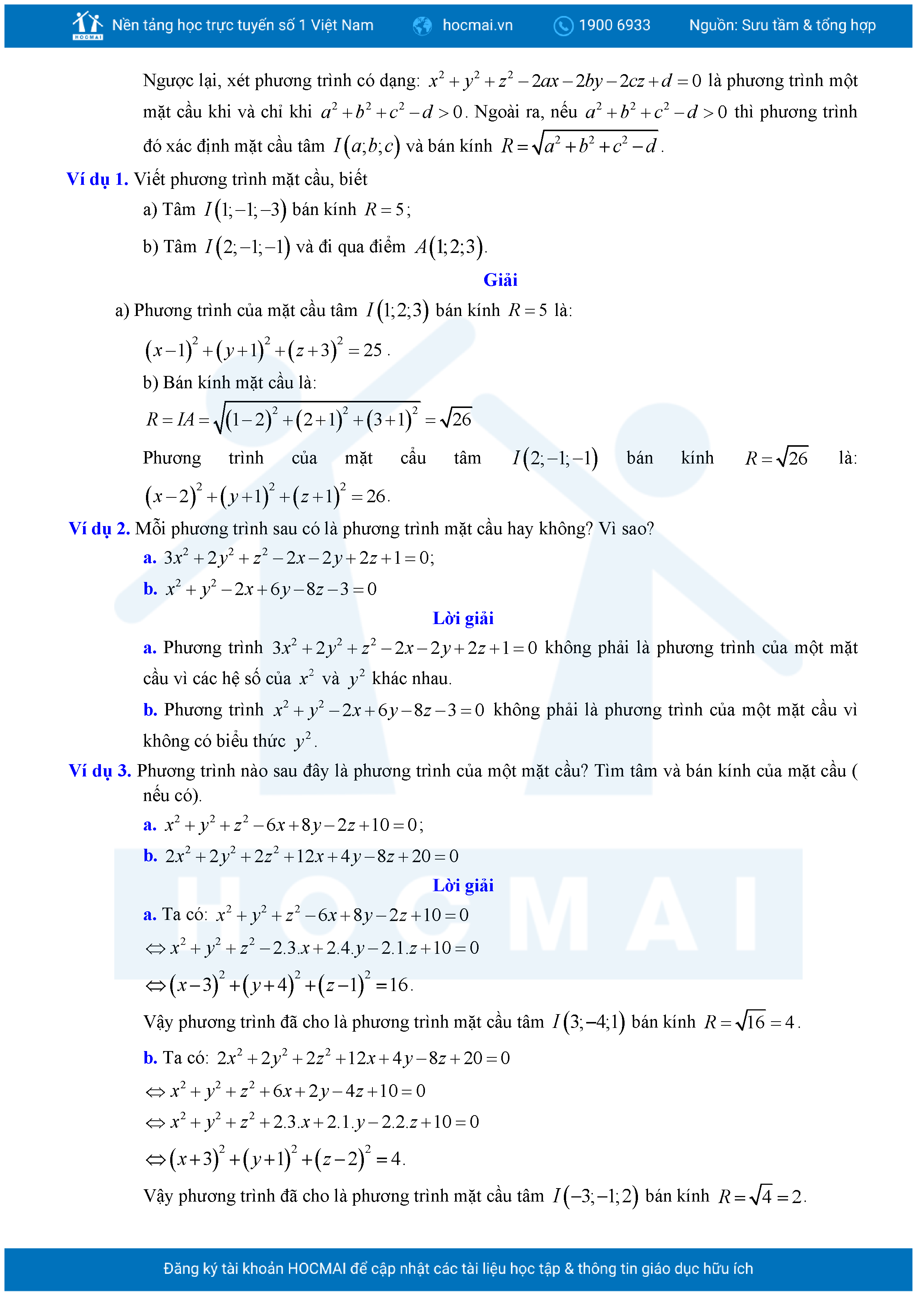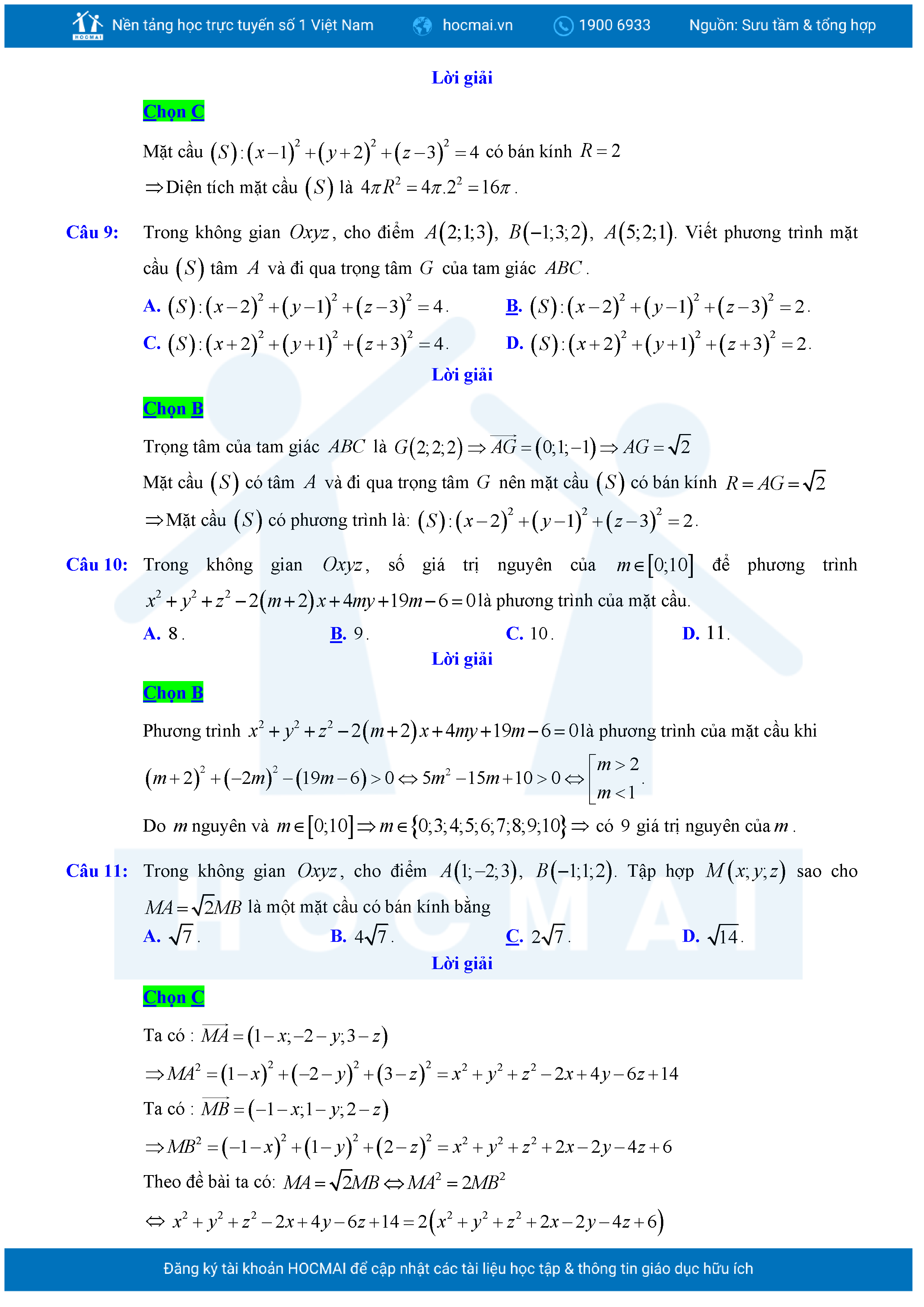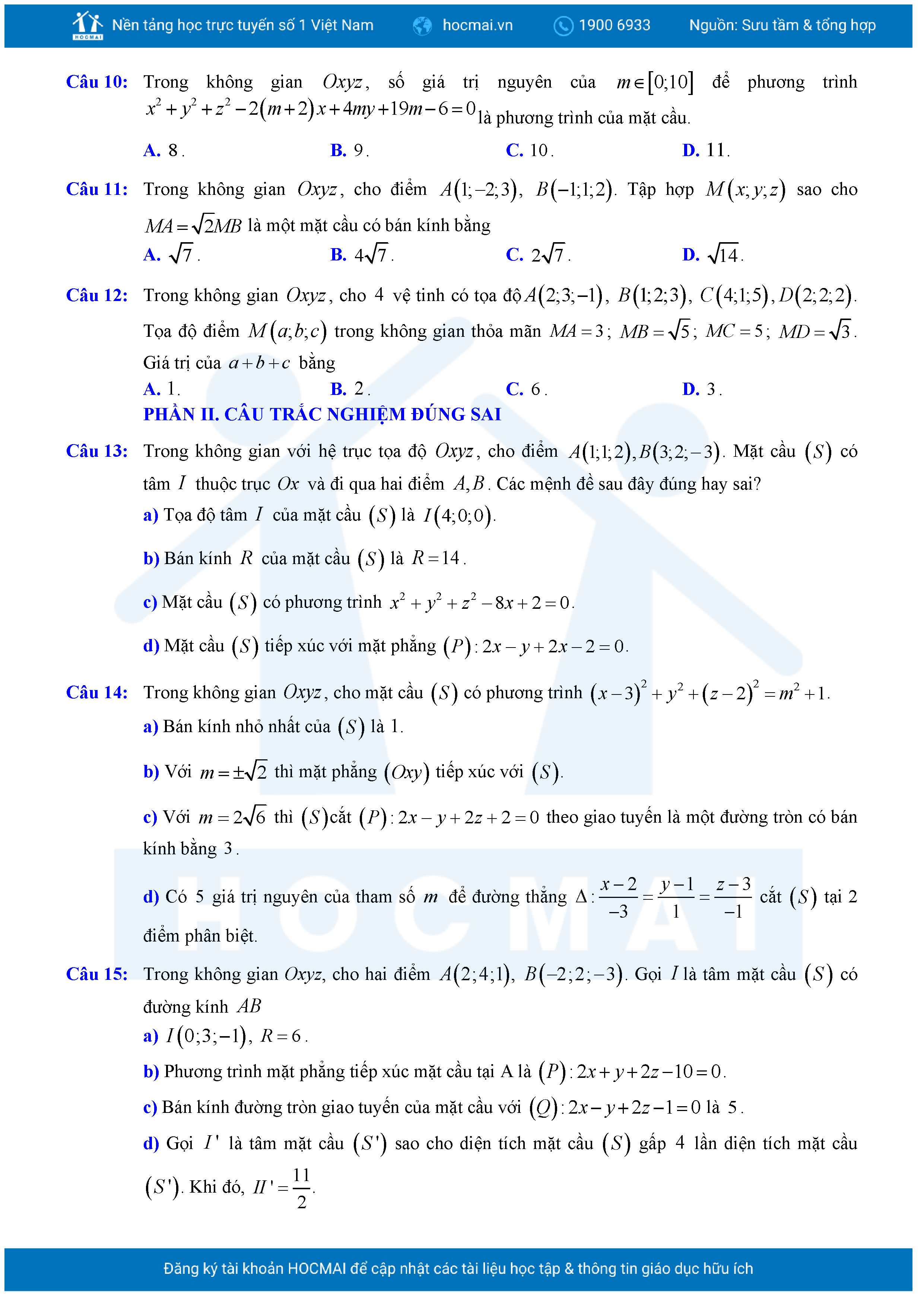 Chuyên đề Phương trình mặt cầu ôn thi tốt nghiệp THPT giải chi tiết