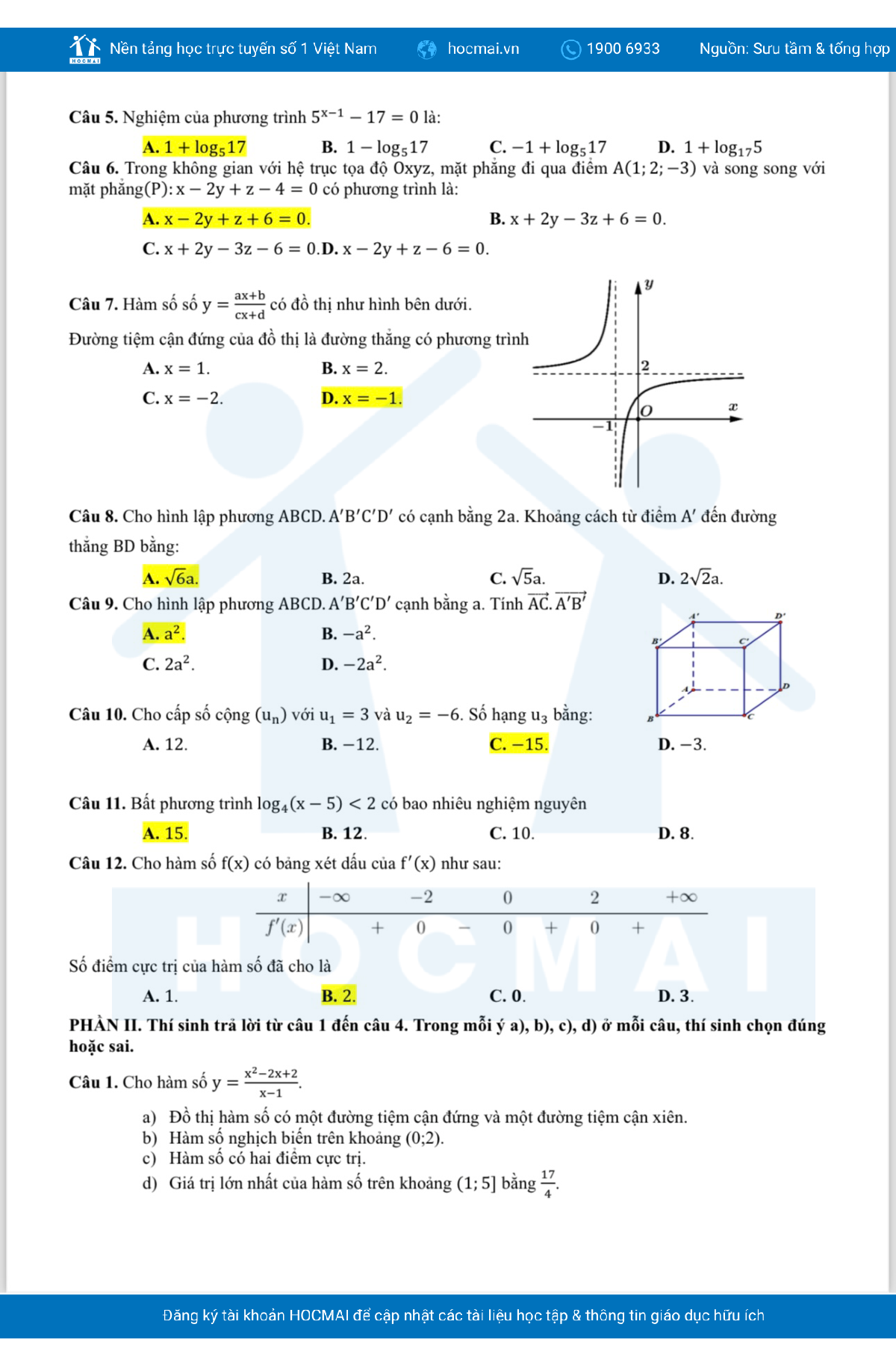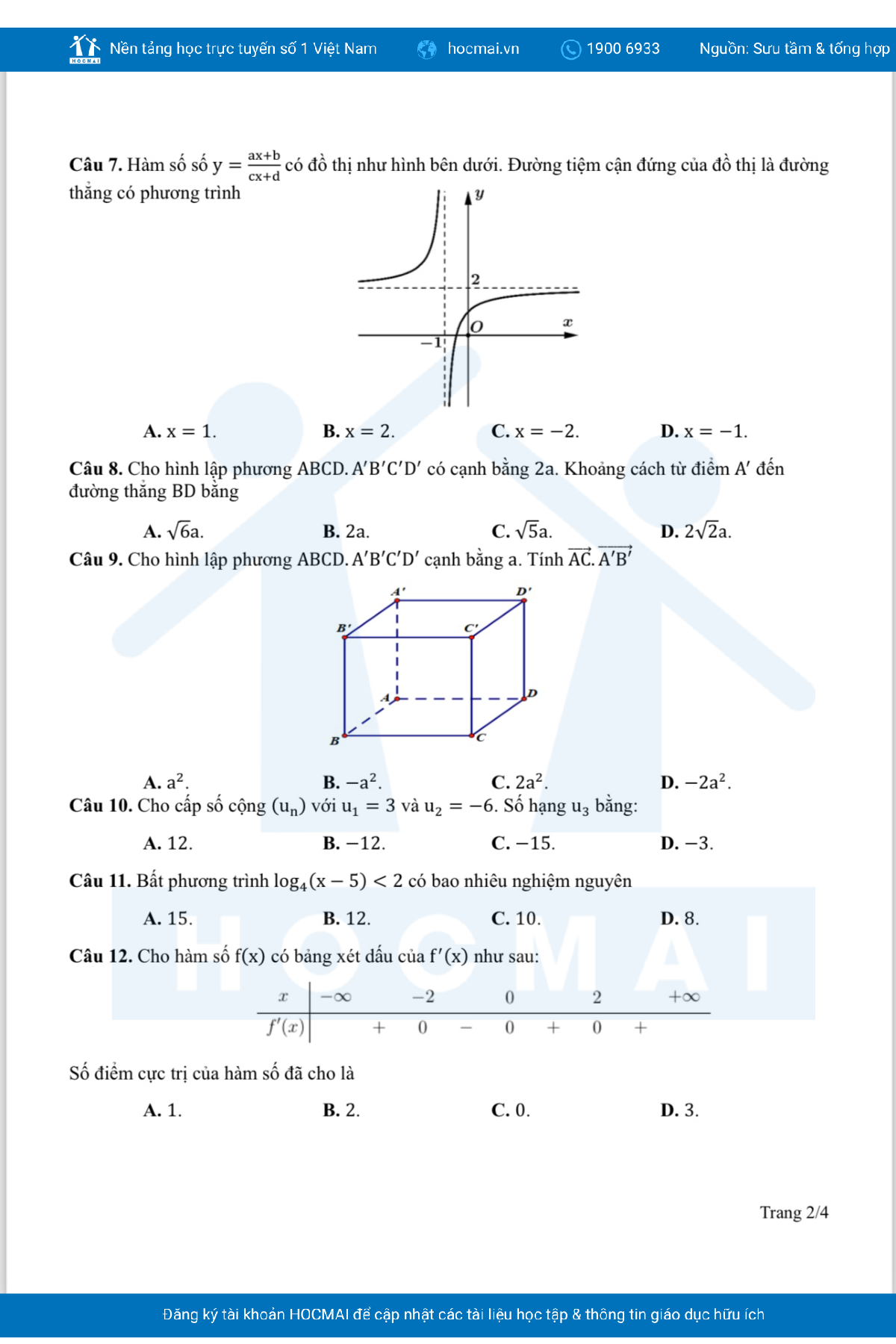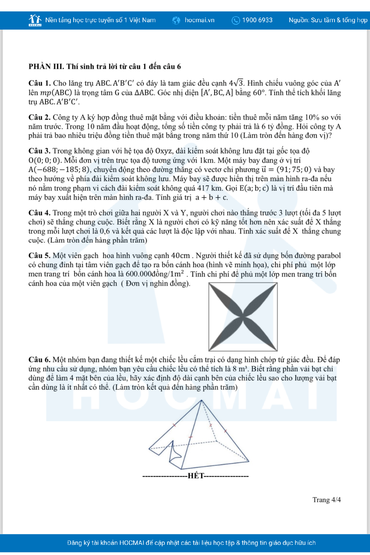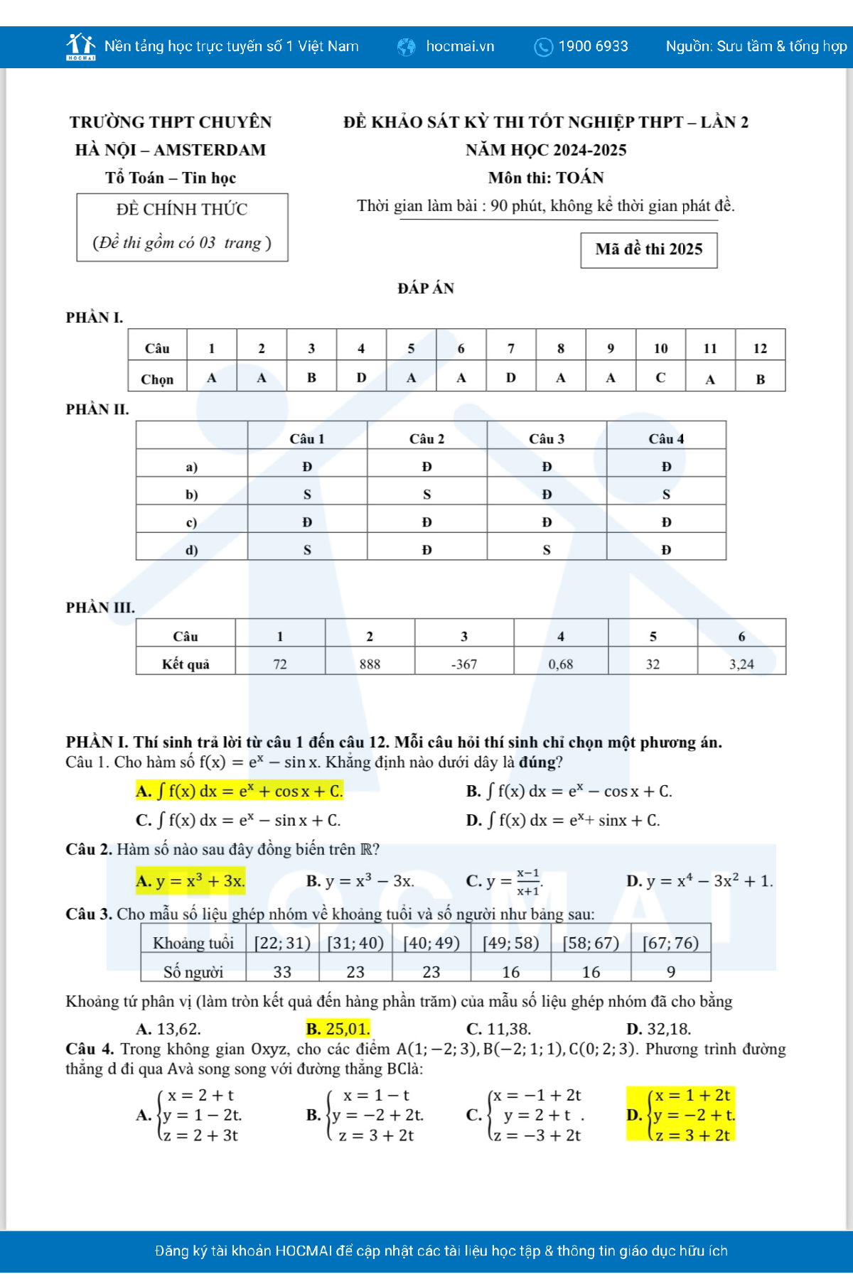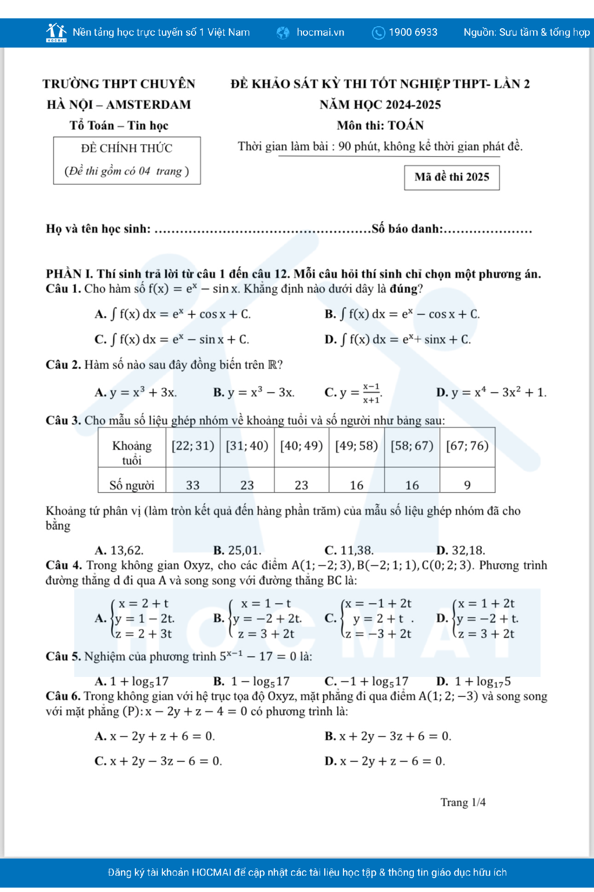 Đề khảo sát TN THPT 2025 môn Toán lần 2 trường chuyên Hà Nội – Amsterdam