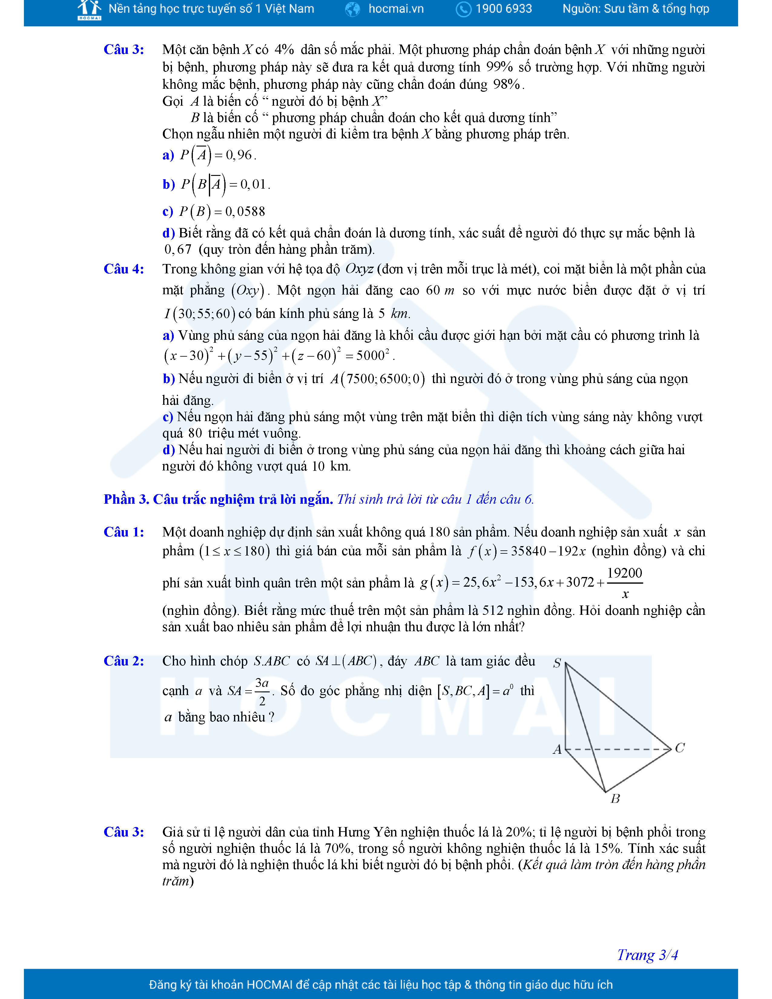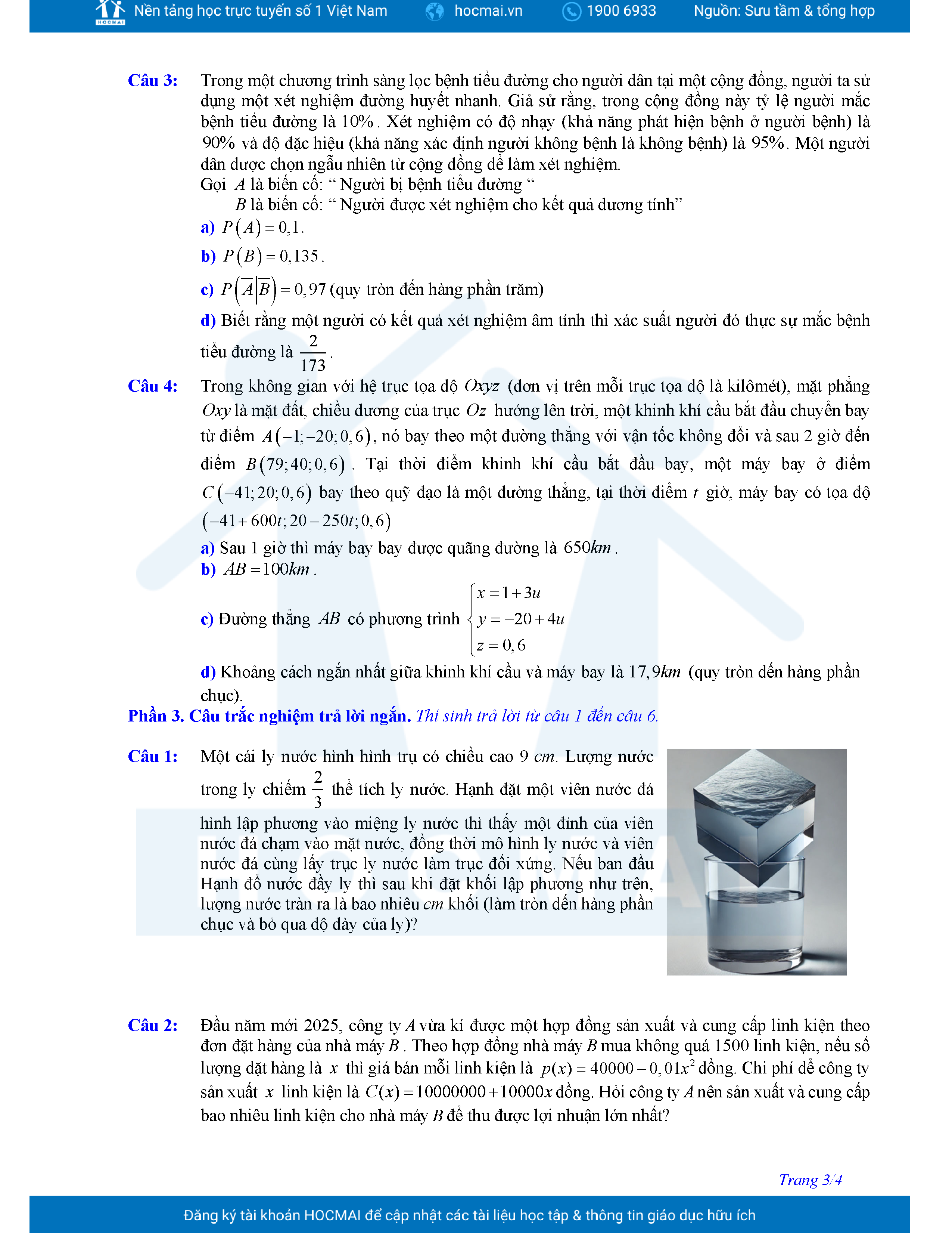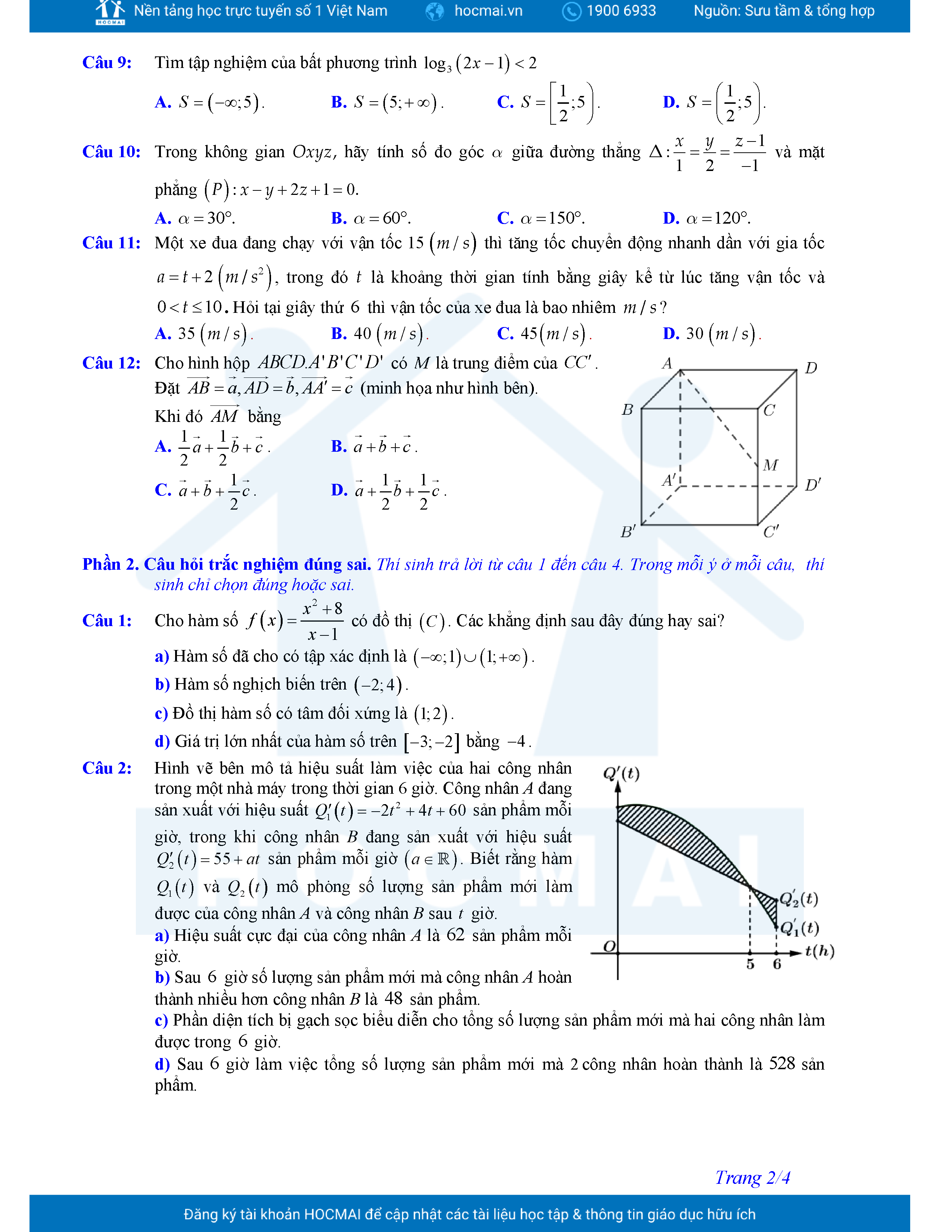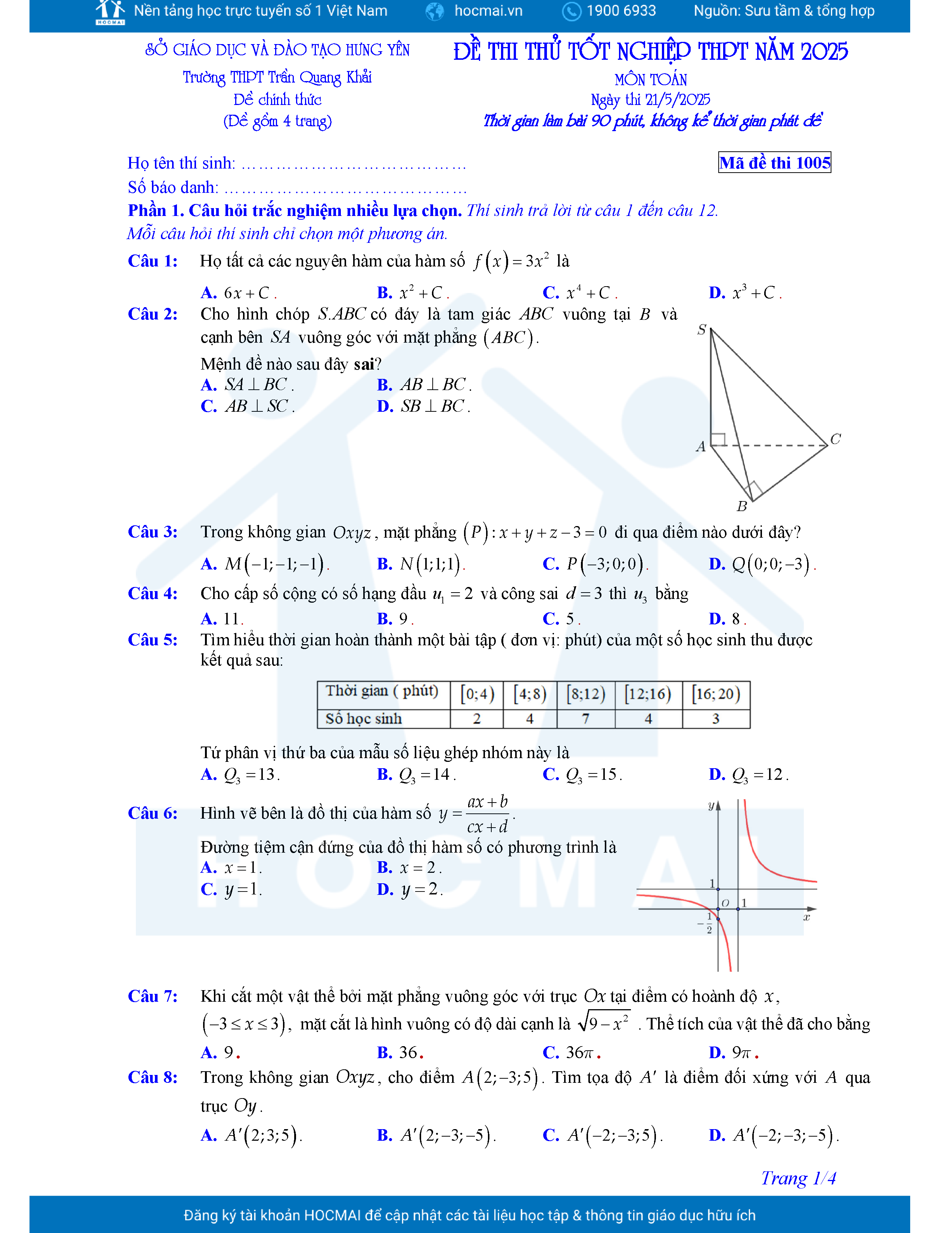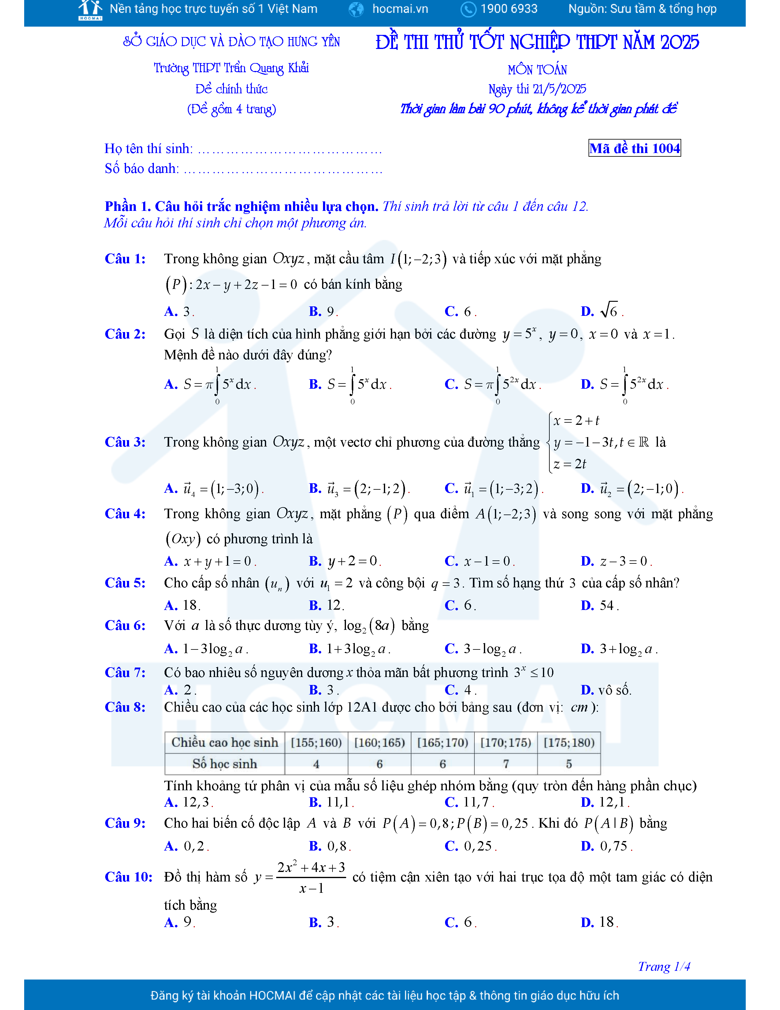 Đề thi thử TN THPT 2025 môn Toán trường THPT Trần Quang Khải – Hưng Yên