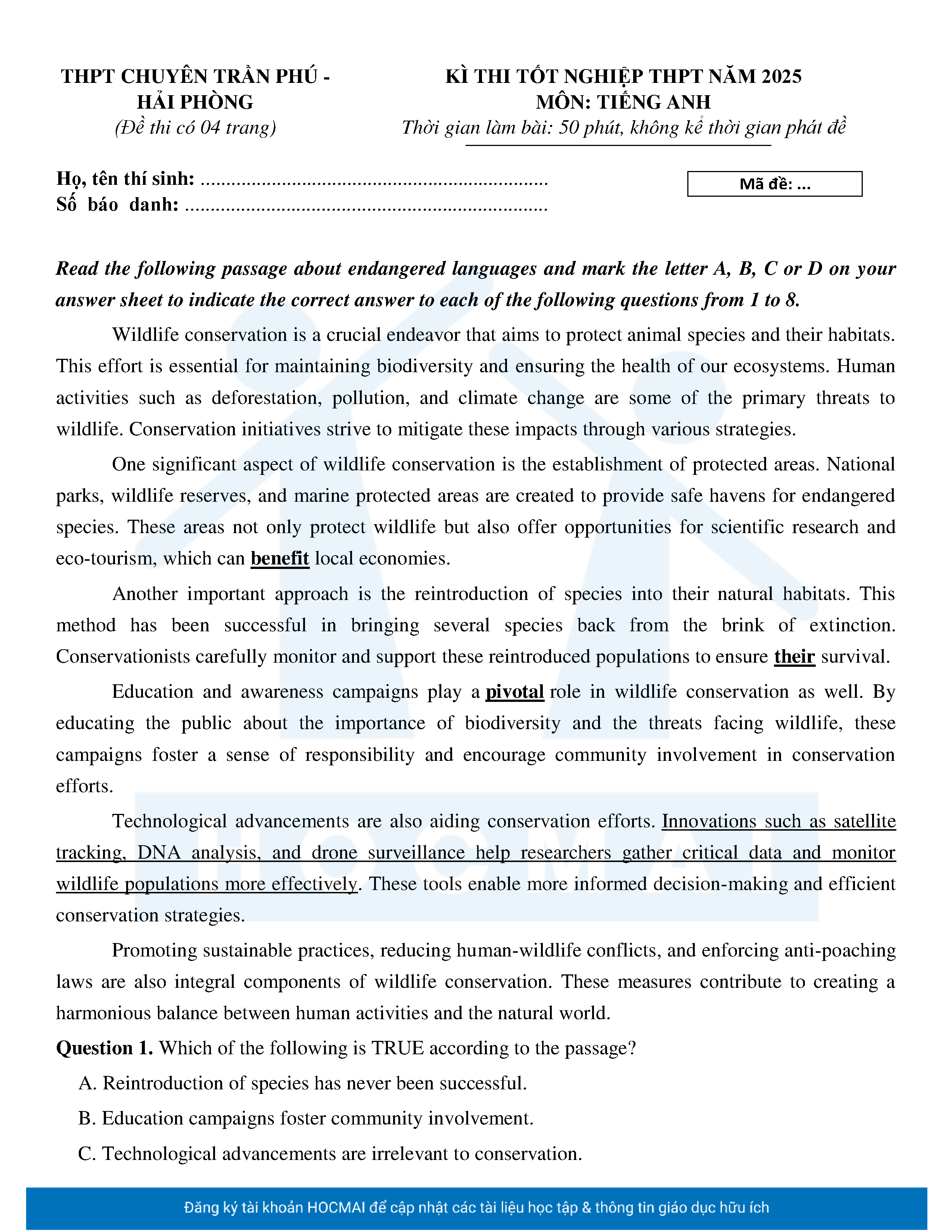 Đề Thi Thử Tốt Nghiệp 2025 Tiếng Anh THPT Chuyên Trần Phú