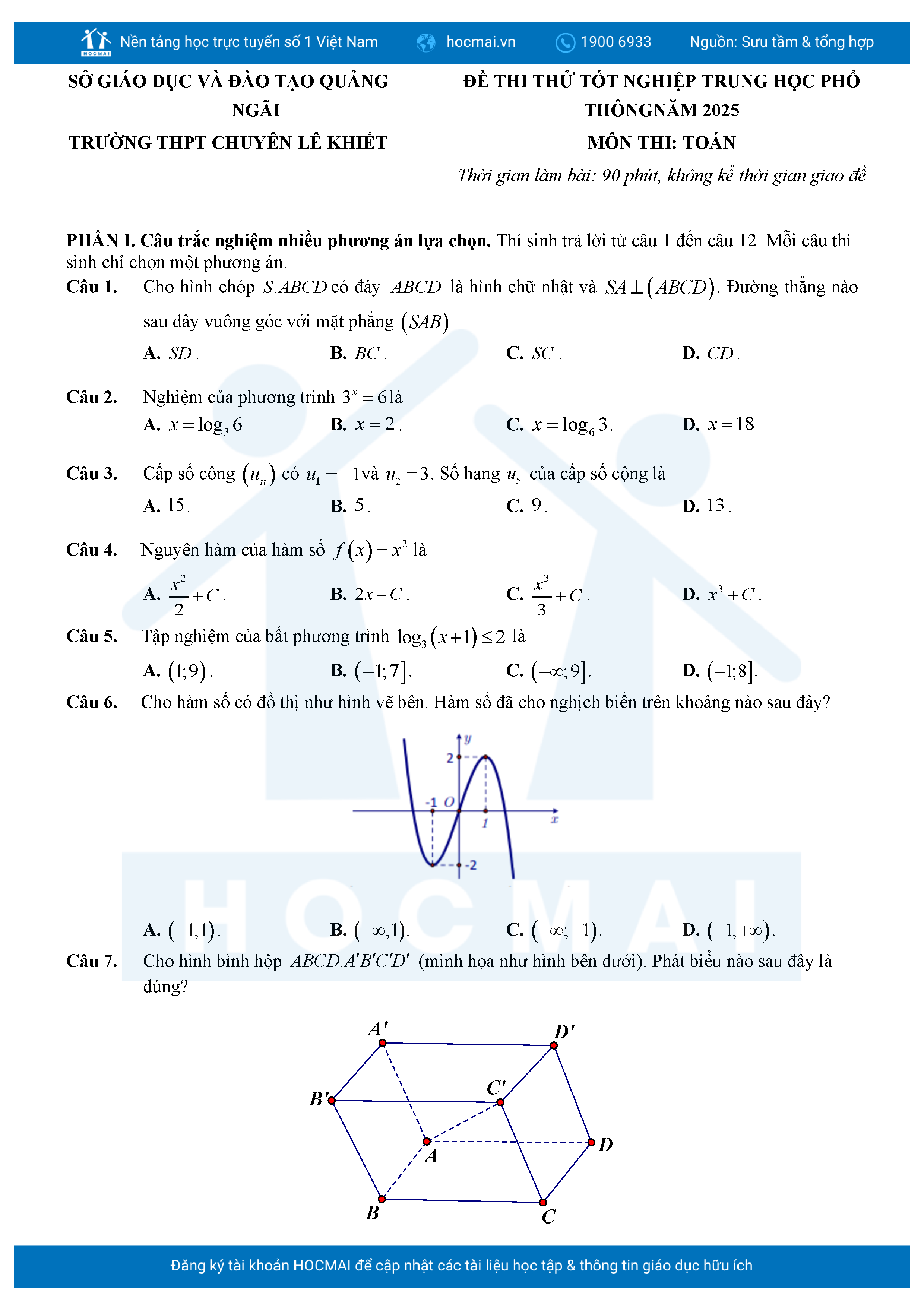 Đề Thi Thử Tốt Nghiệp 2025 Môn Toán Chuyên Lê Khiết Quảng Ngãi Kèm Giải Chi Tiết