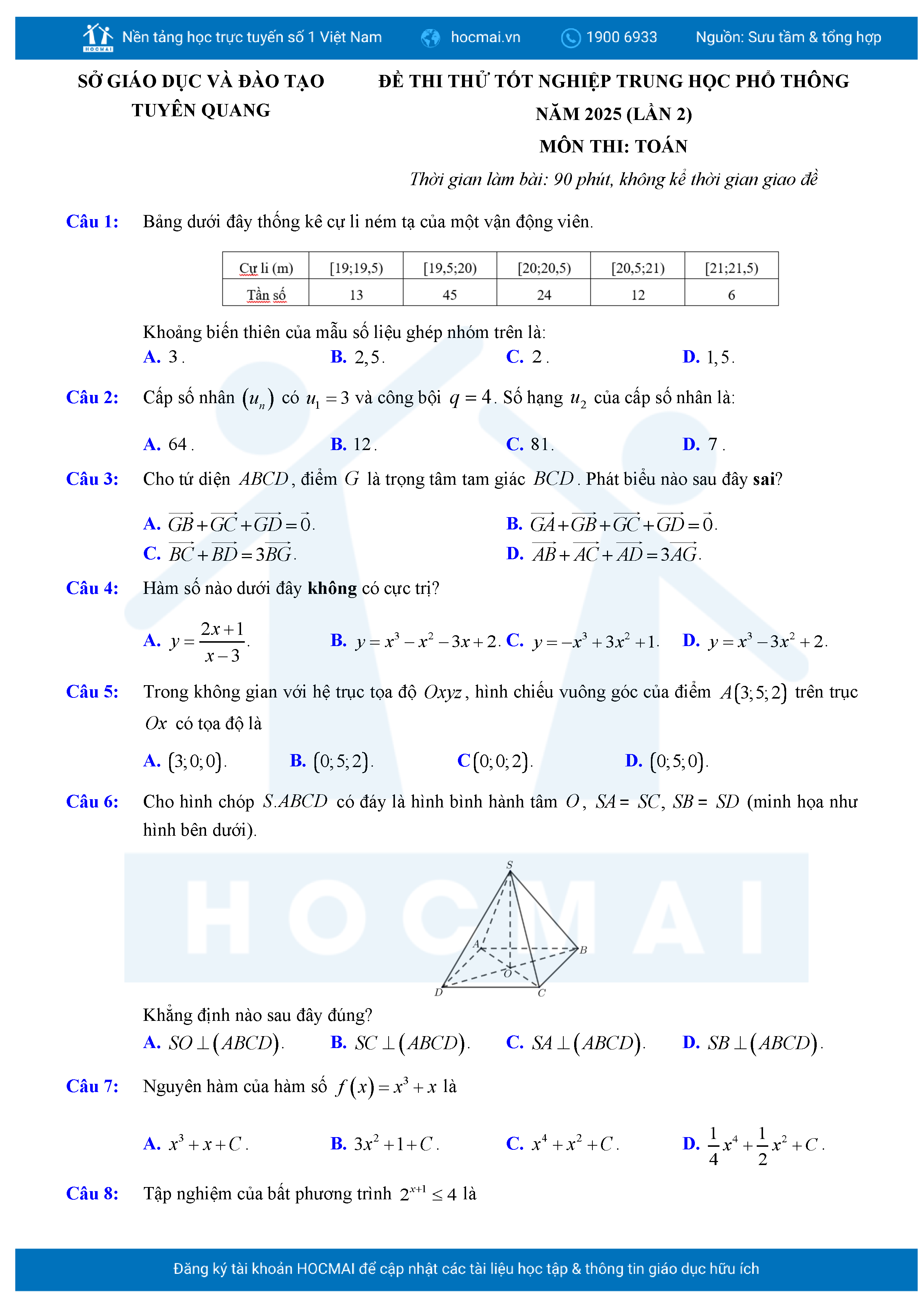 Đề Thi Thử Tốt Nghiệp 2025 Môn Toán Sở GD Tuyên Quang Lần 2 Kèm Giải Chi Tiết