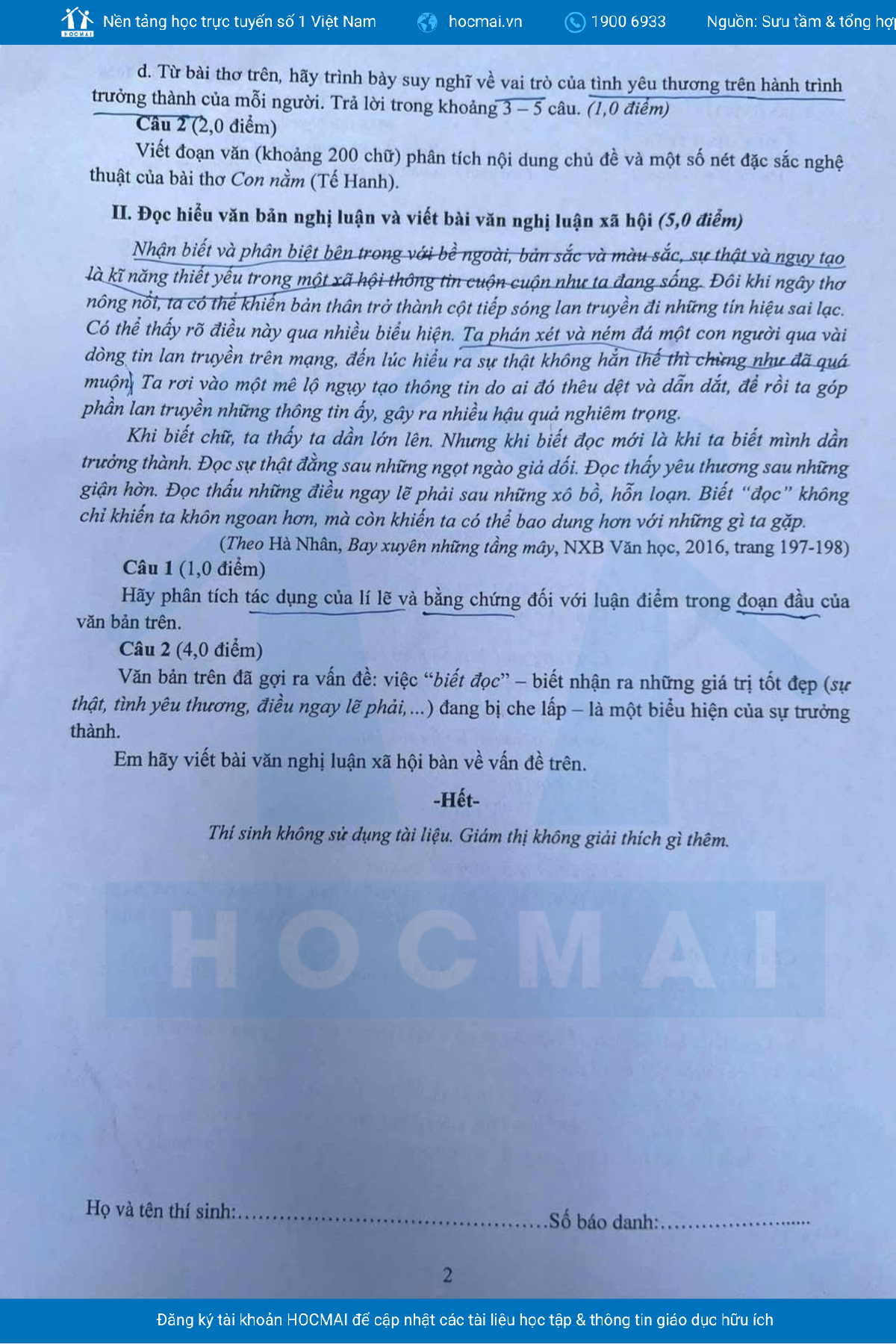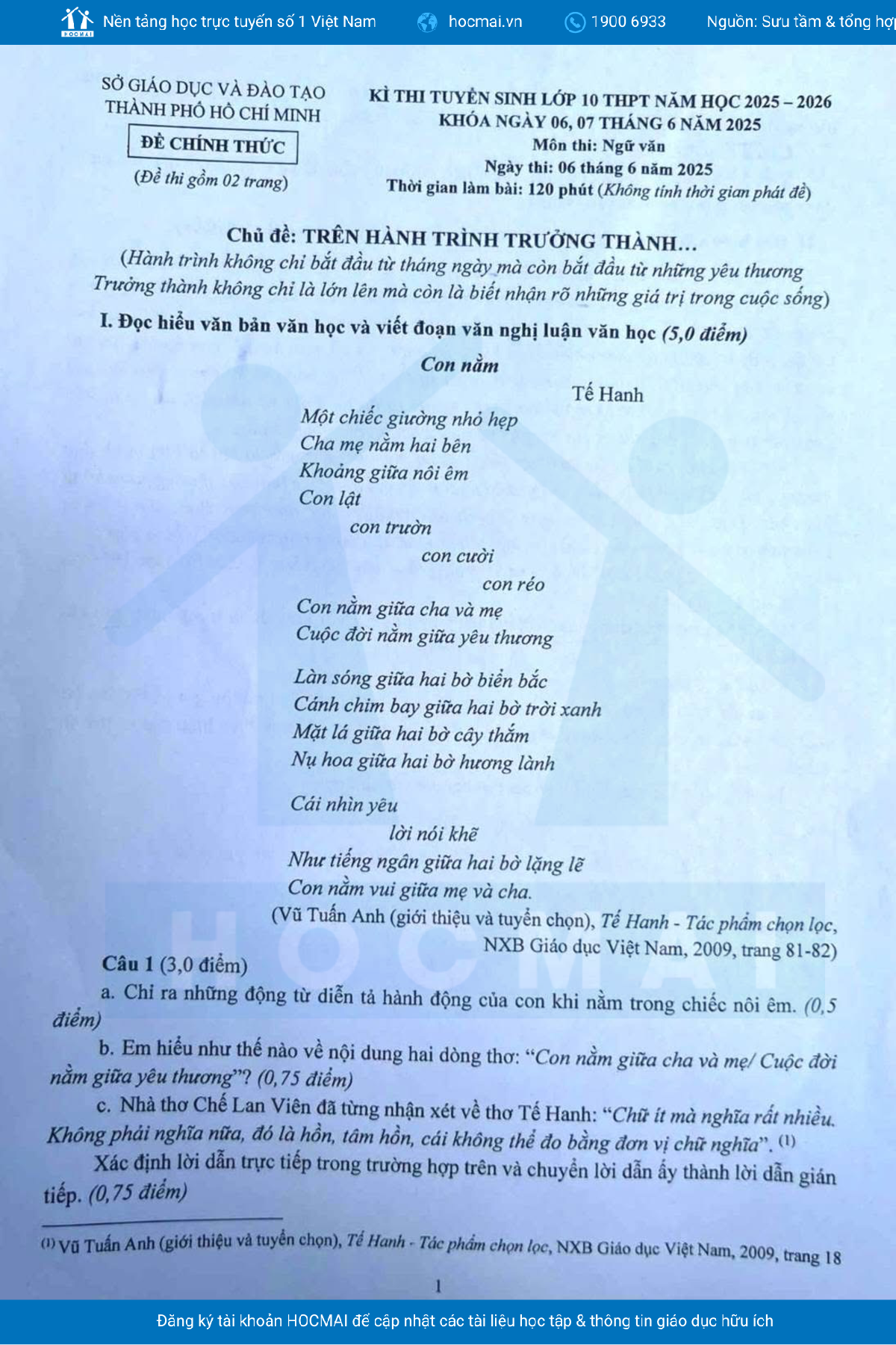 Đề thi chính thức môn Ngữ văn - Kỳ thi tuyển sinh lớp 10 THPT năm học 2025 - 2026 của TP.HCM.