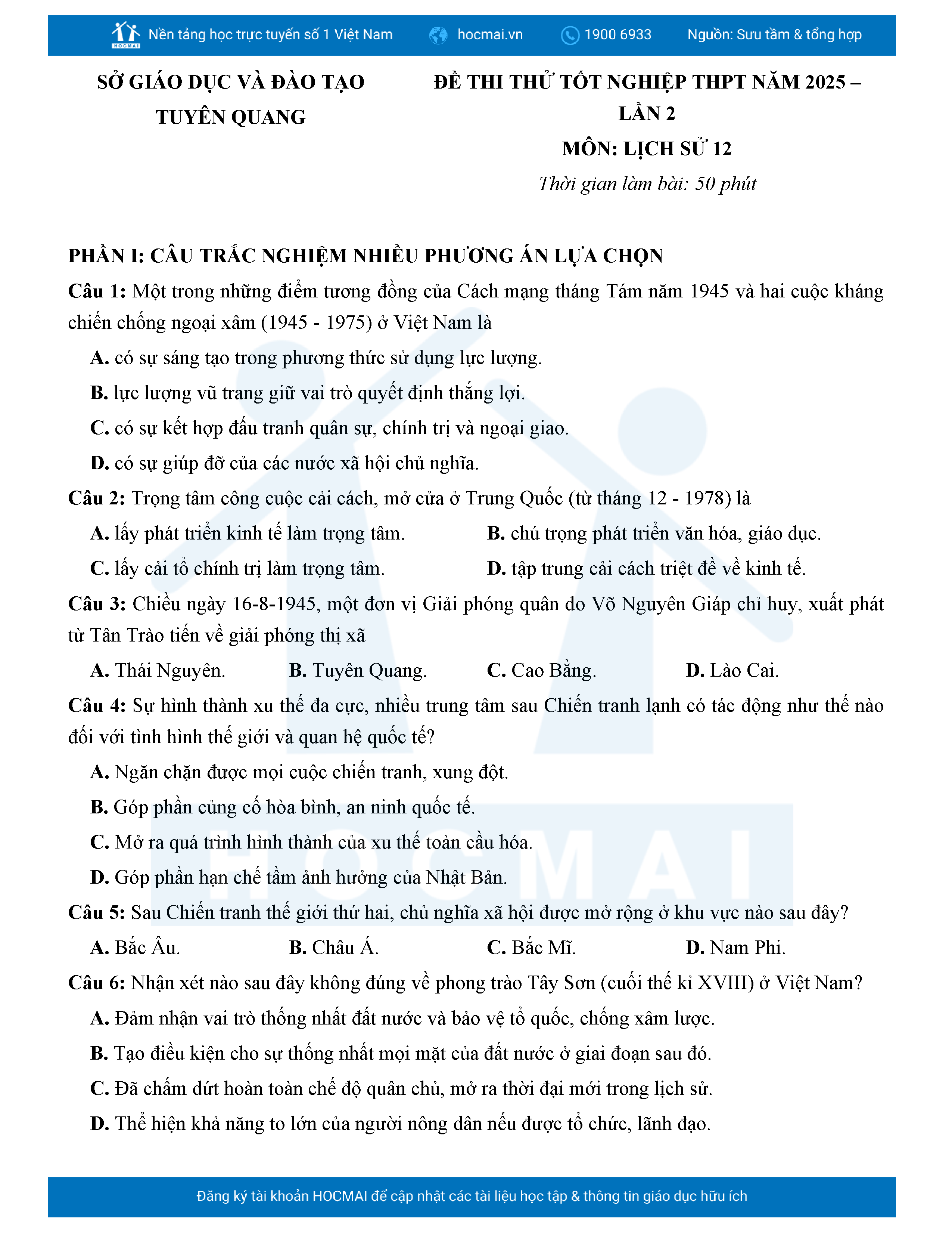 Đề thi thử tốt nghiệp 2025 Lịch sử Sở GD Tuyên Quang lần 2 kèm đáp án