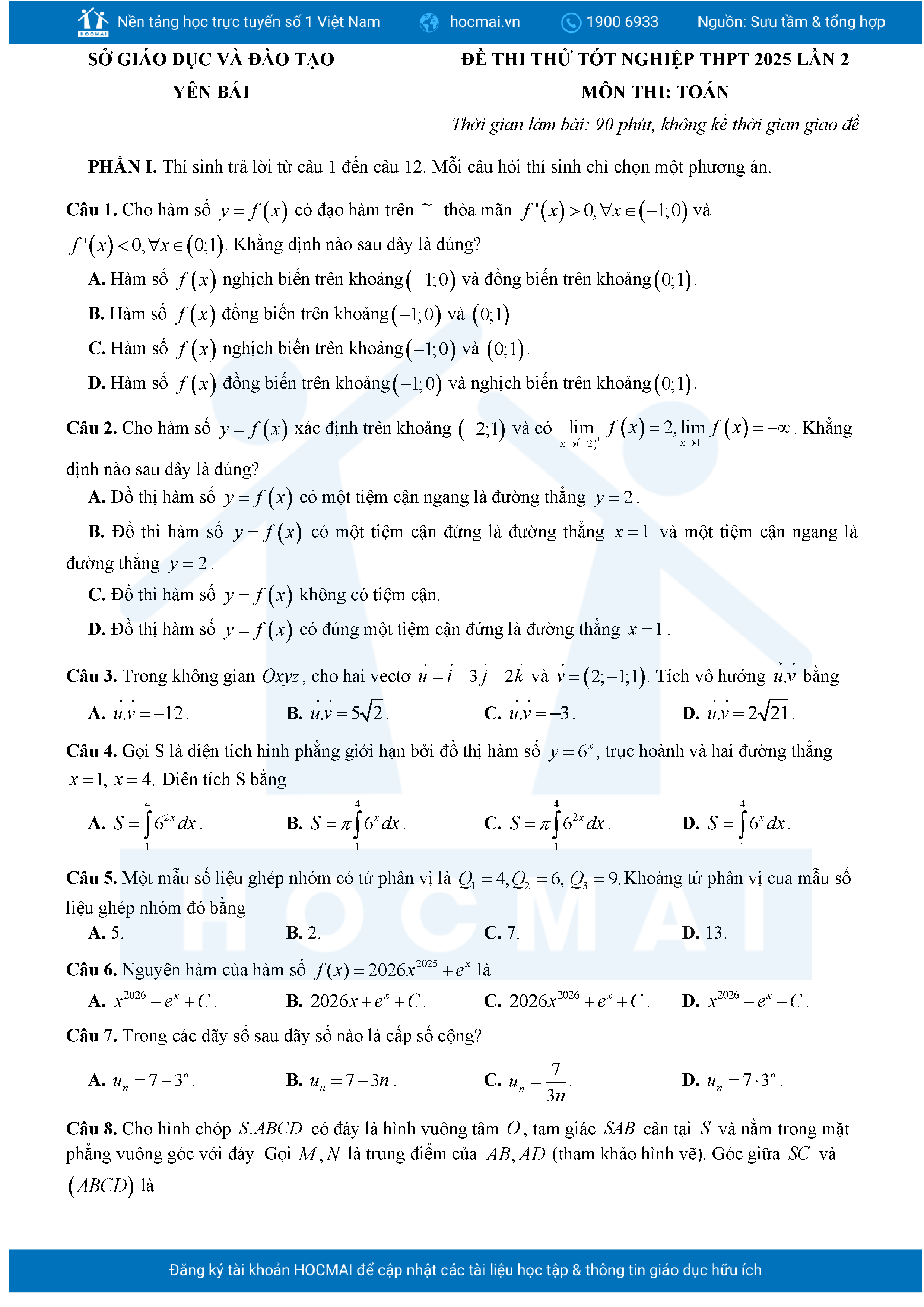 Đề thi thử tốt nghiệp 2025 môn Toán Sở GD Yên Bái lần 2 kèm giải chi tiết