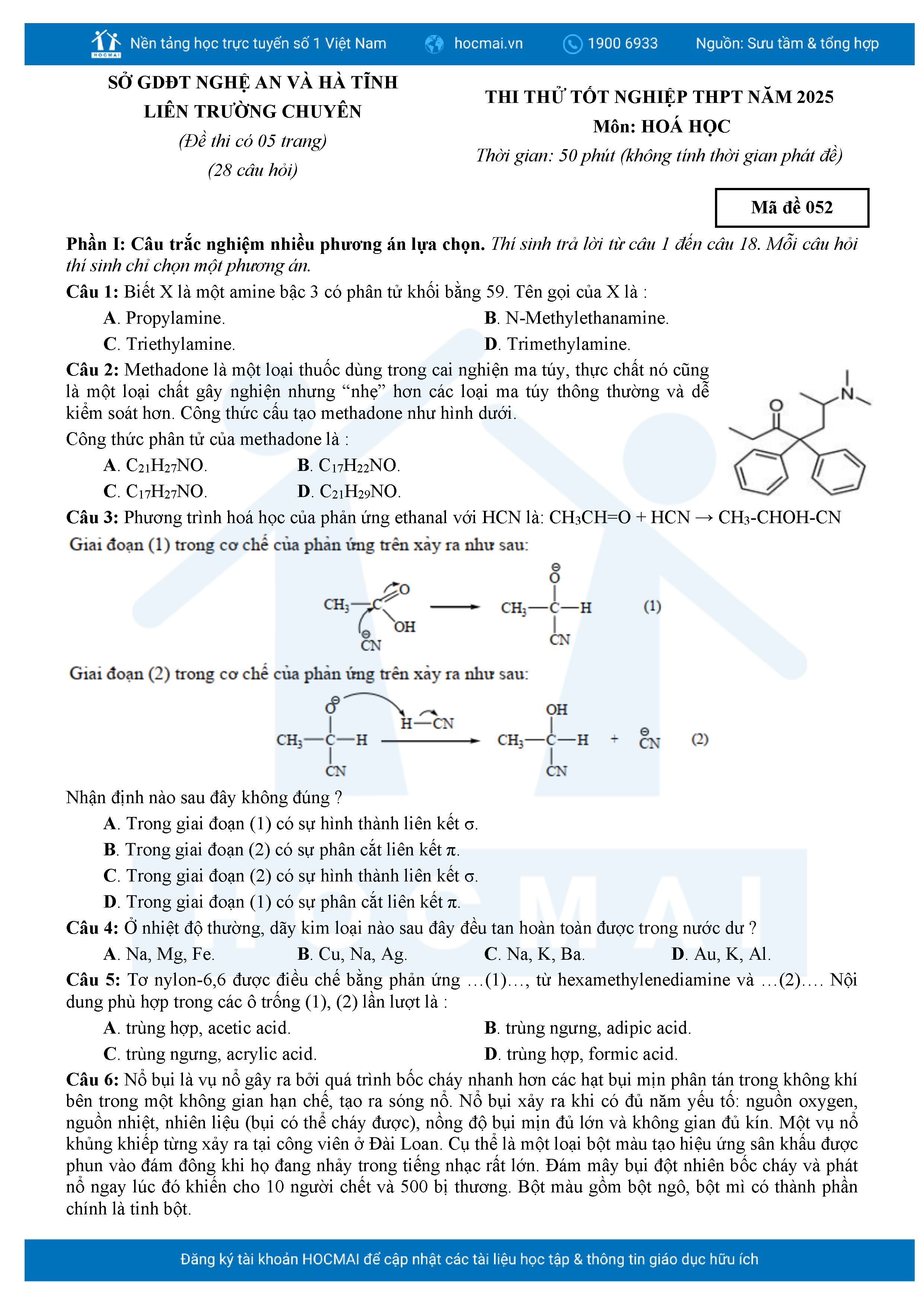 Đề ôn thi tốt nghiệp 2025 môn Hóa Liên Trường chuyên Nghệ An Hà Tĩnh kèm giải chi tiết