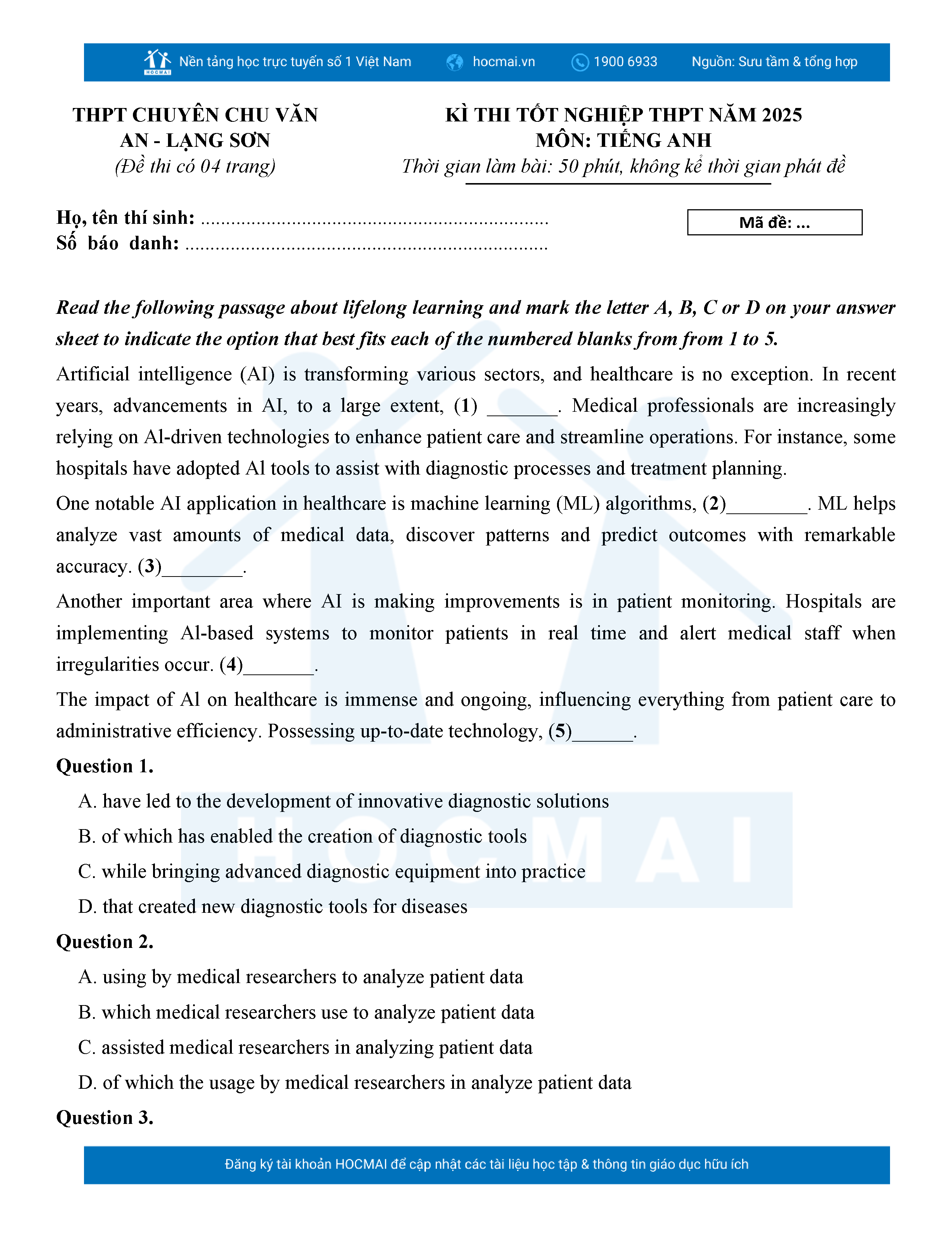 Đề thi thử tốt nghiệp 2025 Tiếng anh THPT Chuyên Chu Văn An kèm giải chi tiết
