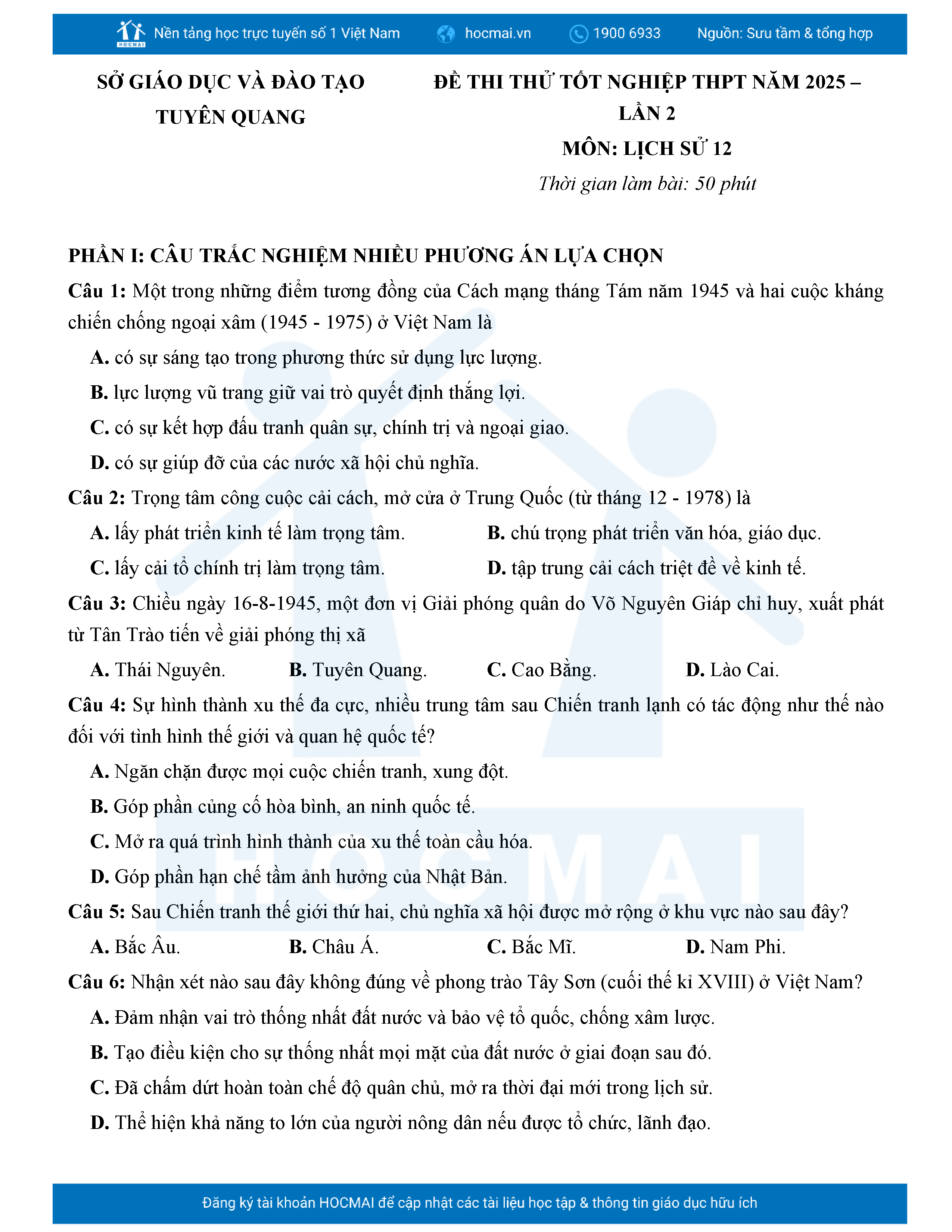 Đề Thi Thử Tốt Nghiệp 2025 Lịch Sử Sở GD Tuyên Quang Lần 2 Giải Chi Tiết