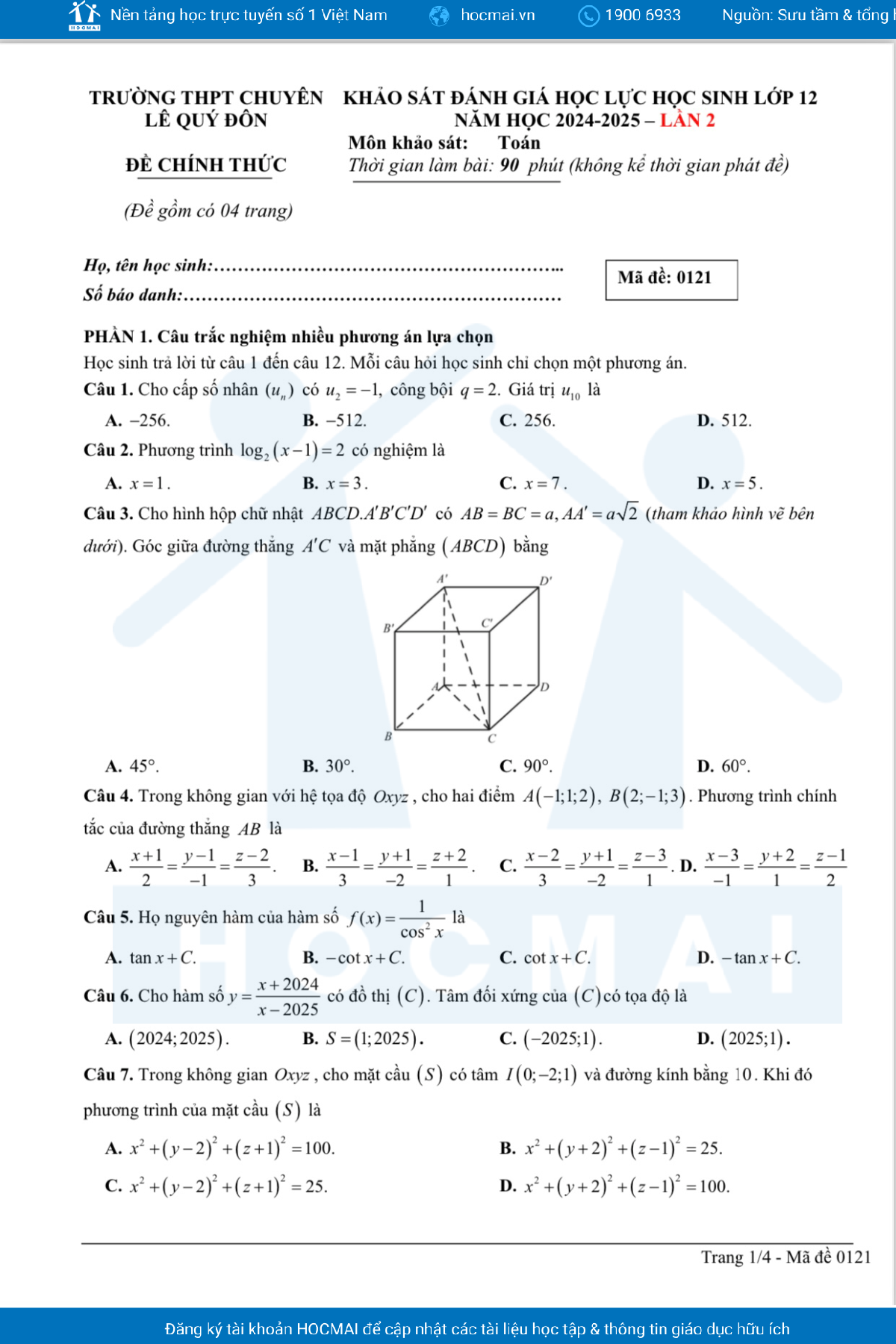 Đề khảo sát Toán 12 lần 2 năm 2024 – 2025 trường chuyên Lê Quý Đôn – Bình Định