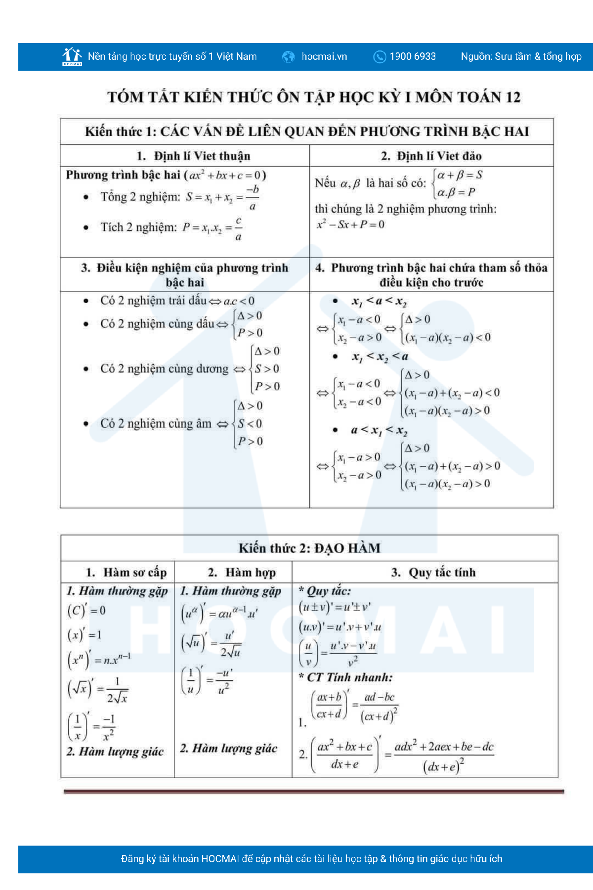 Hệ thống kiến thức môn Toán lớp 12 HKI