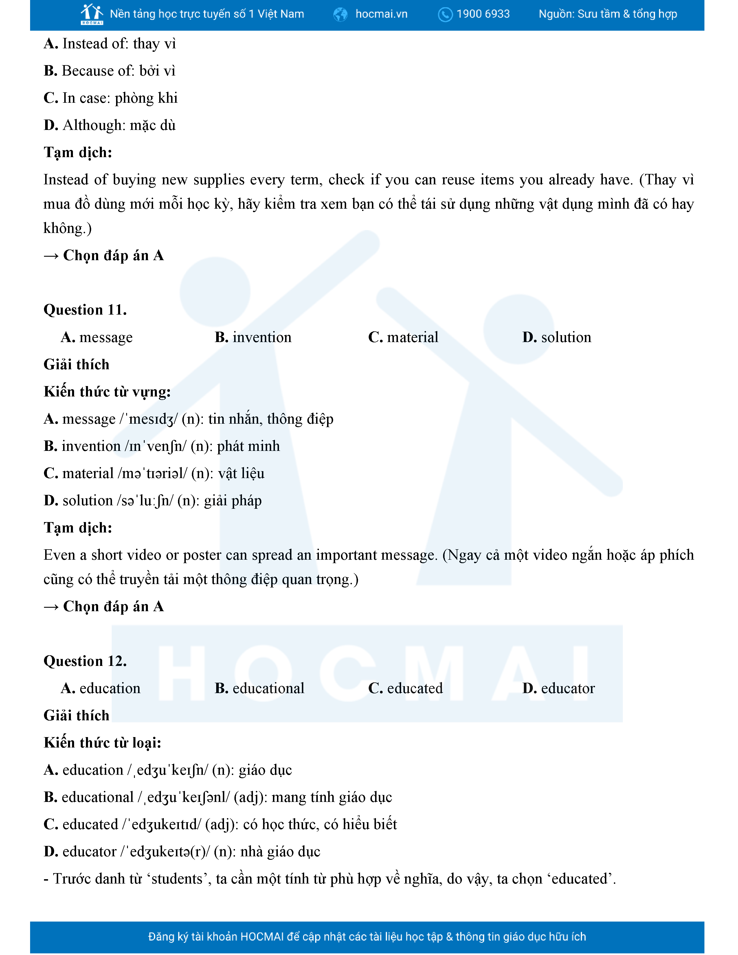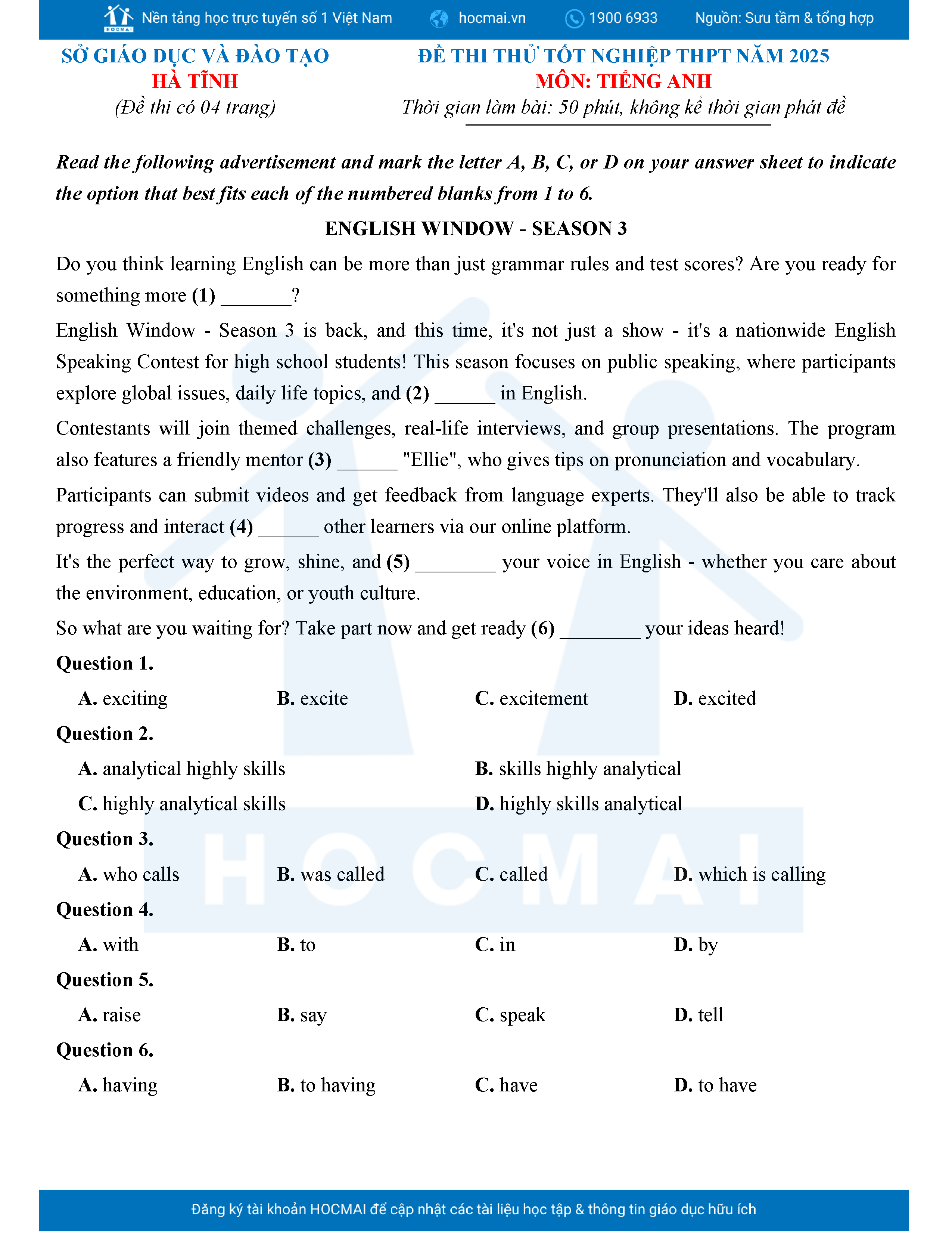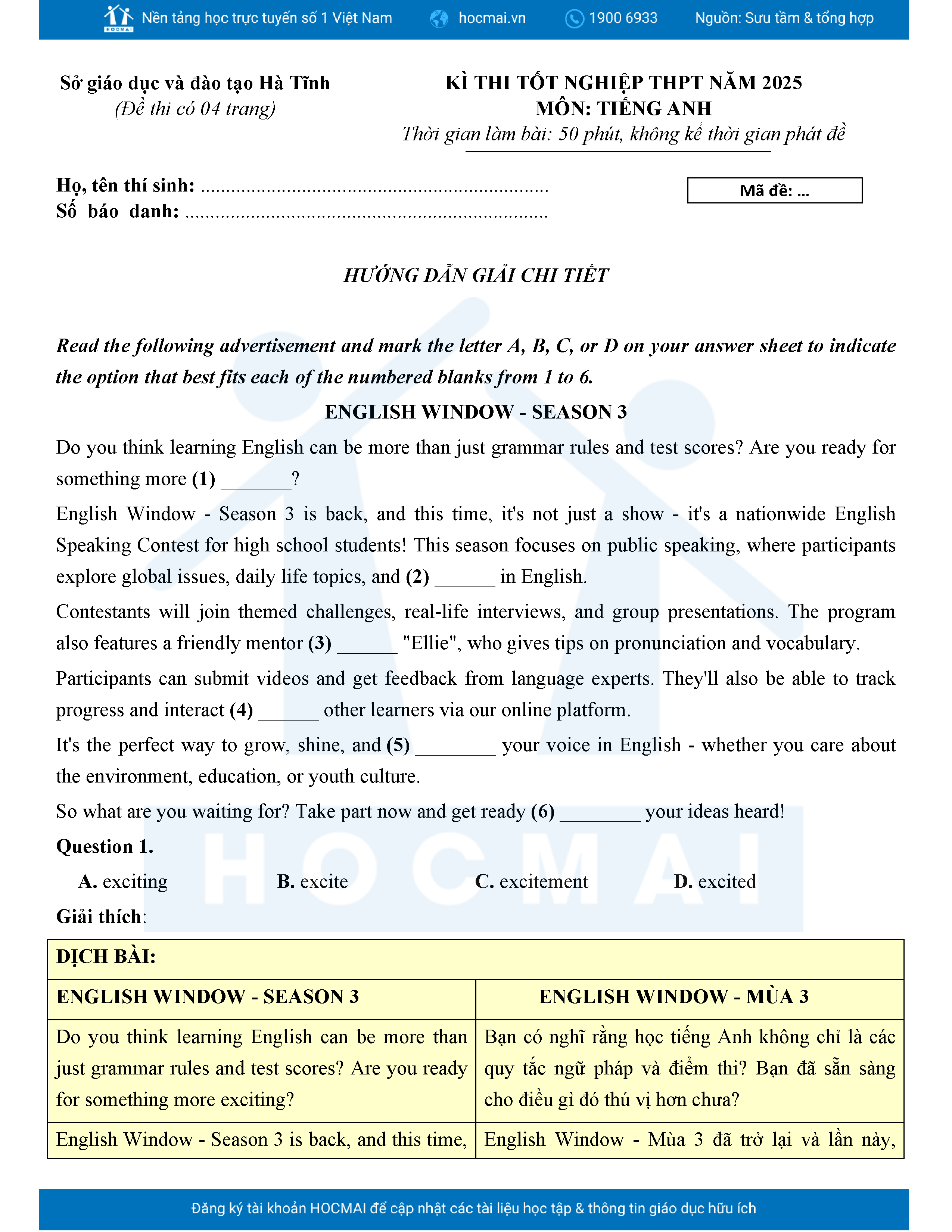 Đề thi thử tốt nghiệp 2025 Tiếng anh Sở GD Hà Tĩnh giải chi tiết