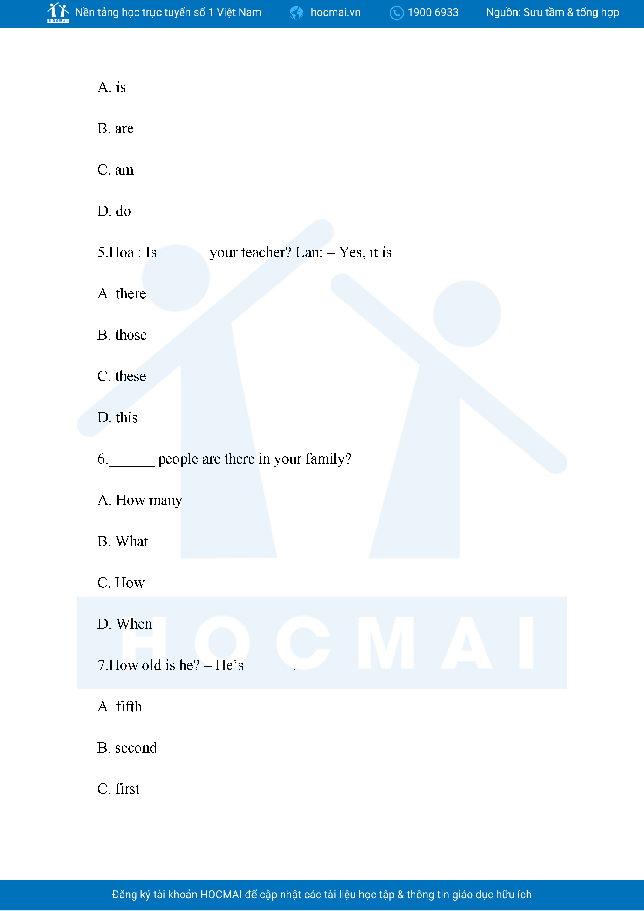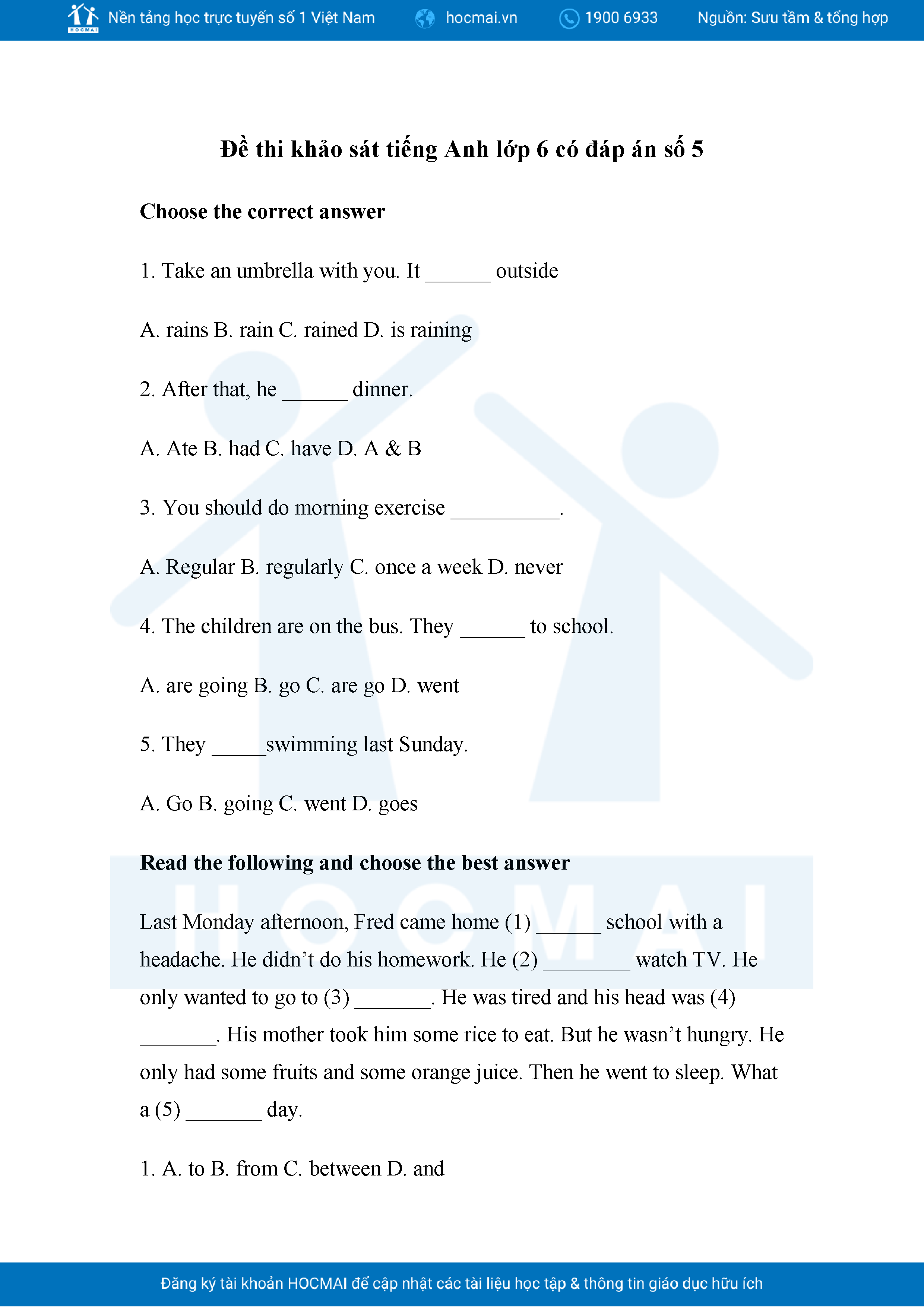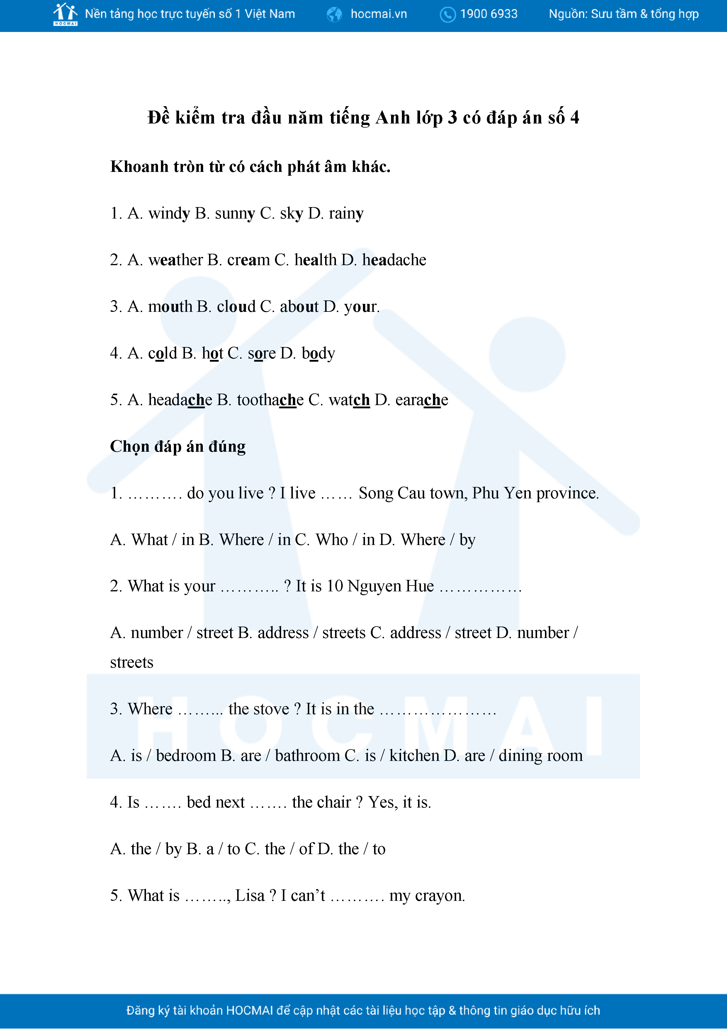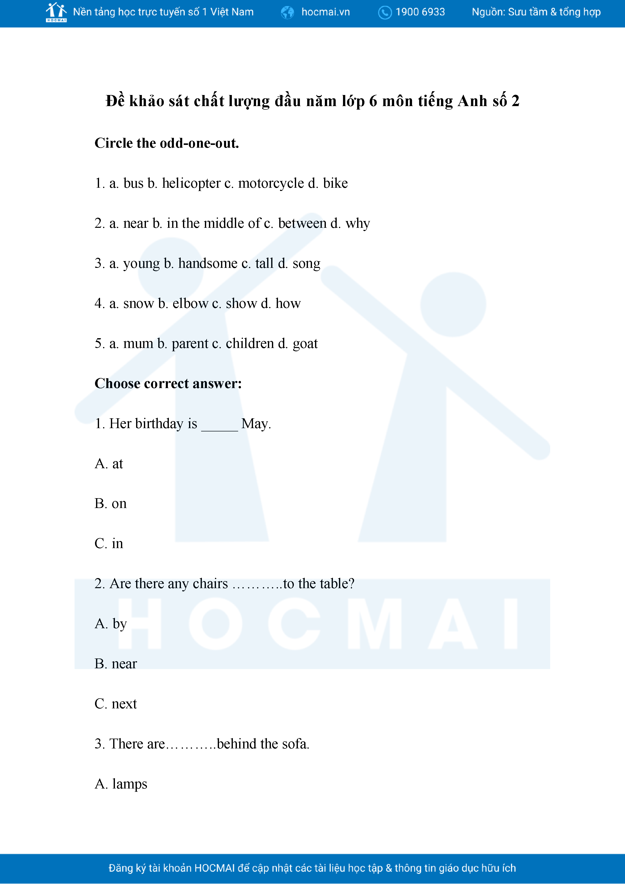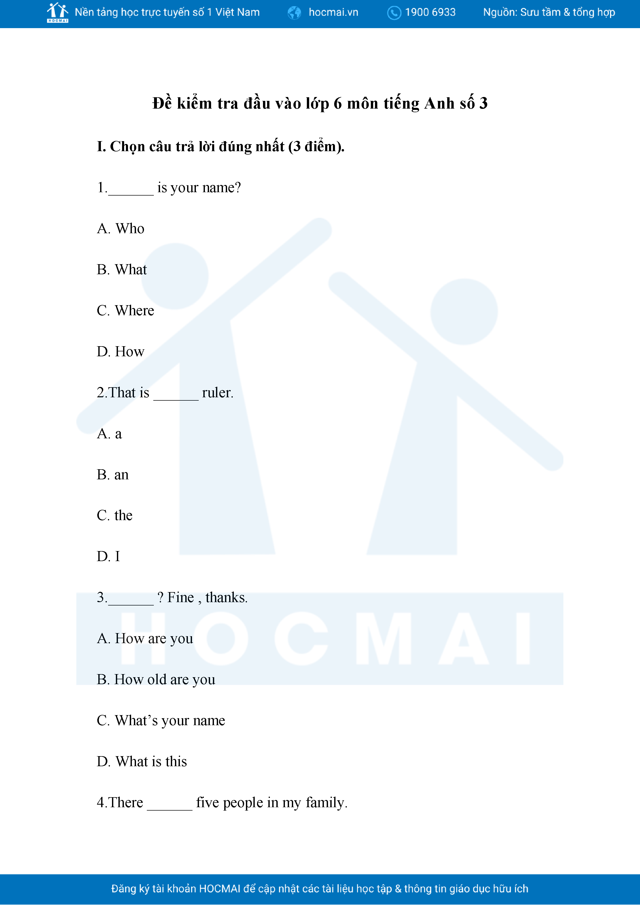 Bộ đề thi khảo sát chất lượng đầu năm môn tiếng Anh lớp 6
