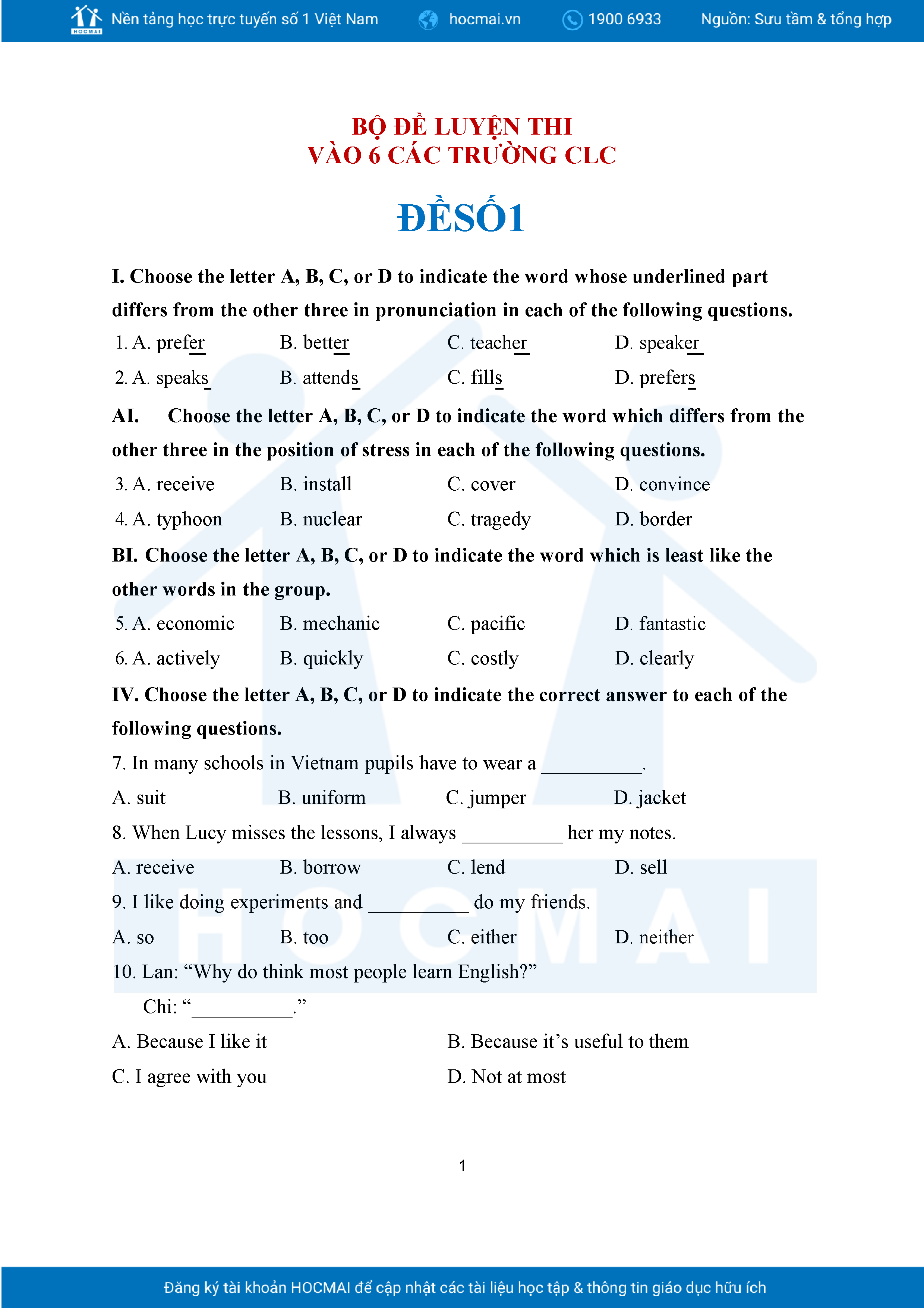 Bộ đề luyện thi vào lớp 6 trường Chất lượng cao môn Tiếng Anh
