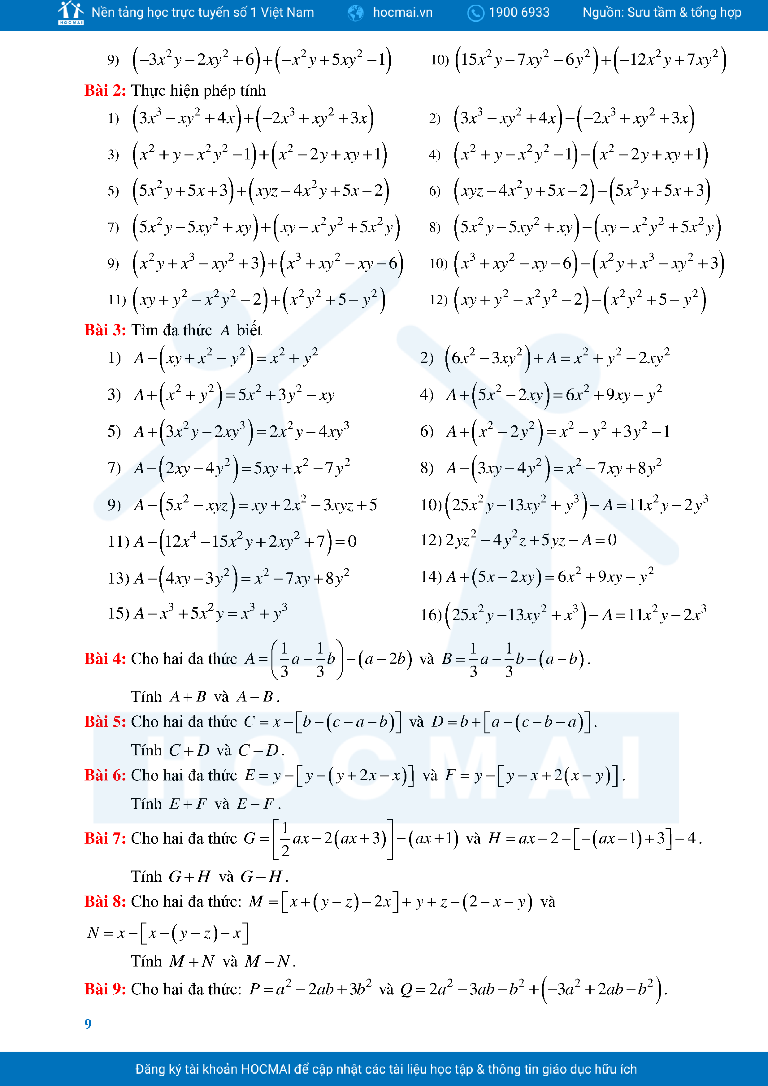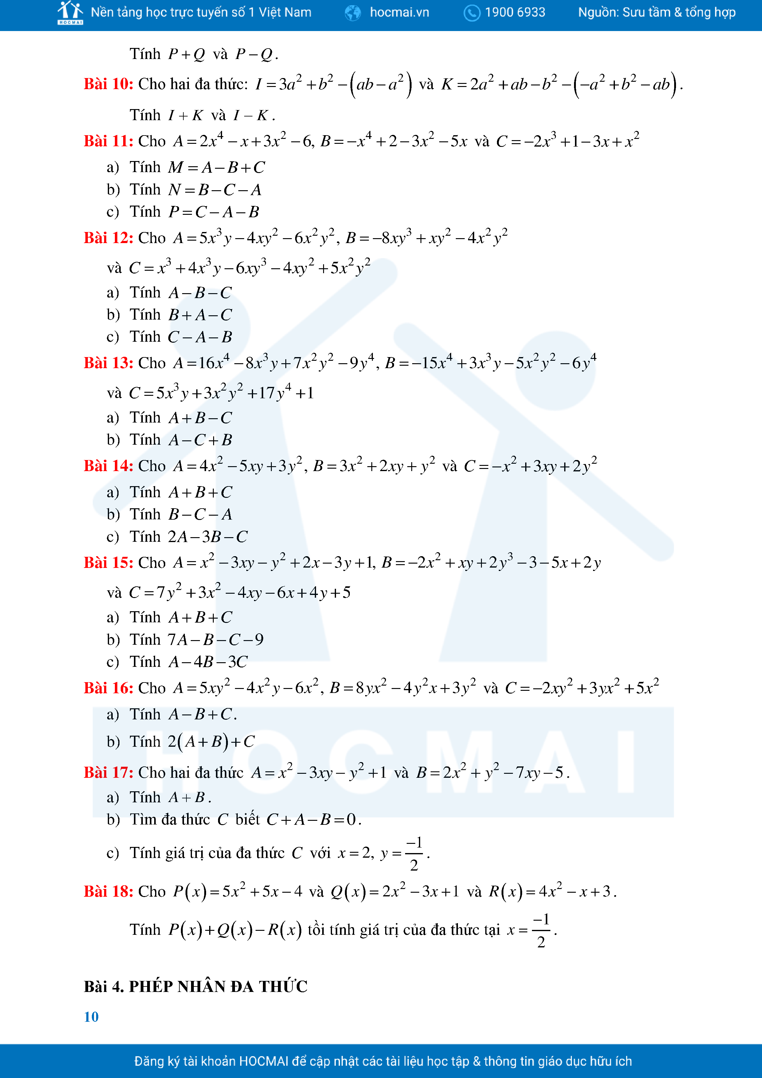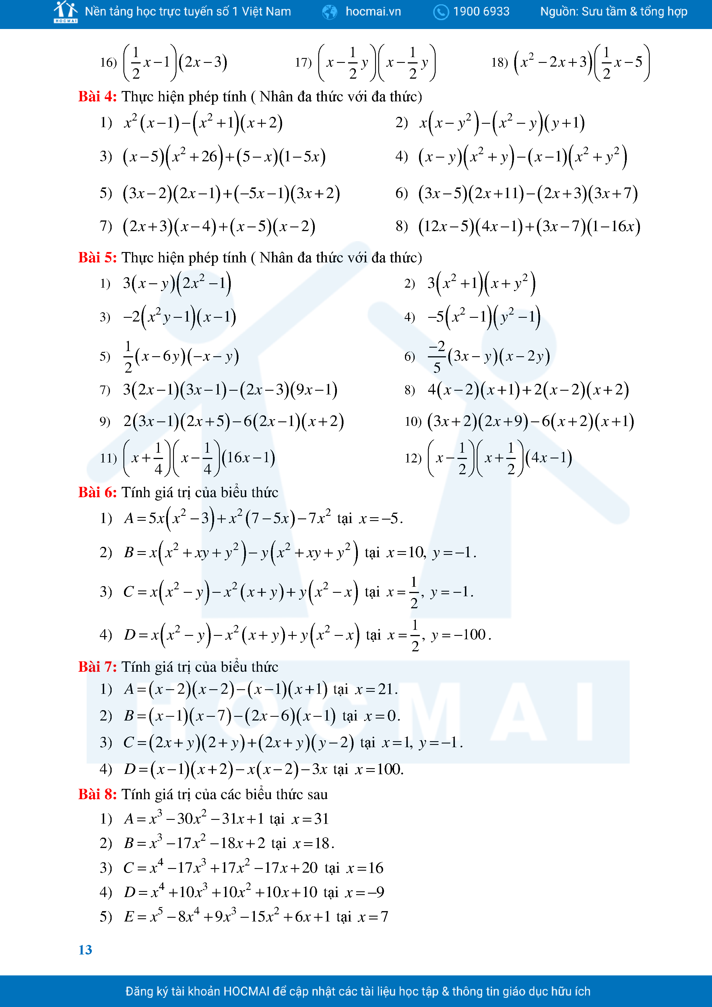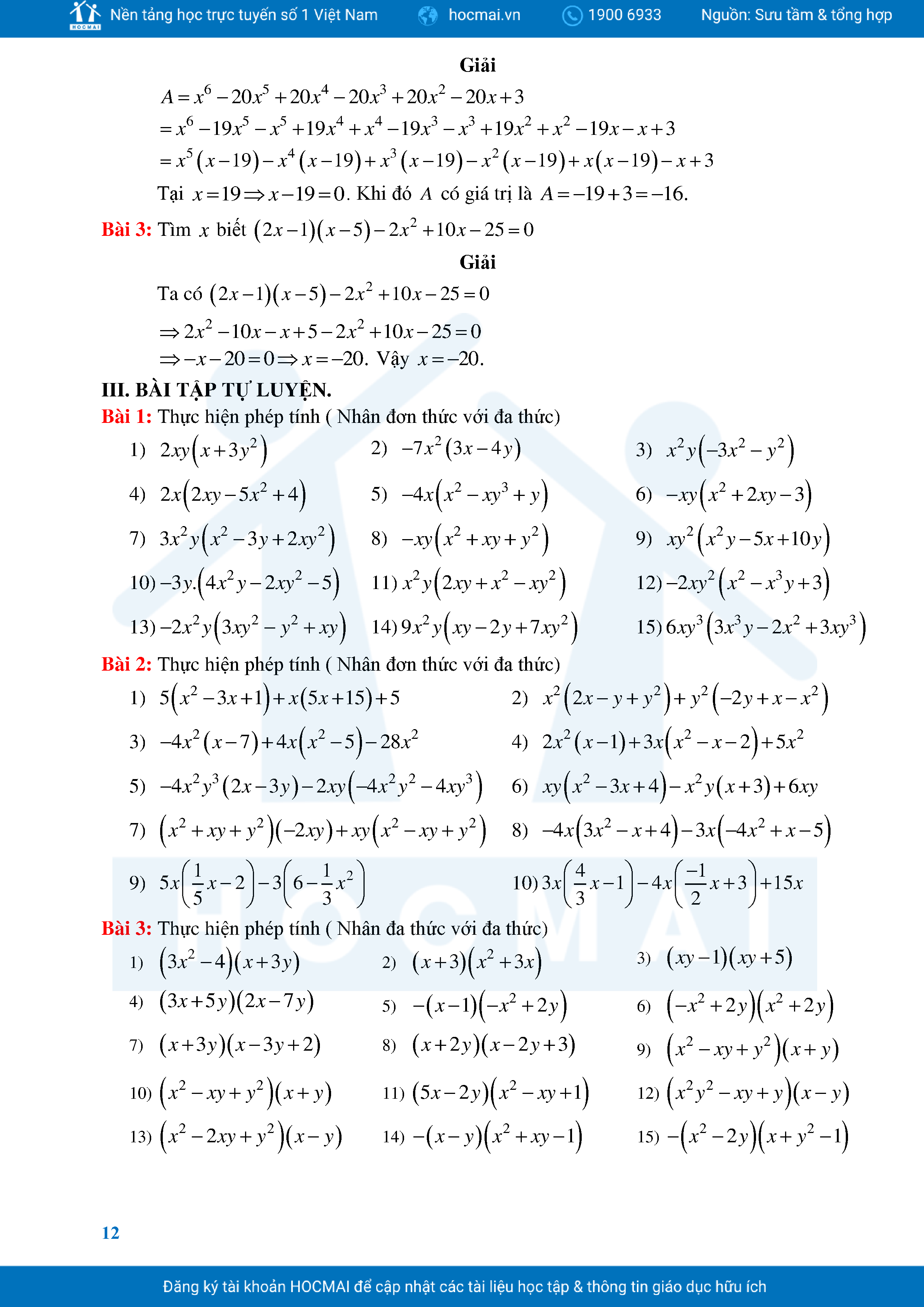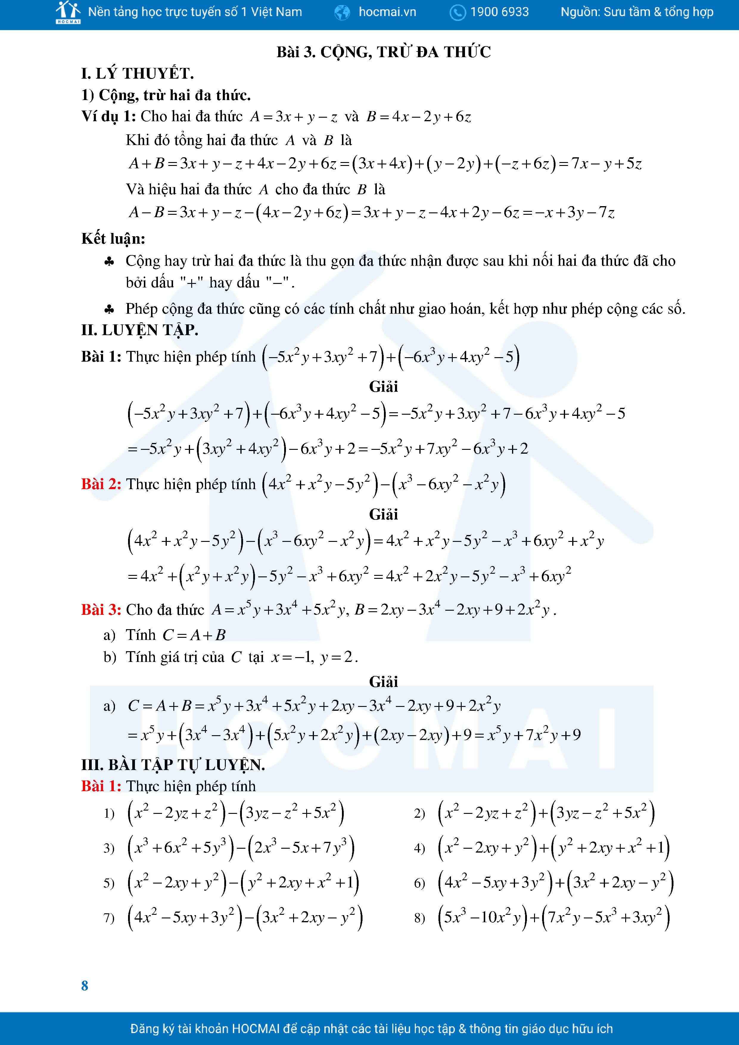 Bài Tập Cơ Bản Toán 8 Chương 1 Đa Thức