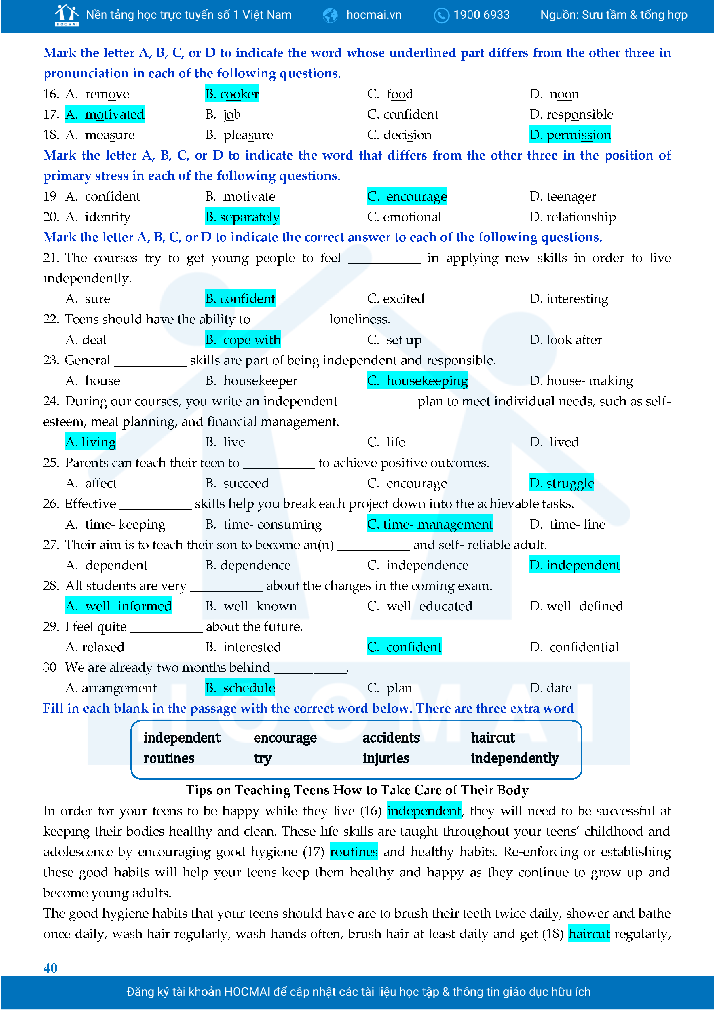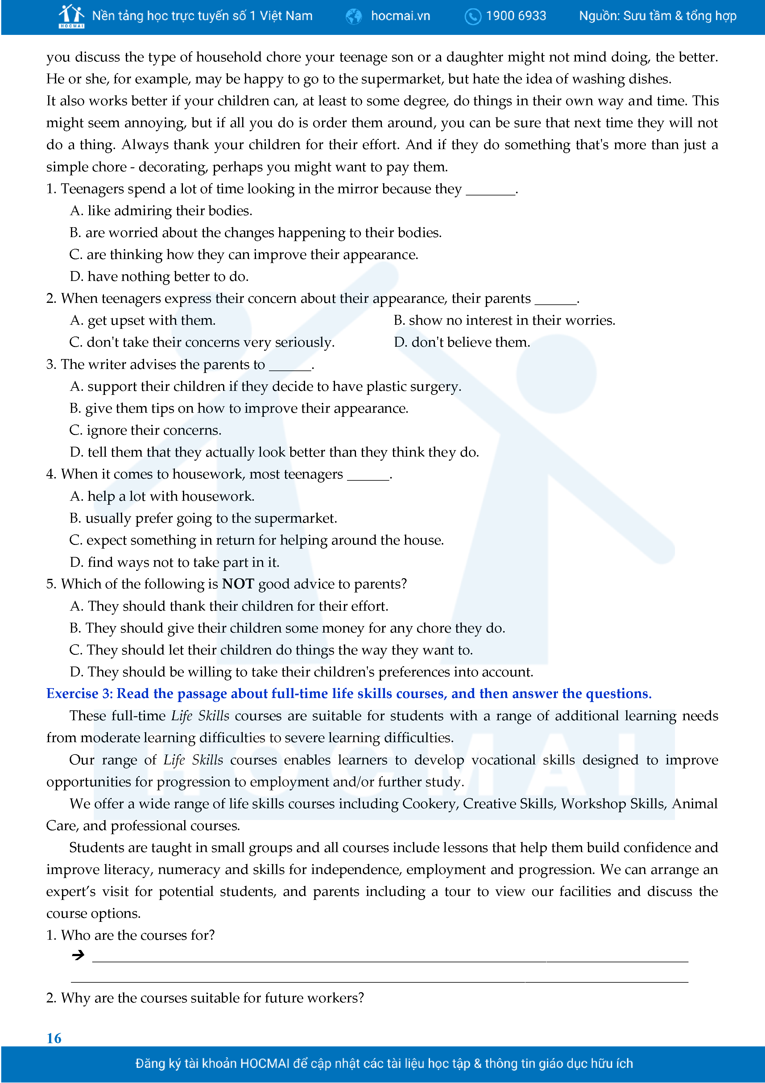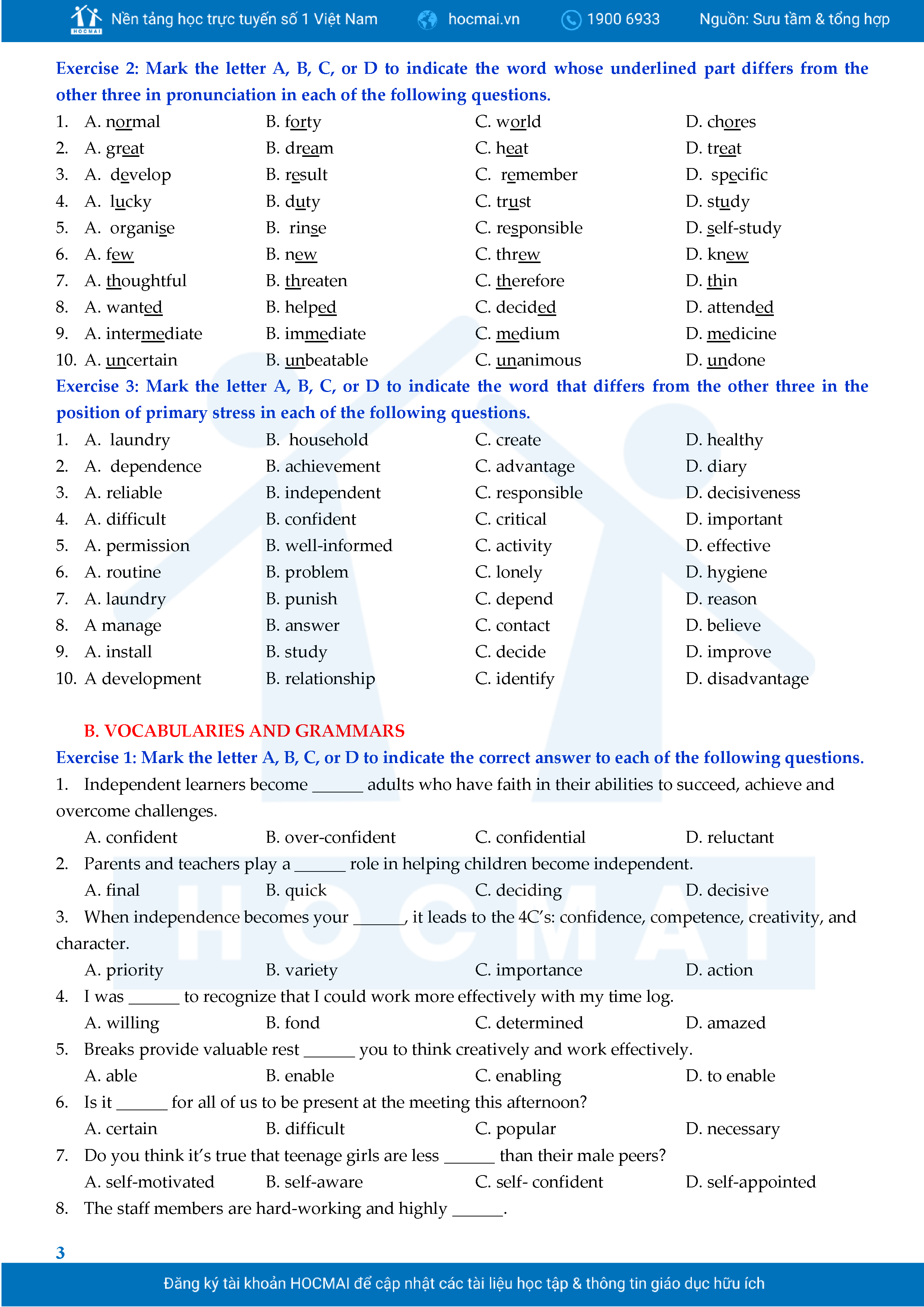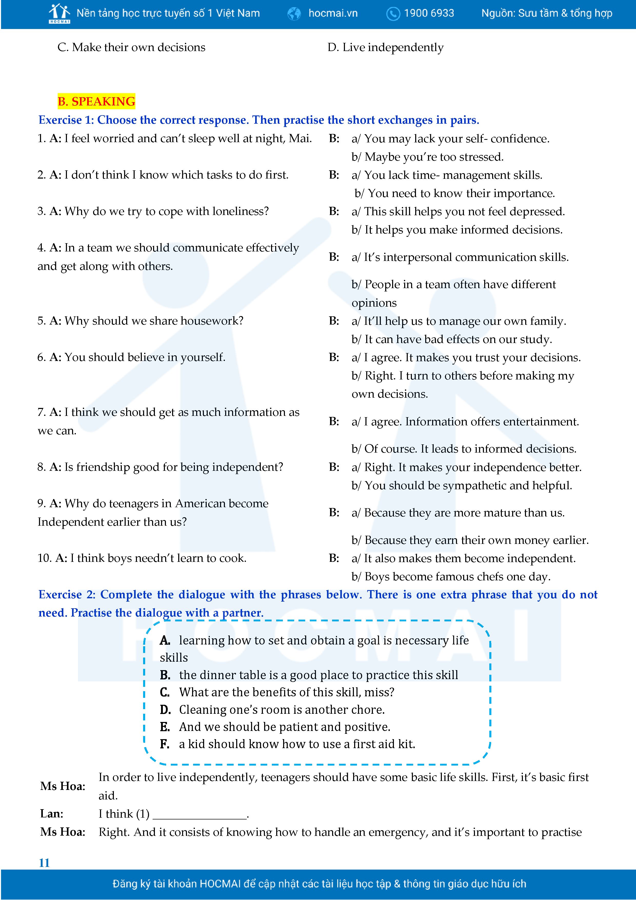 Bài Tập Bổ Trợ Anh 11 Unit 8 Becoming Independent