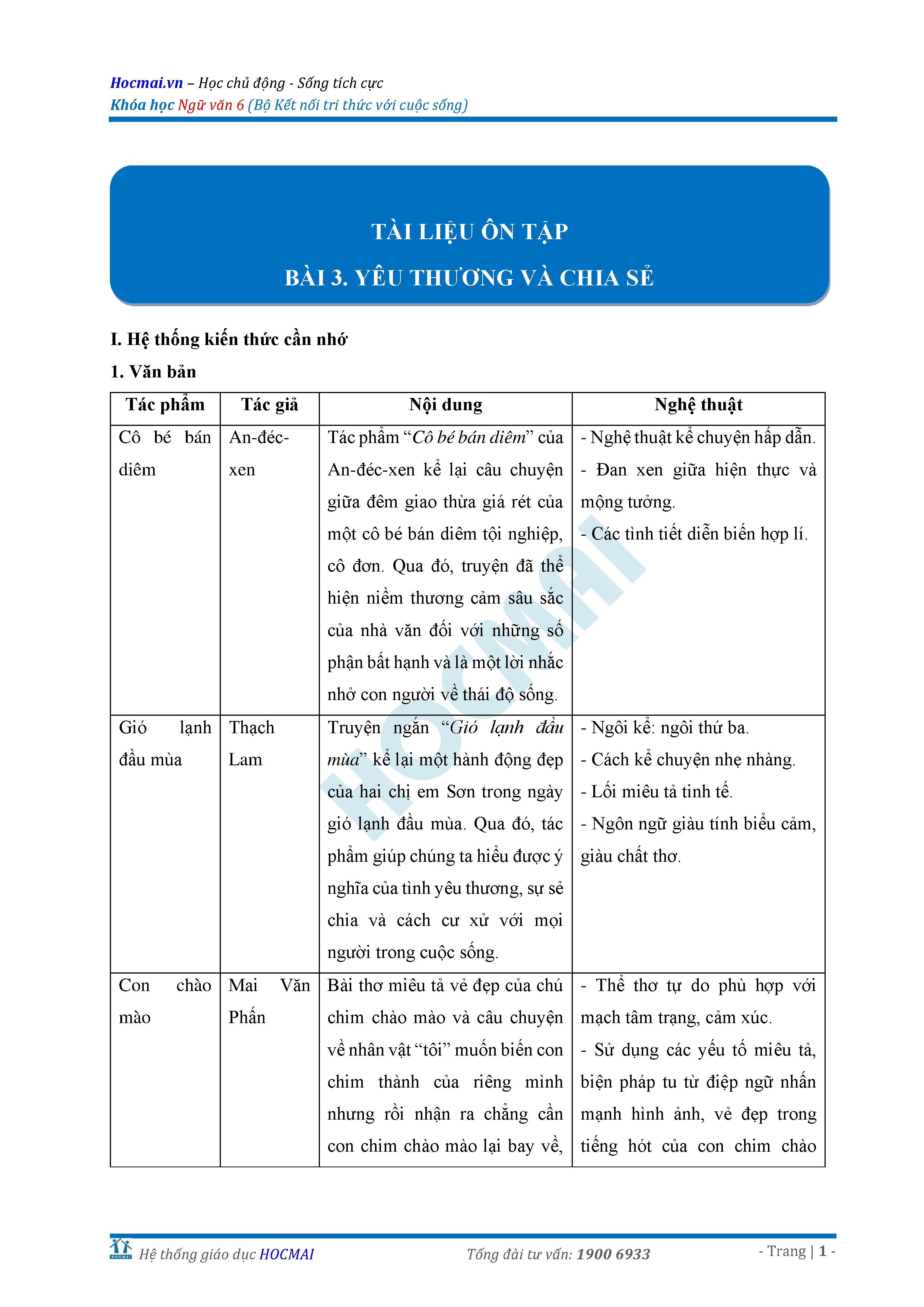 Tài liệu ôn thi giữa học kì I - Ngữ văn 6 KNTT - Chủ đề: Yêu thương và chia sẻ