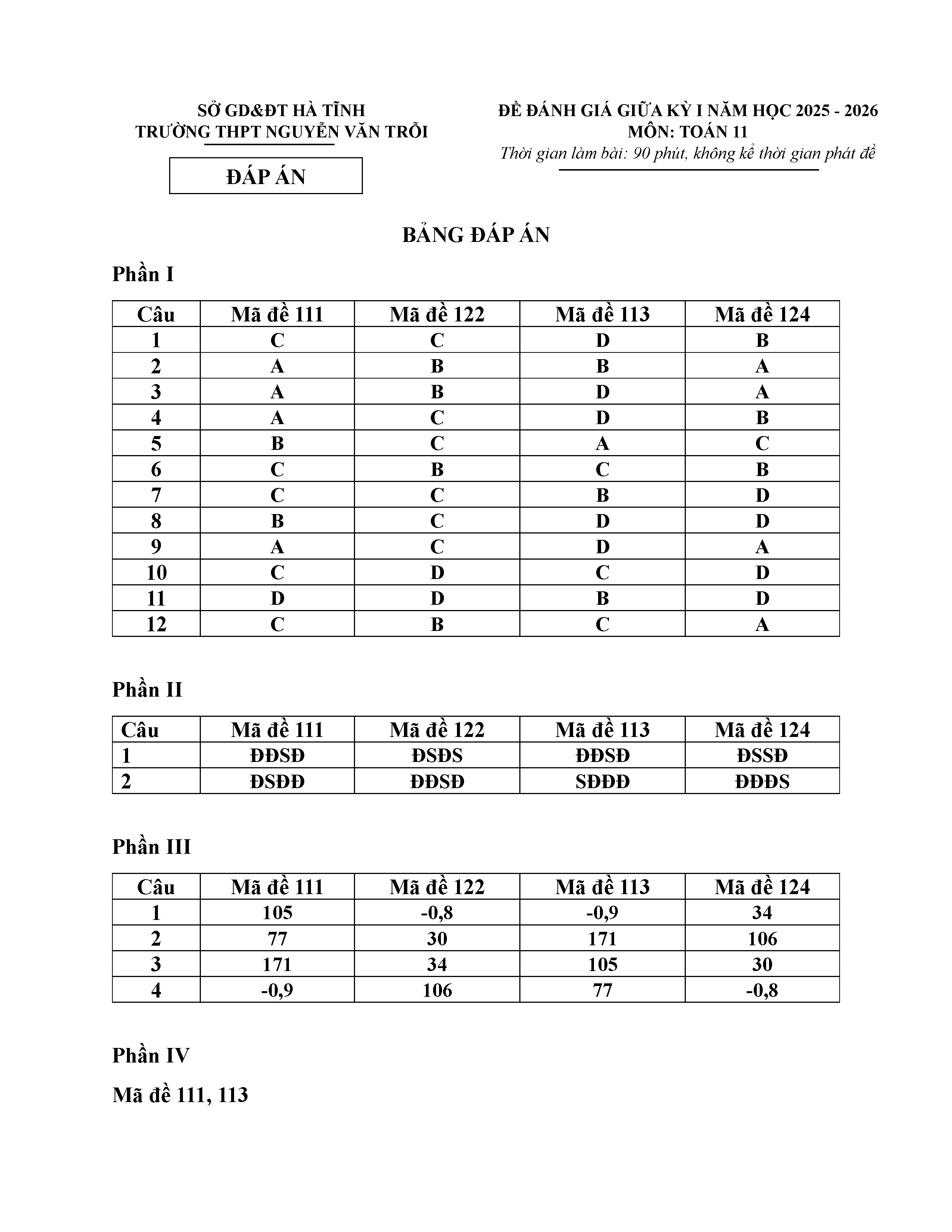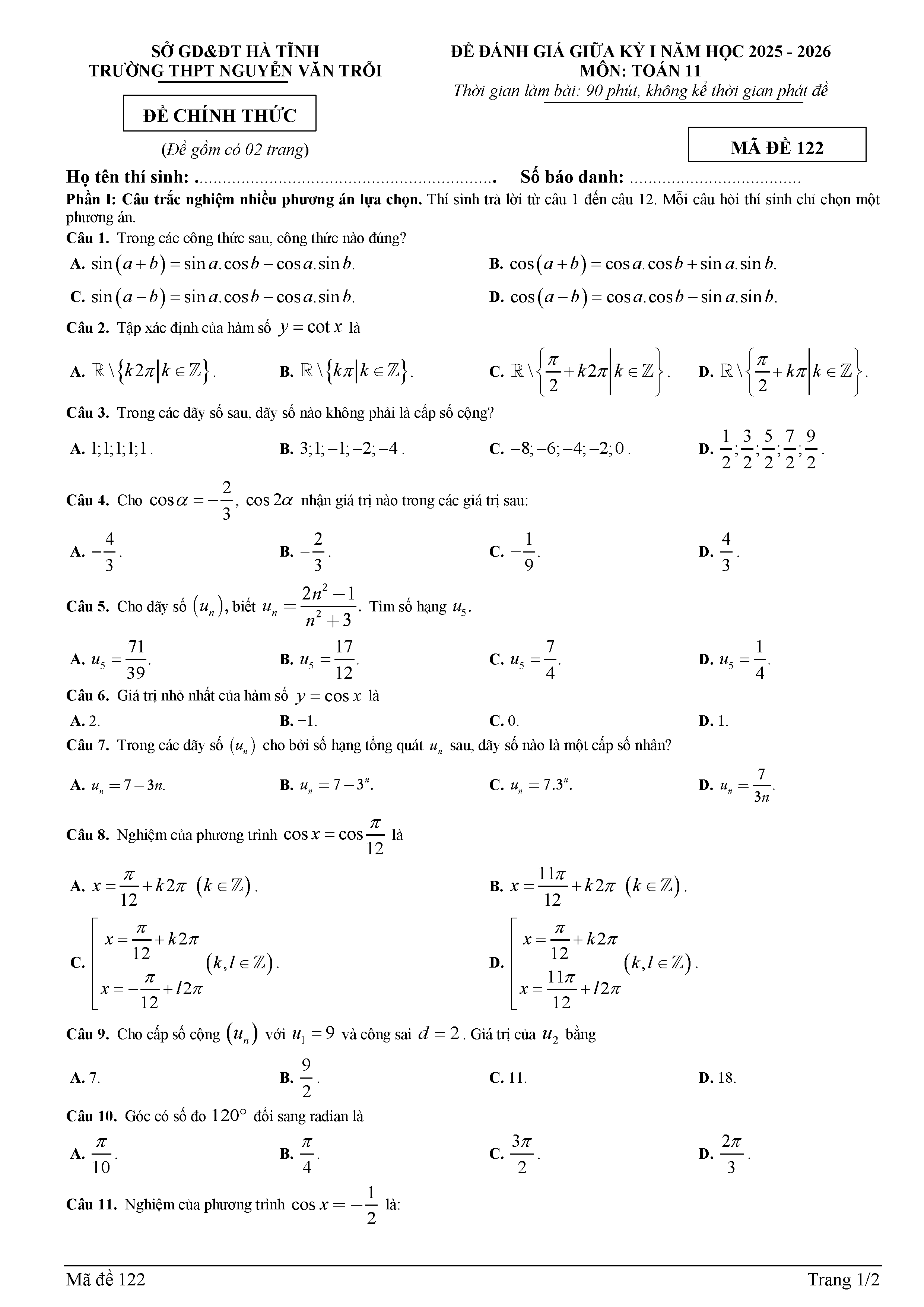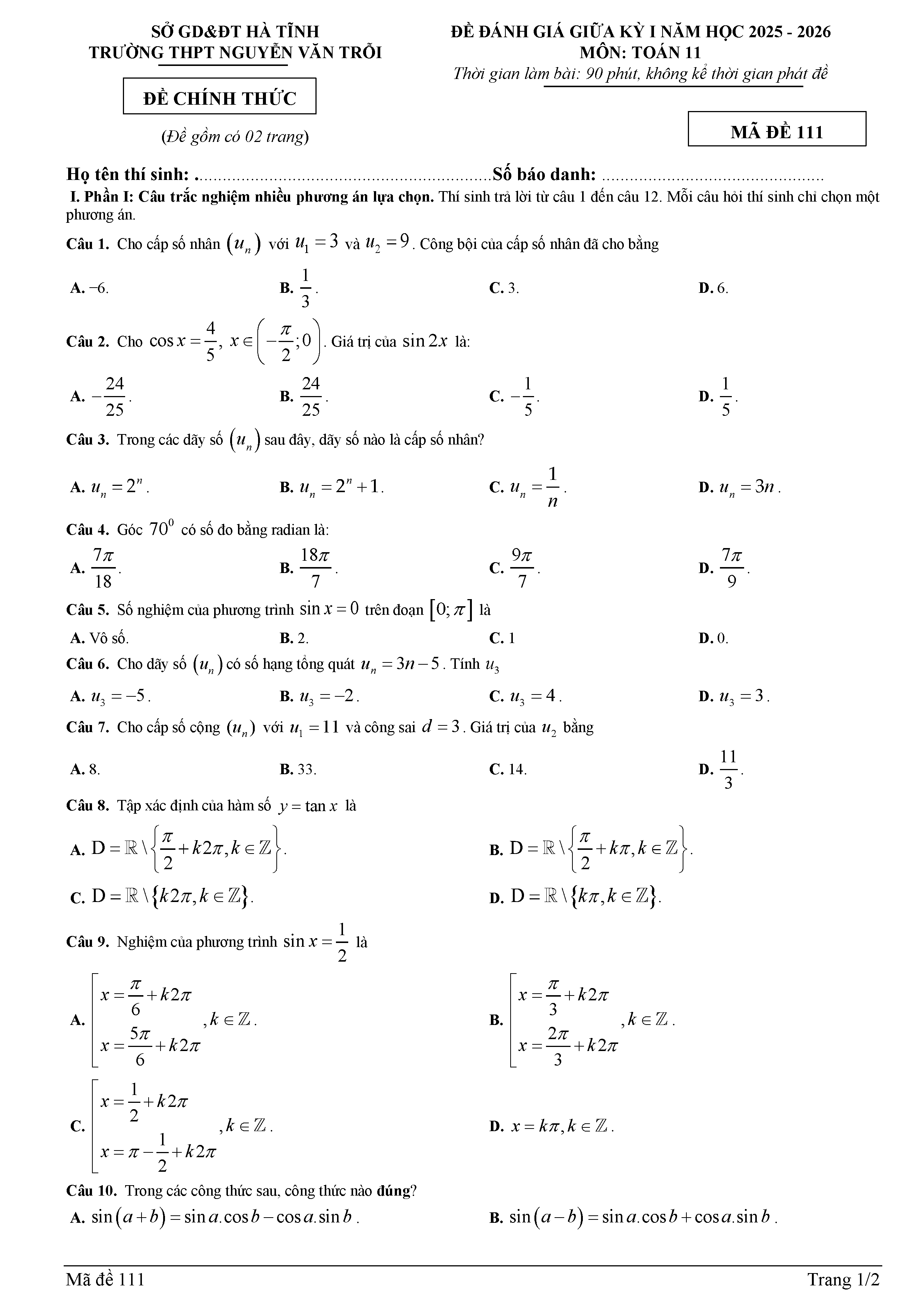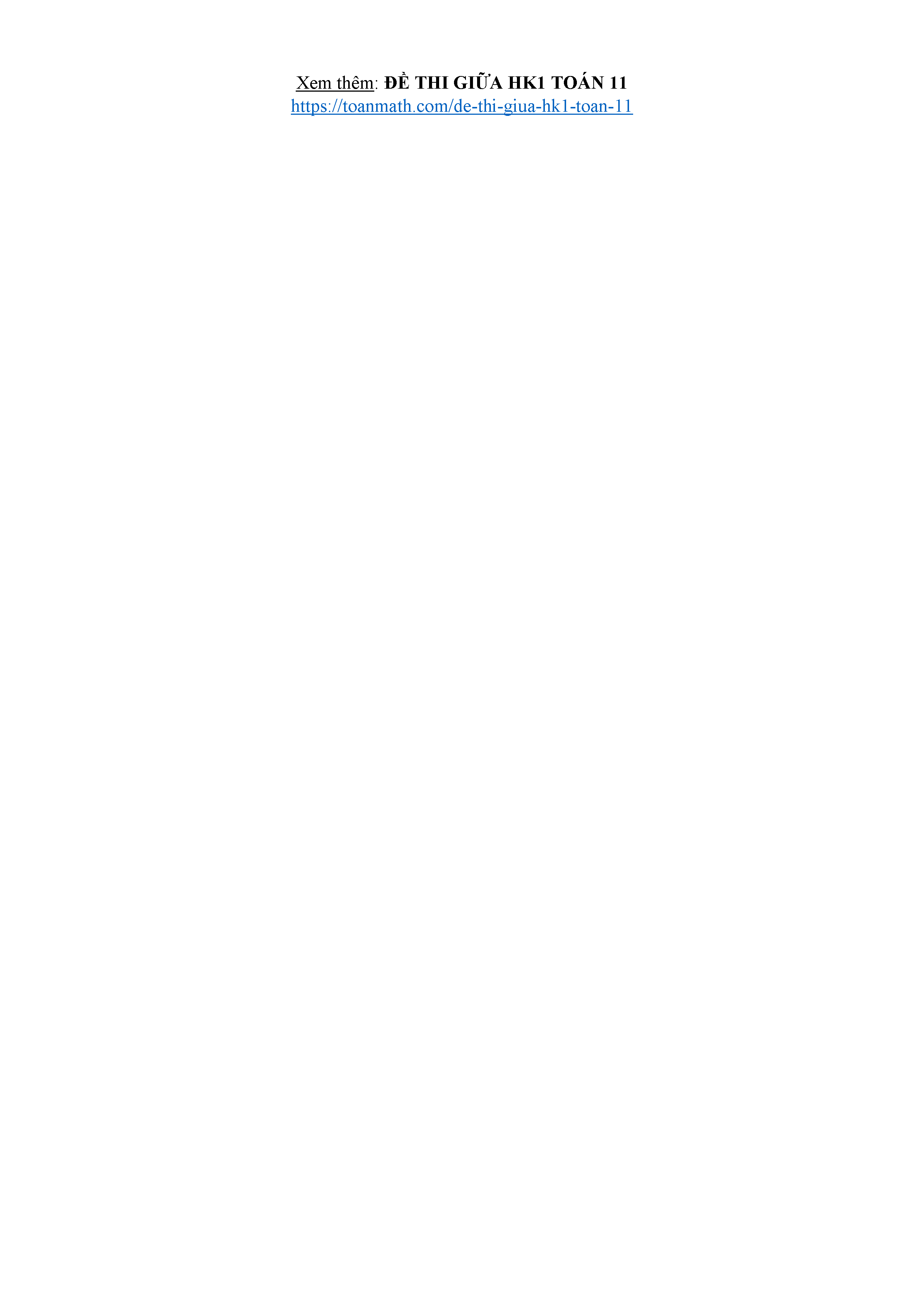 Đề giữa kỳ 1 Toán 11 năm 2025 – 2026 trường THPT Nguyễn Văn Trỗi – Hà Tĩnh kèm đáp án