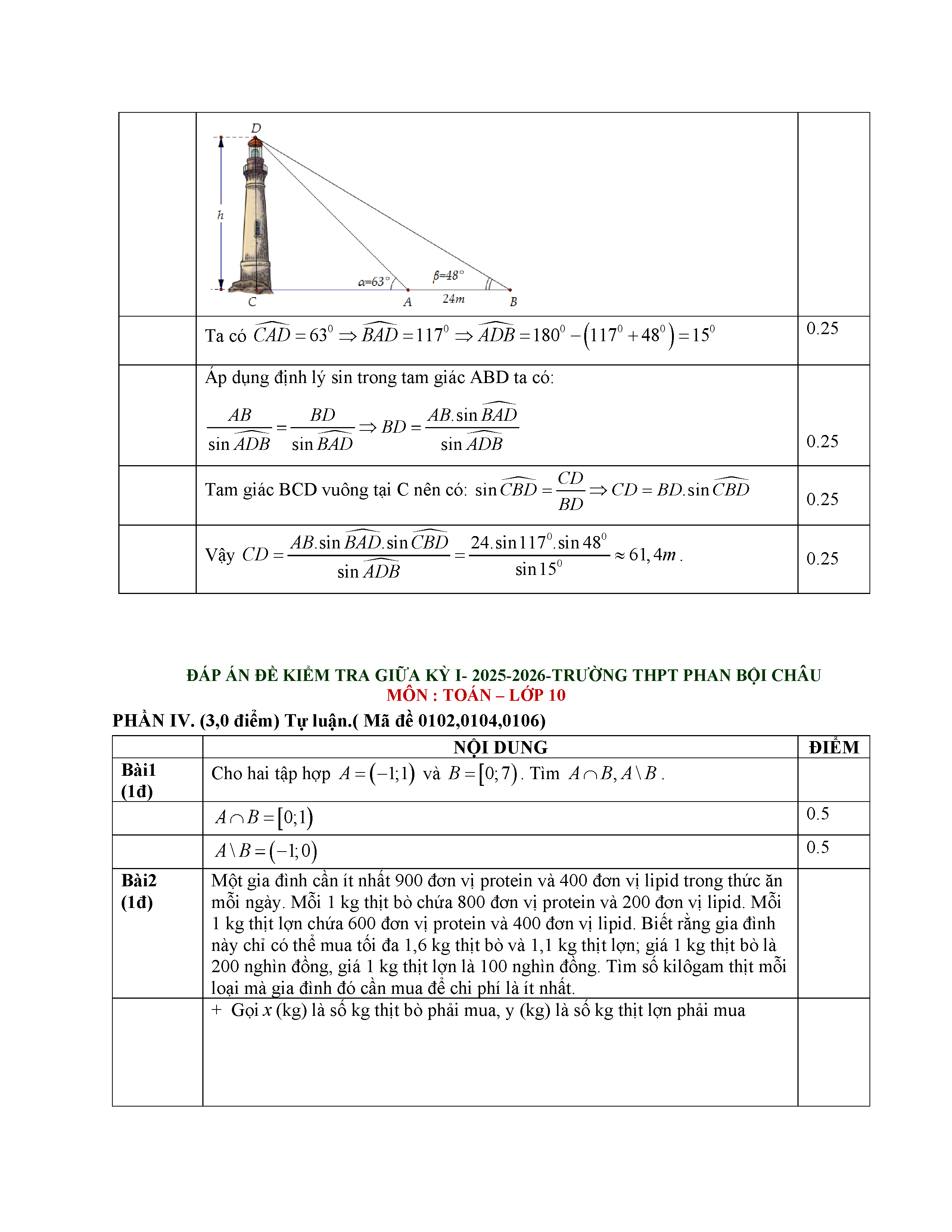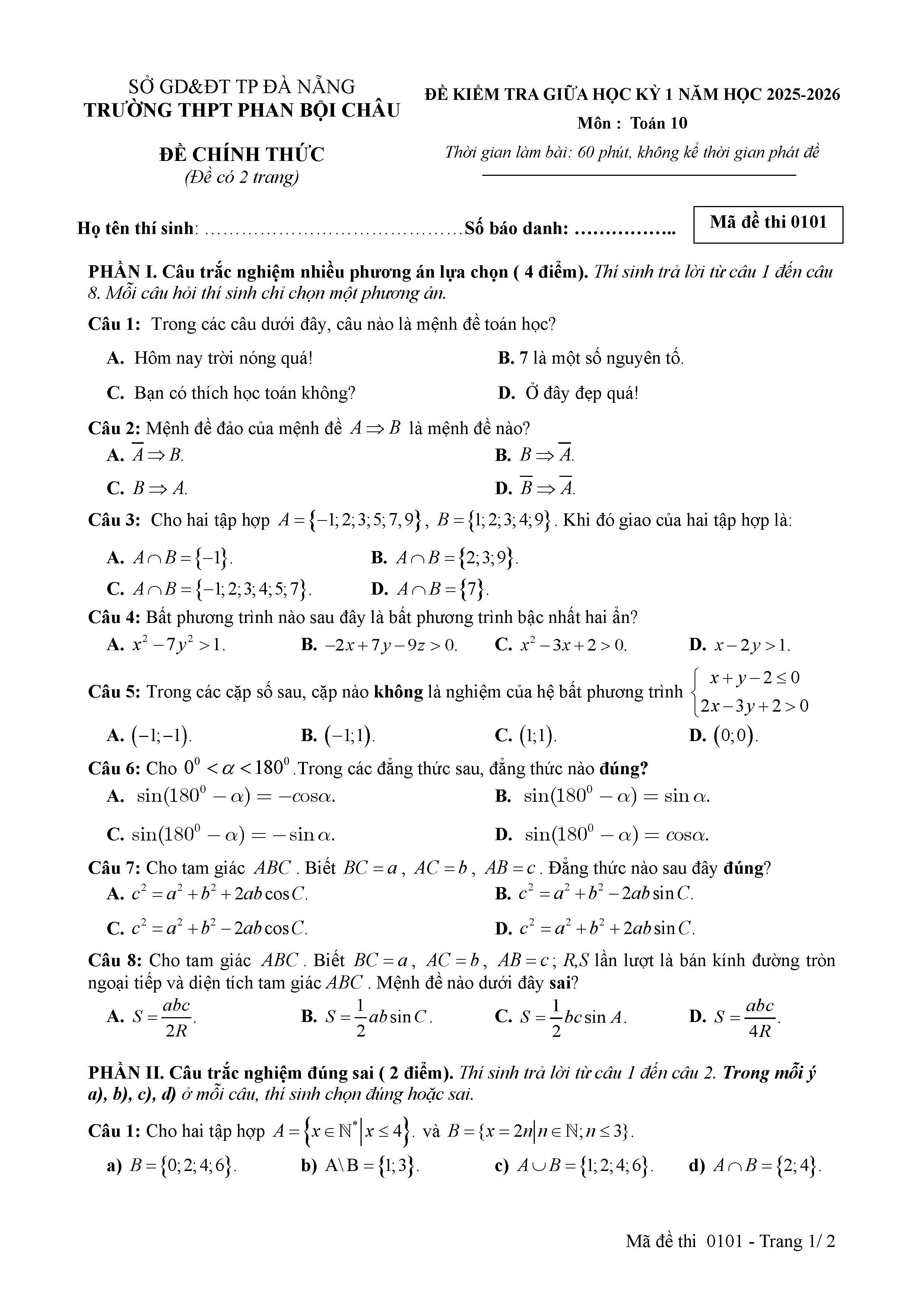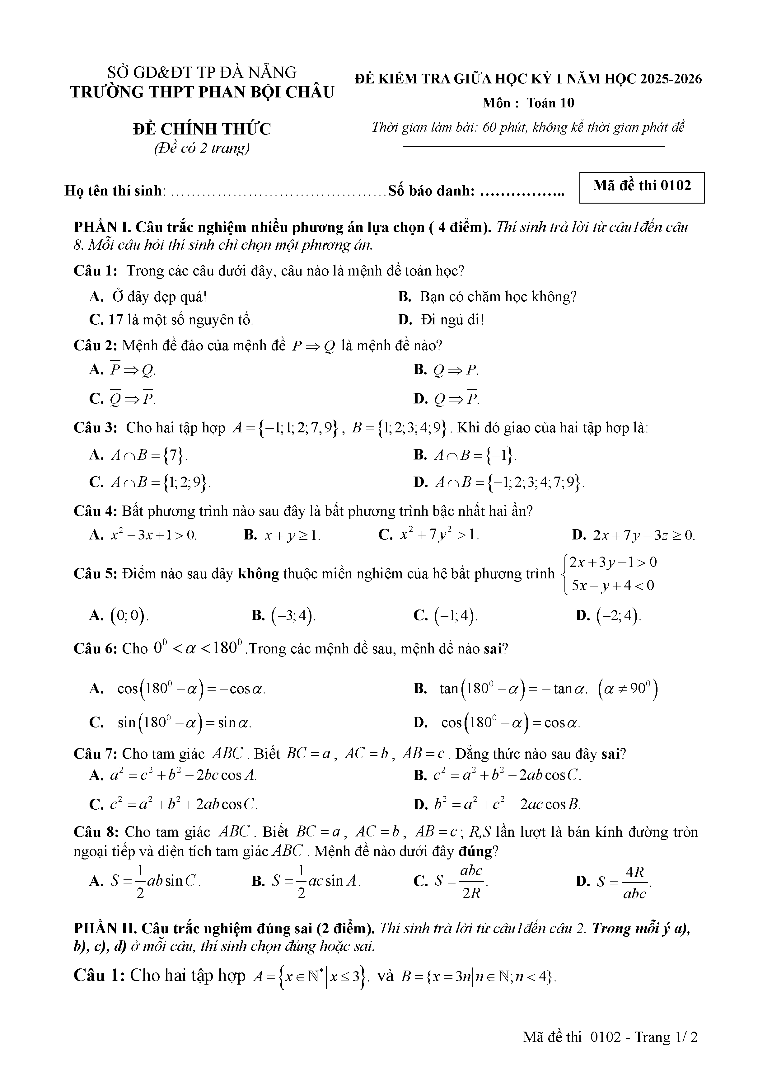 Đề giữa học kỳ 1 Toán 10 năm 2025 – 2026 trường THPT Phan Bội Châu – Đà Nẵng kèm đáp án và lời giải chi tiết