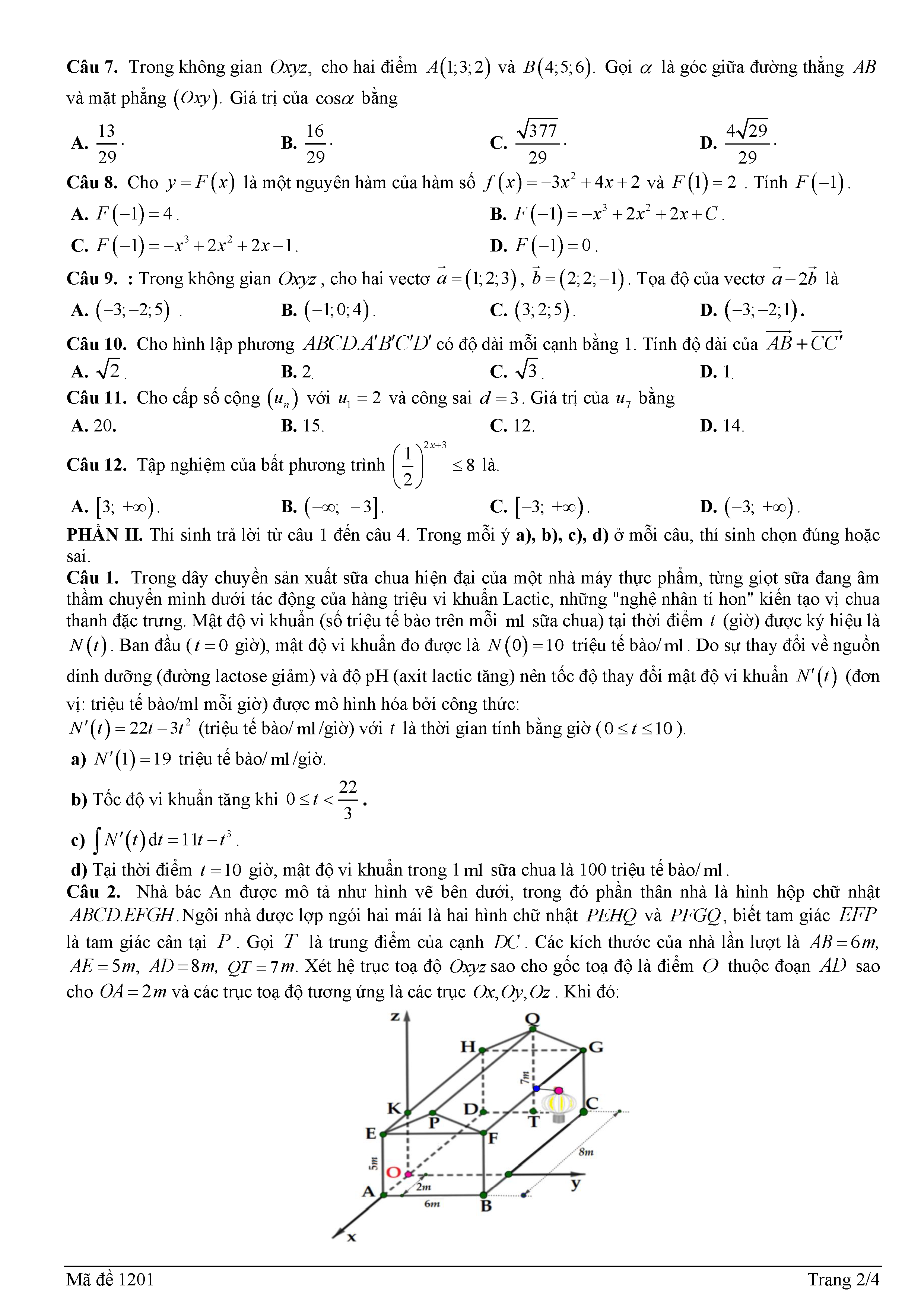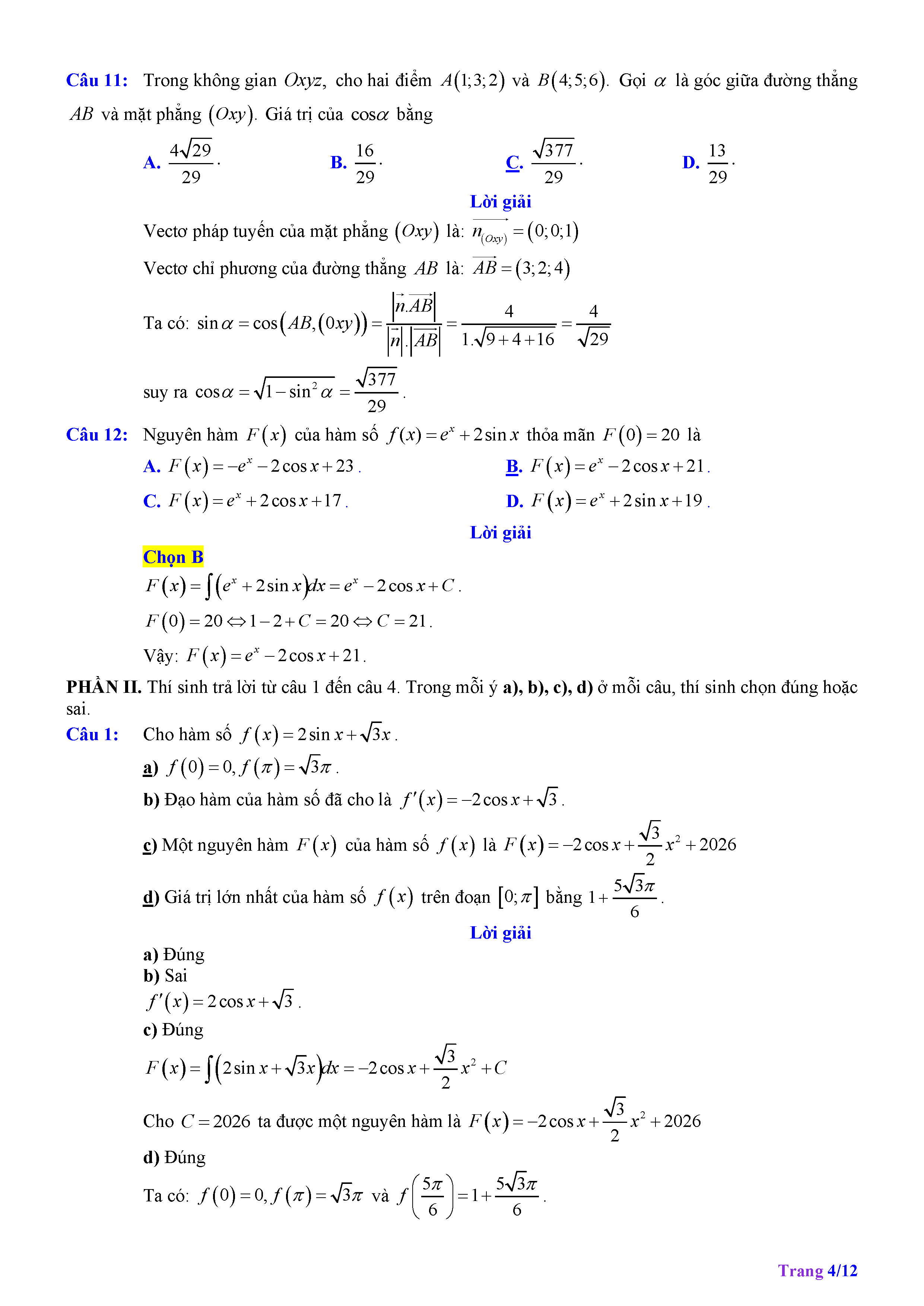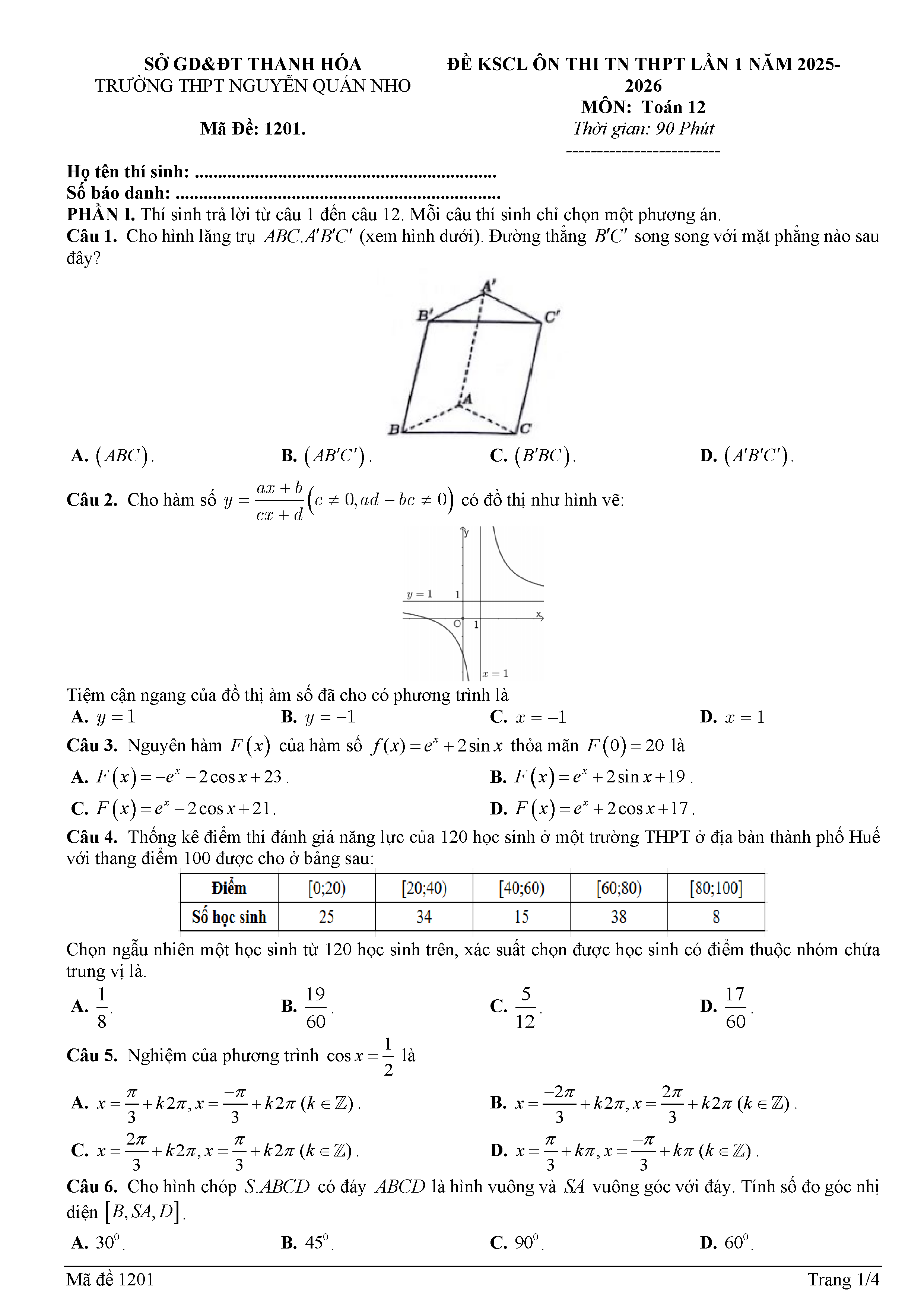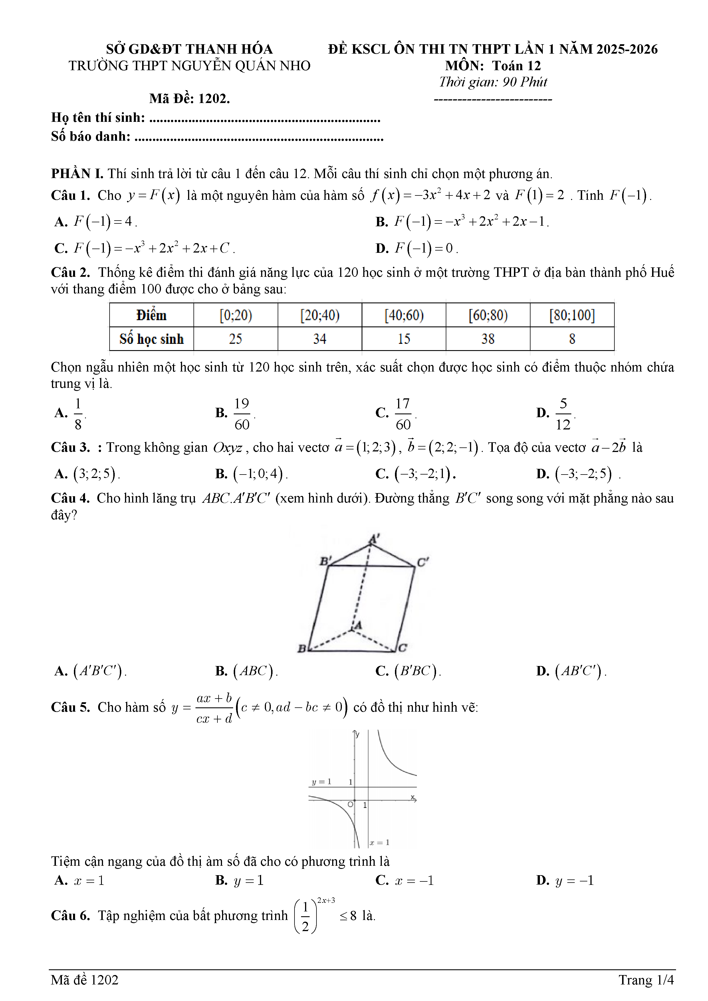 Đề KSCL Toán 12 thi TN THPT 2026 lần 1 trường THPT Nguyễn Quán Nho – Thanh Hóa kèm đáp án và lời giải chi tiết