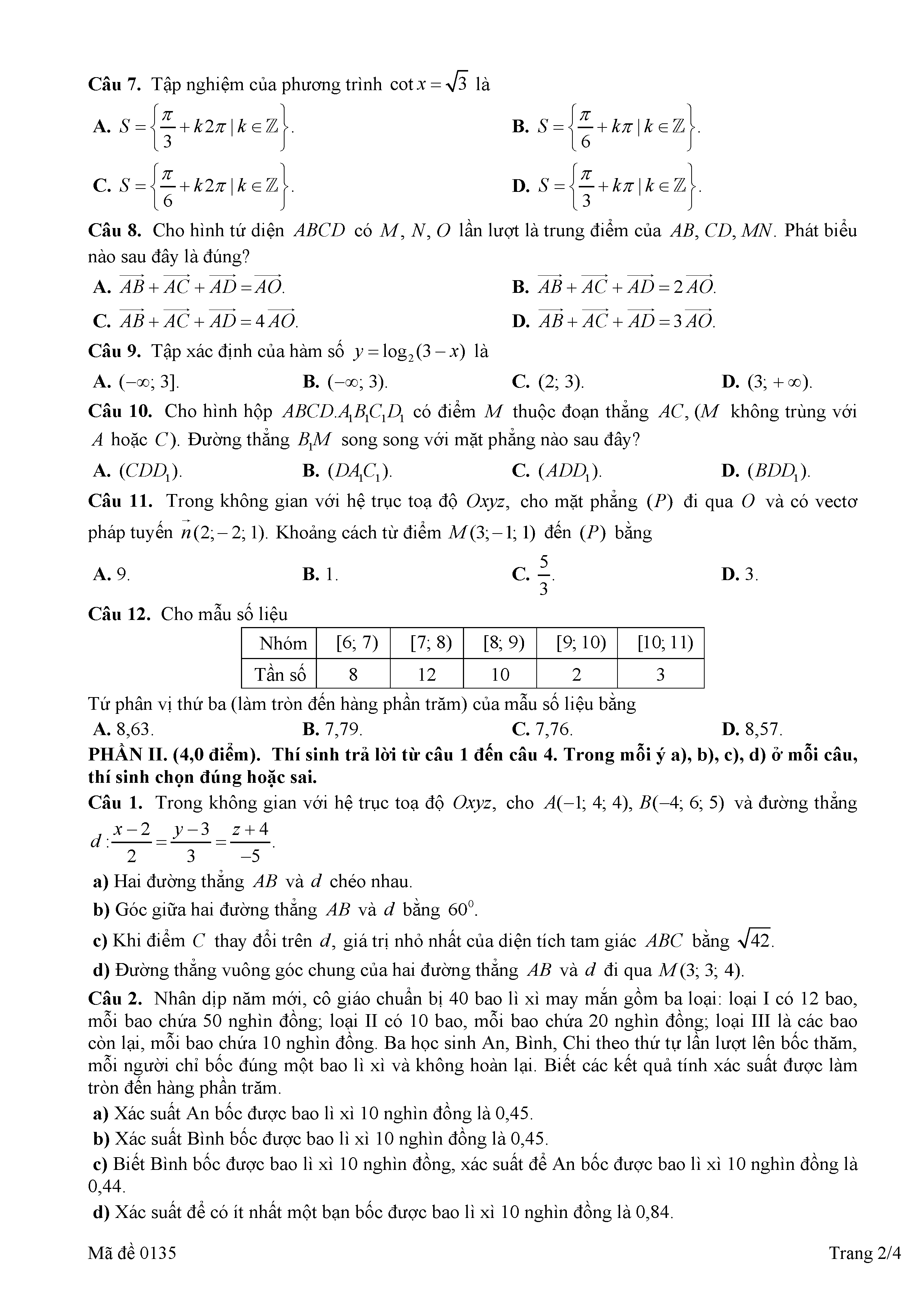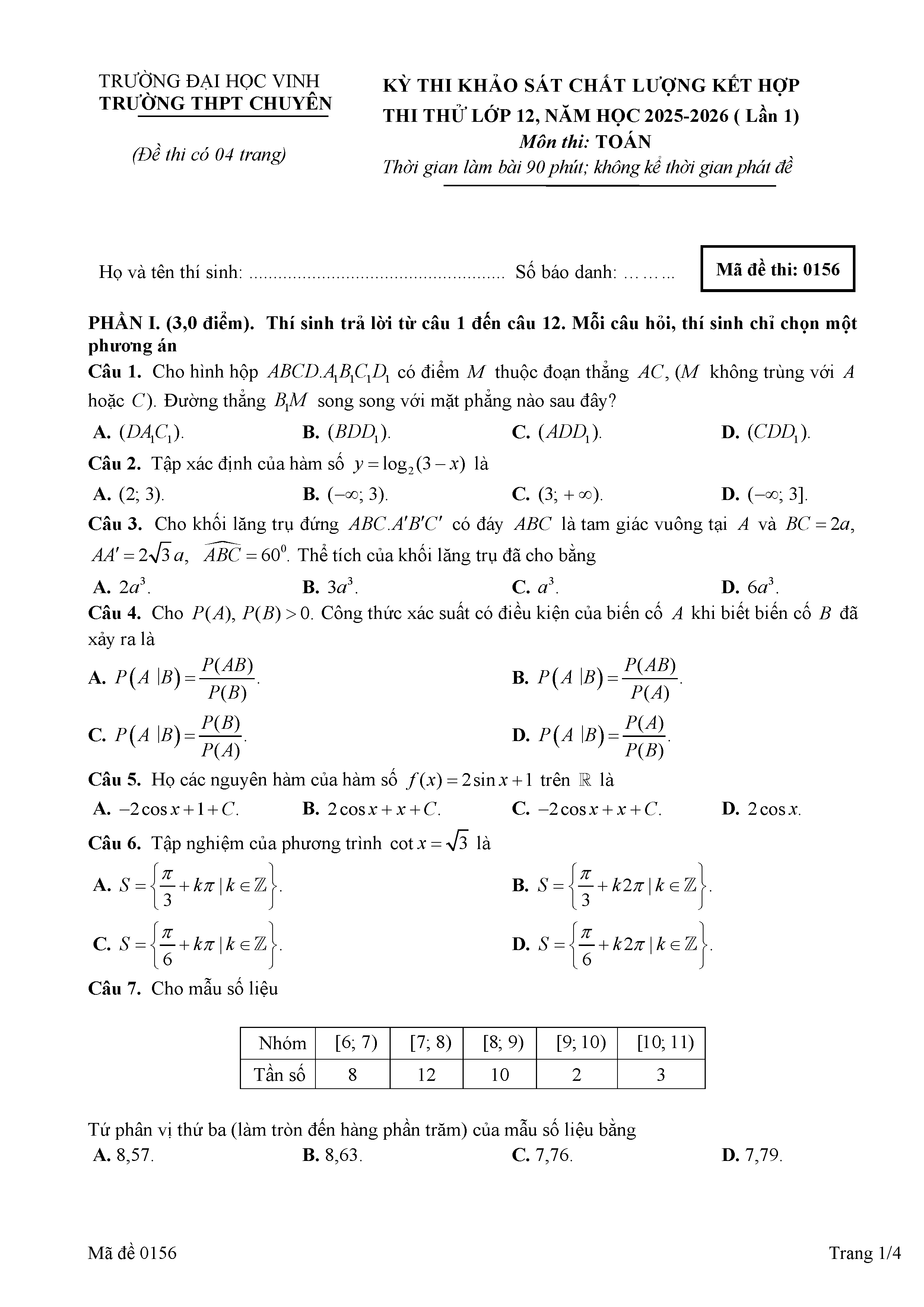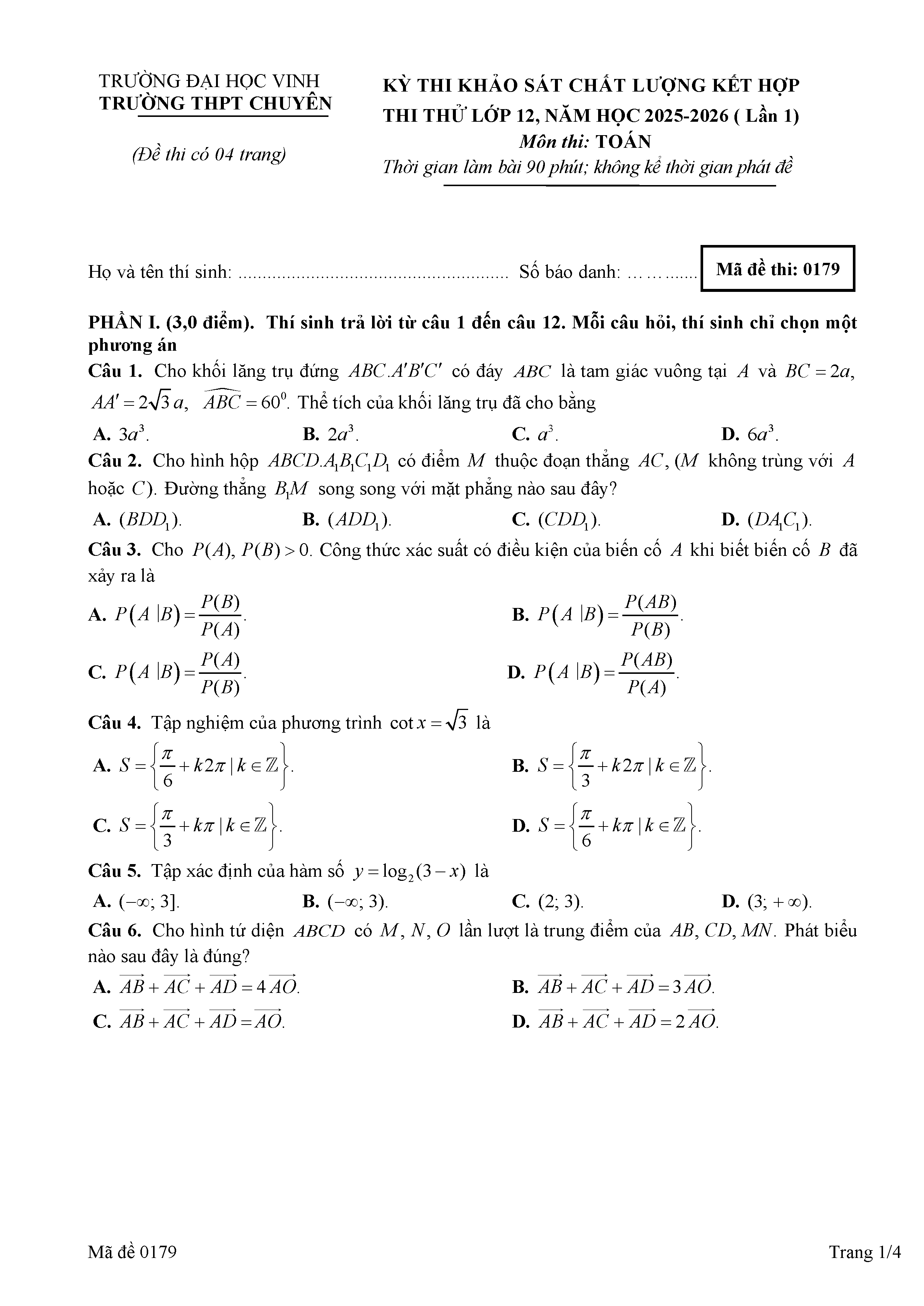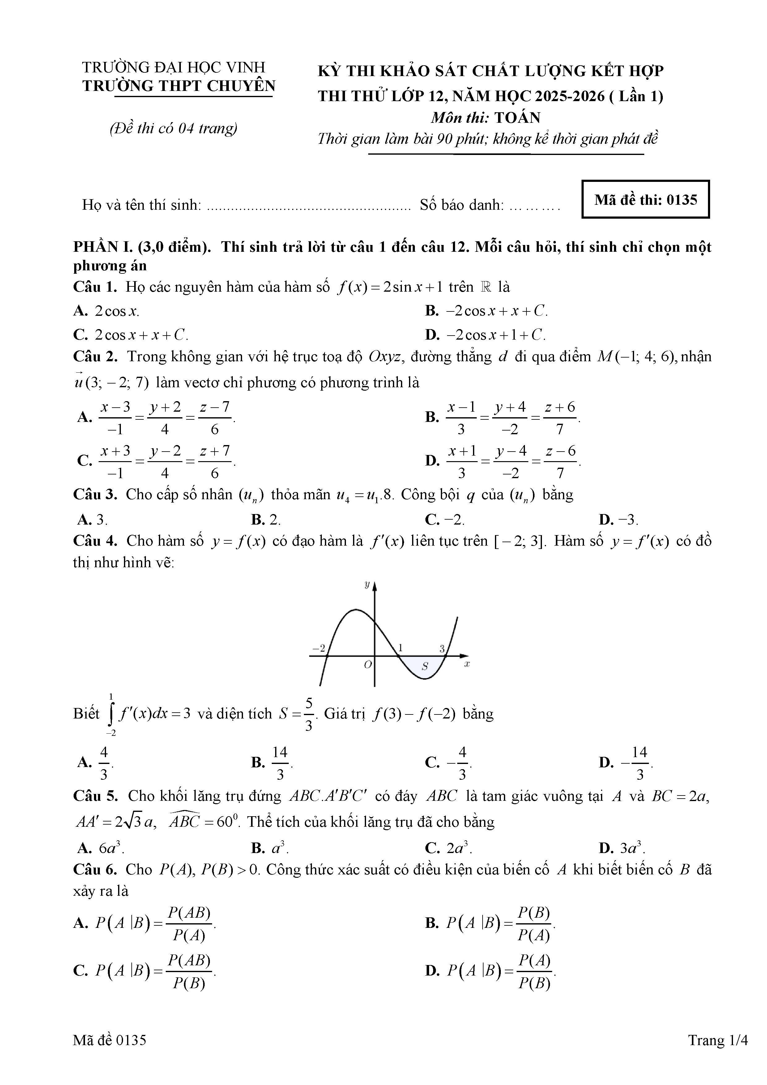 Đề thi thử TN THPT 2026 môn Toán lần 1 trường chuyên ĐH Vinh – Nghệ An