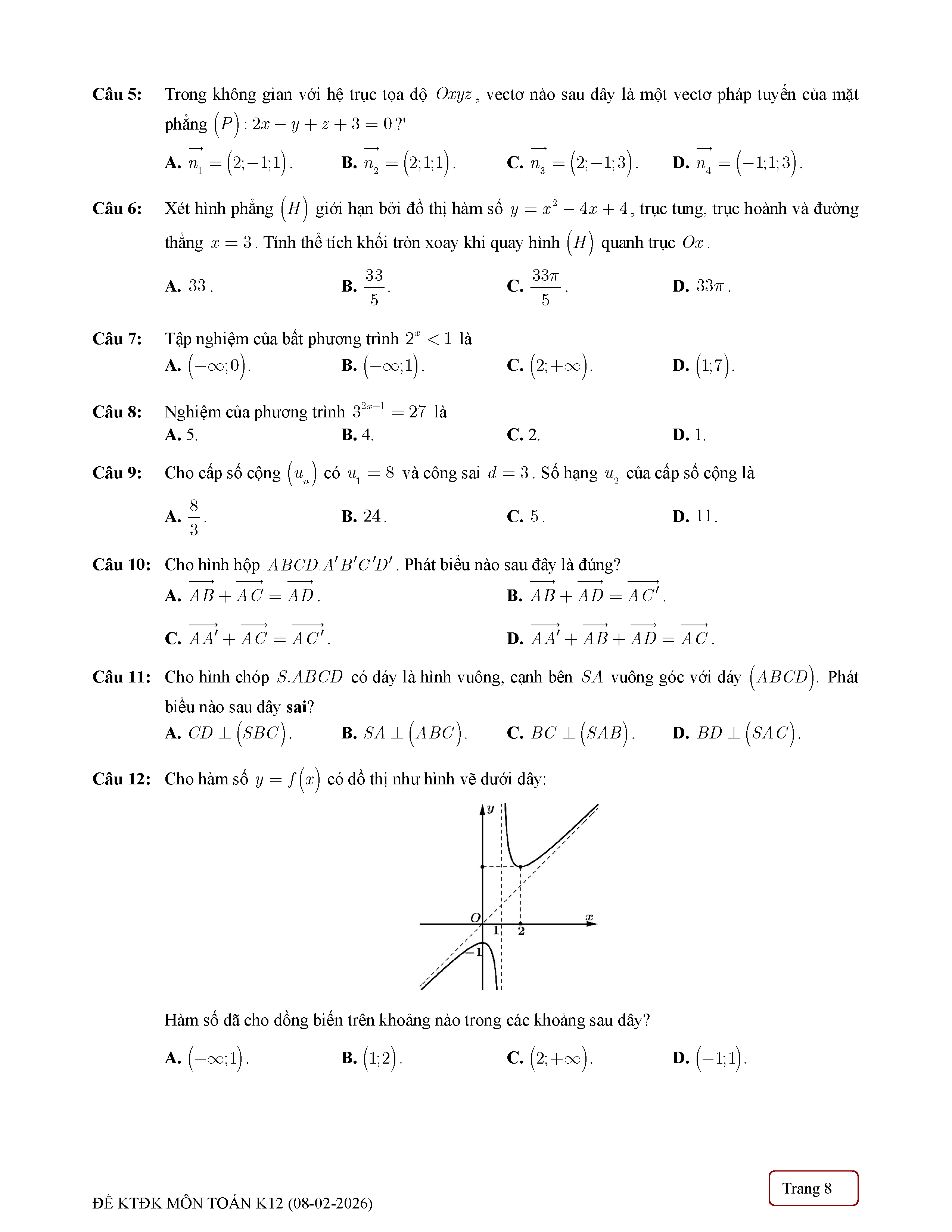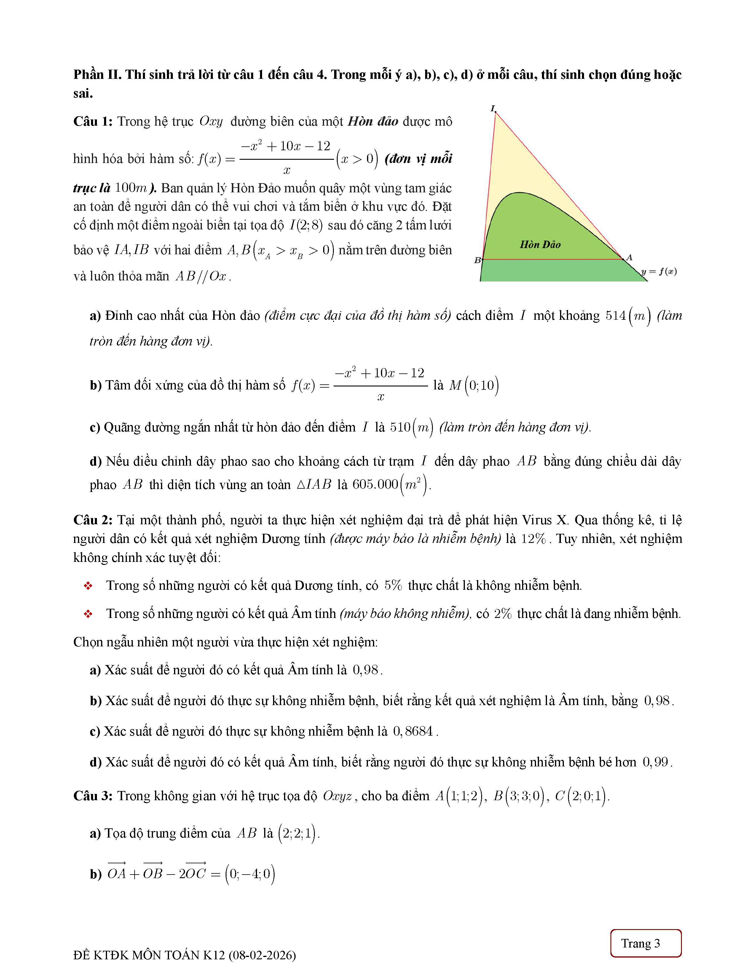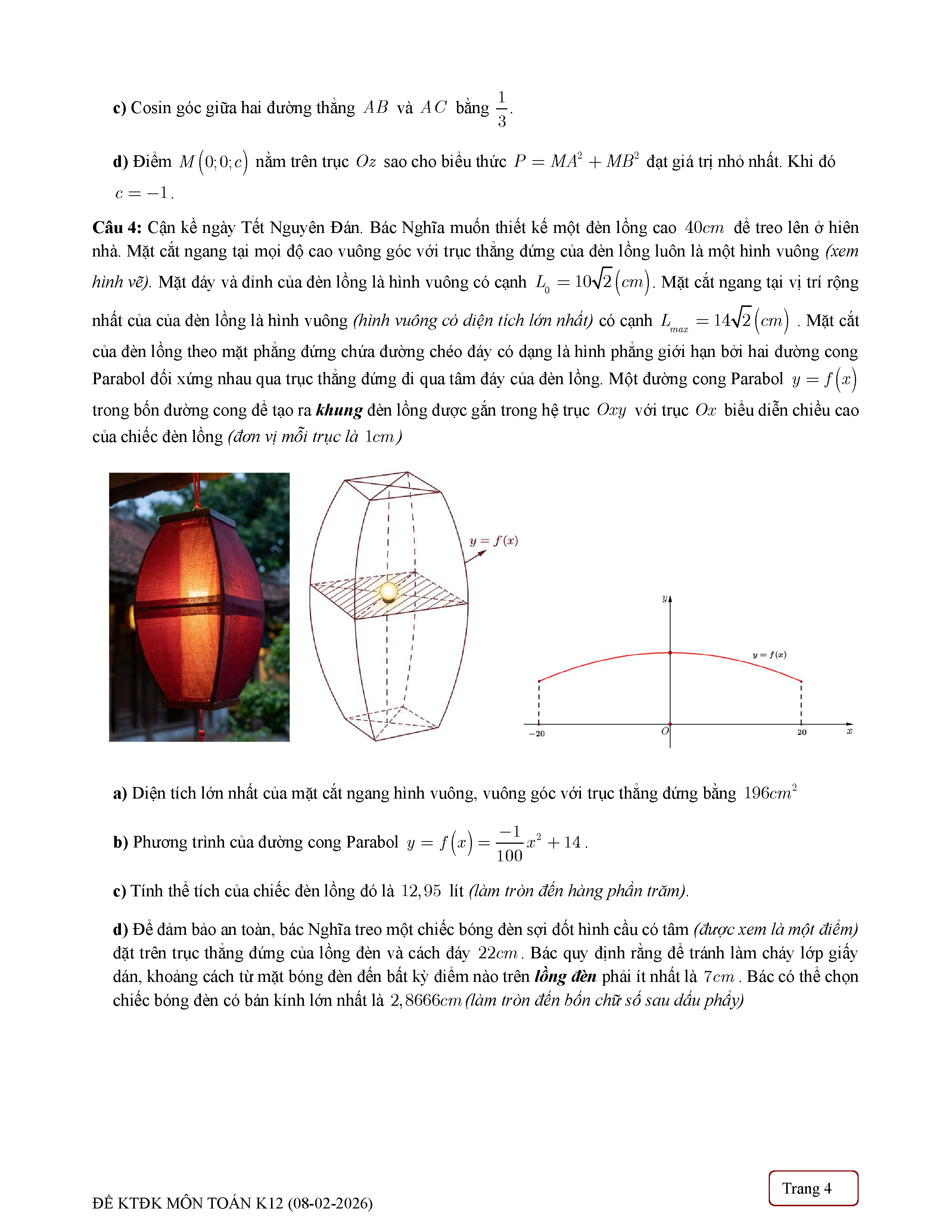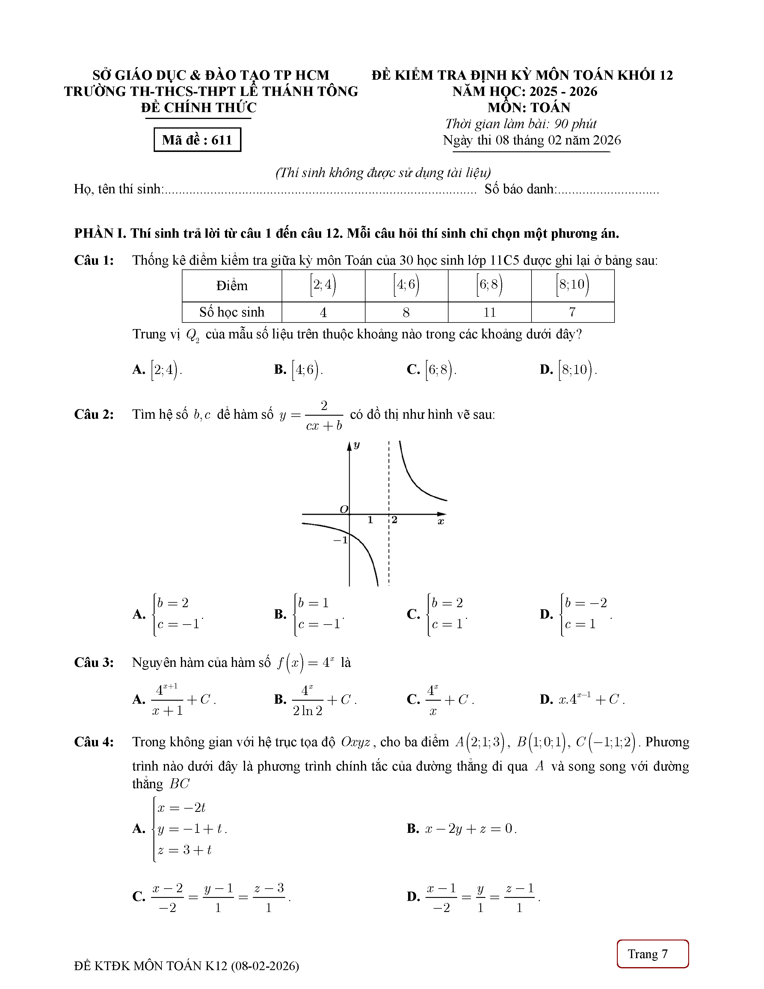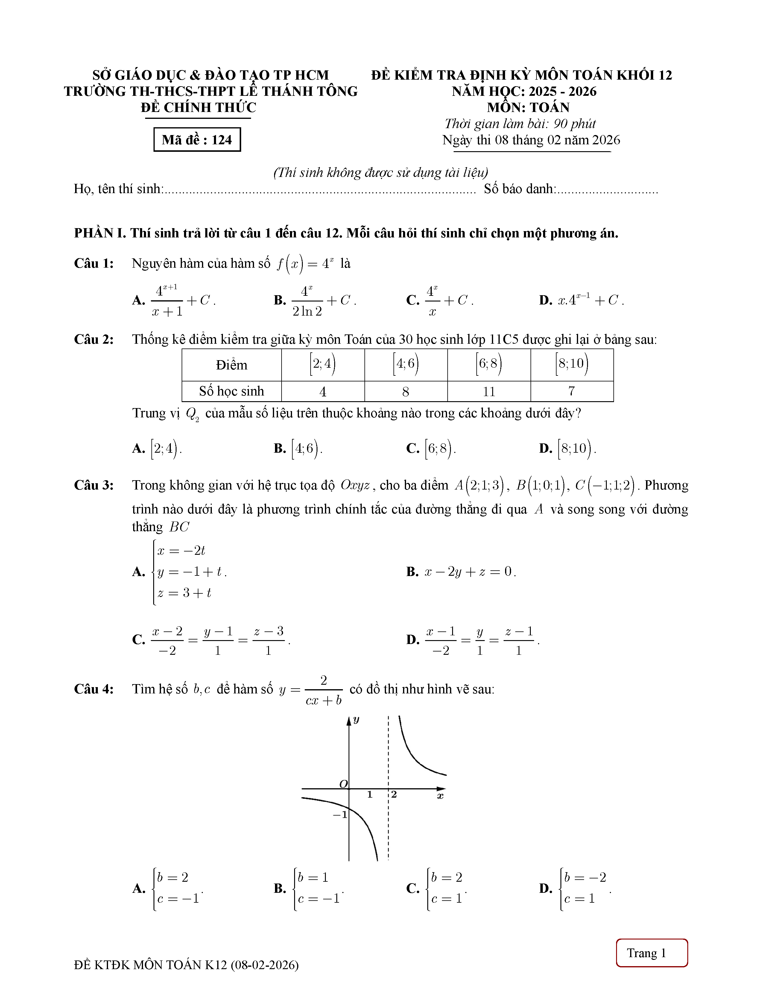 Đề kiểm tra Toán 12 tháng 2 năm 2026 trường Lê Thánh Tông – TP HCM kèm đáp án