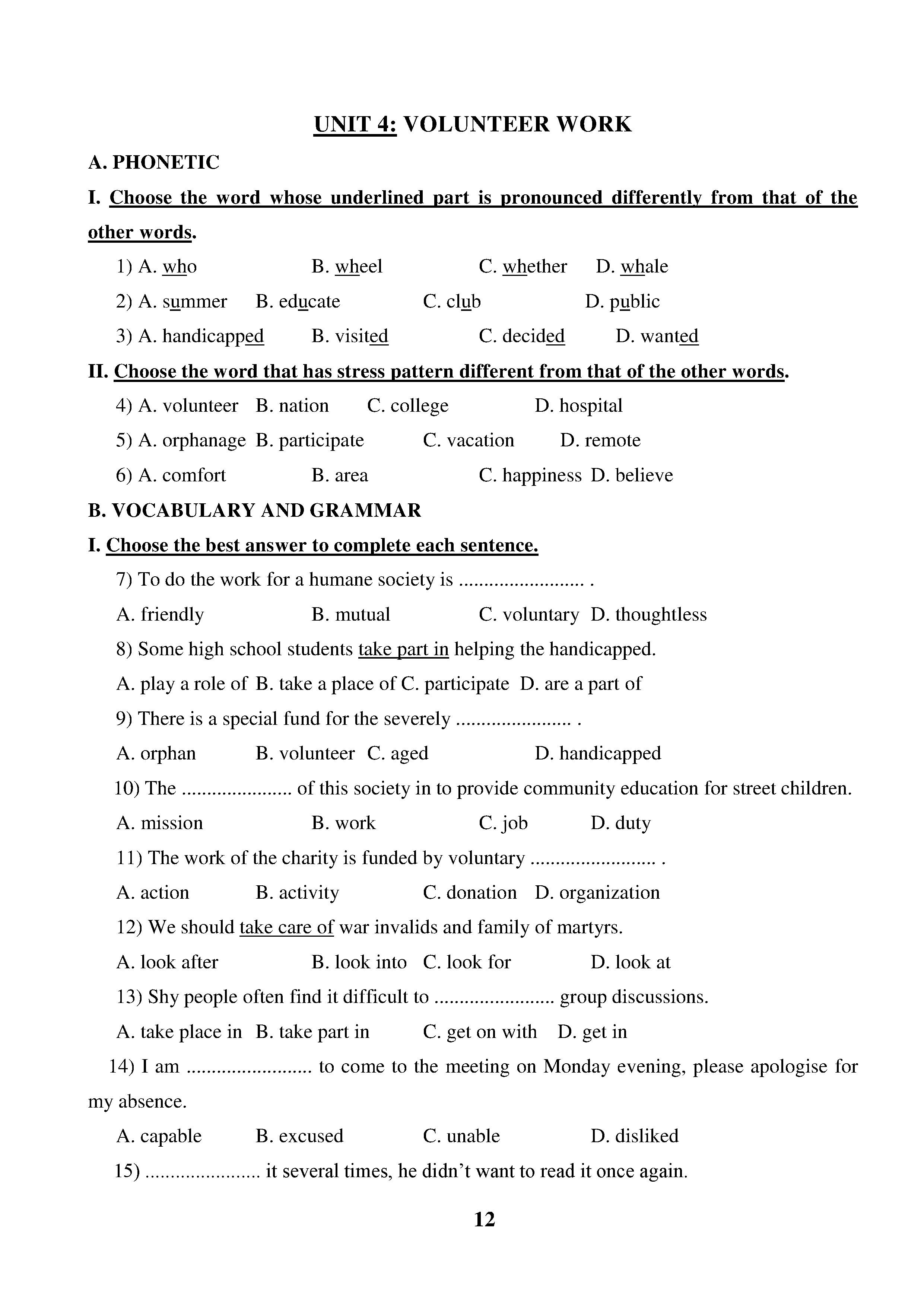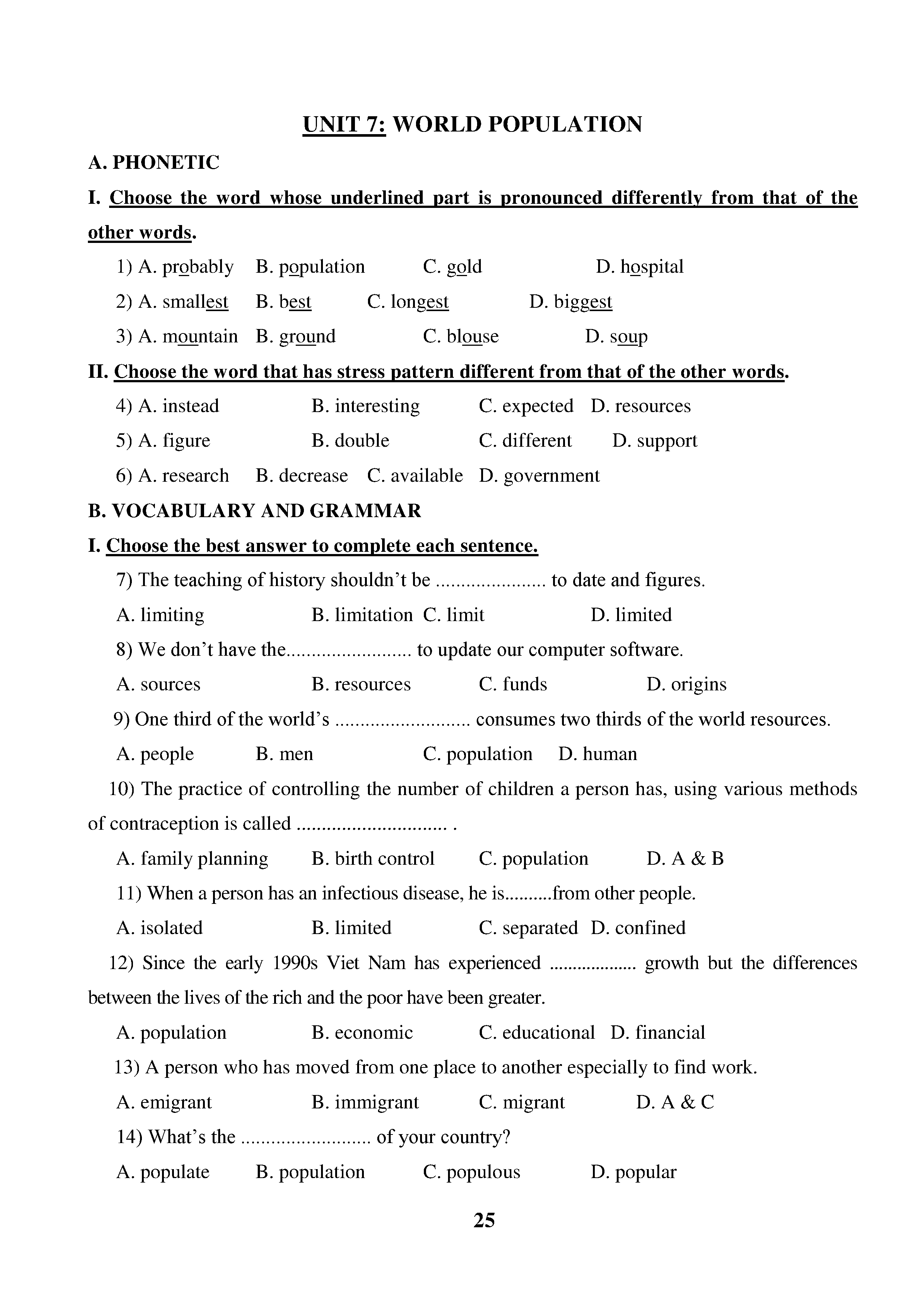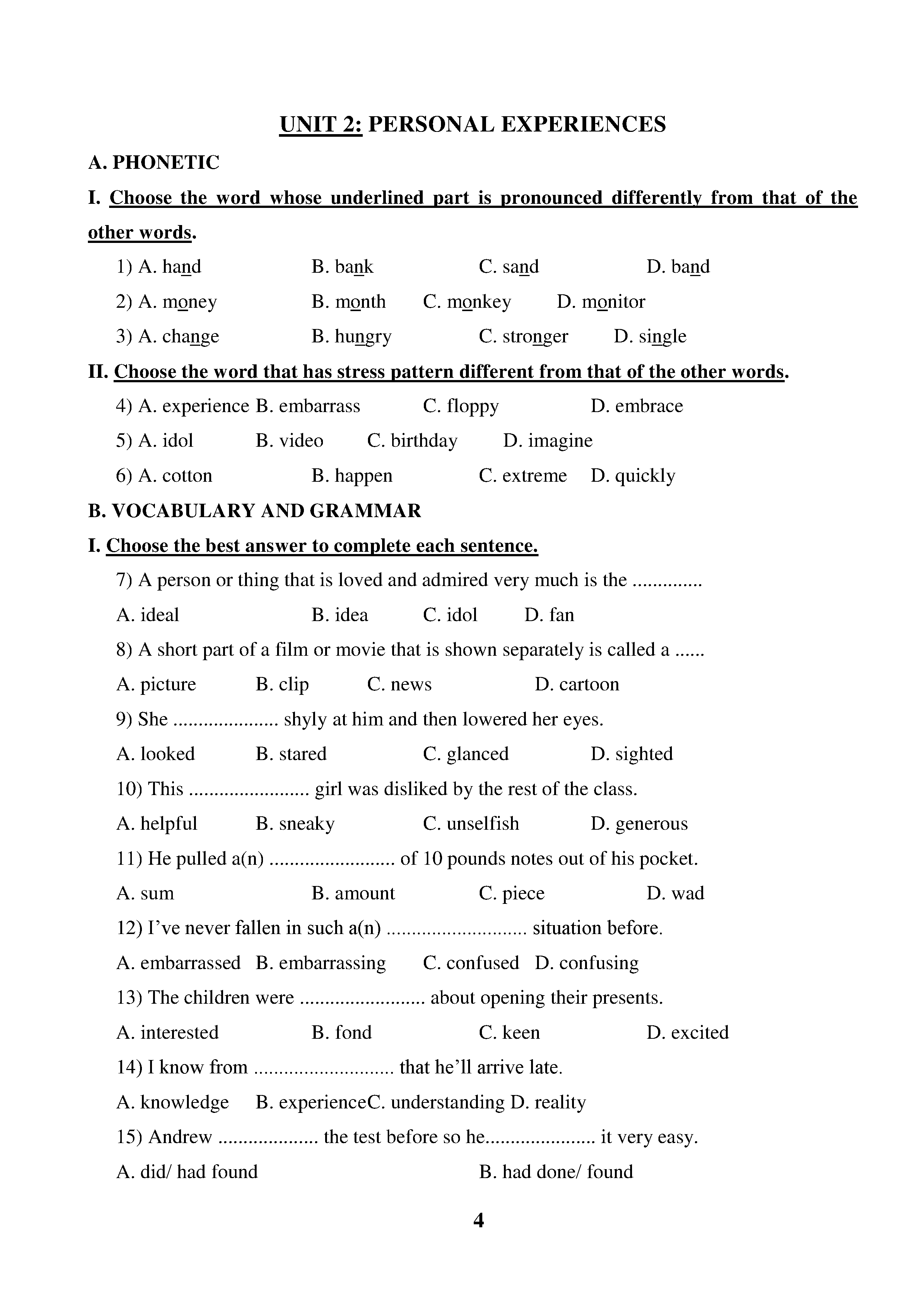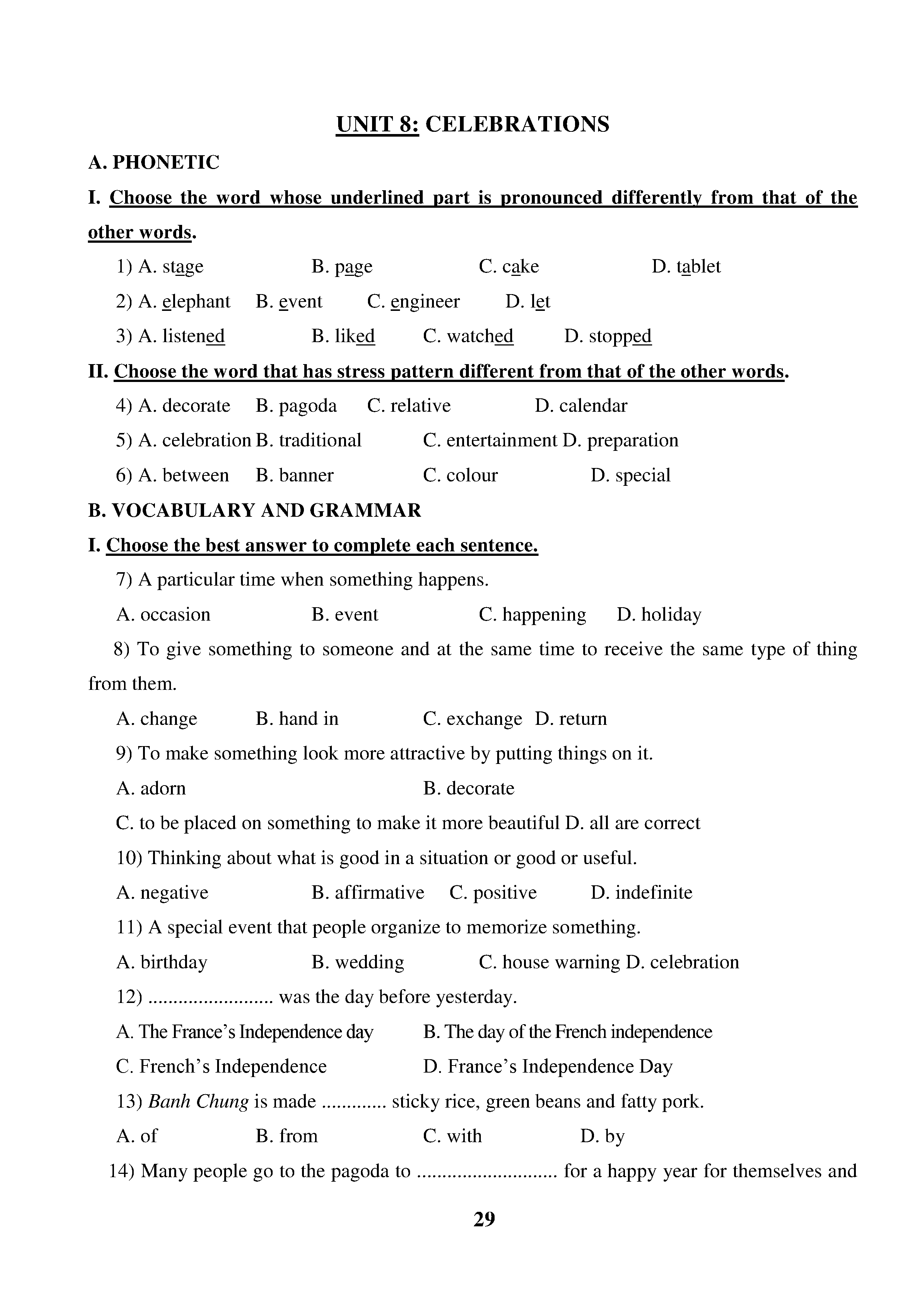 Bài tập trắc nghiệm Tiếng Anh 11 theo từng Unit (học kì 1)