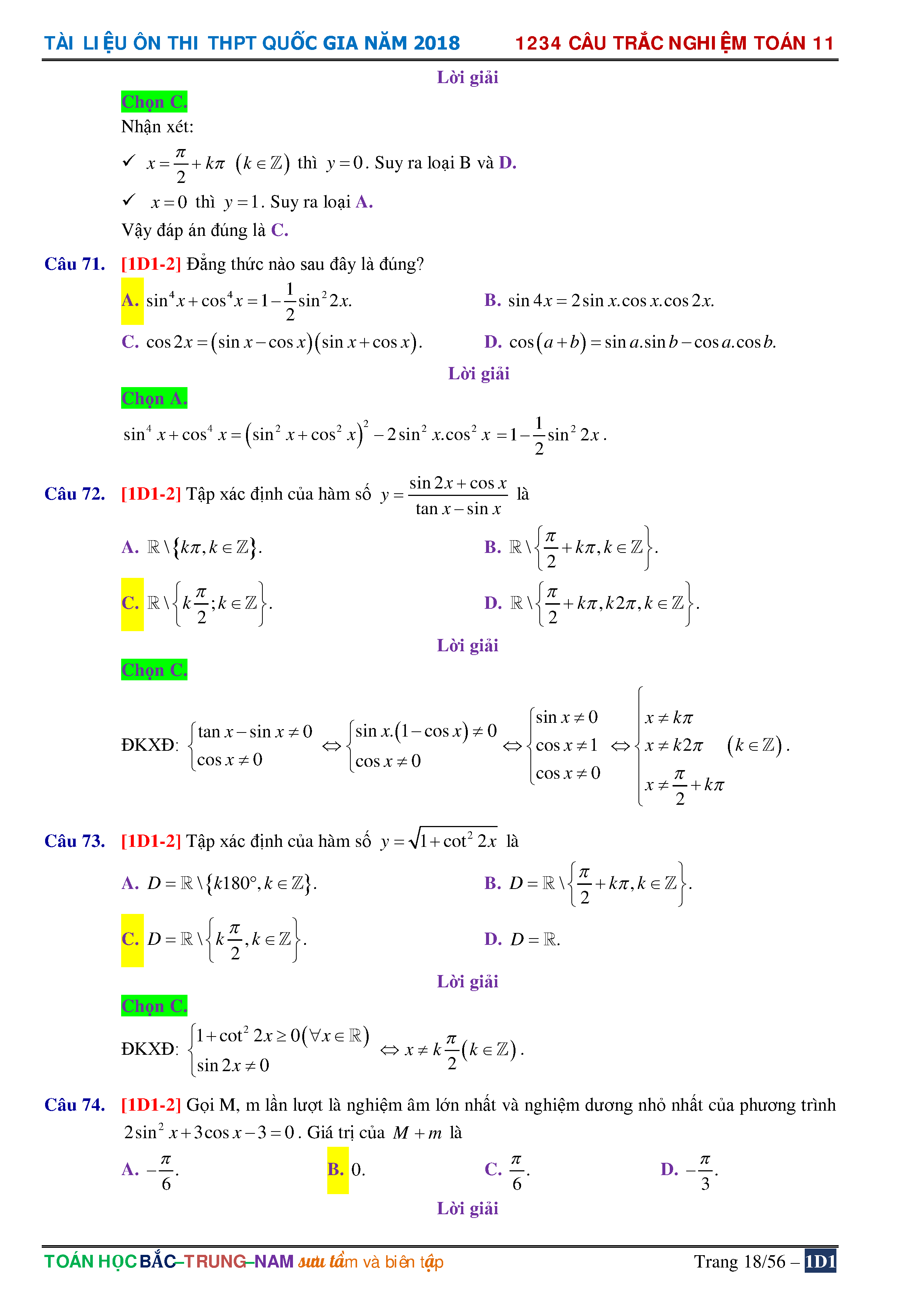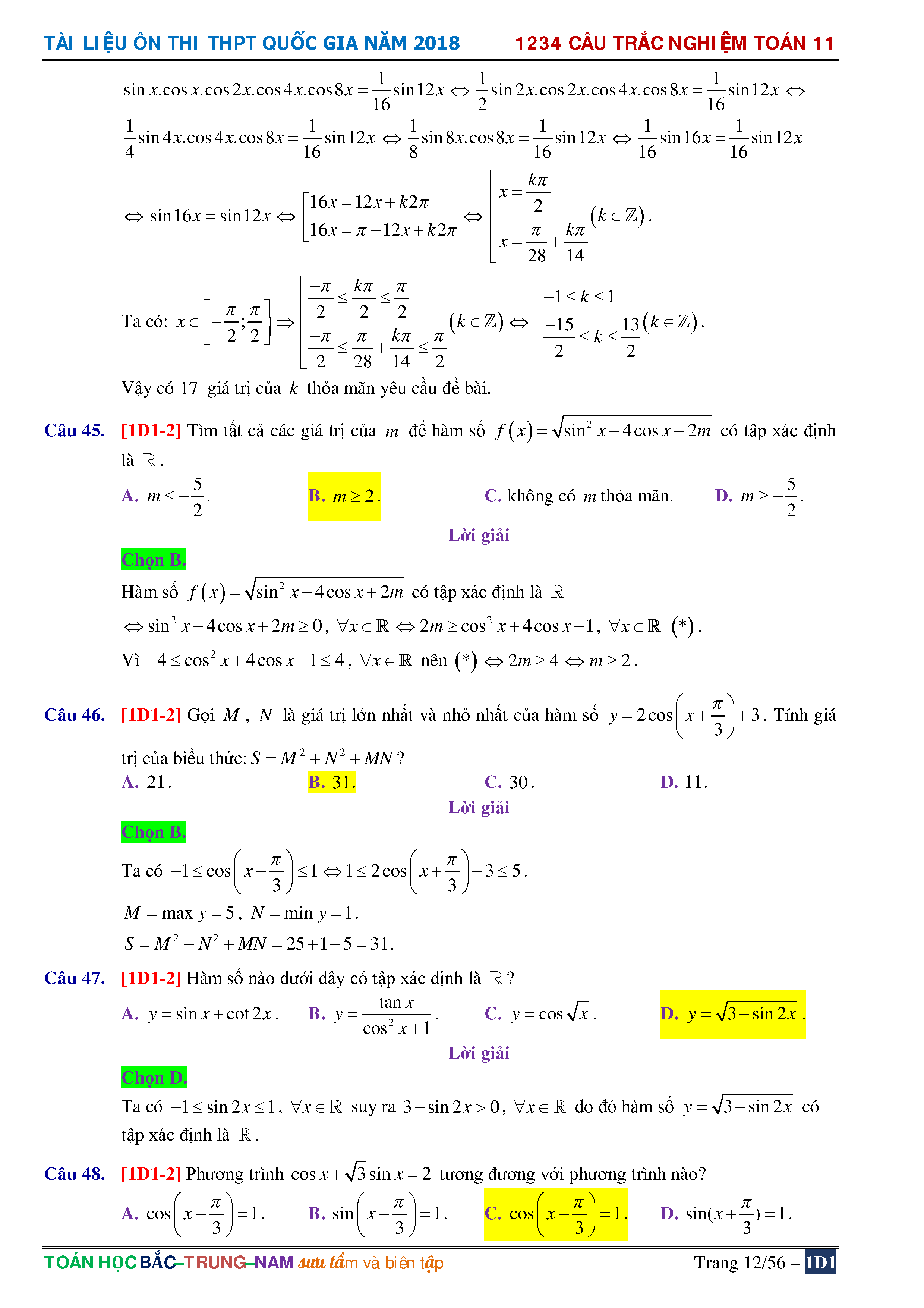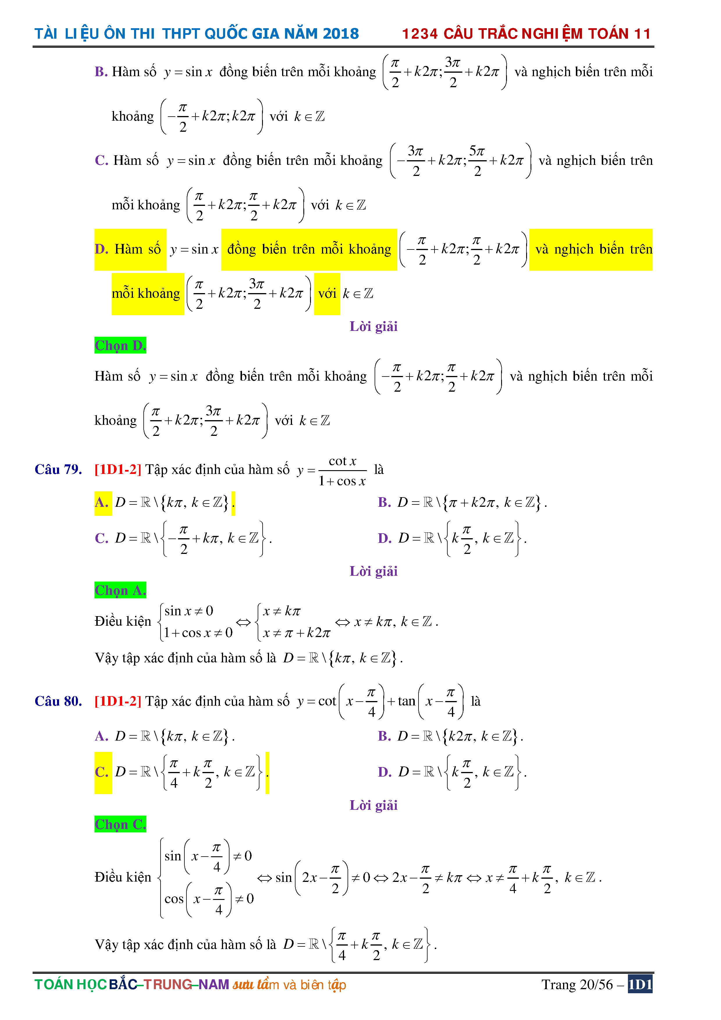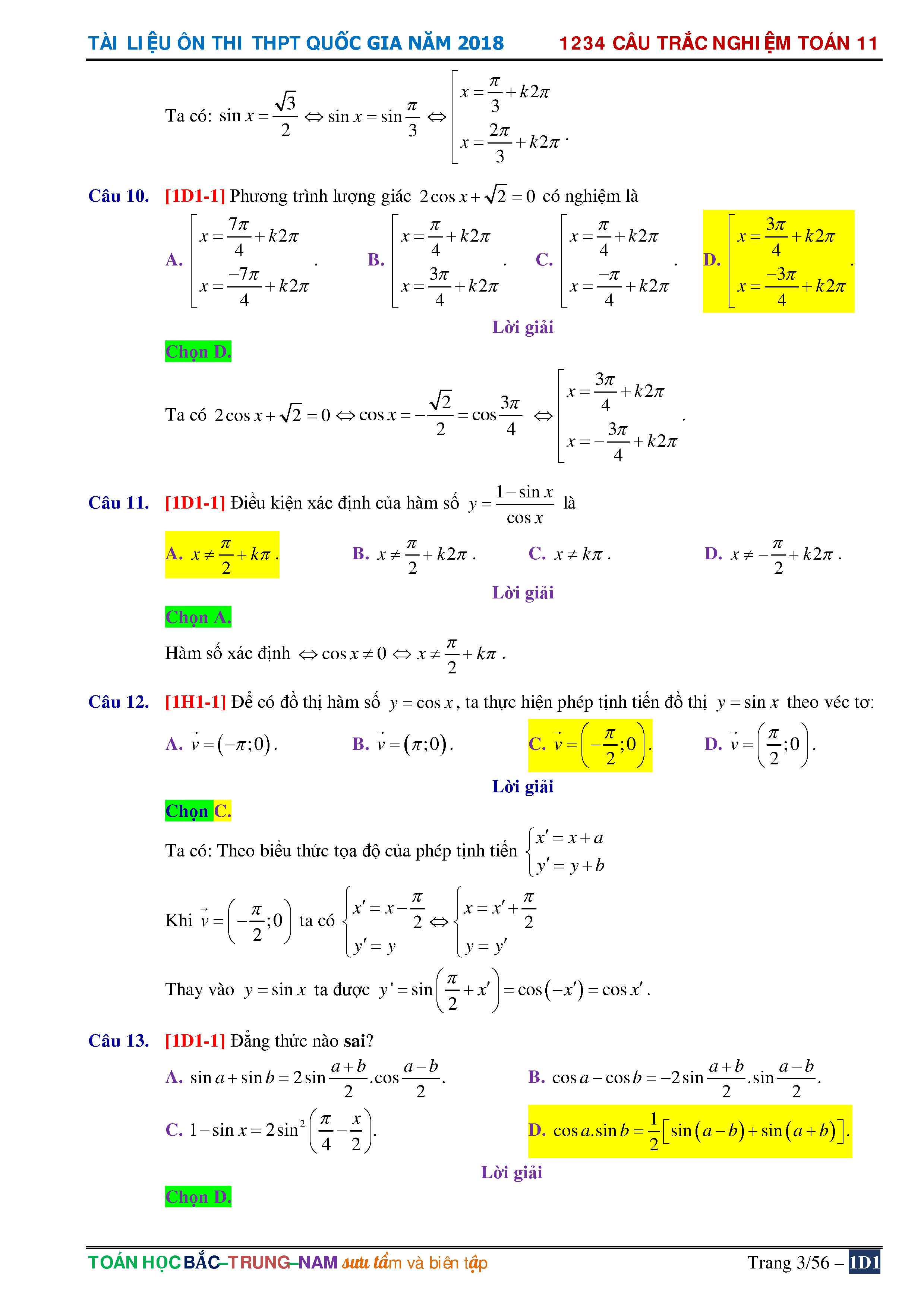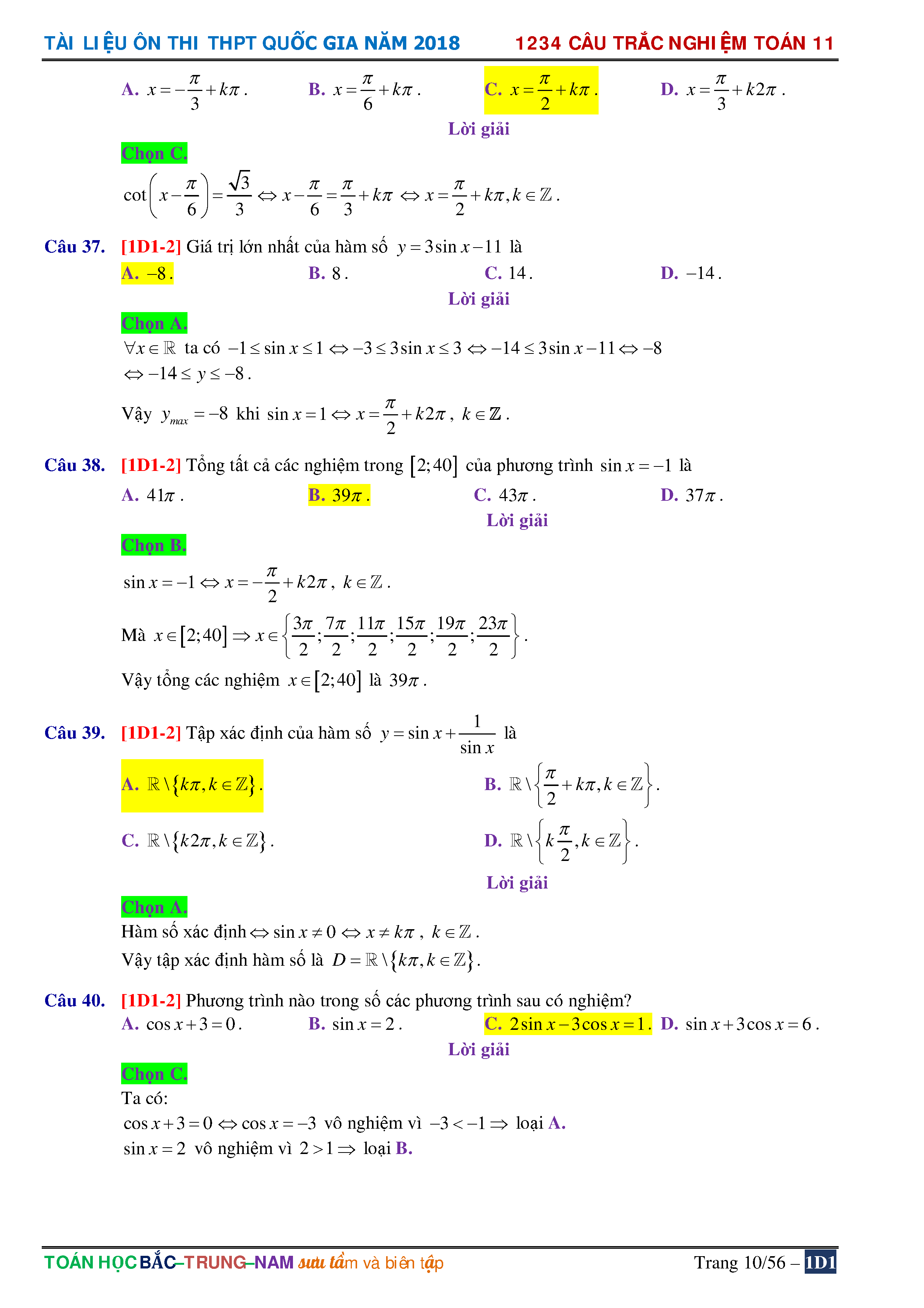 TRẮC NGHIỆM HÀM SỐ LƯỢNG GIÁC PHƯƠNG TRÌNH LƯỢNG GIÁC TOÁN LỚP 11