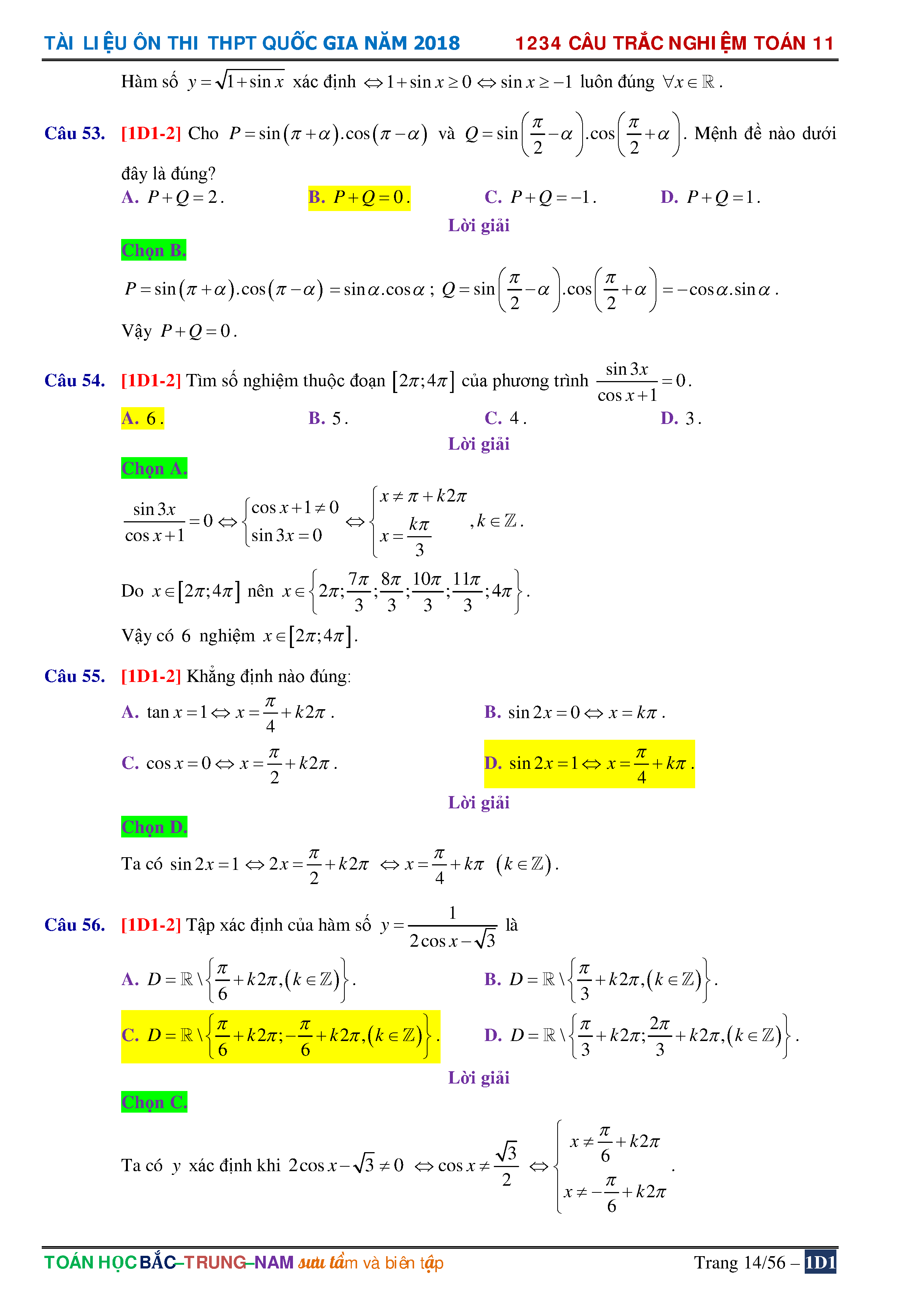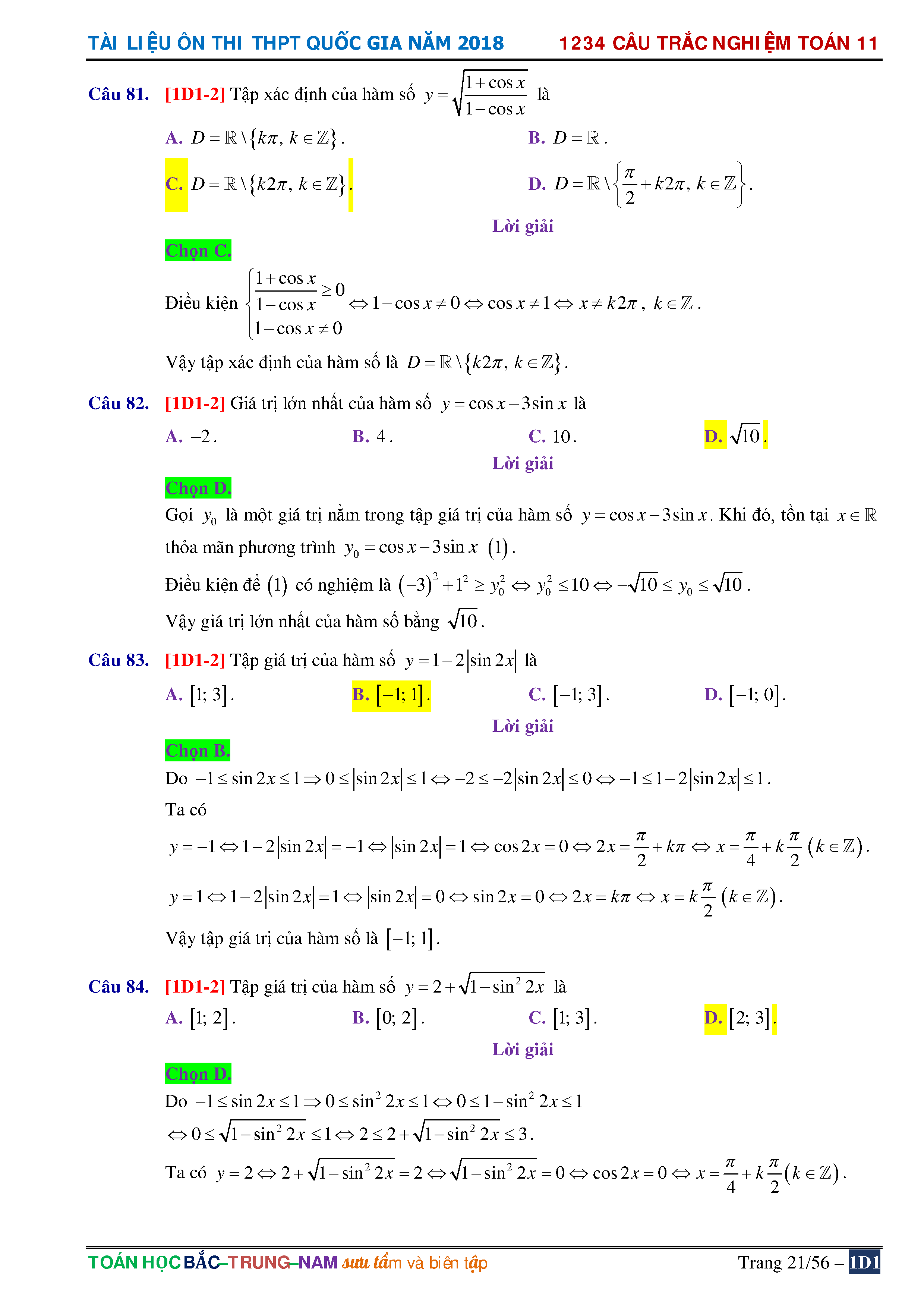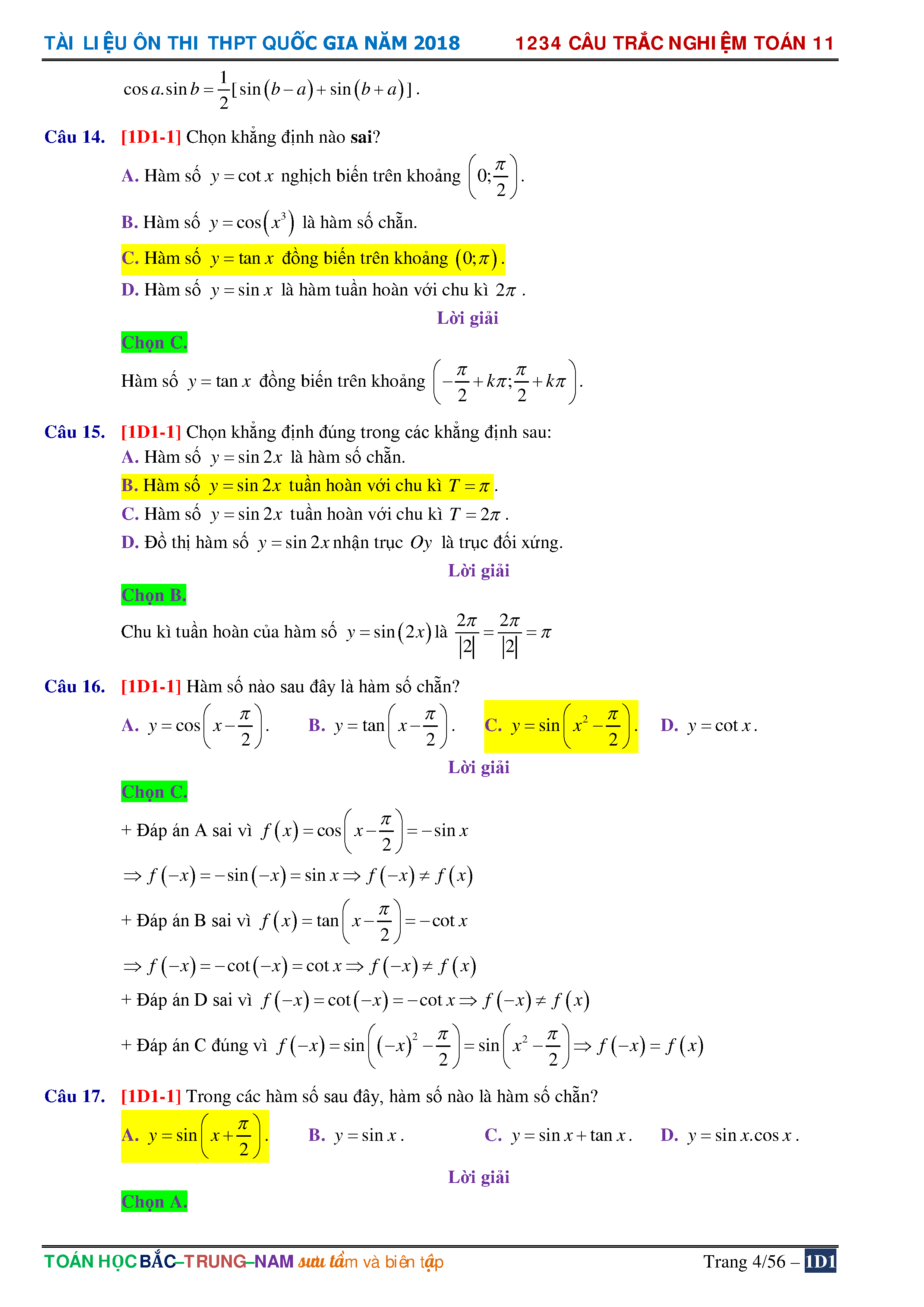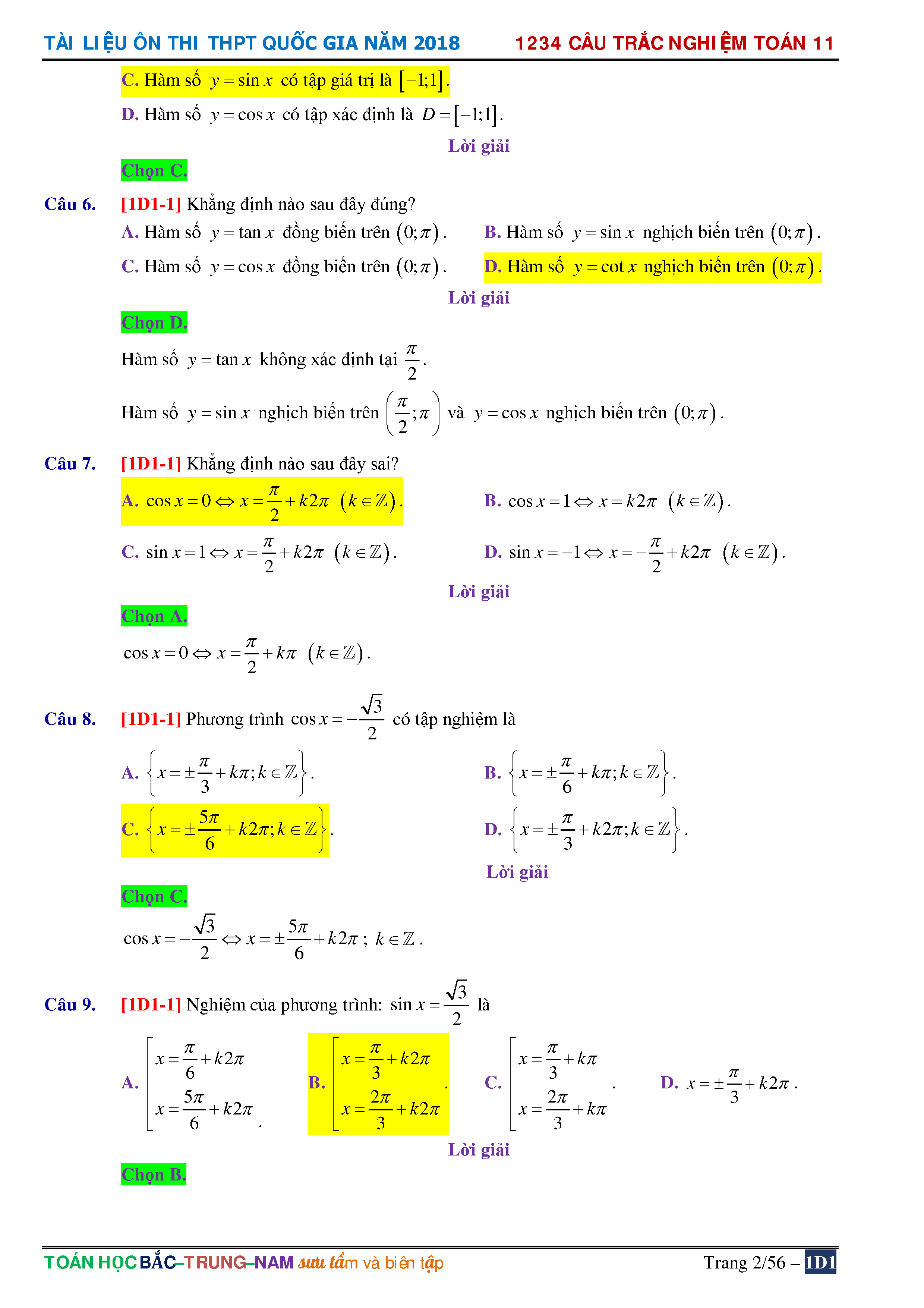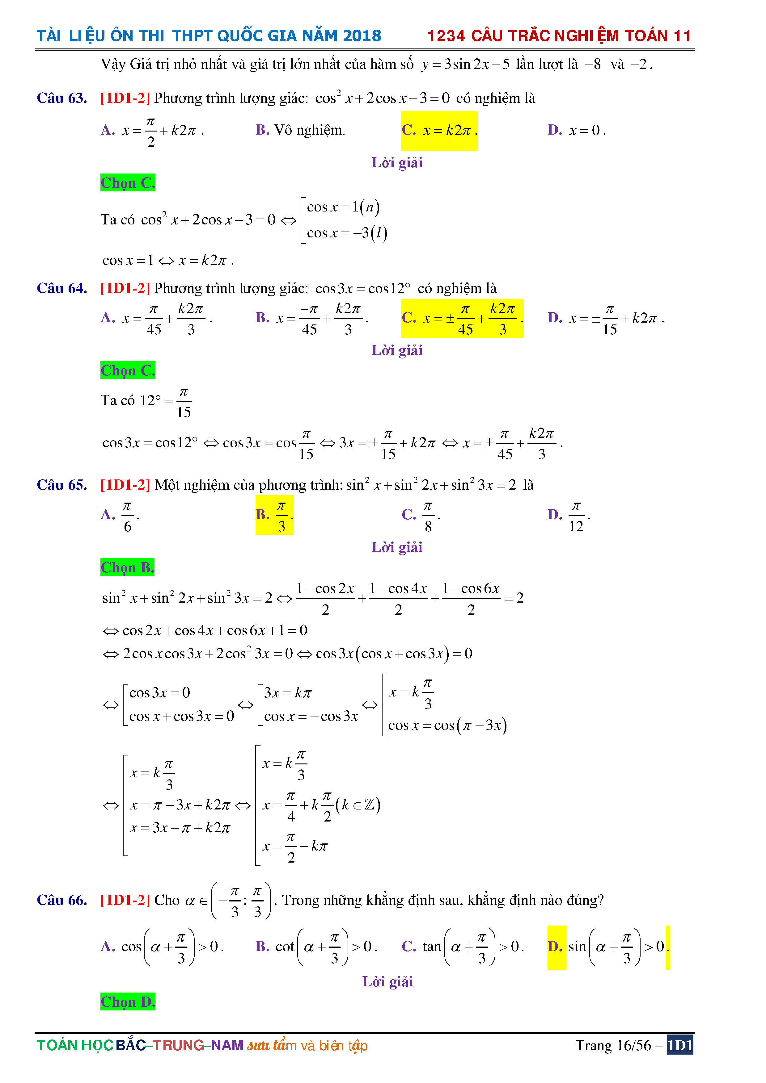 TRẮC NGHIỆM HÀM SỐ LƯỢNG GIÁC PHƯƠNG TRÌNH LƯỢNG GIÁC TOÁN LỚP 11
