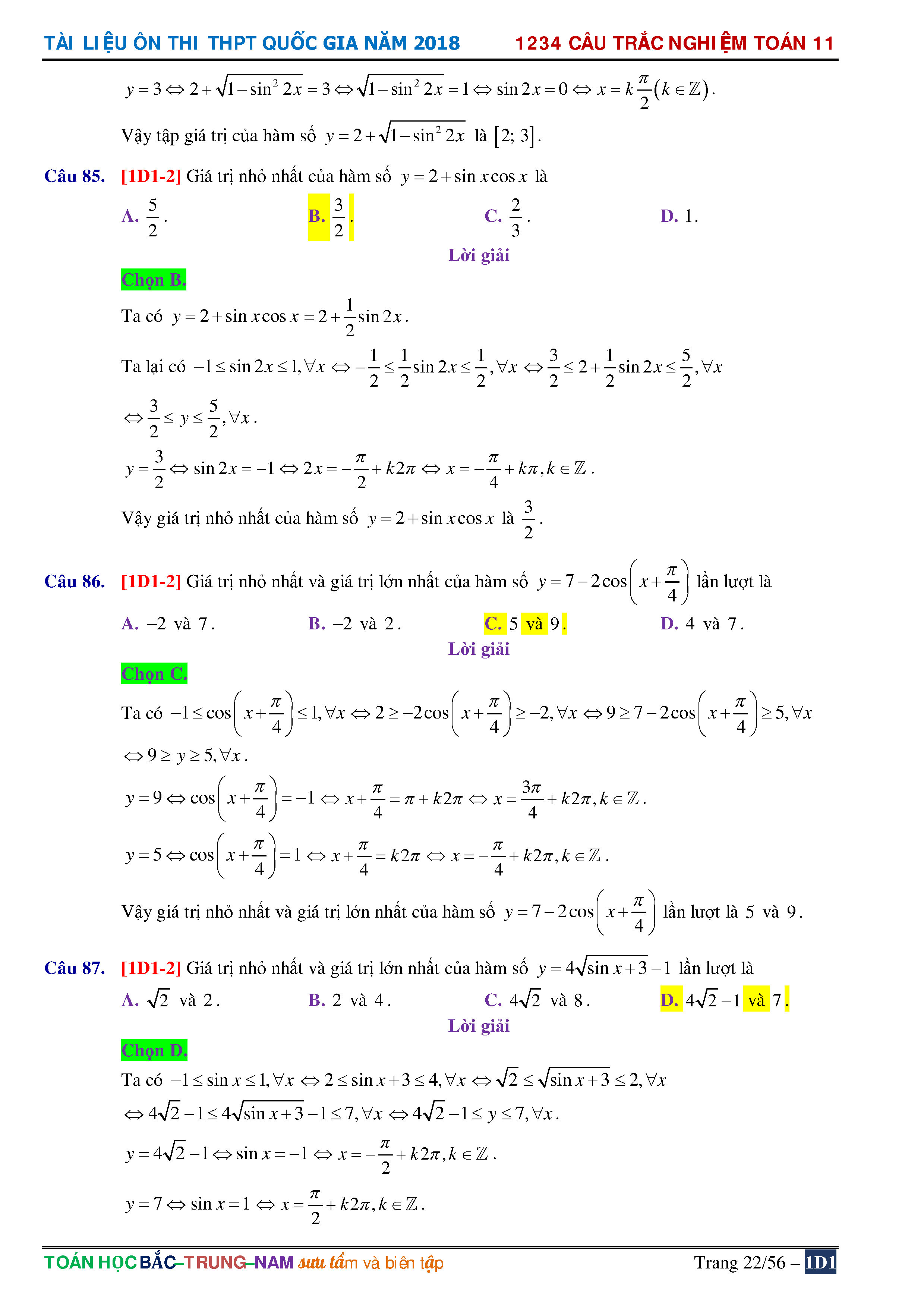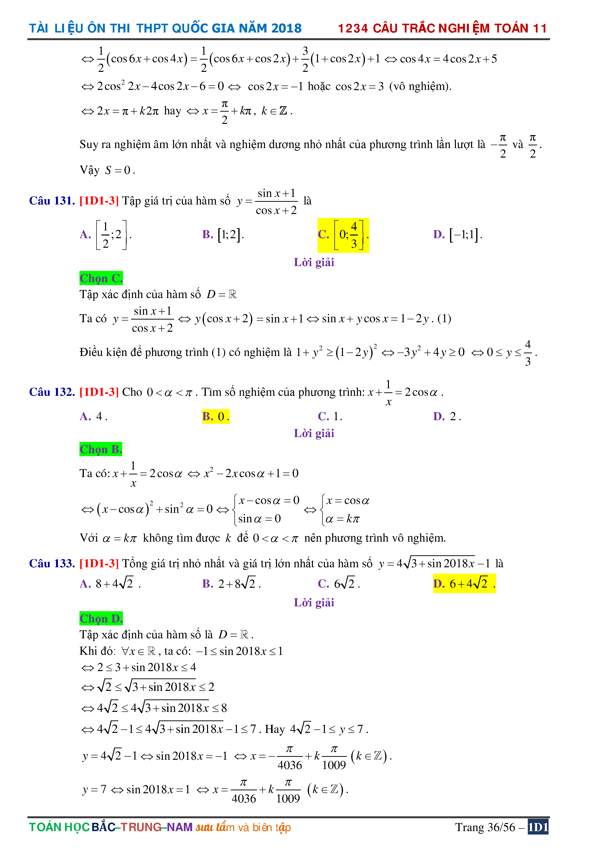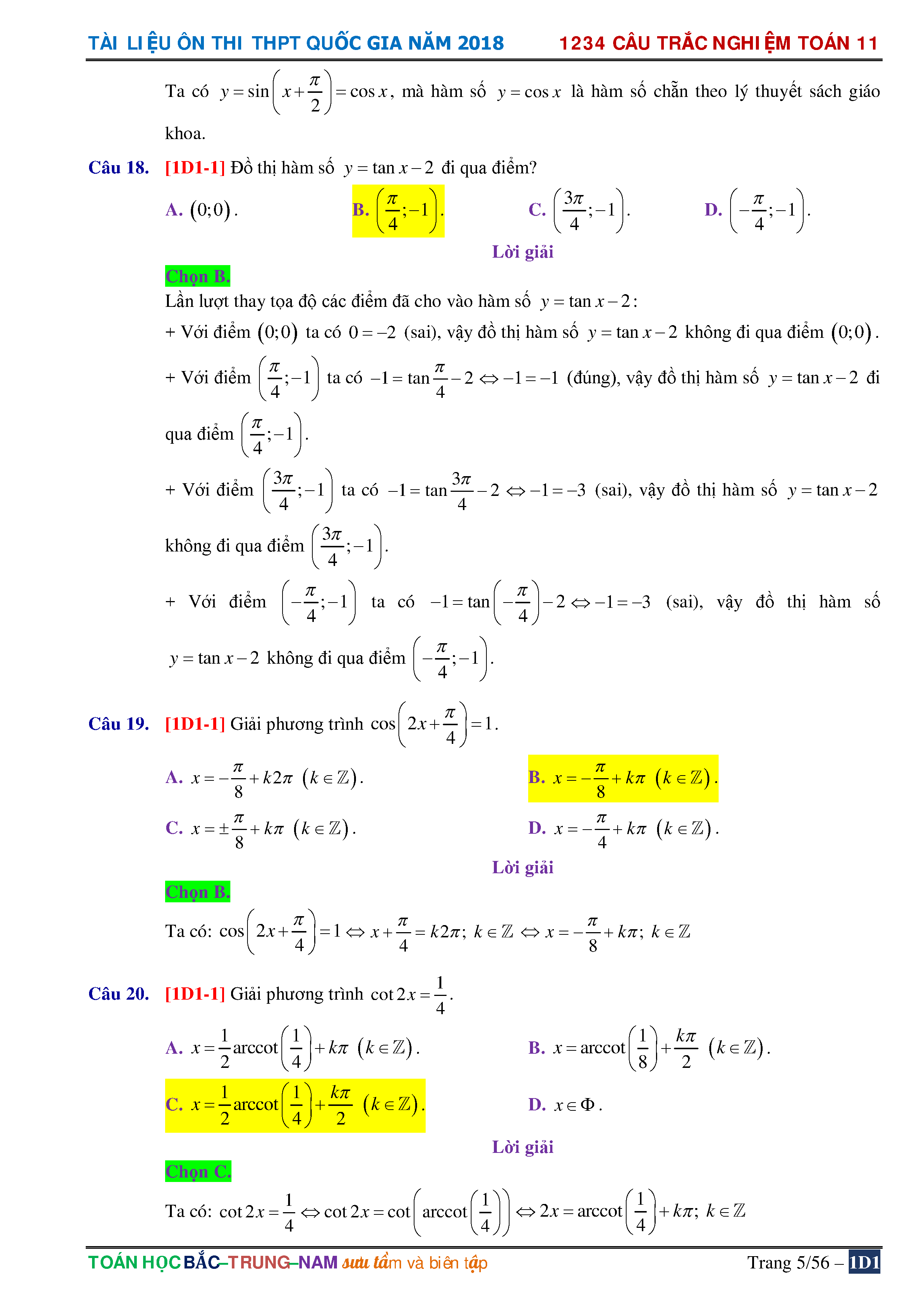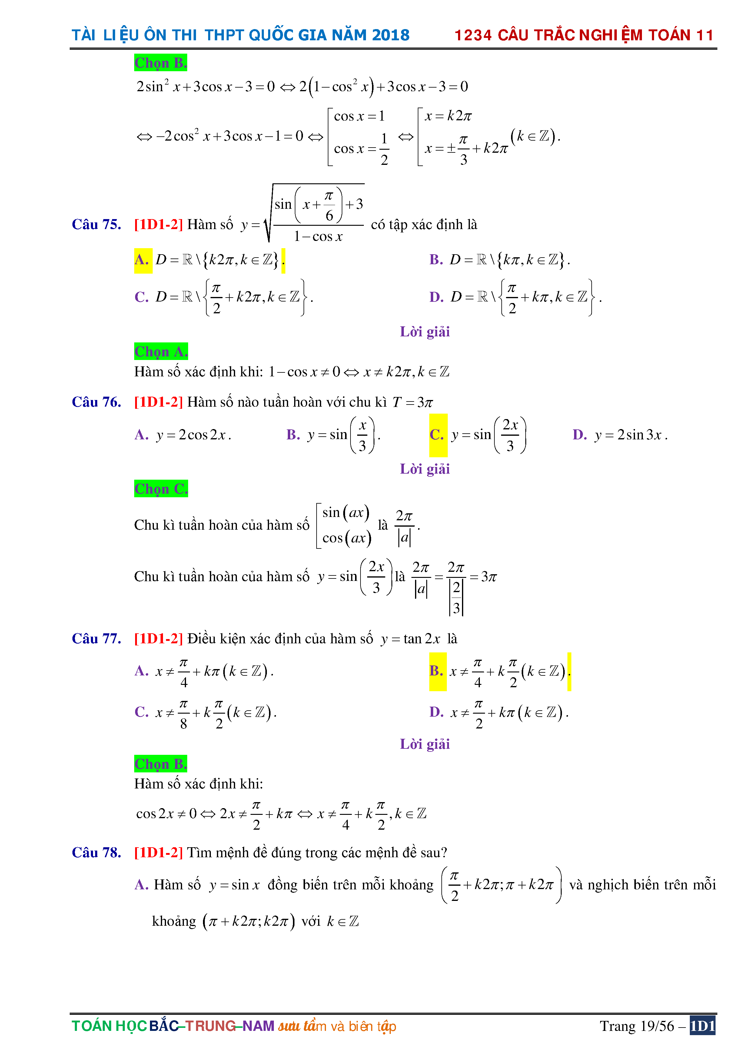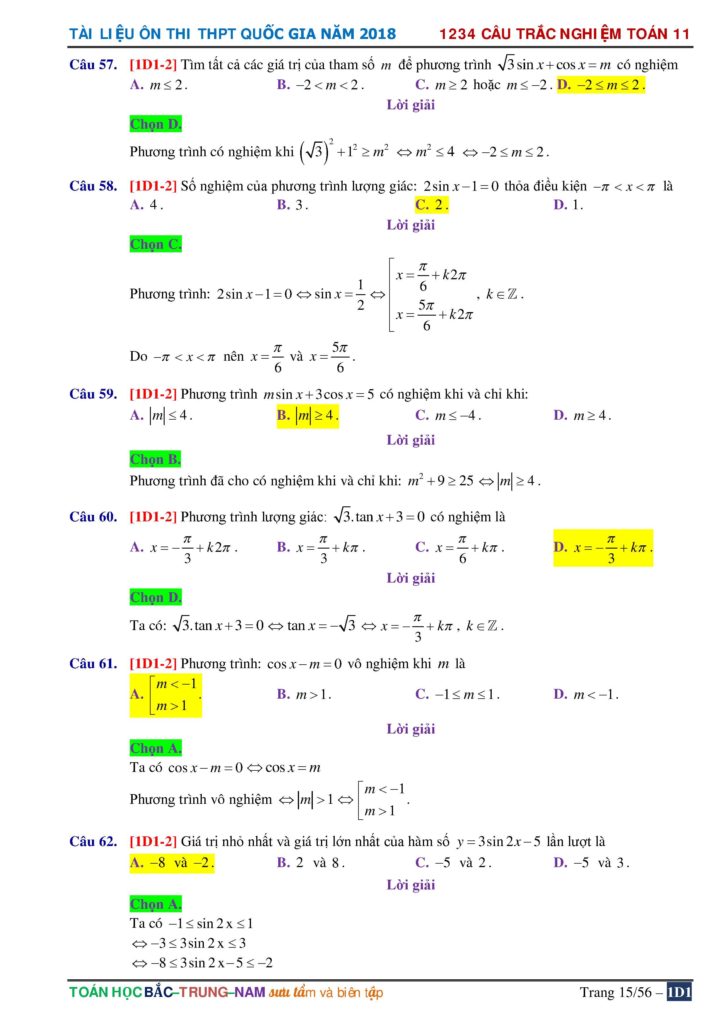 TRẮC NGHIỆM HÀM SỐ LƯỢNG GIÁC PHƯƠNG TRÌNH LƯỢNG GIÁC TOÁN LỚP 11