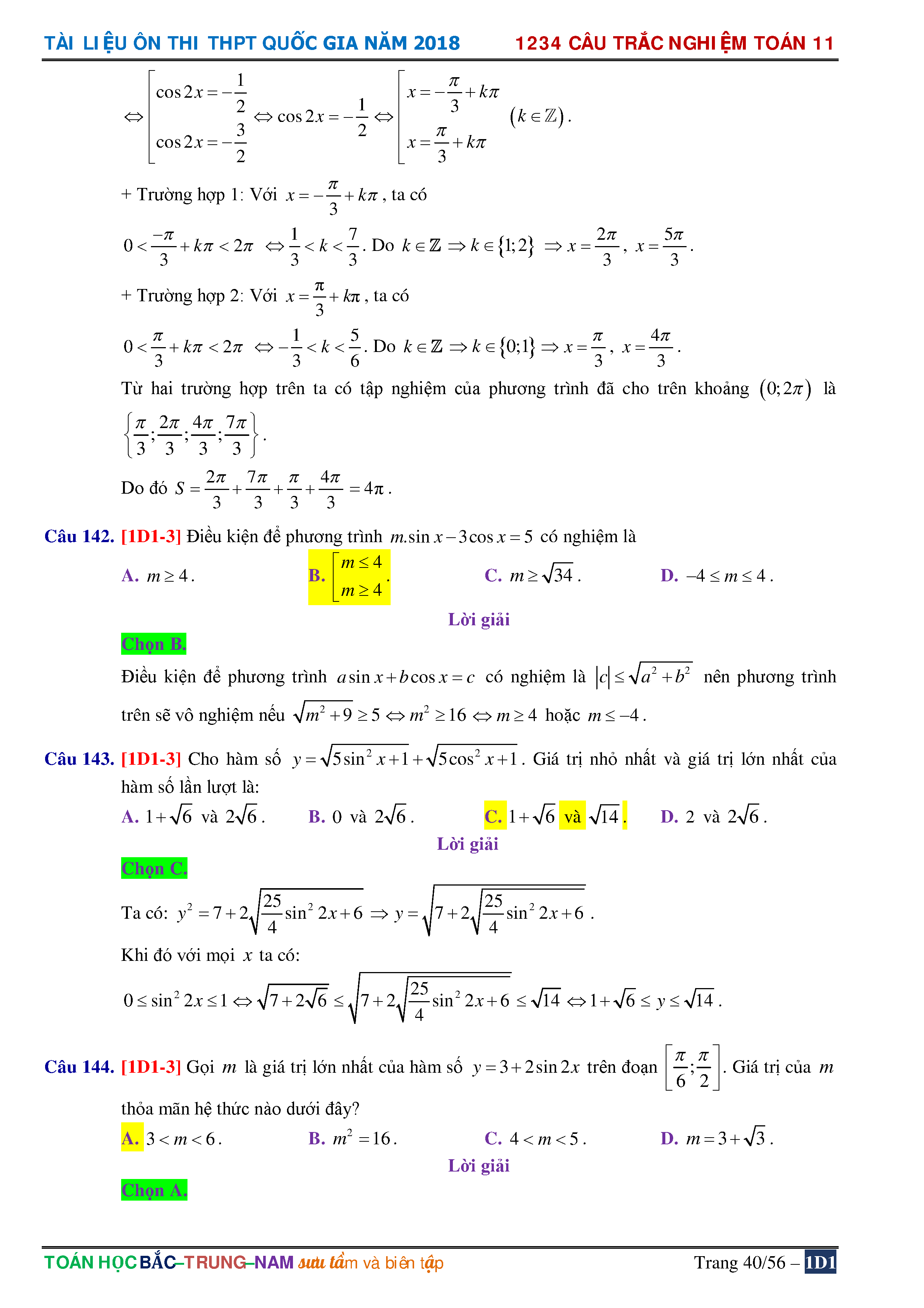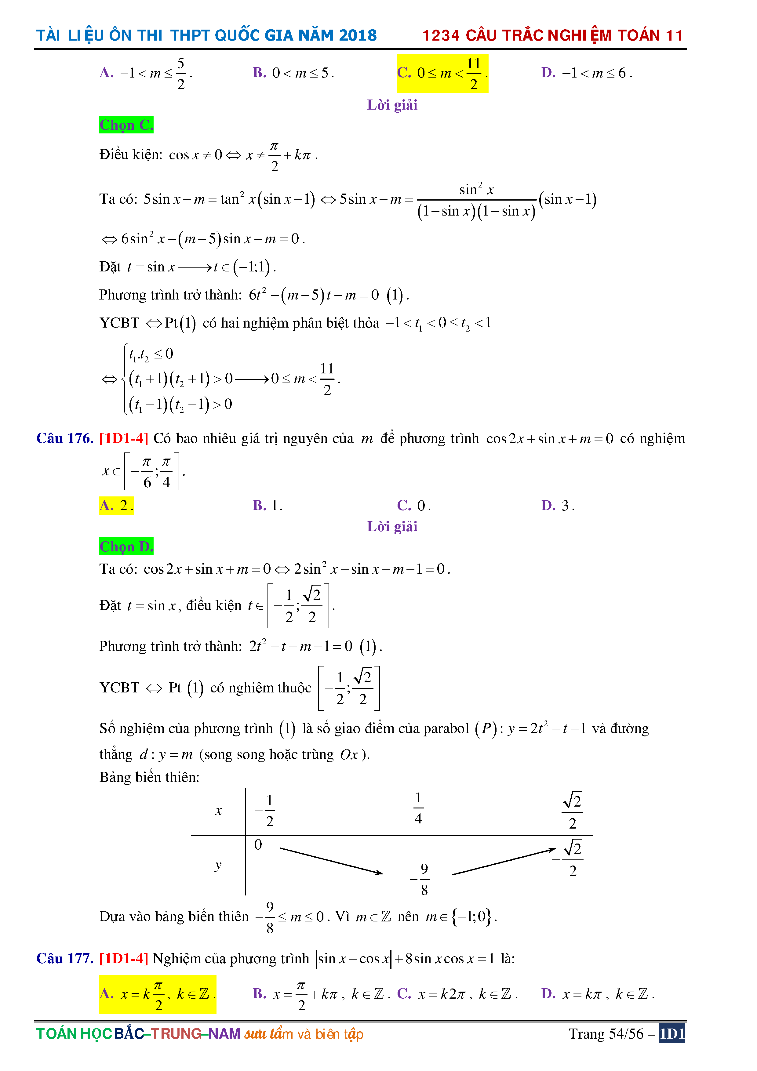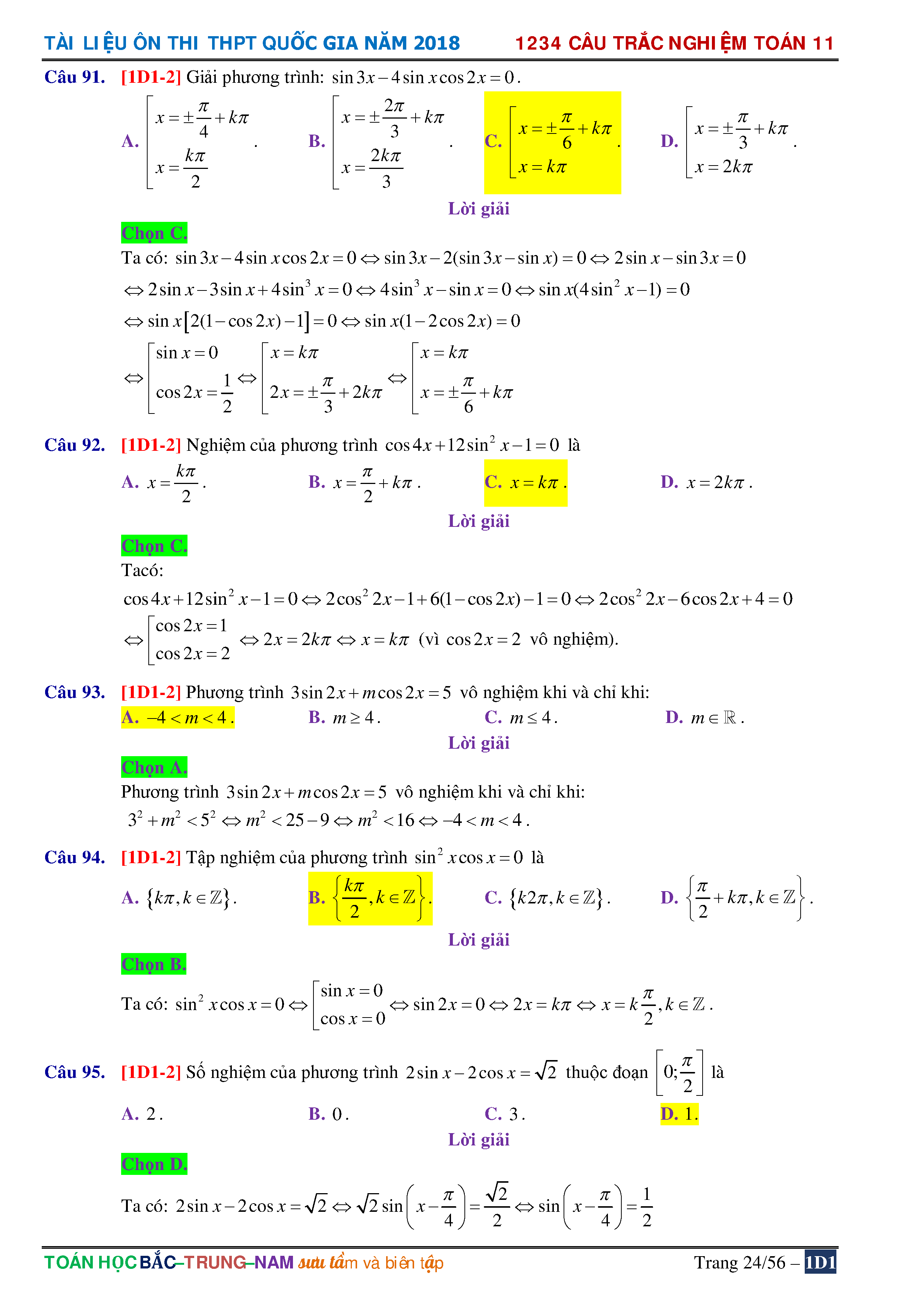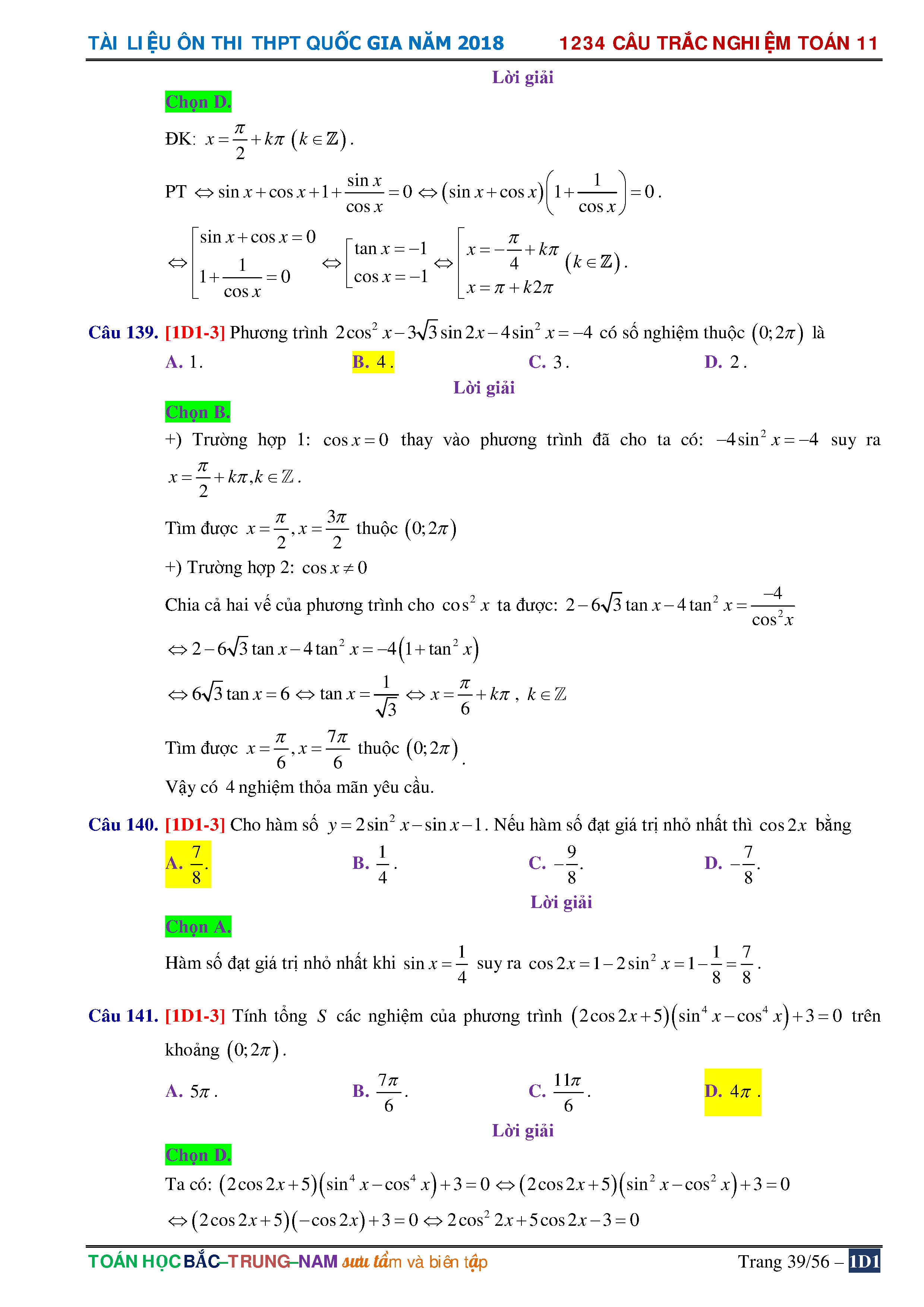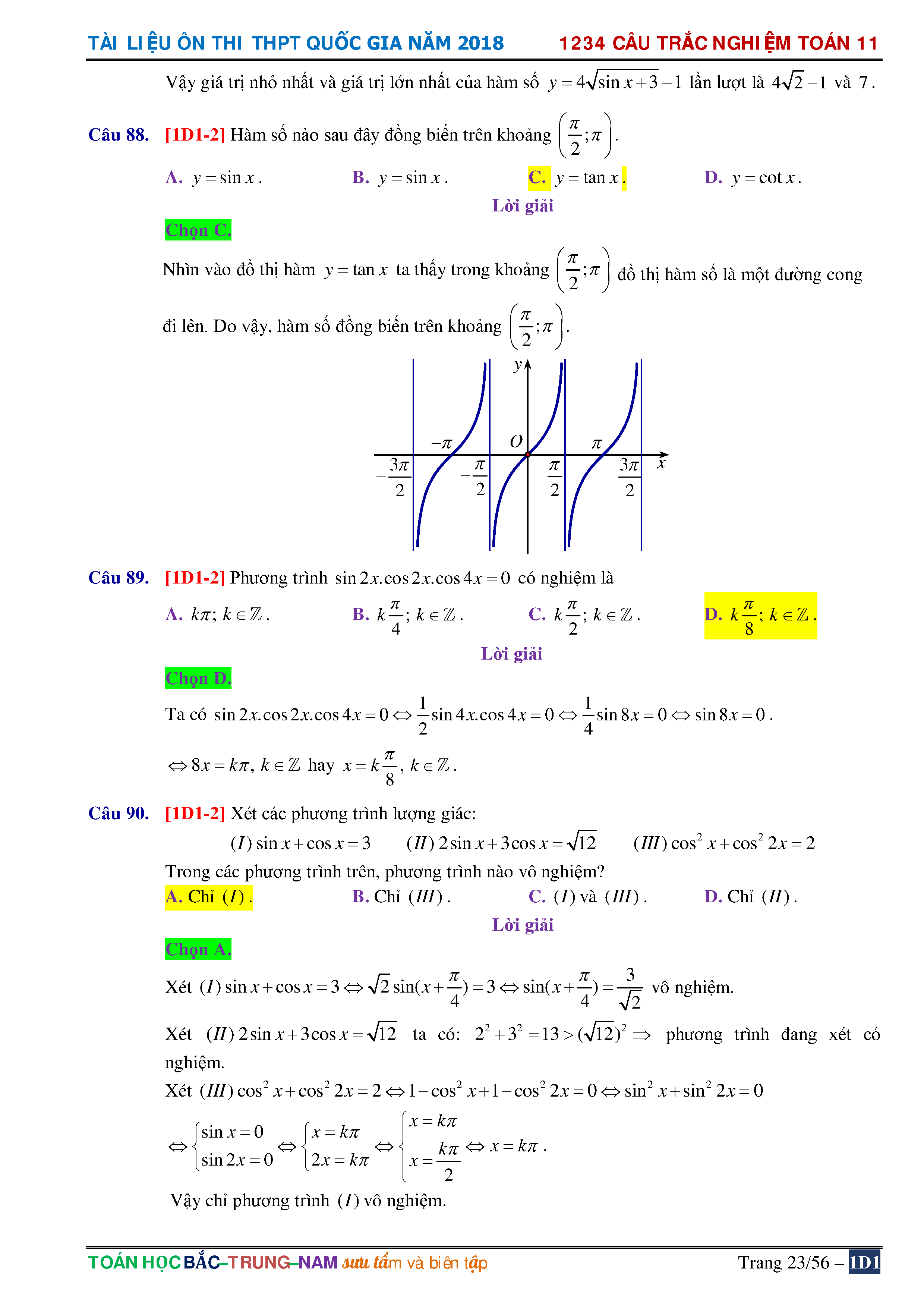 TRẮC NGHIỆM HÀM SỐ LƯỢNG GIÁC PHƯƠNG TRÌNH LƯỢNG GIÁC TOÁN LỚP 11