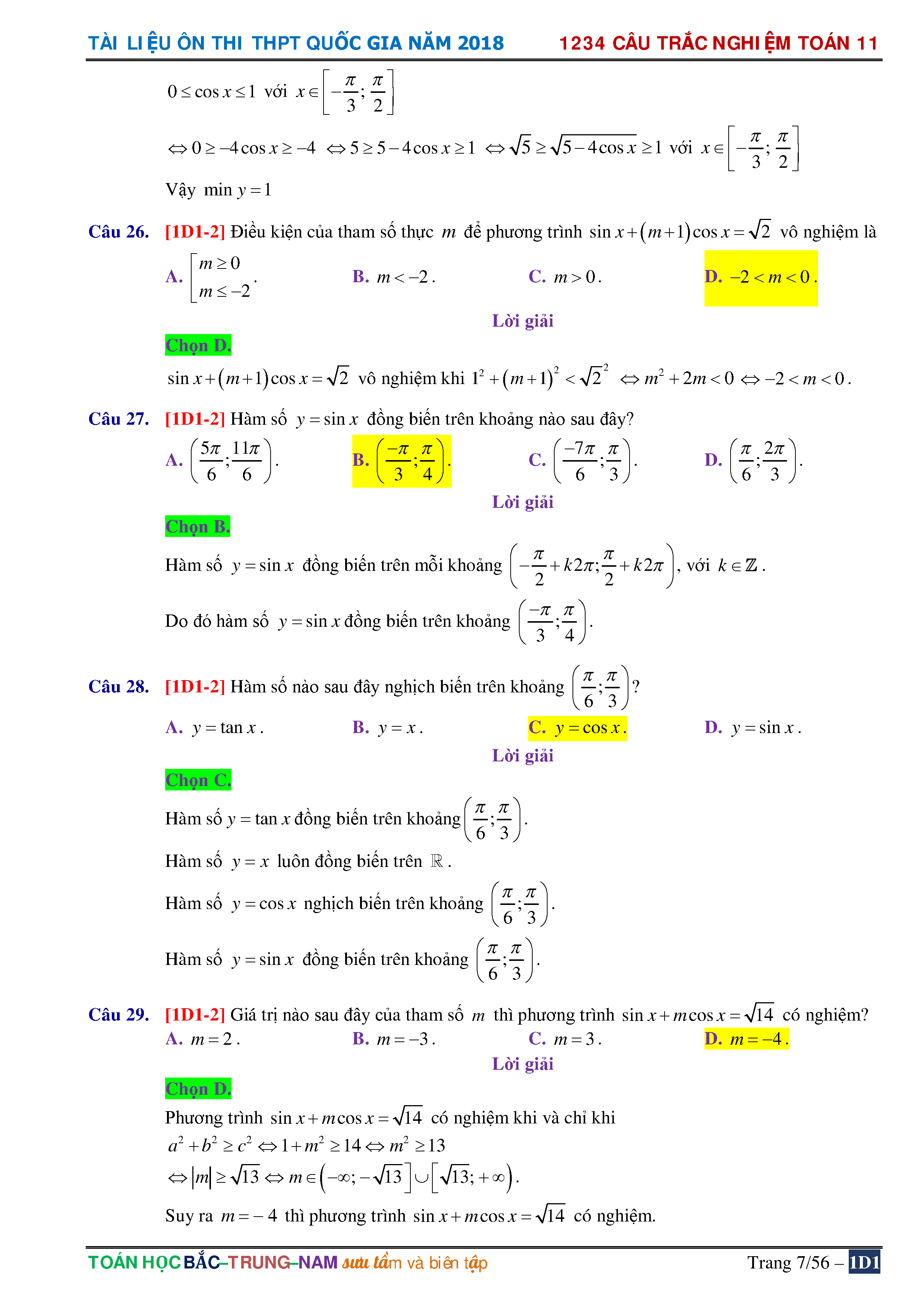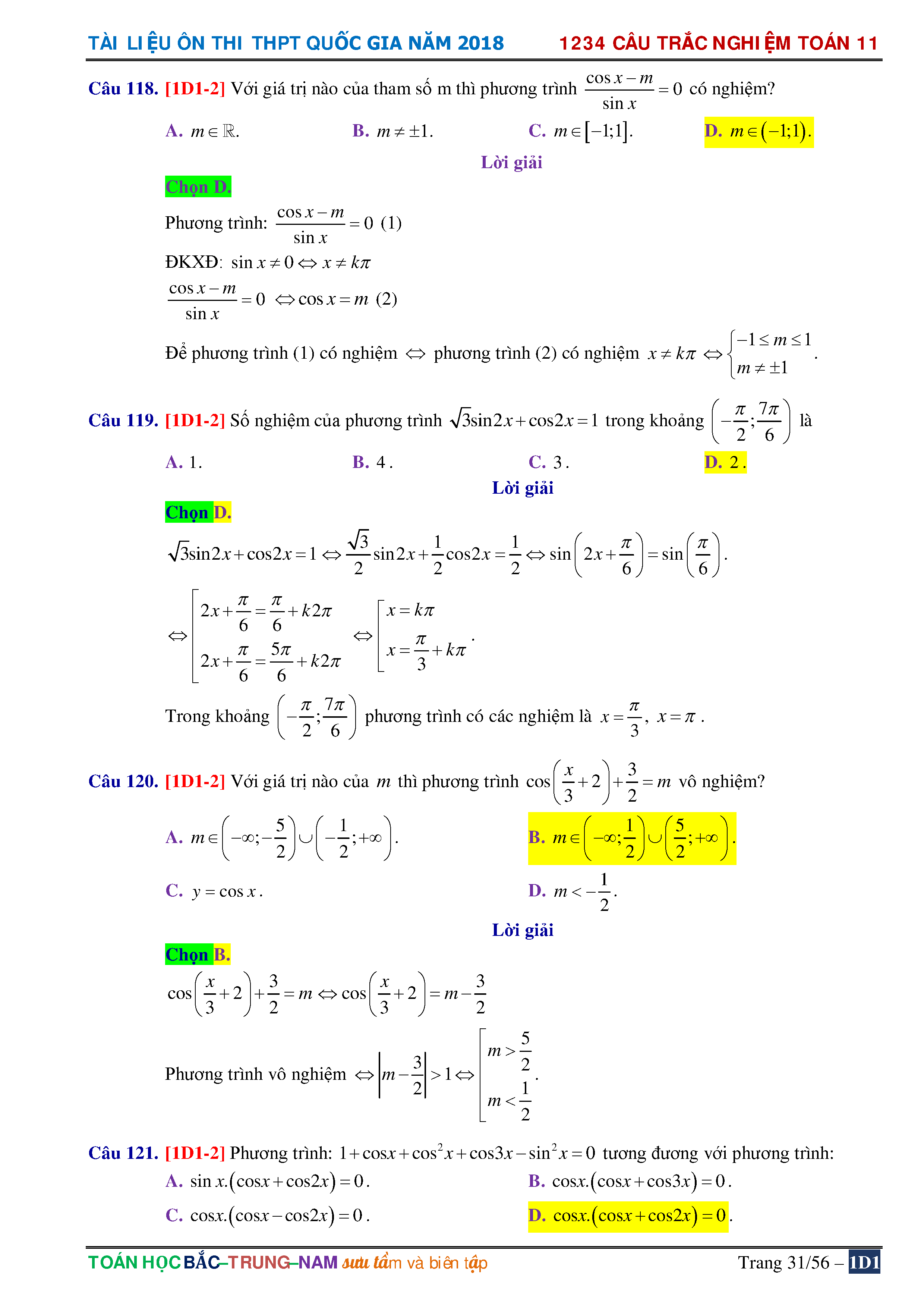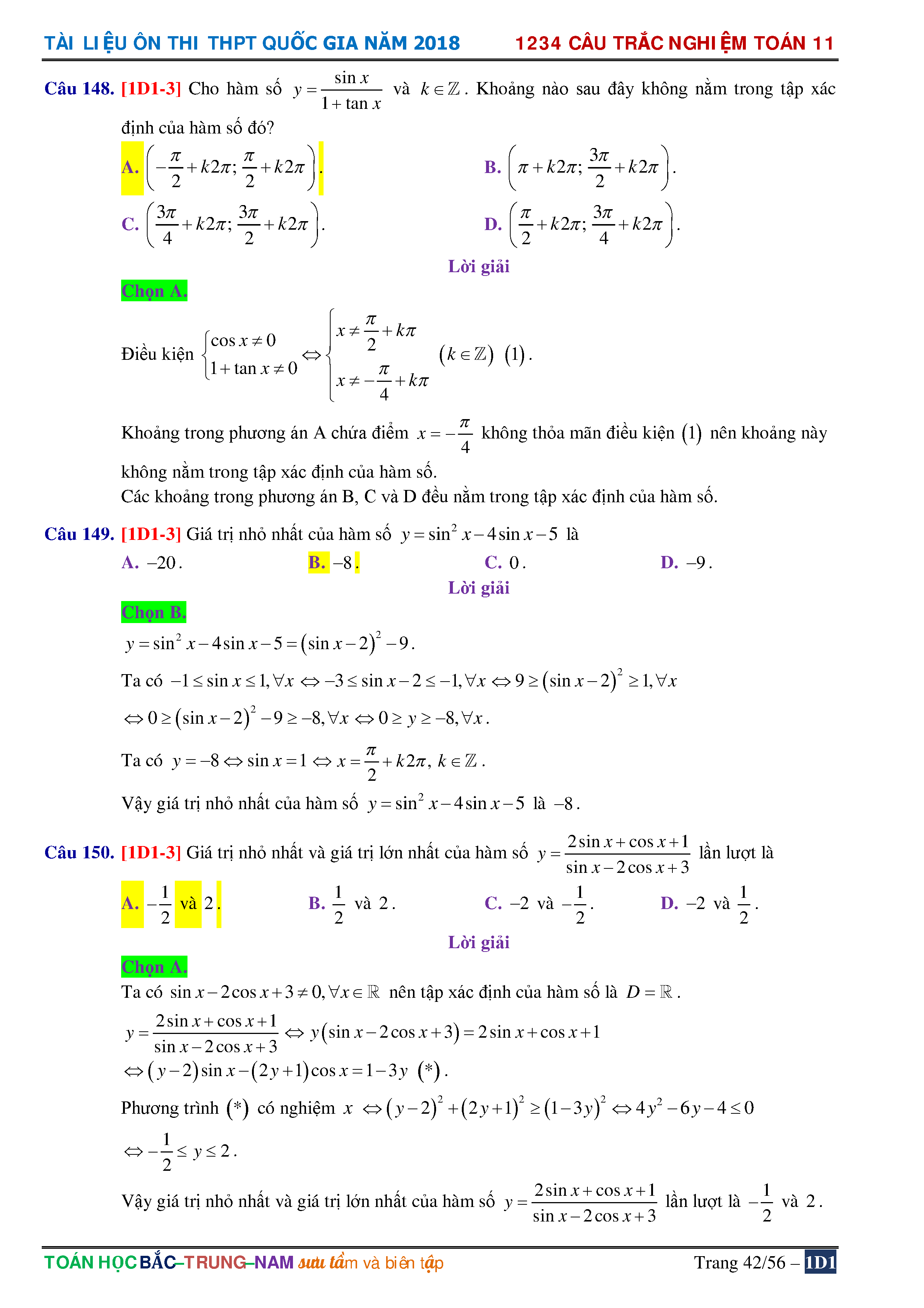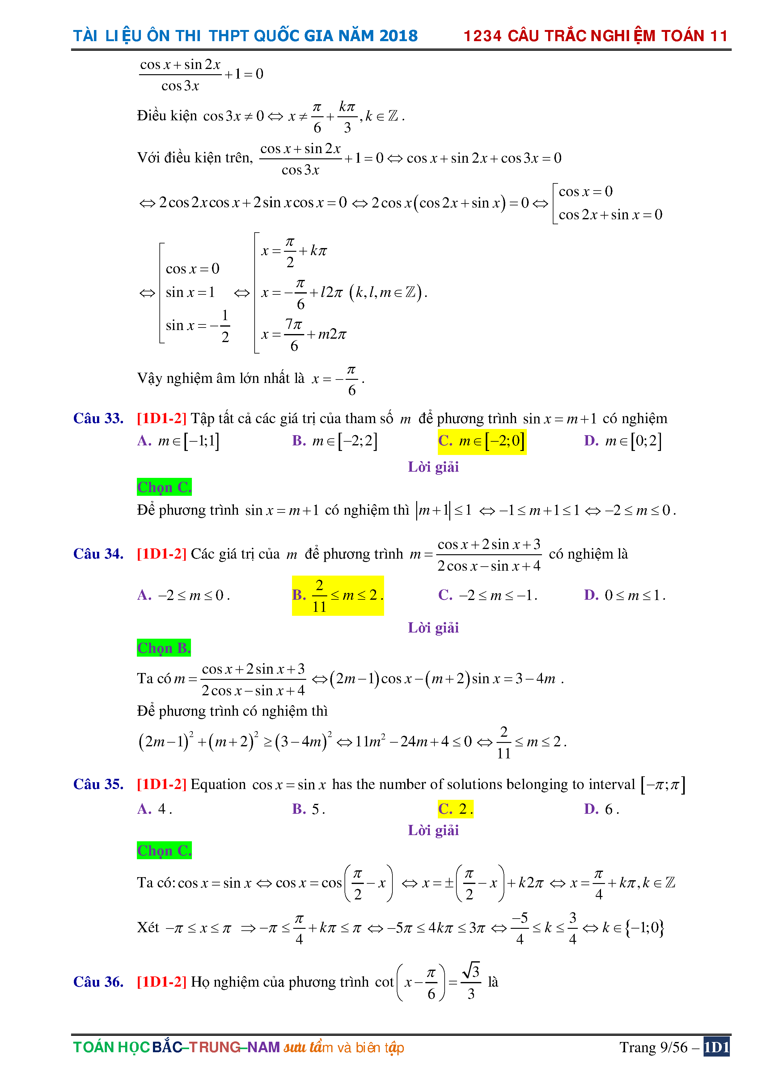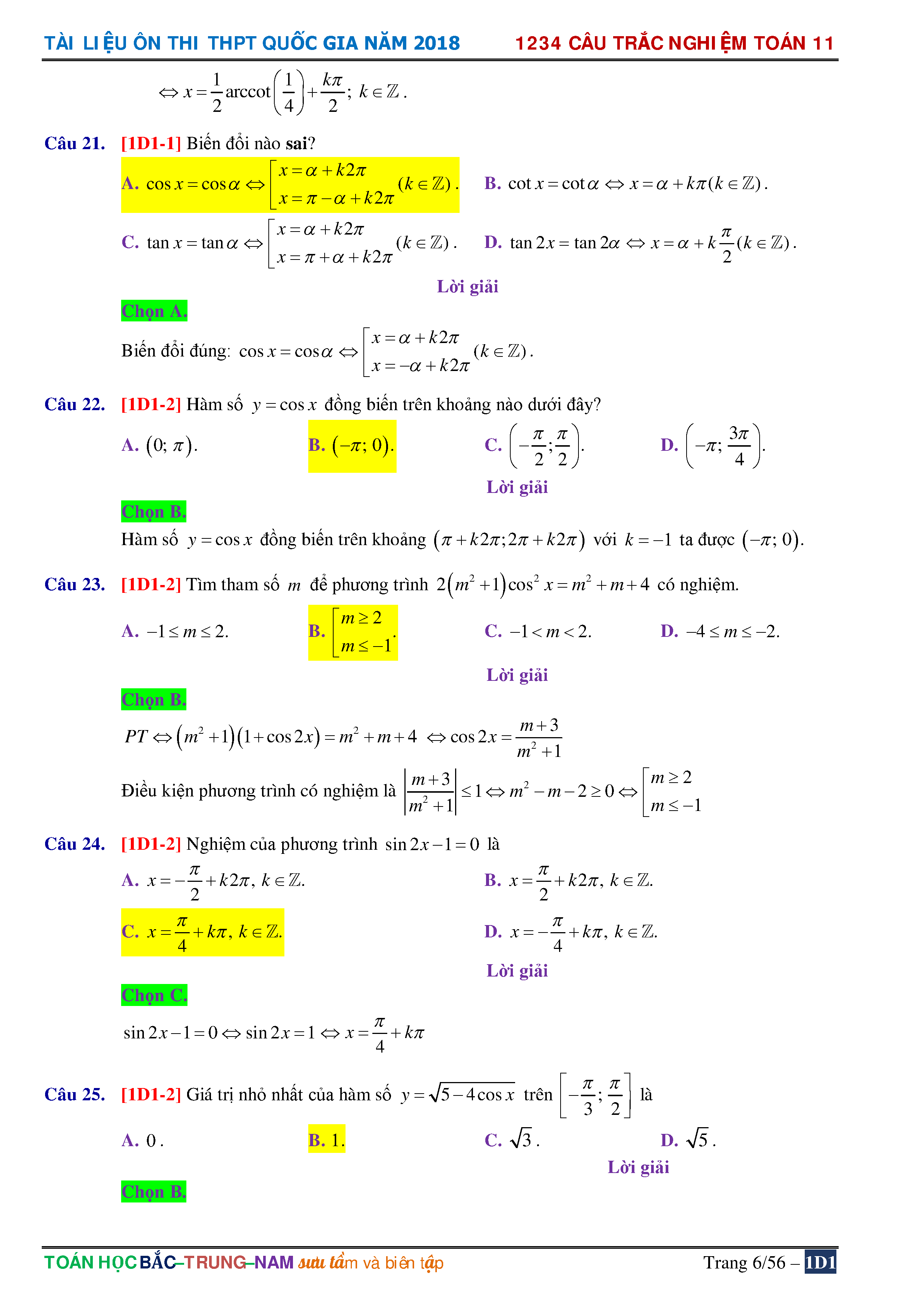 TRẮC NGHIỆM HÀM SỐ LƯỢNG GIÁC PHƯƠNG TRÌNH LƯỢNG GIÁC TOÁN LỚP 11