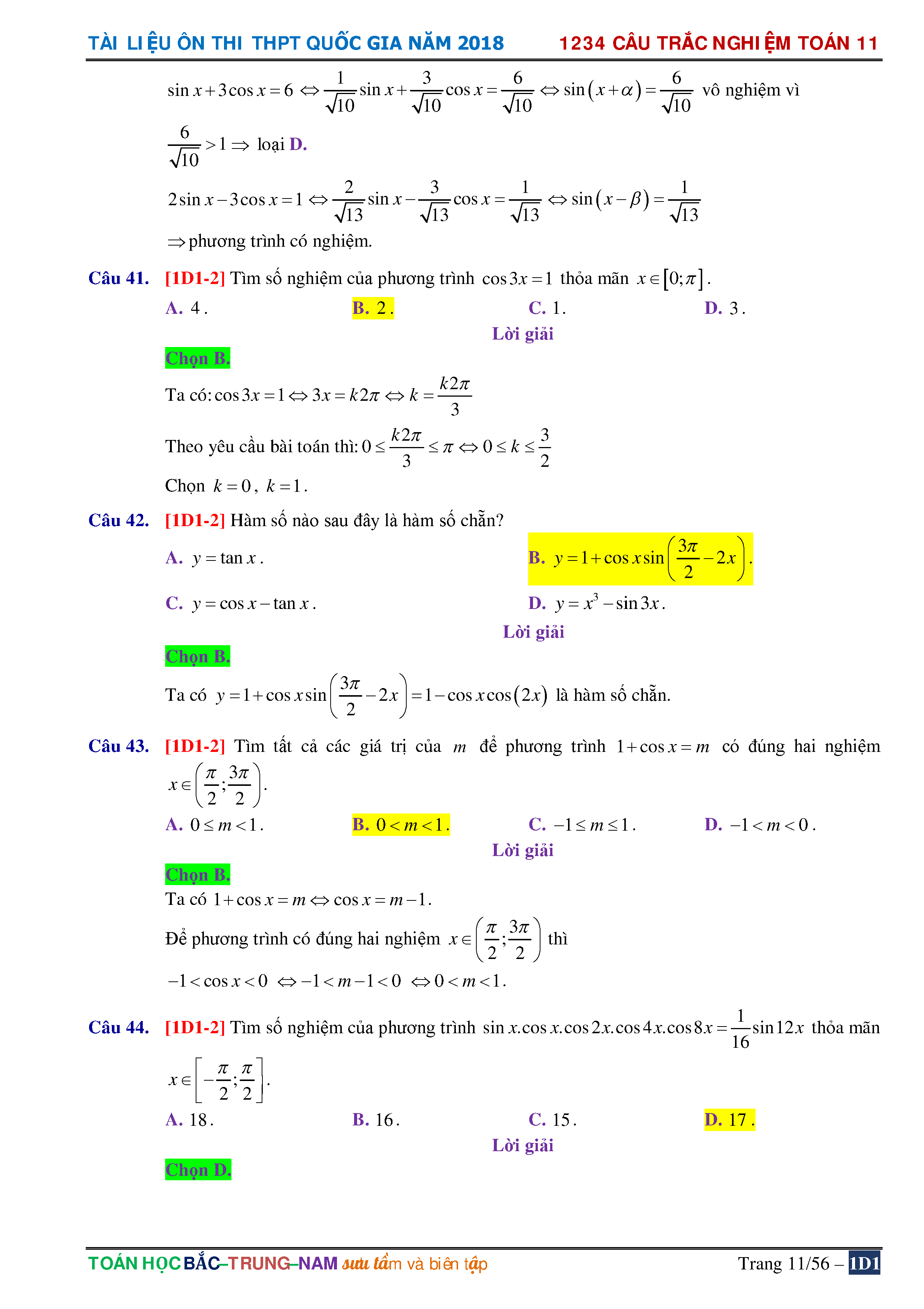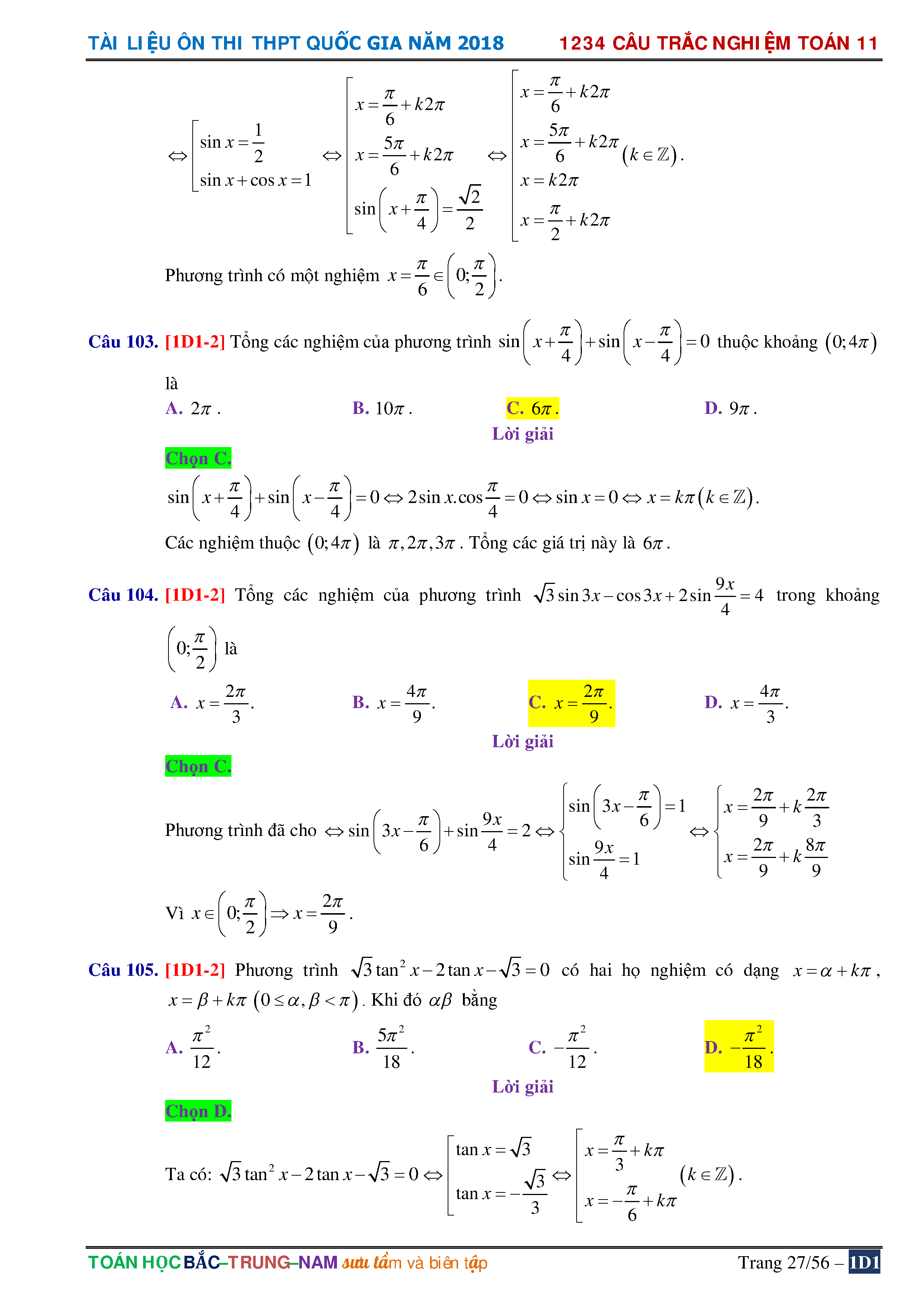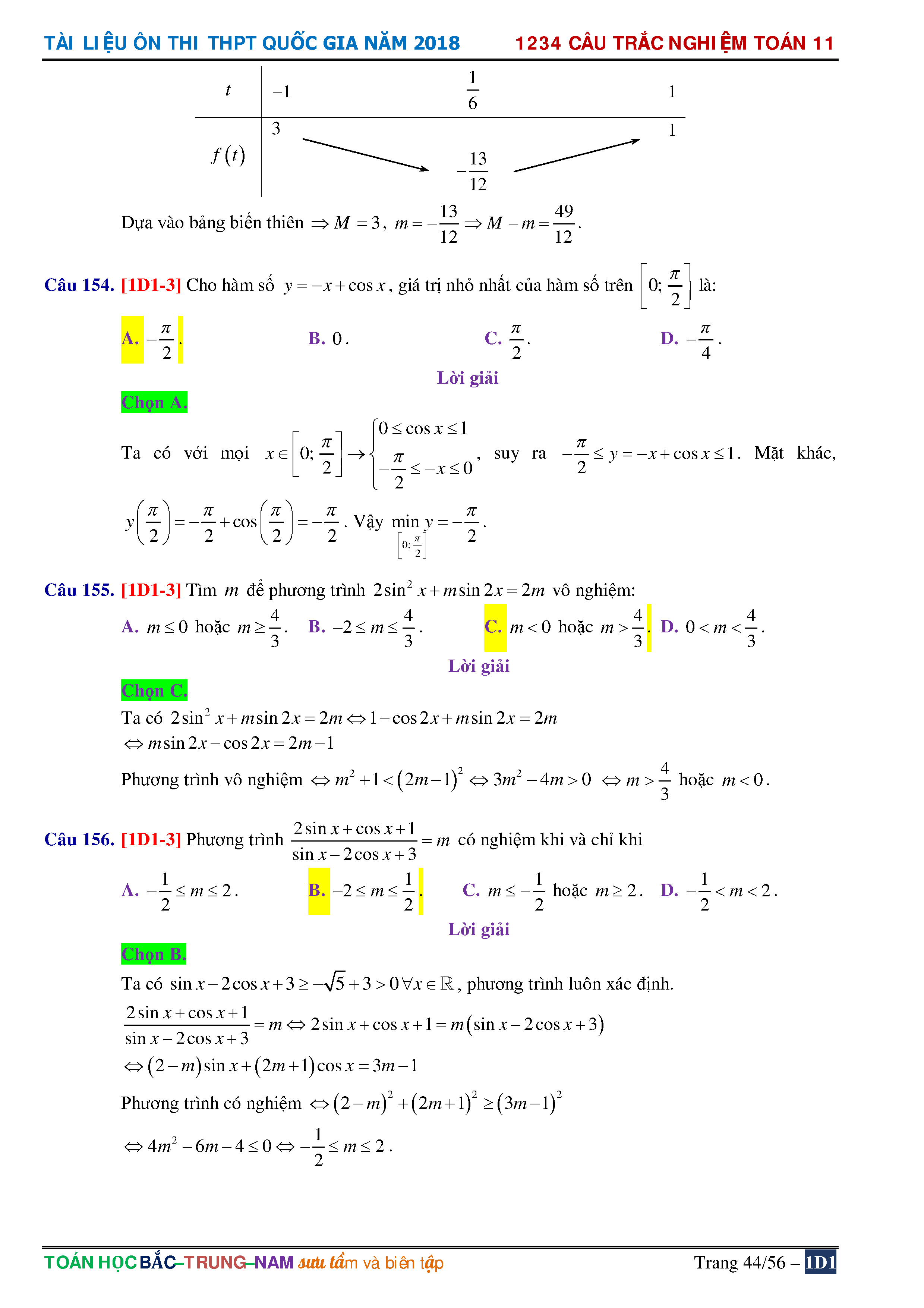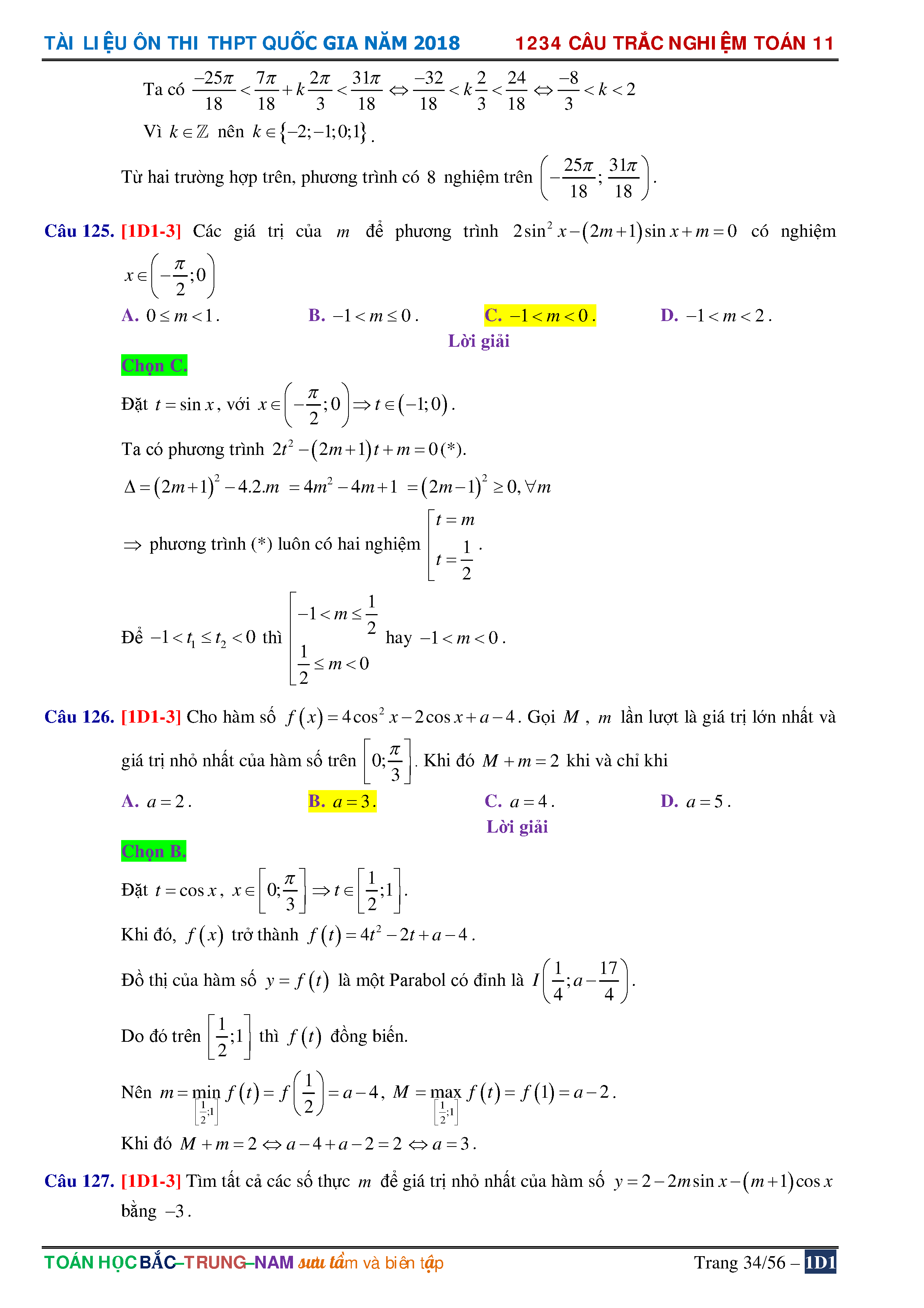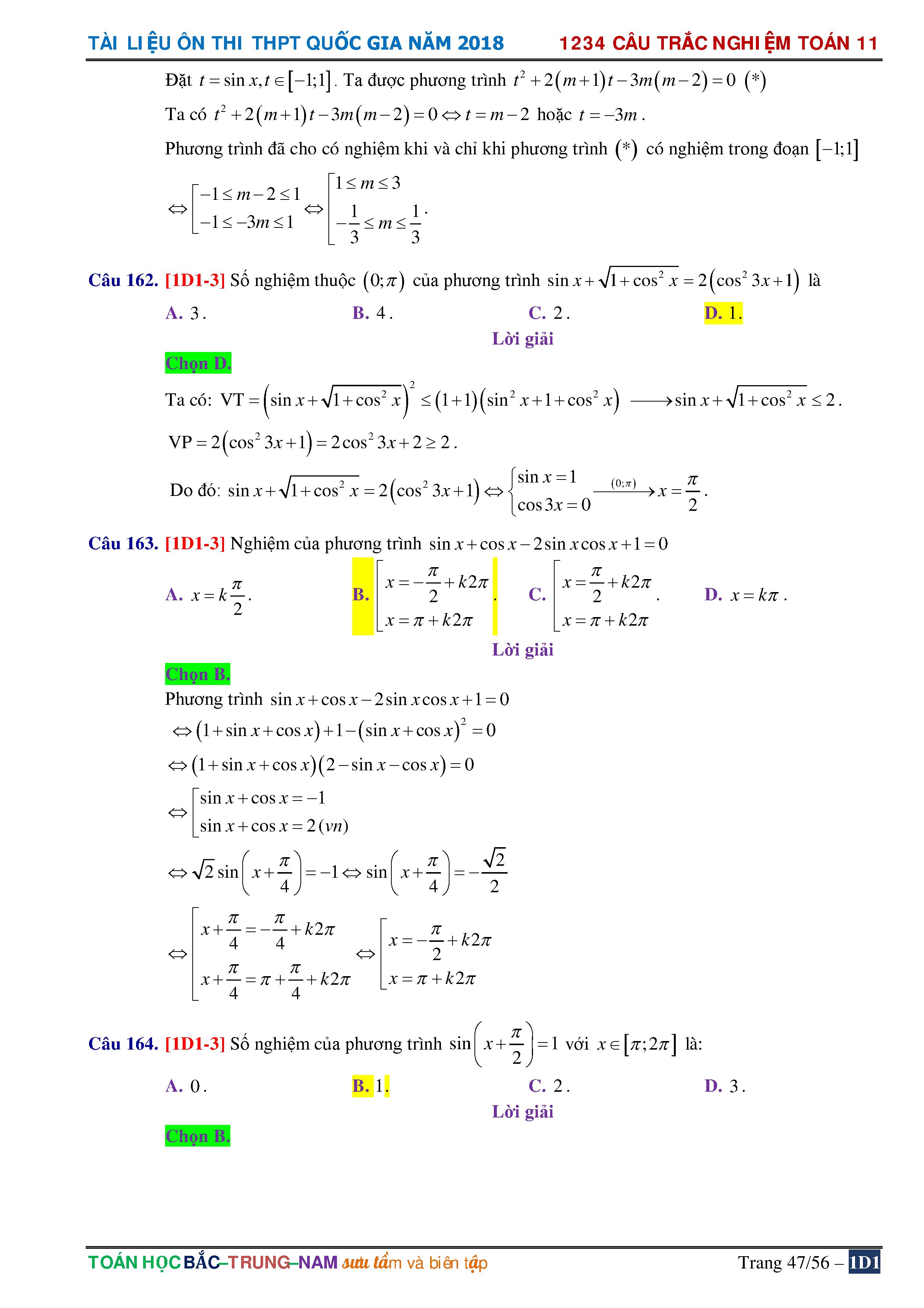 TRẮC NGHIỆM HÀM SỐ LƯỢNG GIÁC PHƯƠNG TRÌNH LƯỢNG GIÁC TOÁN LỚP 11