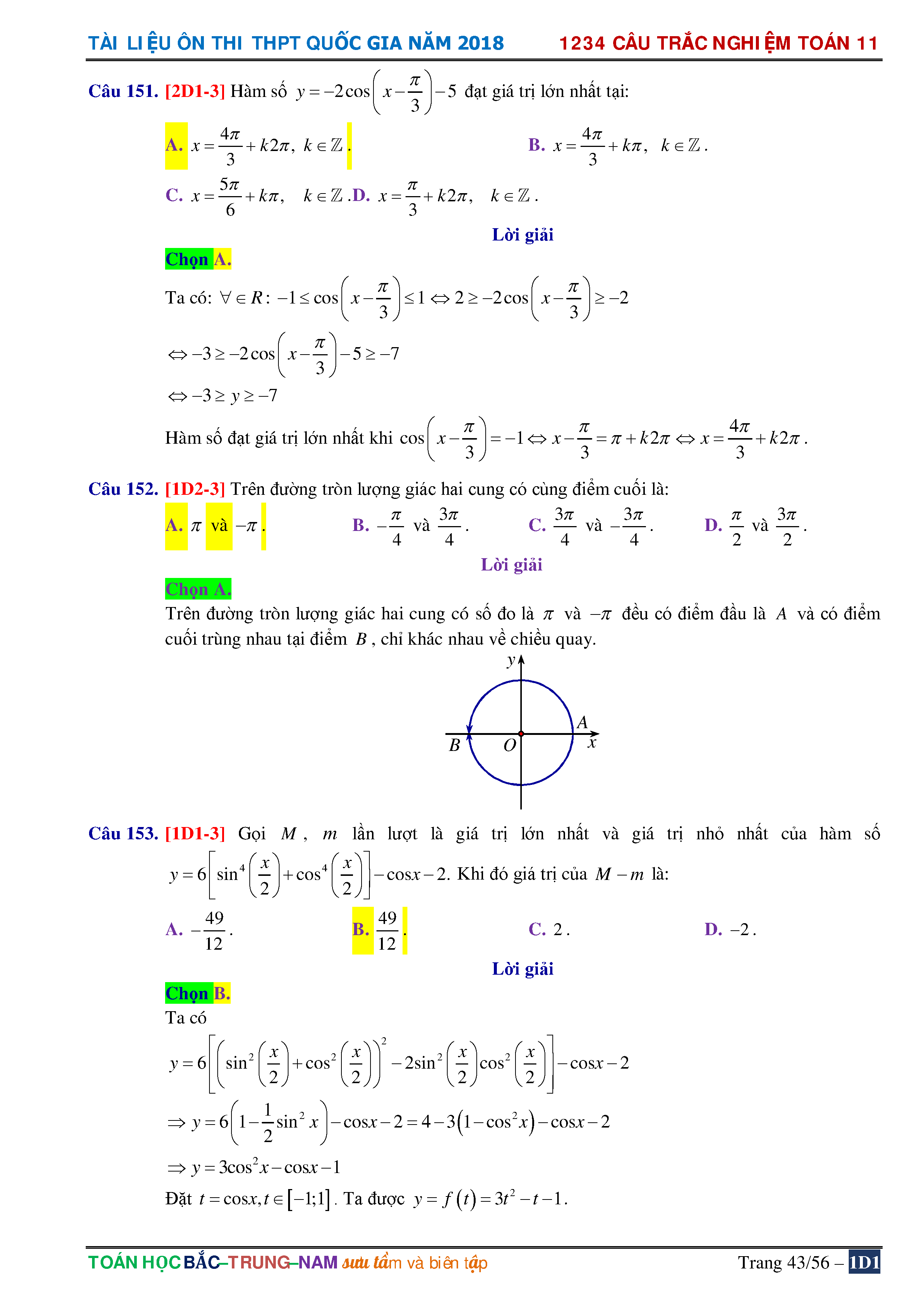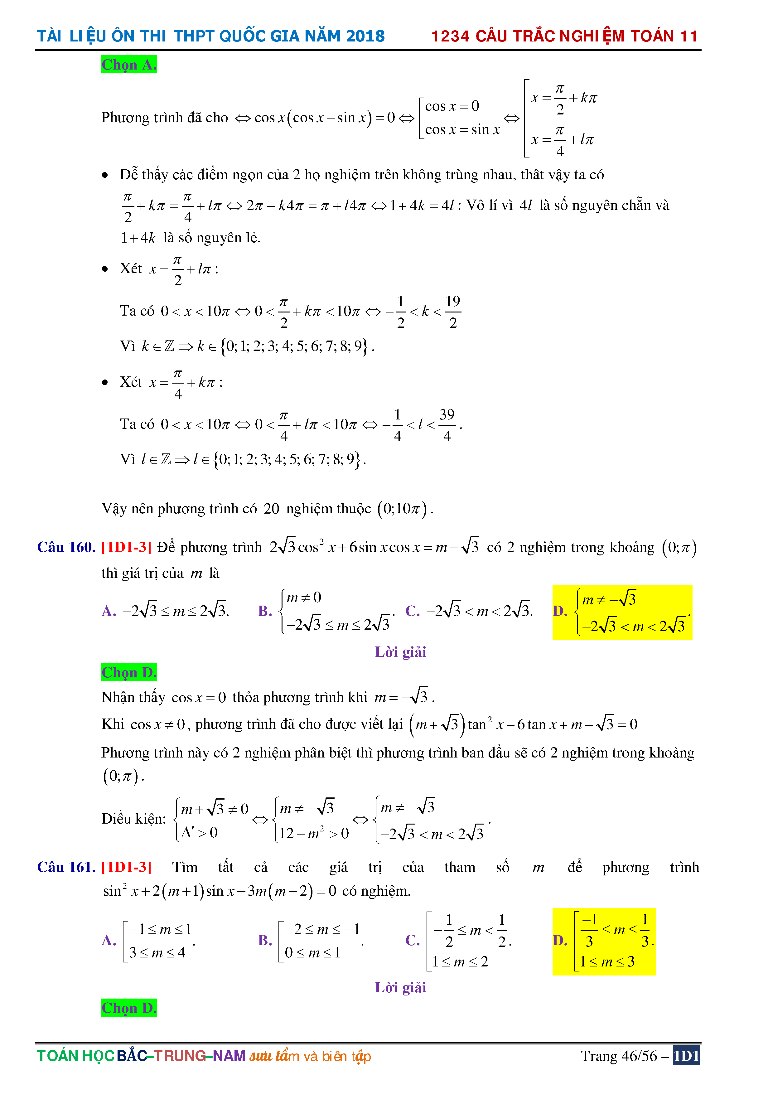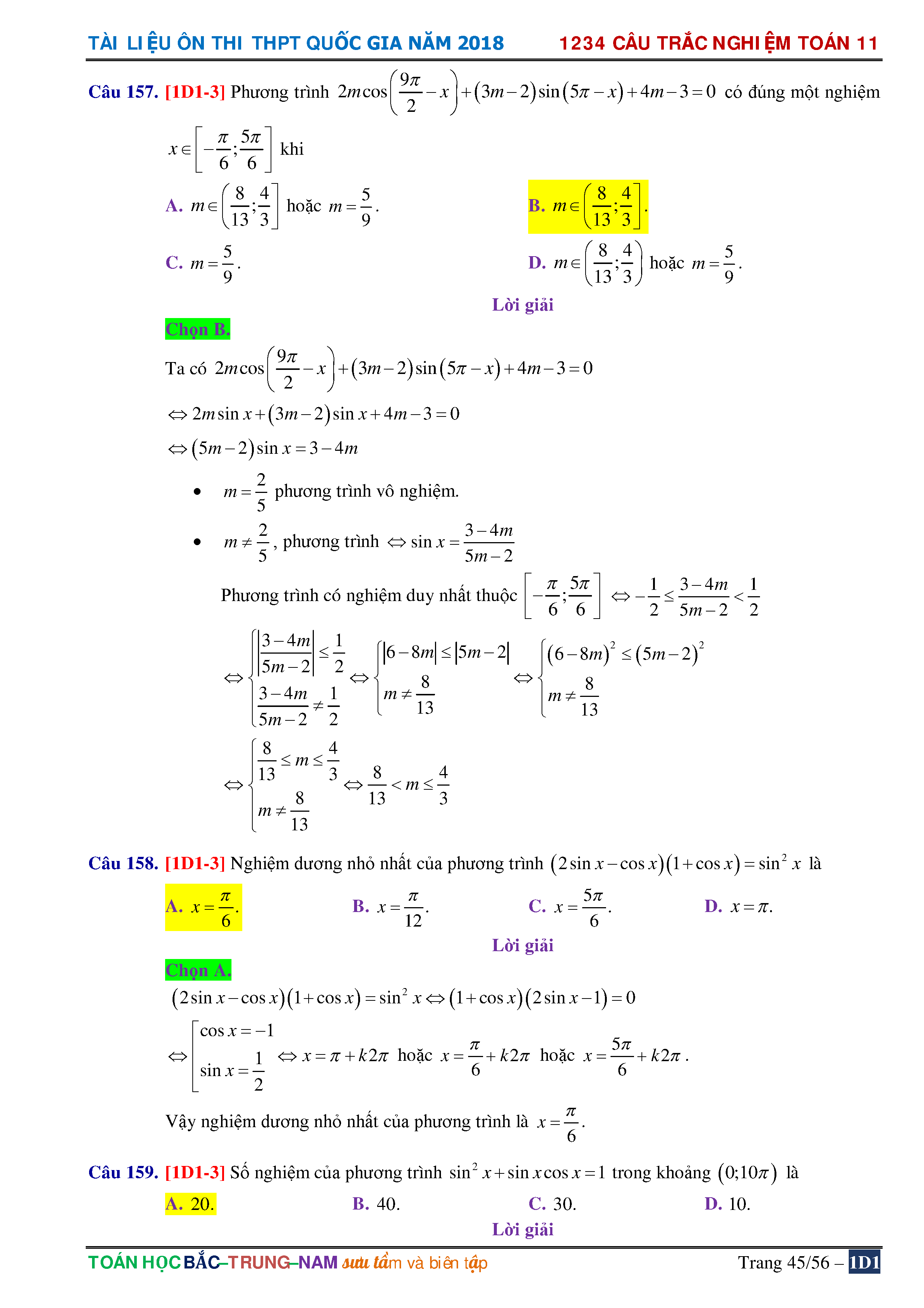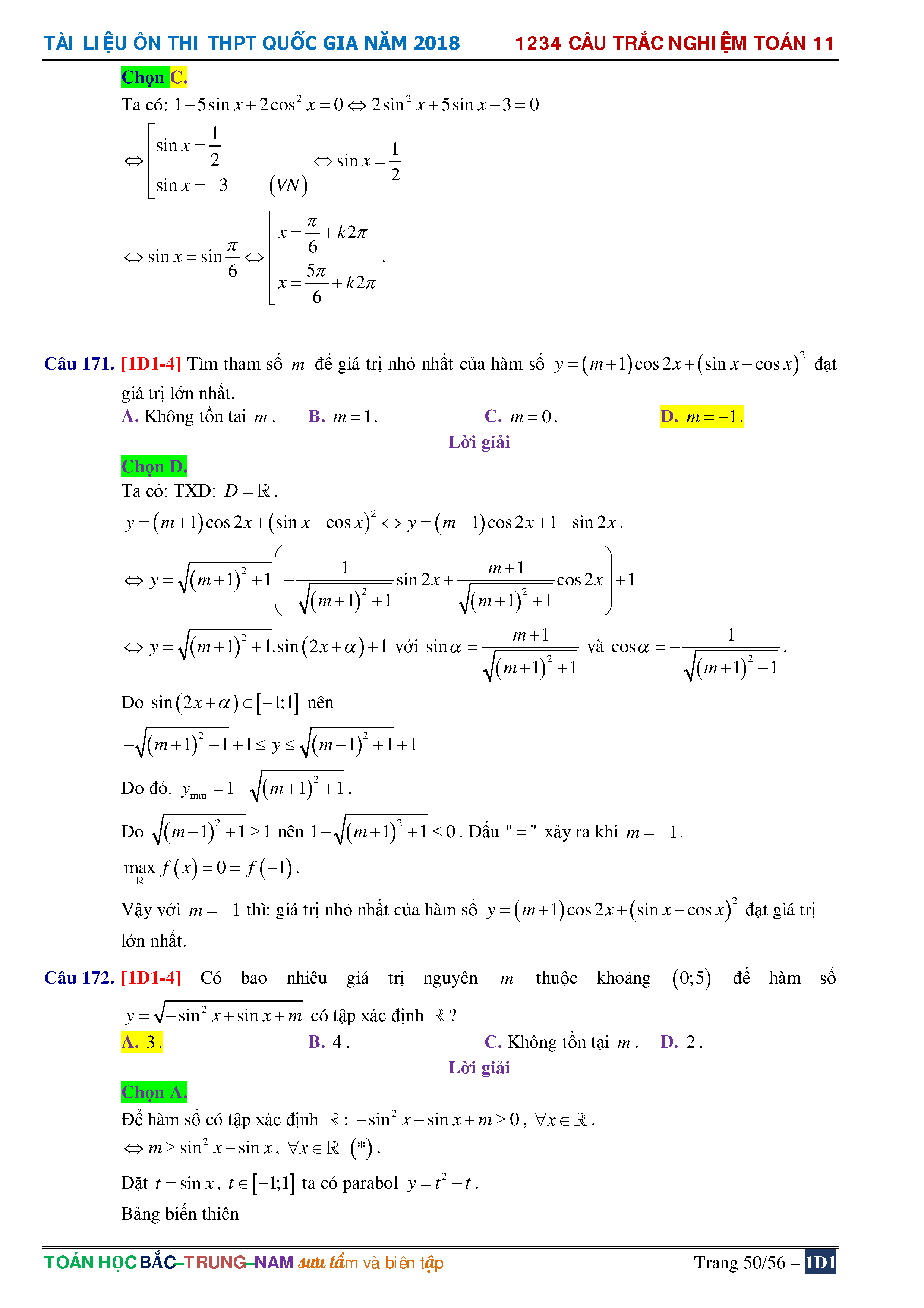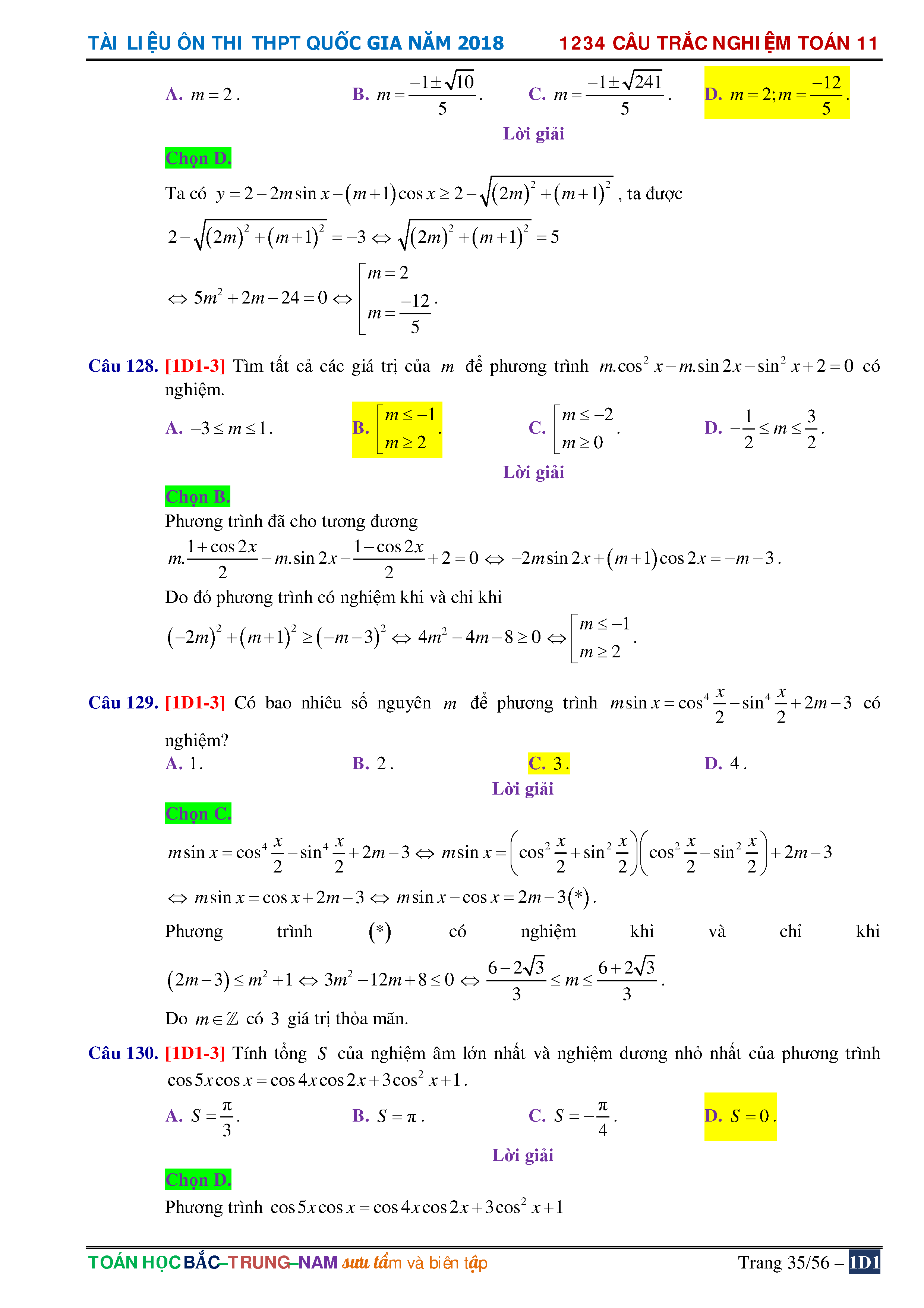 TRẮC NGHIỆM HÀM SỐ LƯỢNG GIÁC PHƯƠNG TRÌNH LƯỢNG GIÁC TOÁN LỚP 11
