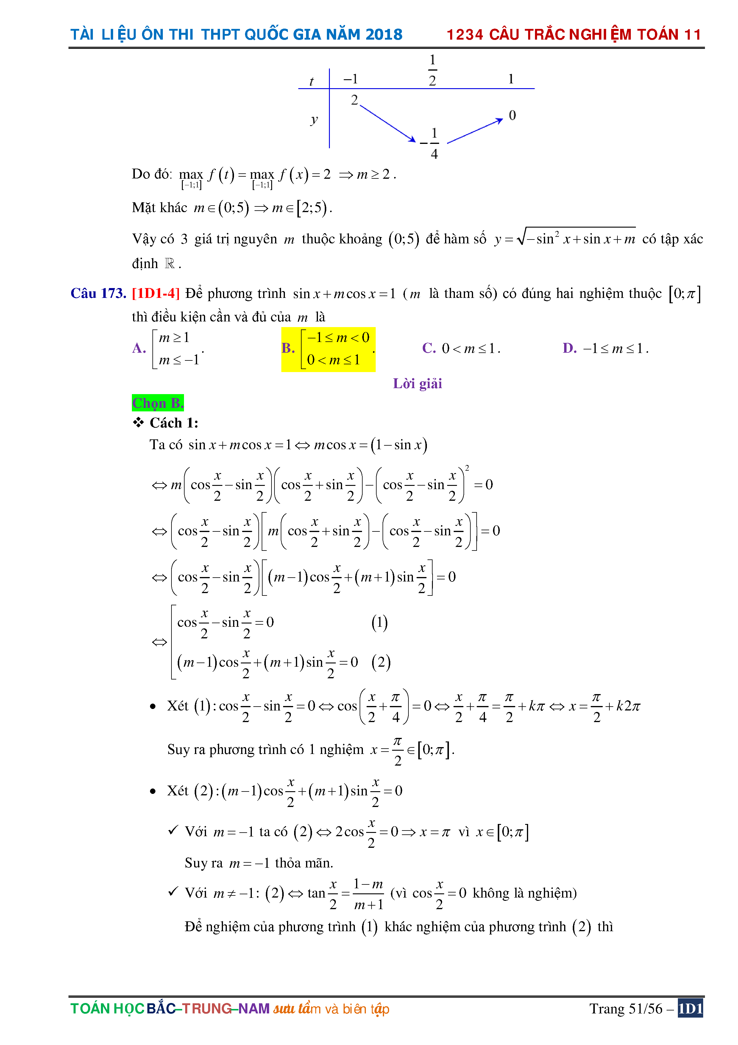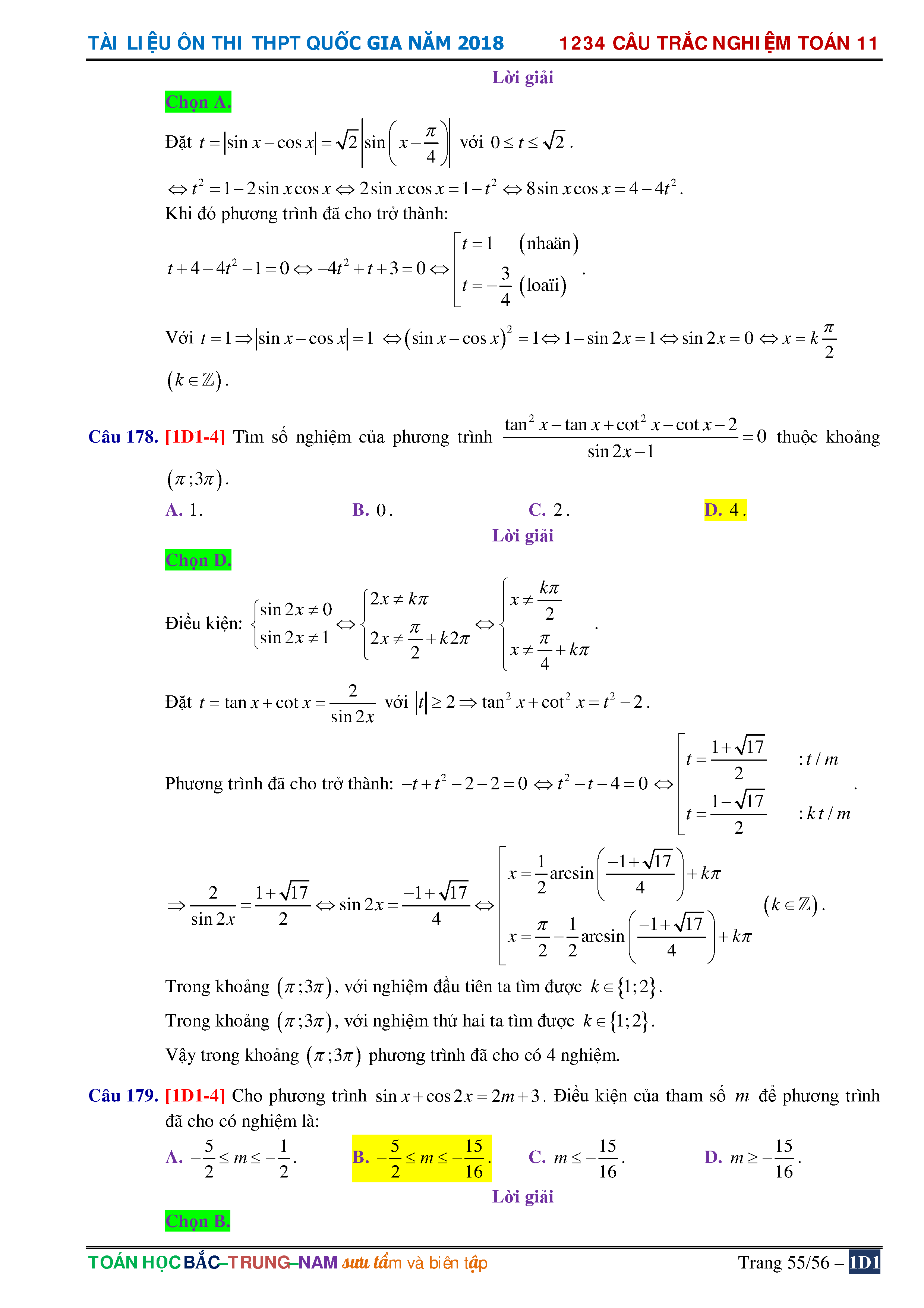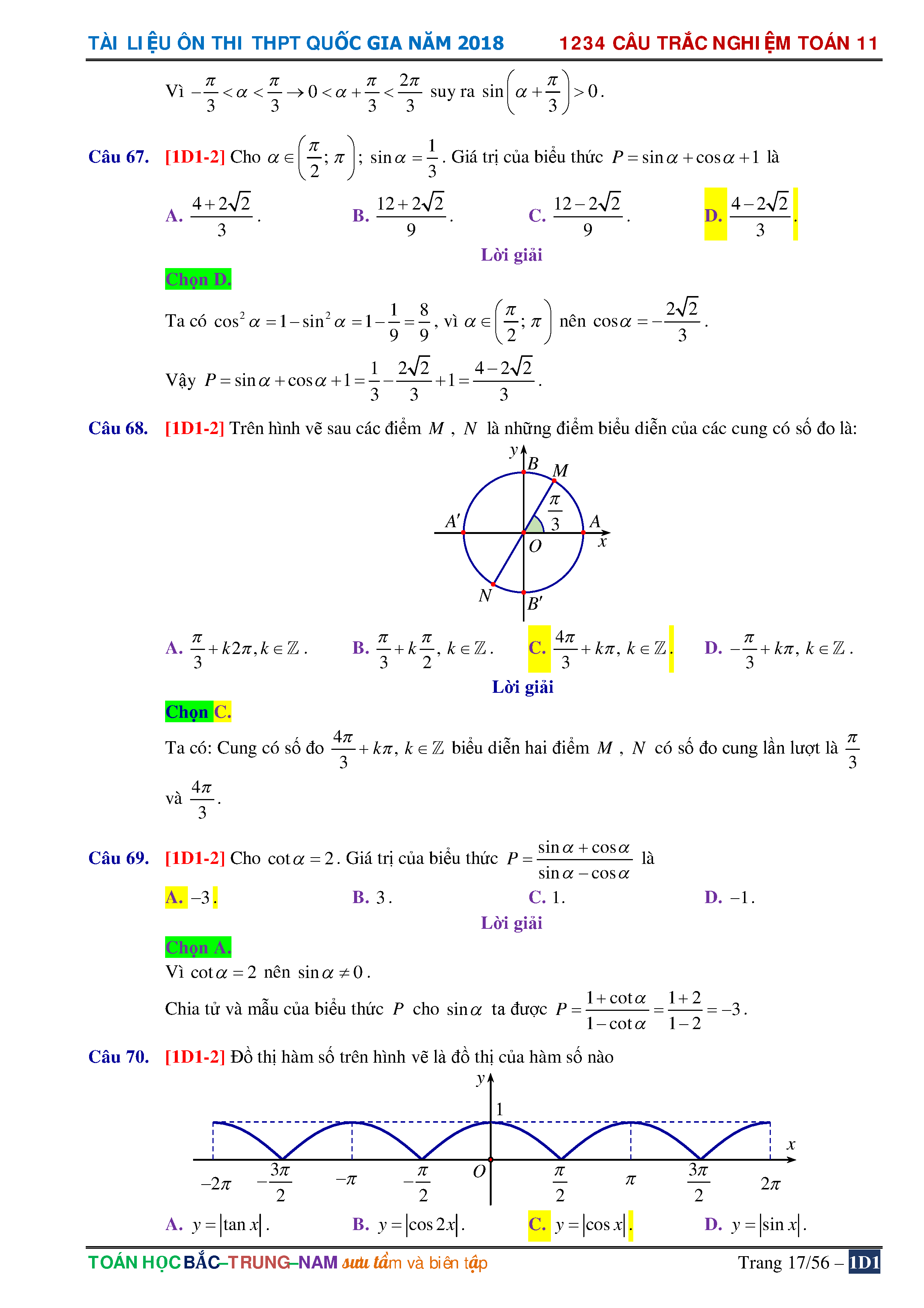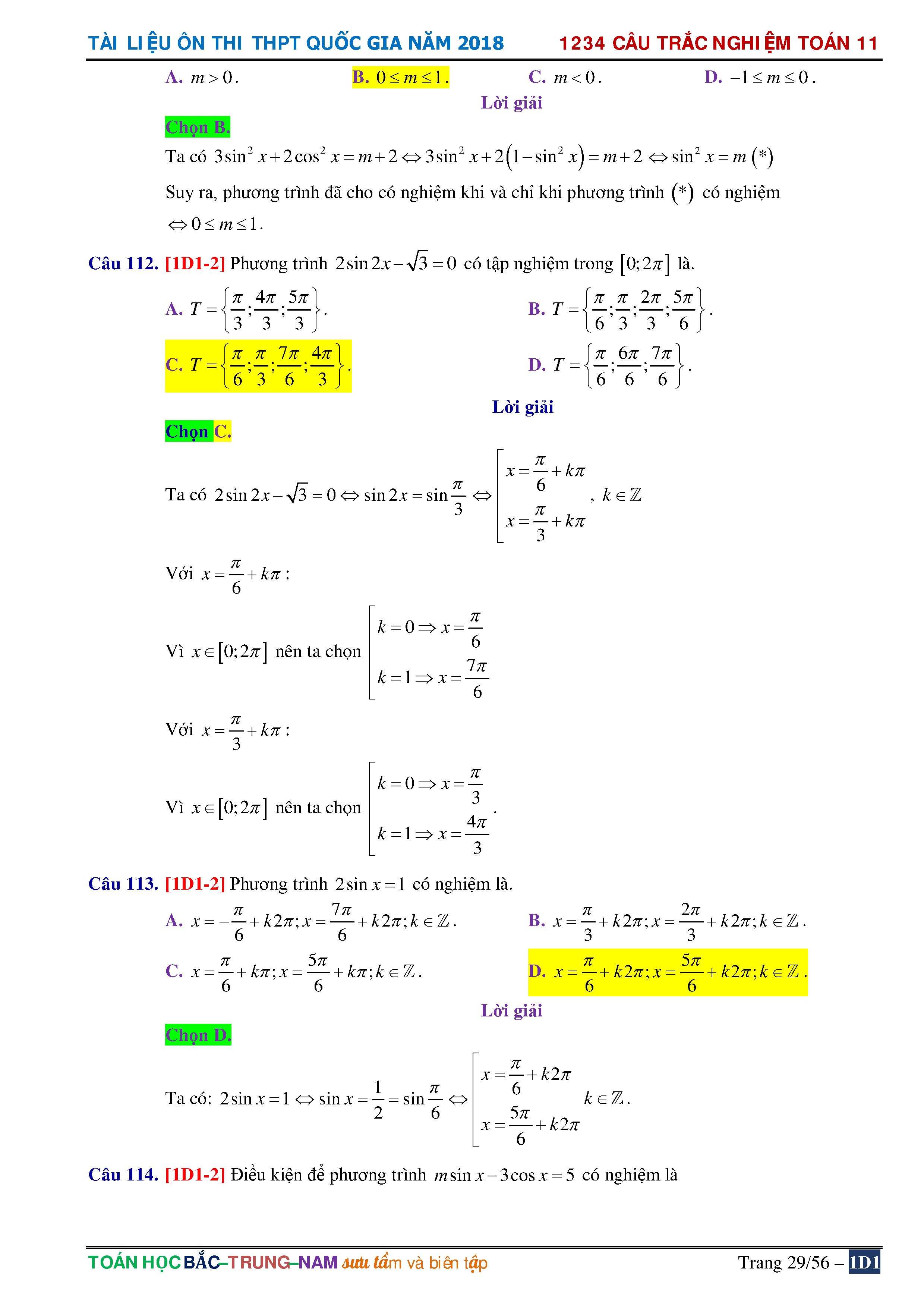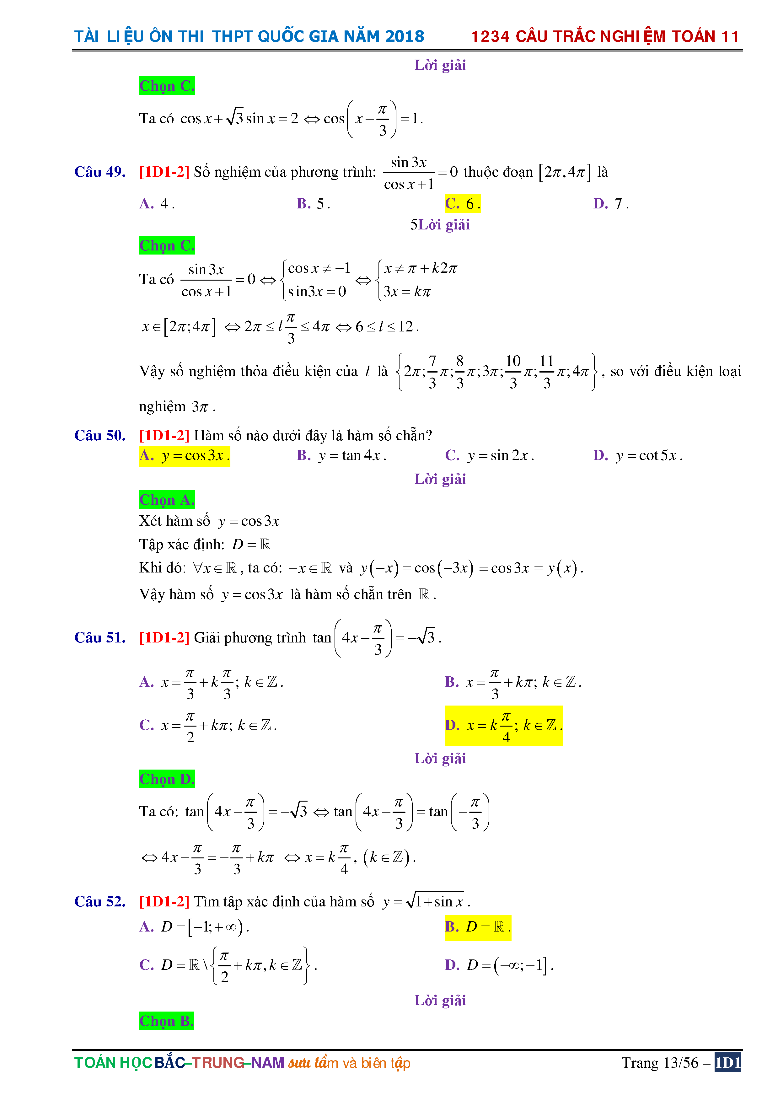 TRẮC NGHIỆM HÀM SỐ LƯỢNG GIÁC PHƯƠNG TRÌNH LƯỢNG GIÁC TOÁN LỚP 11