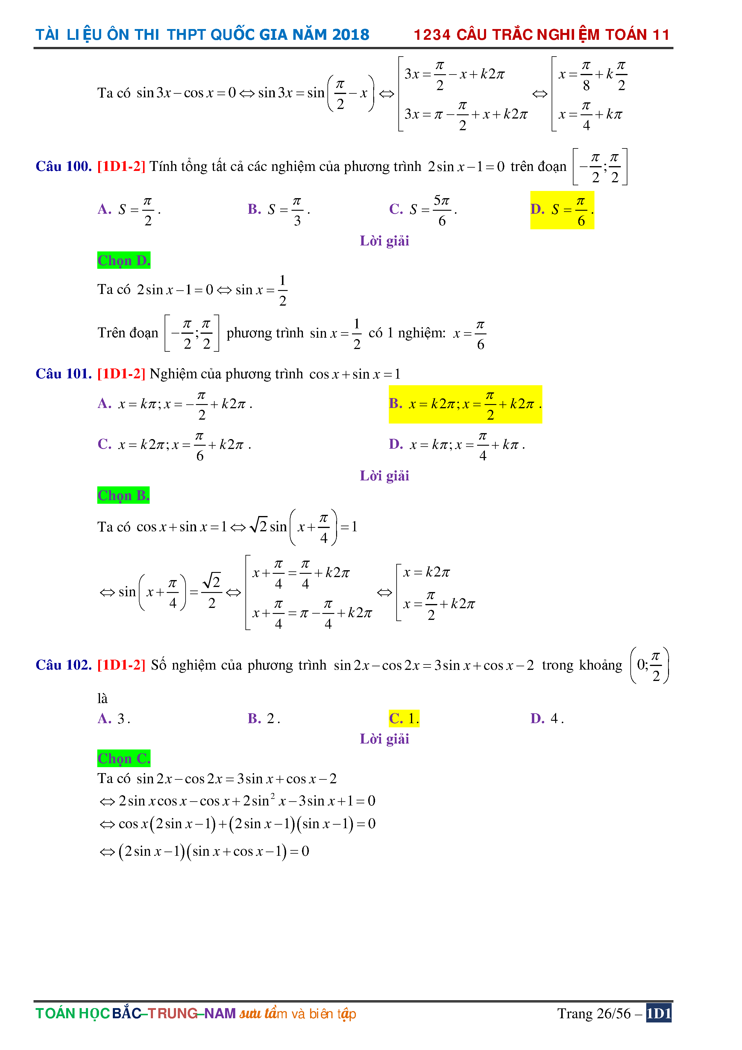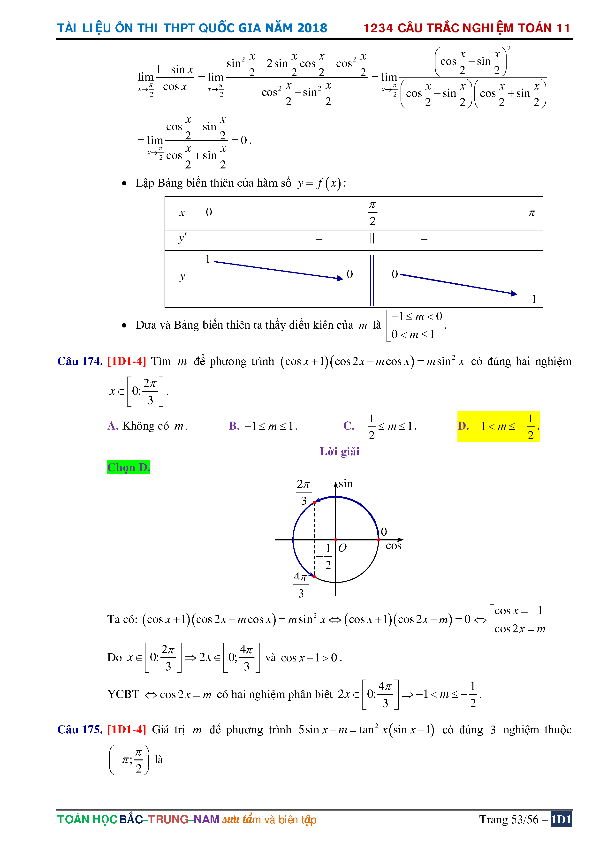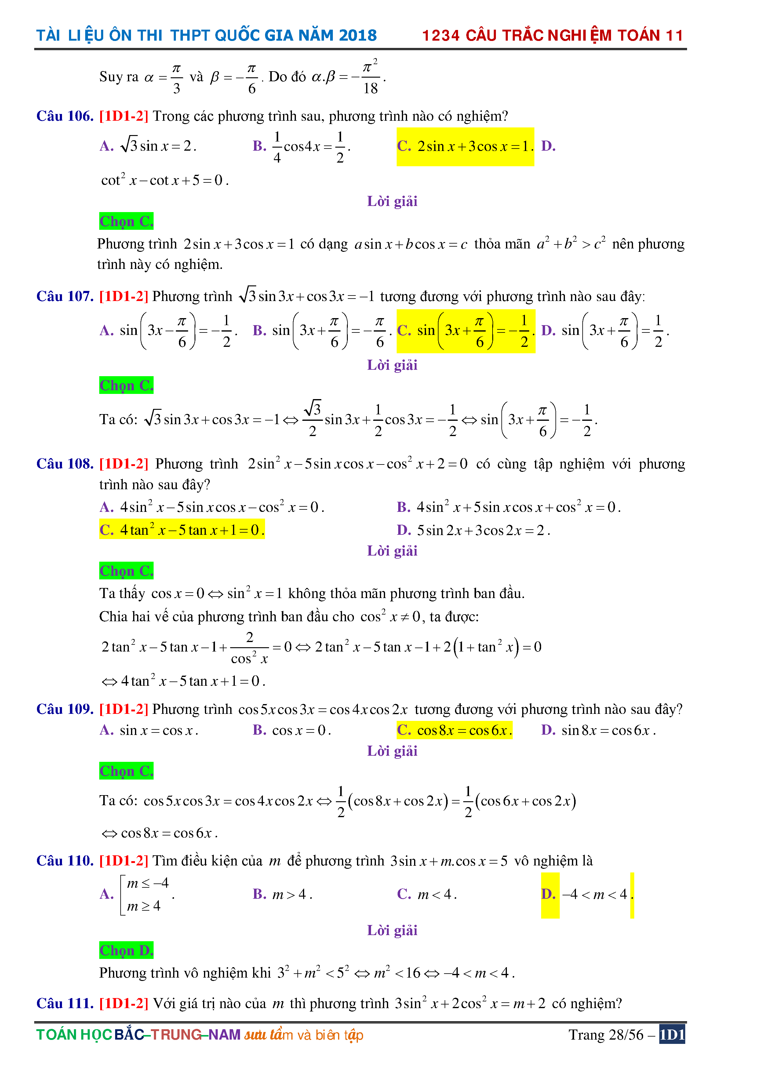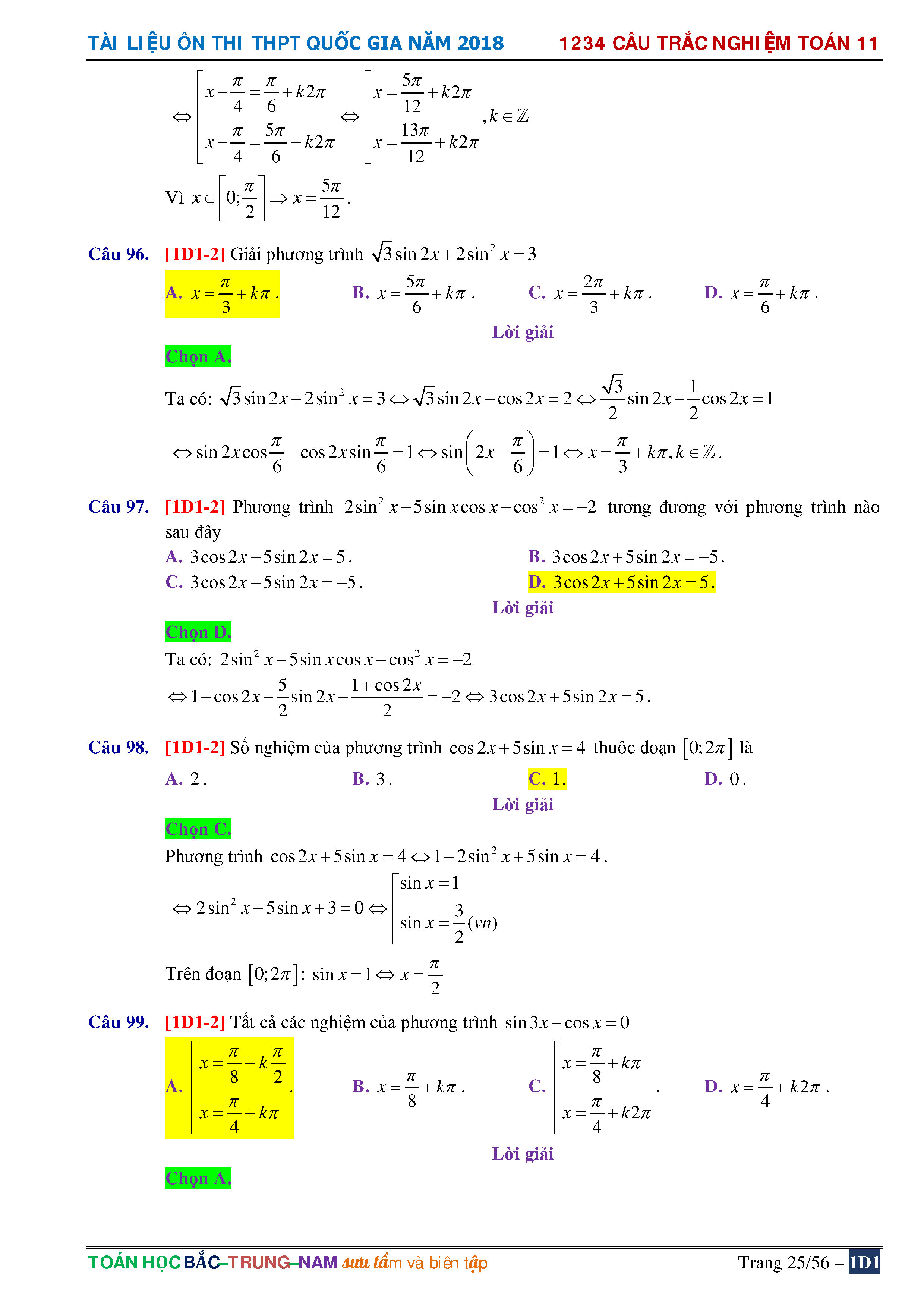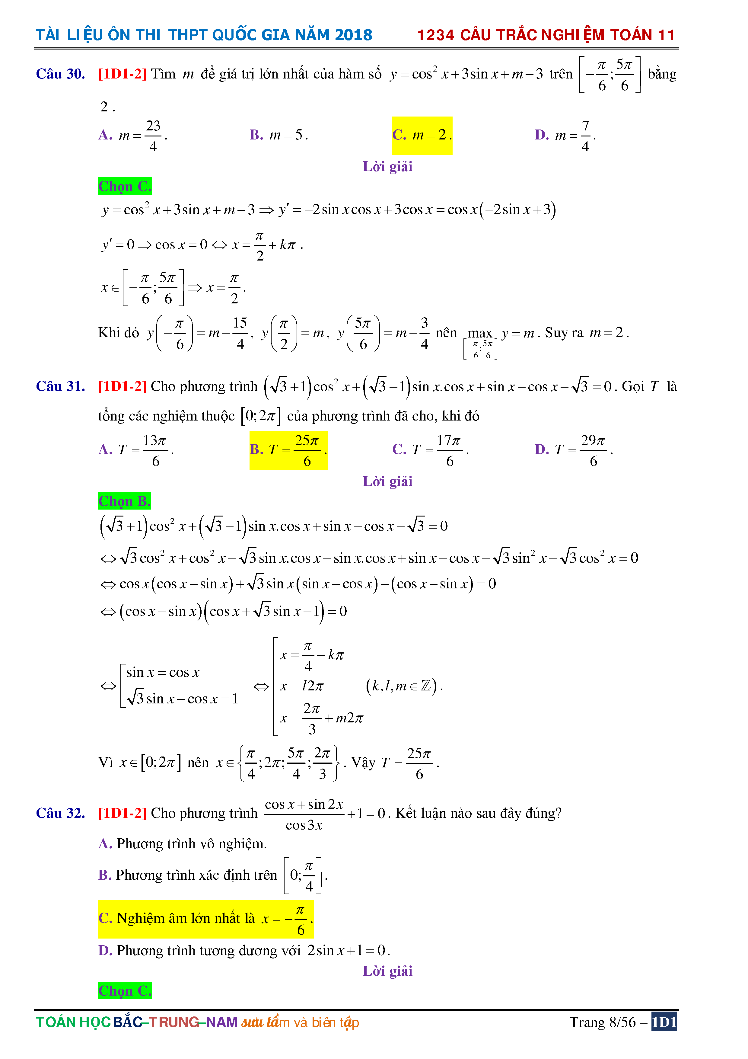TRẮC NGHIỆM HÀM SỐ LƯỢNG GIÁC PHƯƠNG TRÌNH LƯỢNG GIÁC TOÁN LỚP 11