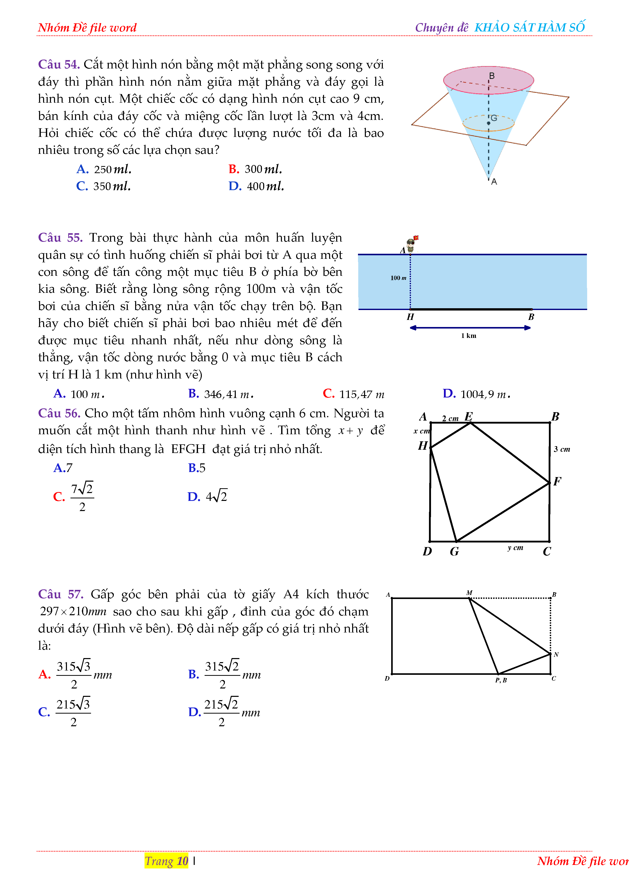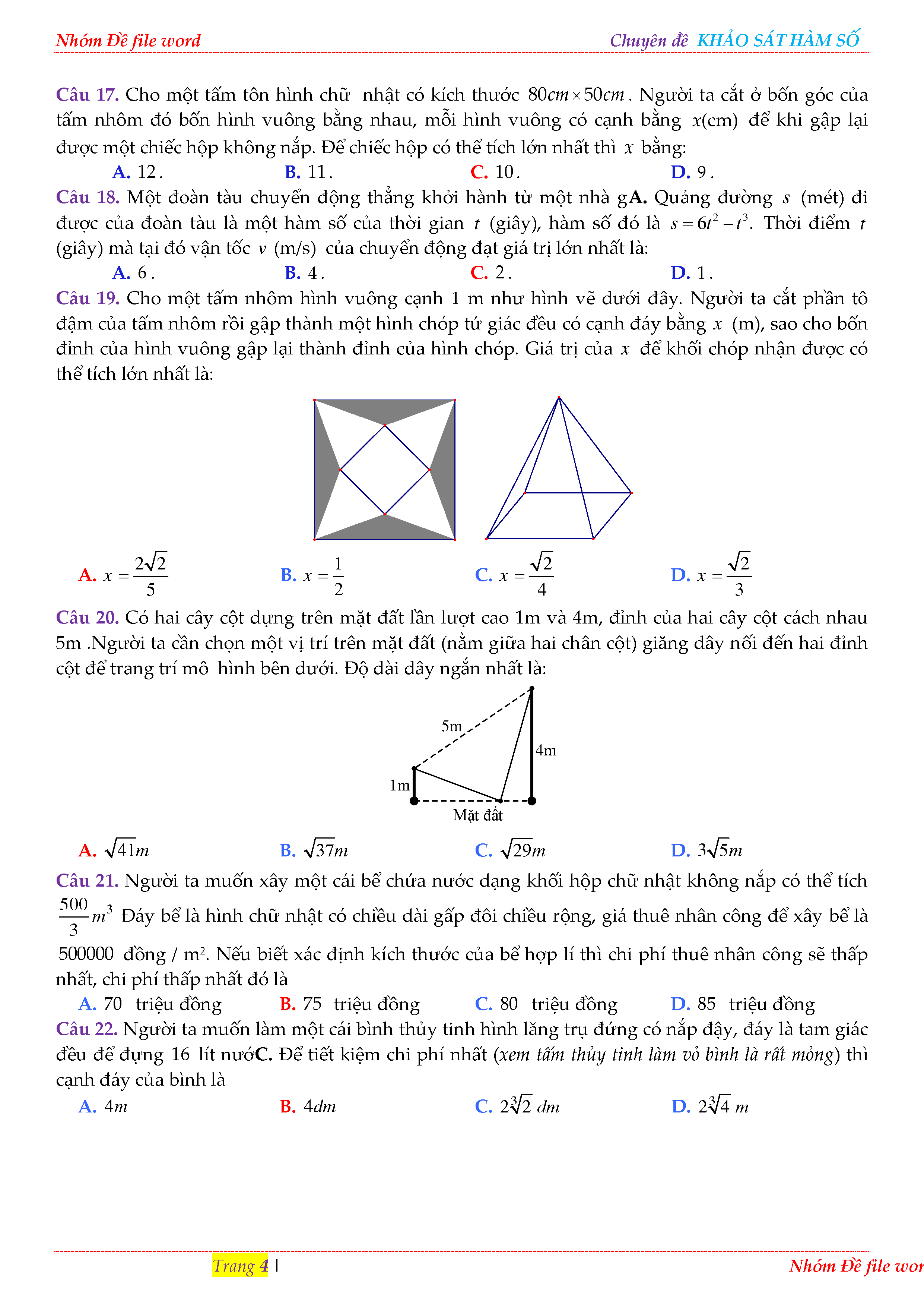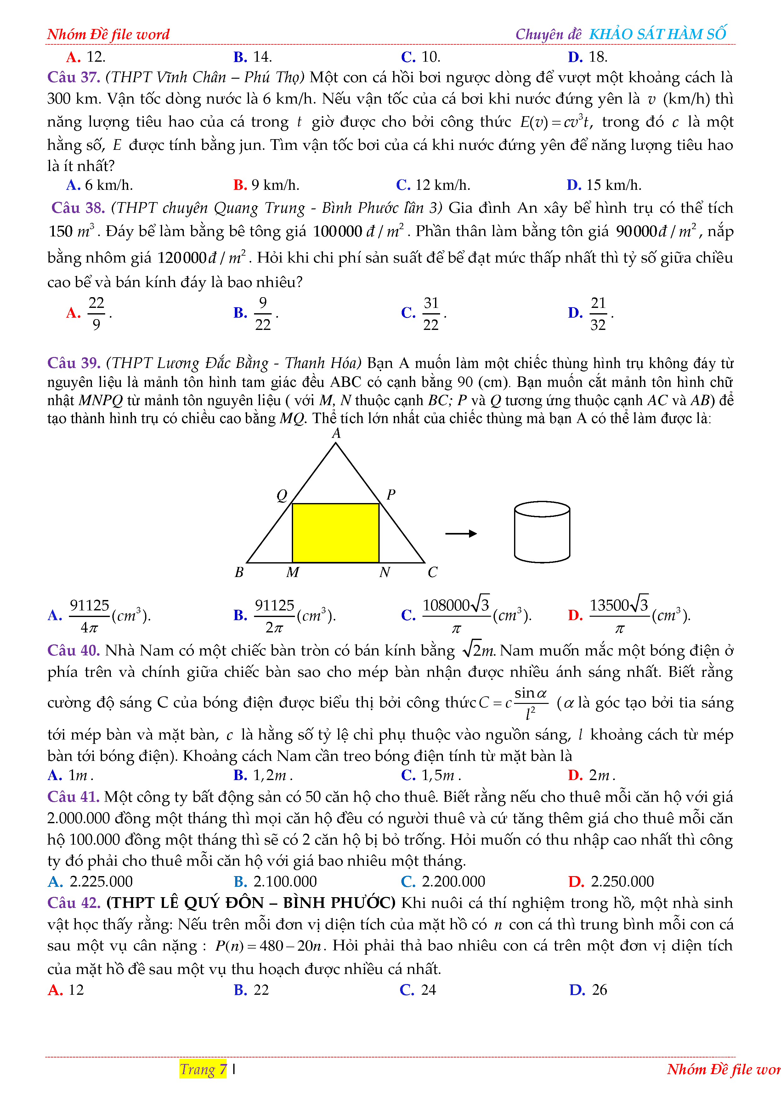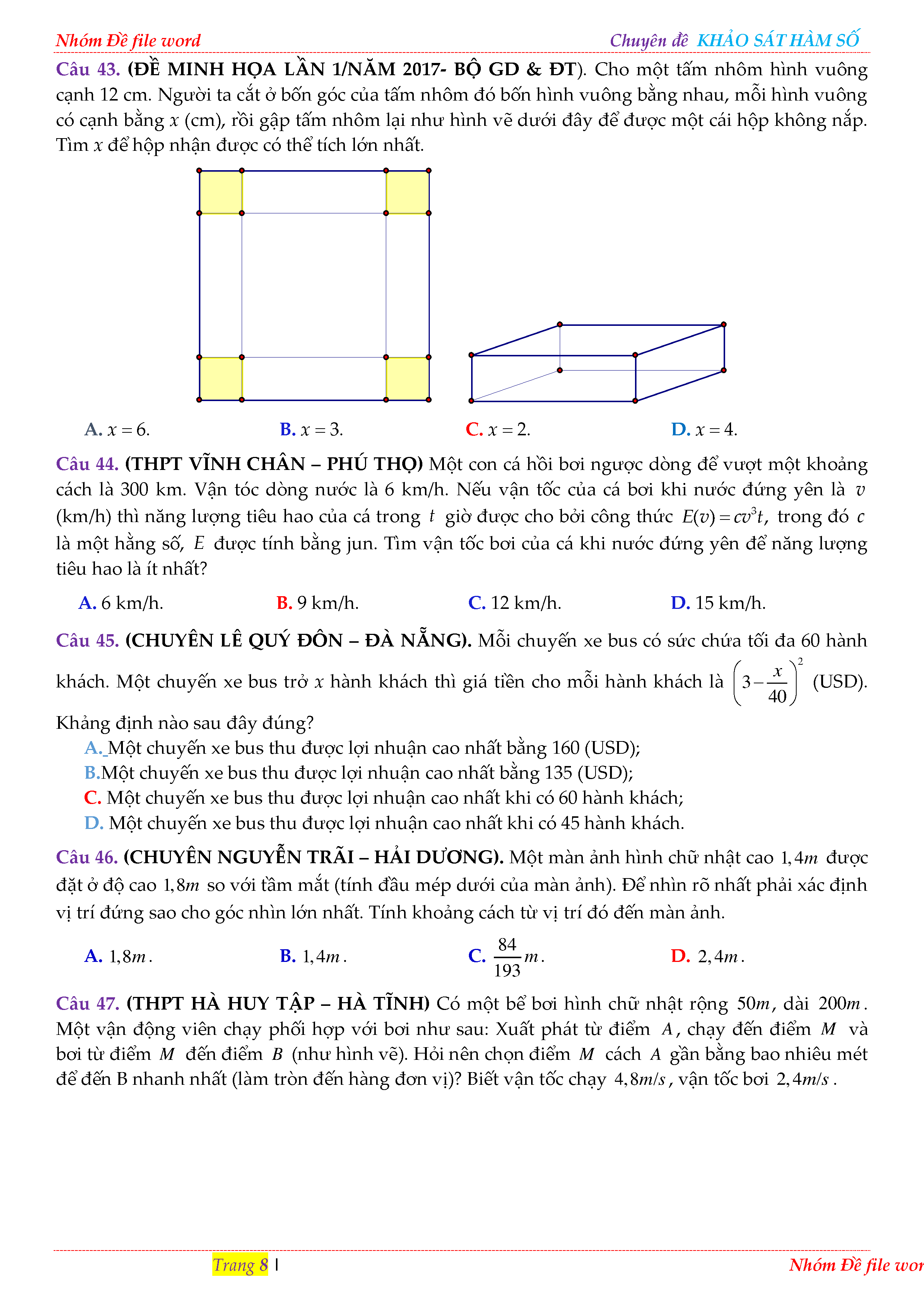 TRẮC NGHIỆM ỨNG DỤNG MAX – MIN TRONG BÀI TOÁN KHẢO SÁT HÀM SỐ - ĐỀ THI THỬ THPT QG 2018 - ĐỀ BÀI