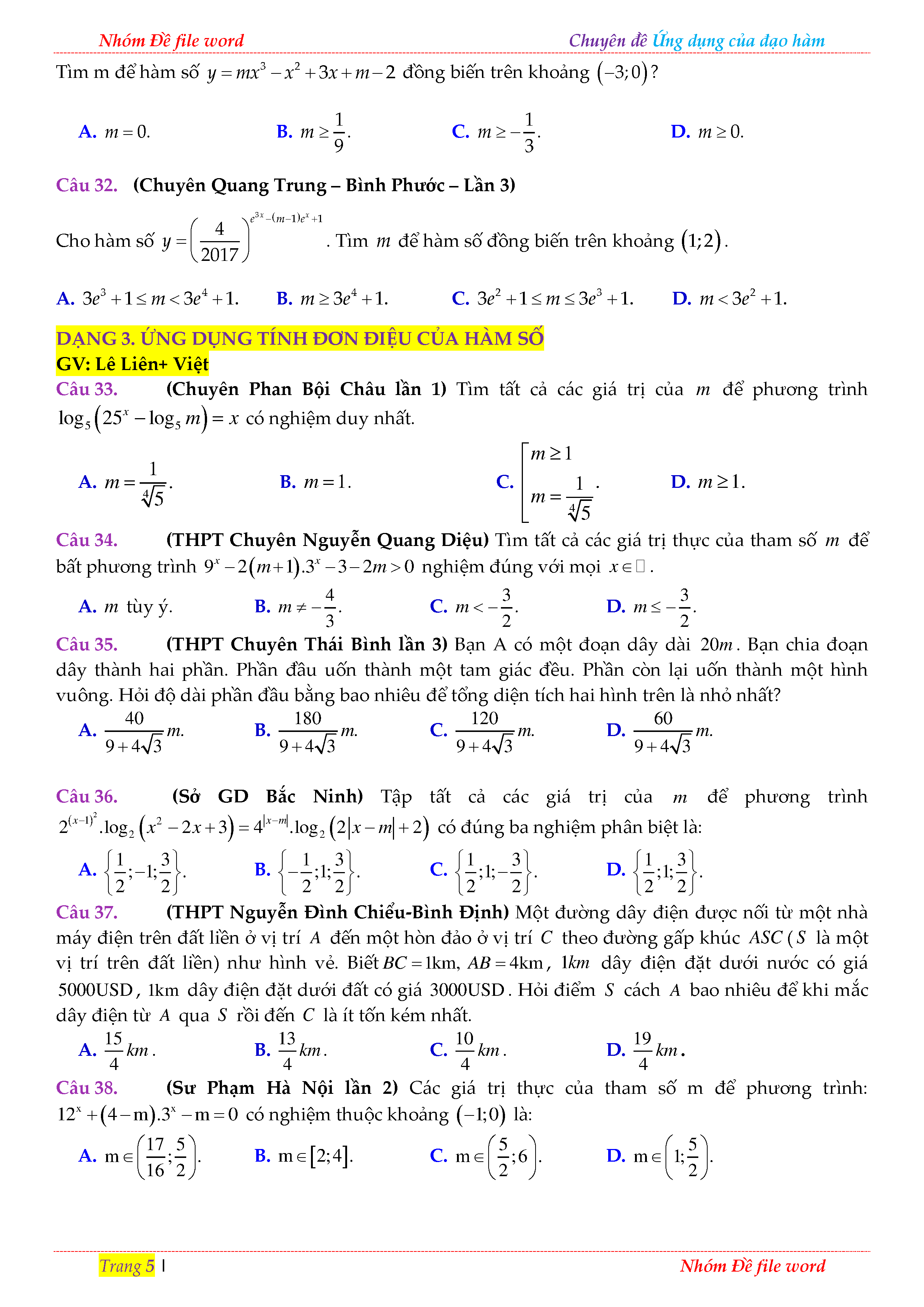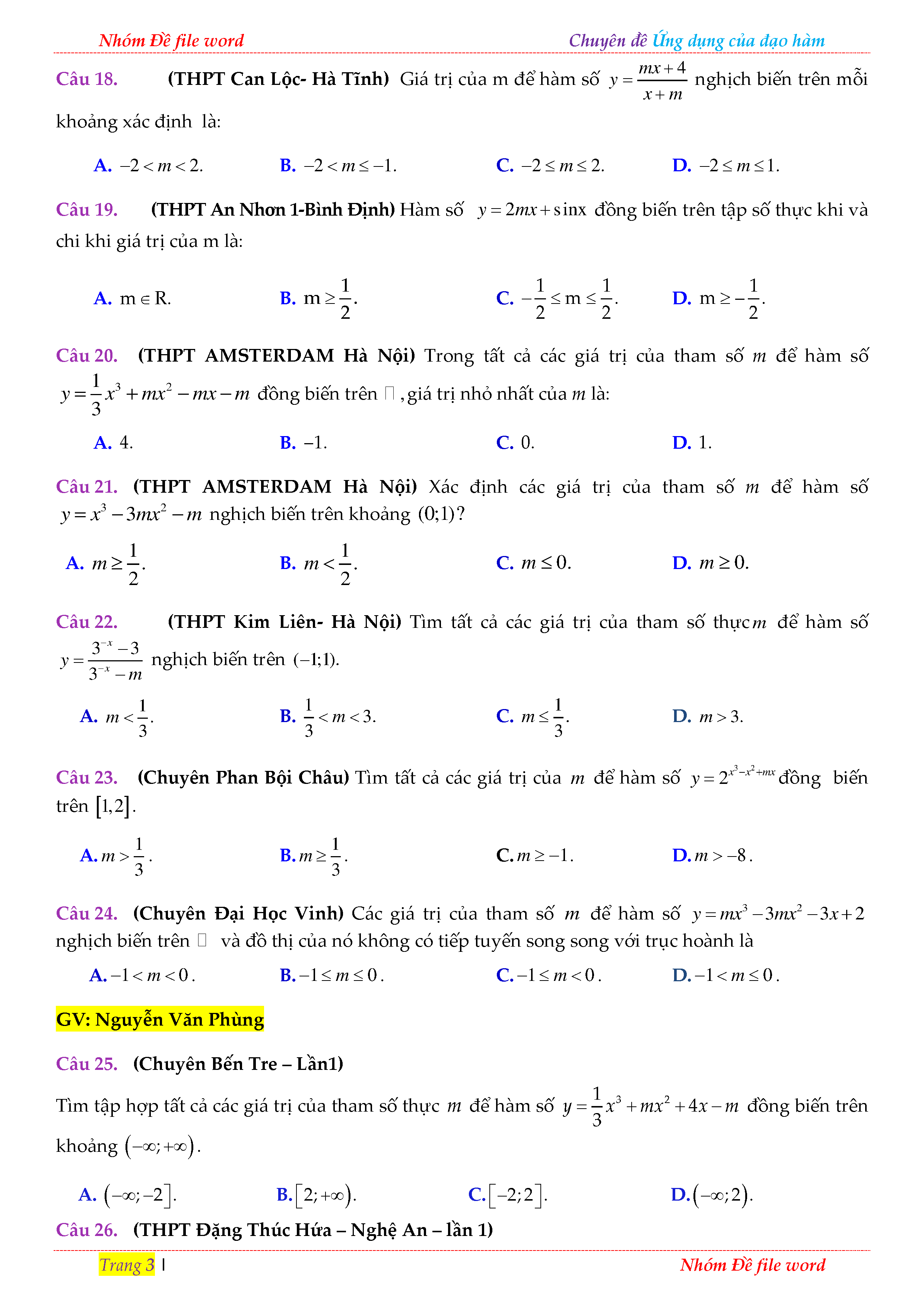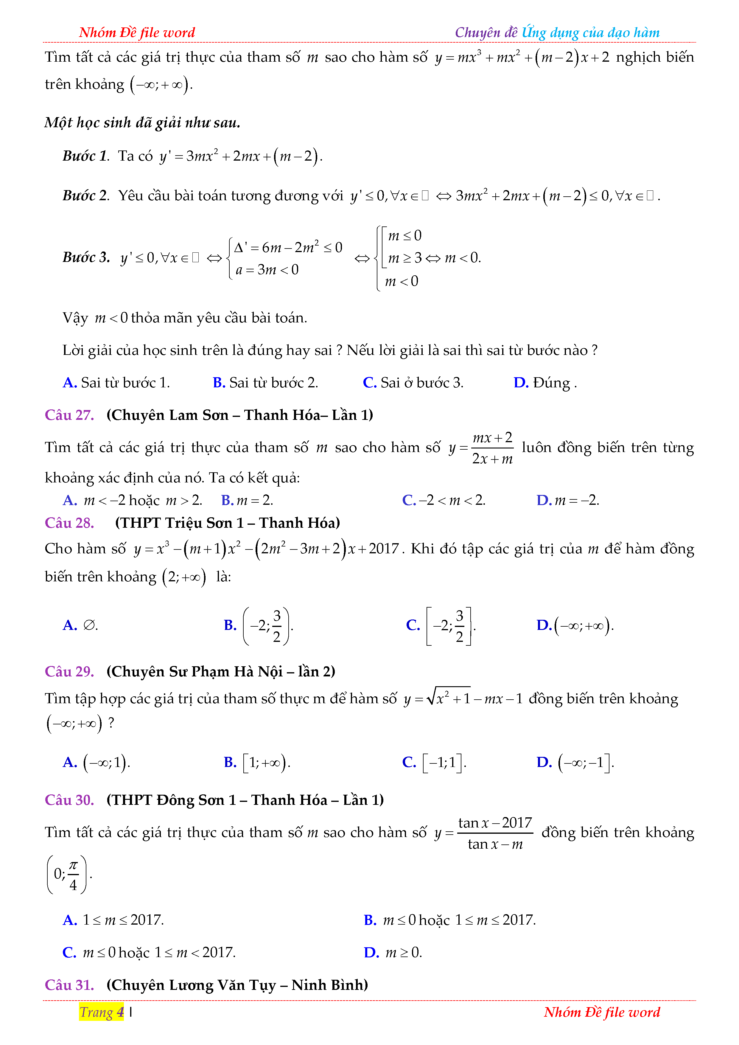 TRẮC NGHIỆM CHUYÊN ĐỀ ỨNG DỤNG CỦA ĐẠO HÀM TRONG ĐỀ THI THỬ THPT QUỐC GIA 2017 - 2018 - ĐỀ BÀI
