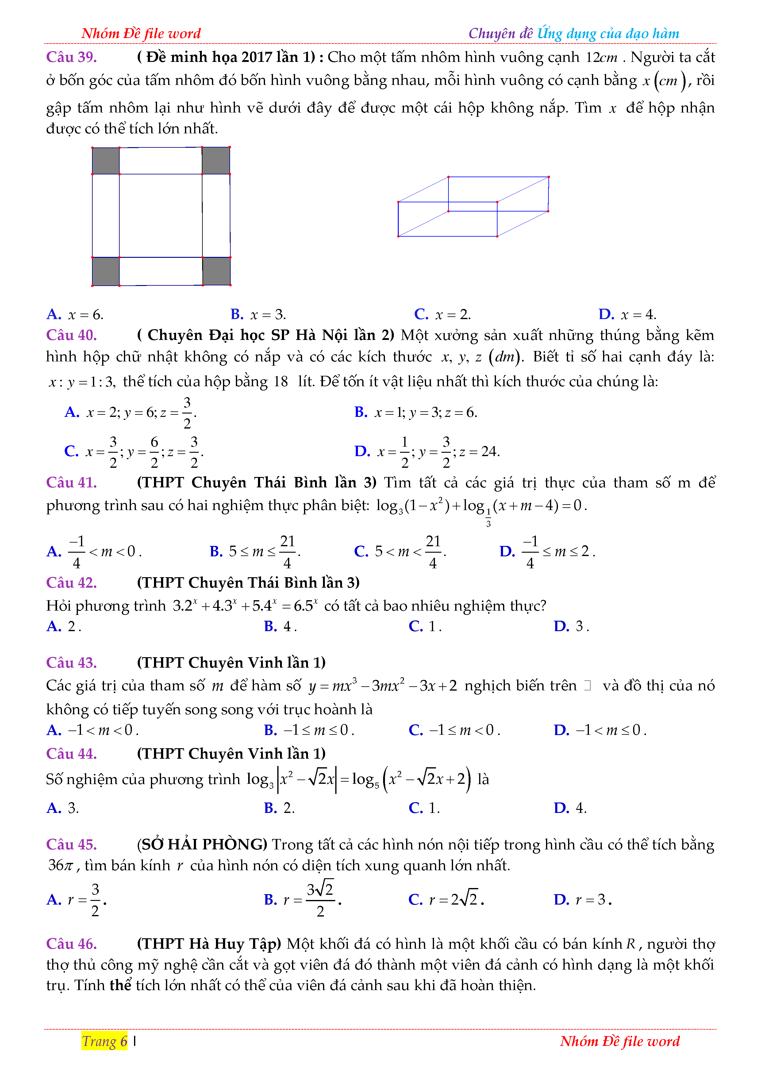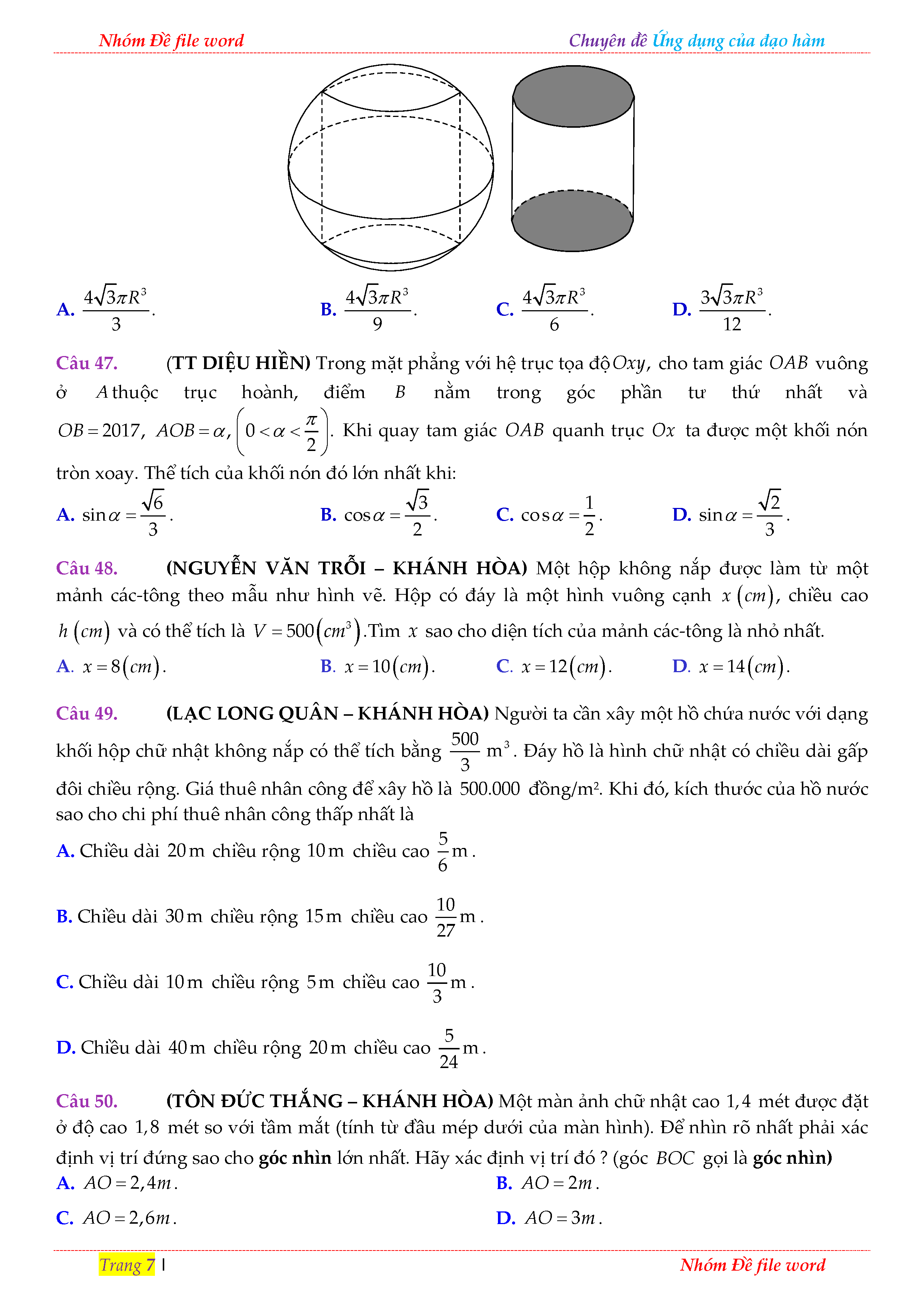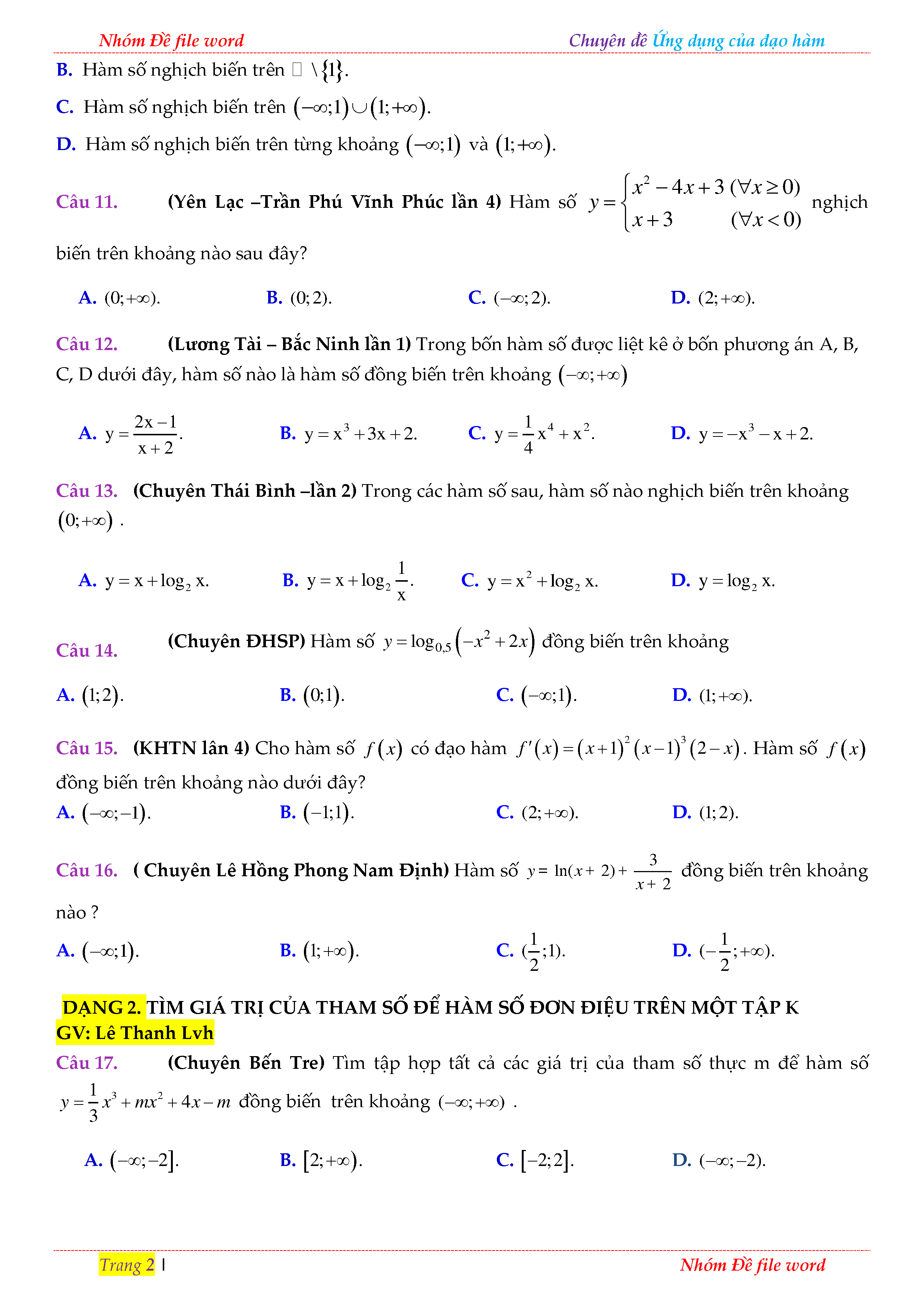 TRẮC NGHIỆM CHUYÊN ĐỀ ỨNG DỤNG CỦA ĐẠO HÀM TRONG ĐỀ THI THỬ THPT QUỐC GIA 2017 - 2018 - ĐỀ BÀI