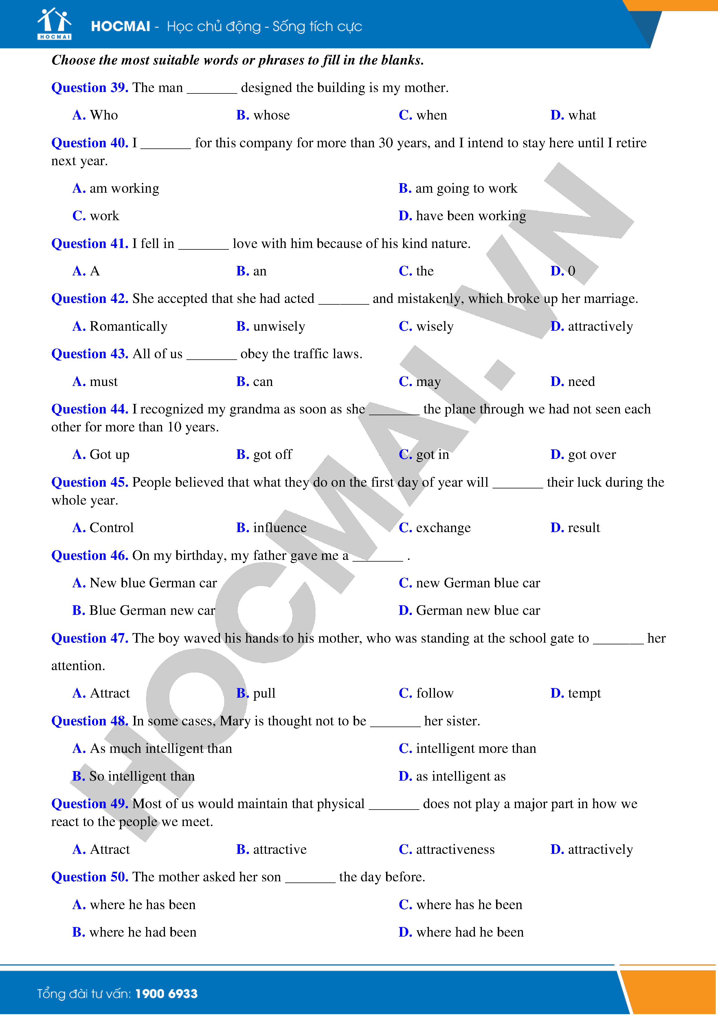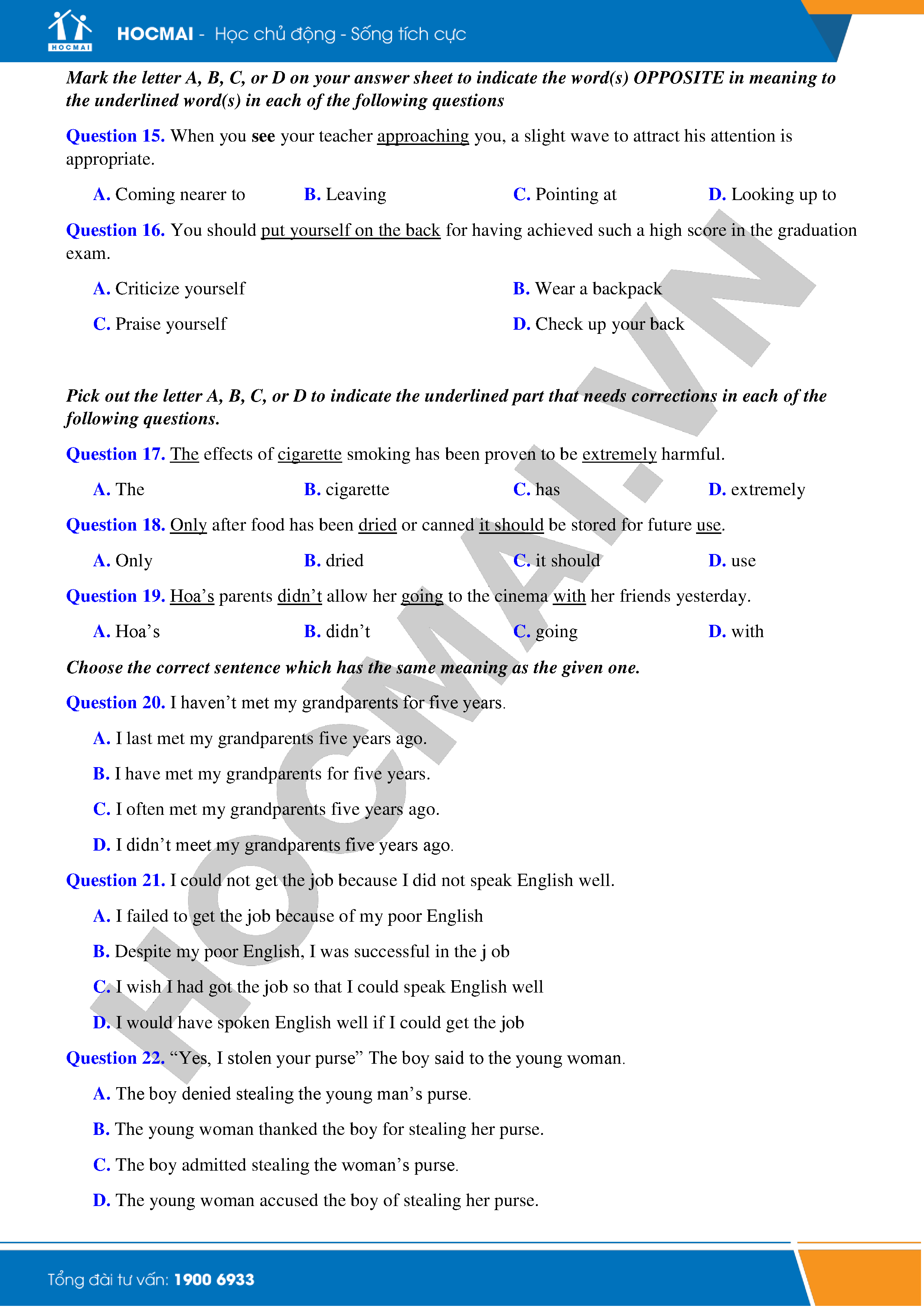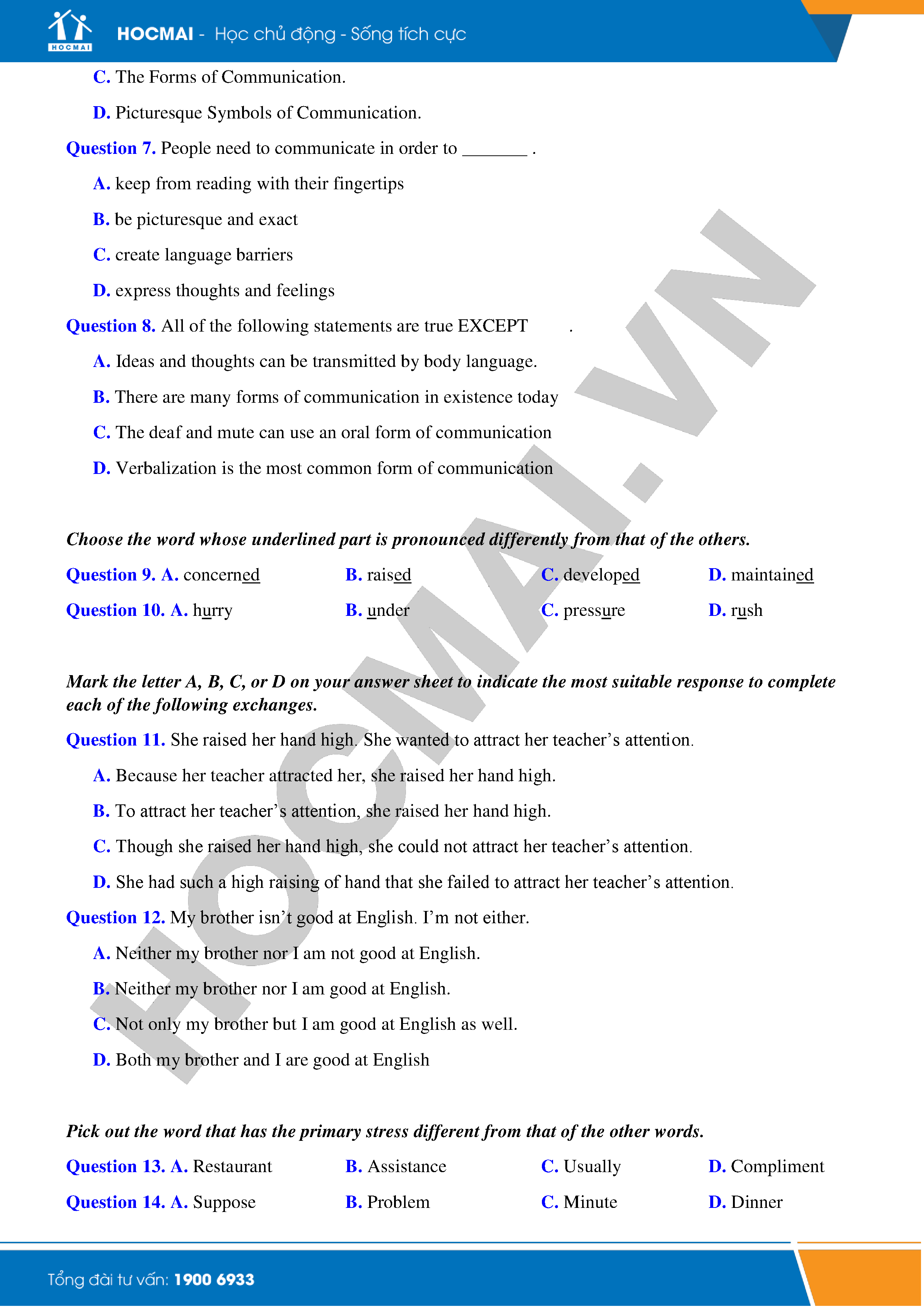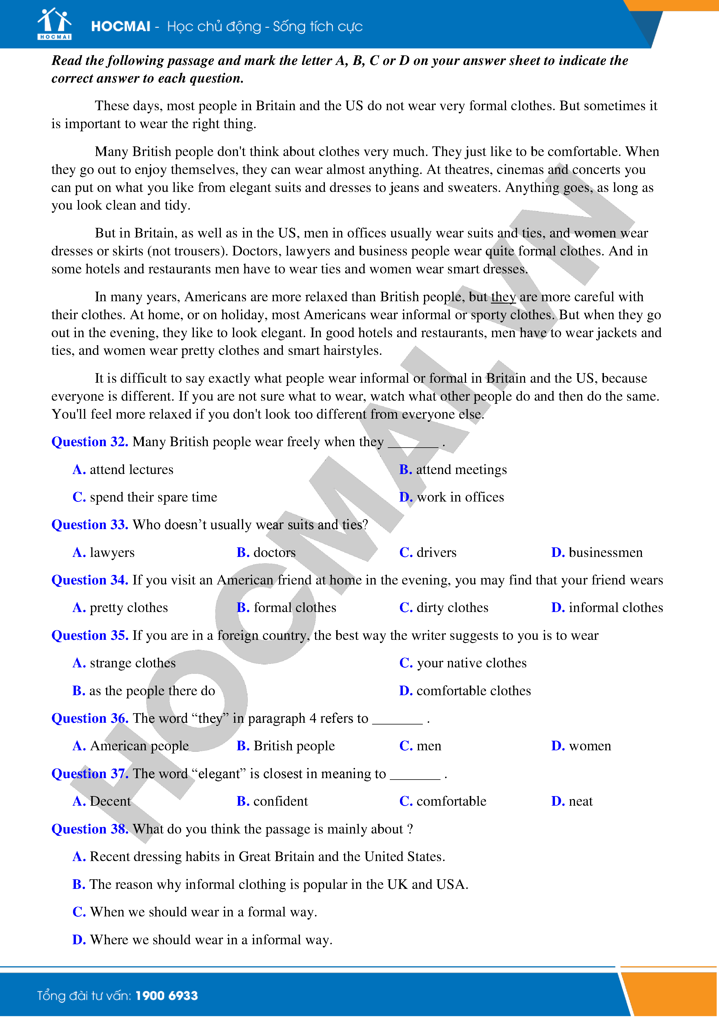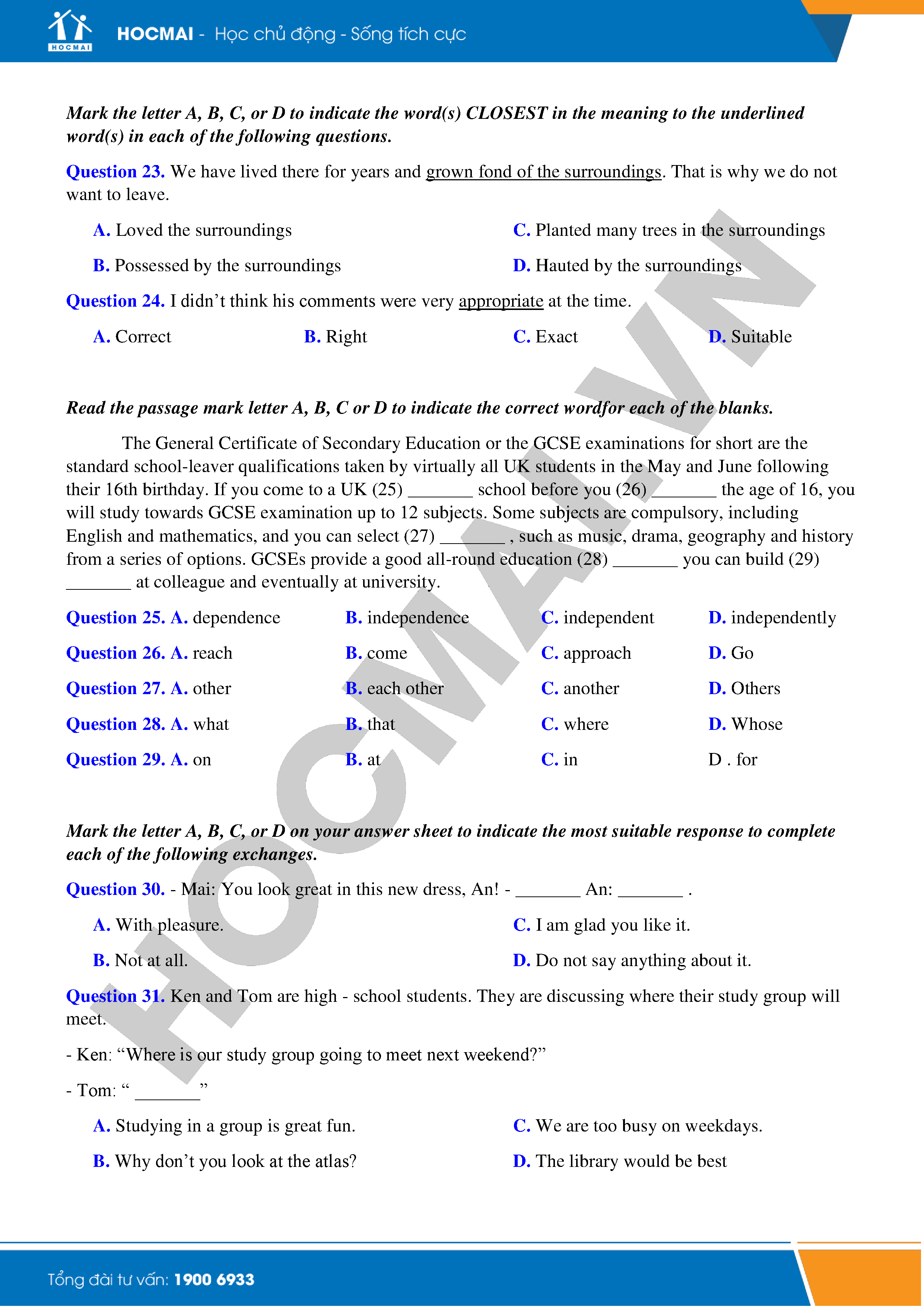 Đề thi thử THPTQG năm 2018 - Môn Tiếng Anh - THPT Yên Mô A - Ninh Bình - Lần 1 là bộ đề do HOCMAI sưu tầm, bộ đề gồm 50 câu hỏi dưới hình thức trắc nghiệm, nội dung chủ yếu xoay quanh chương trình lớp 12, chuẩn bị cho kì thi THPTQG 2018. Cùng tham khảo nh