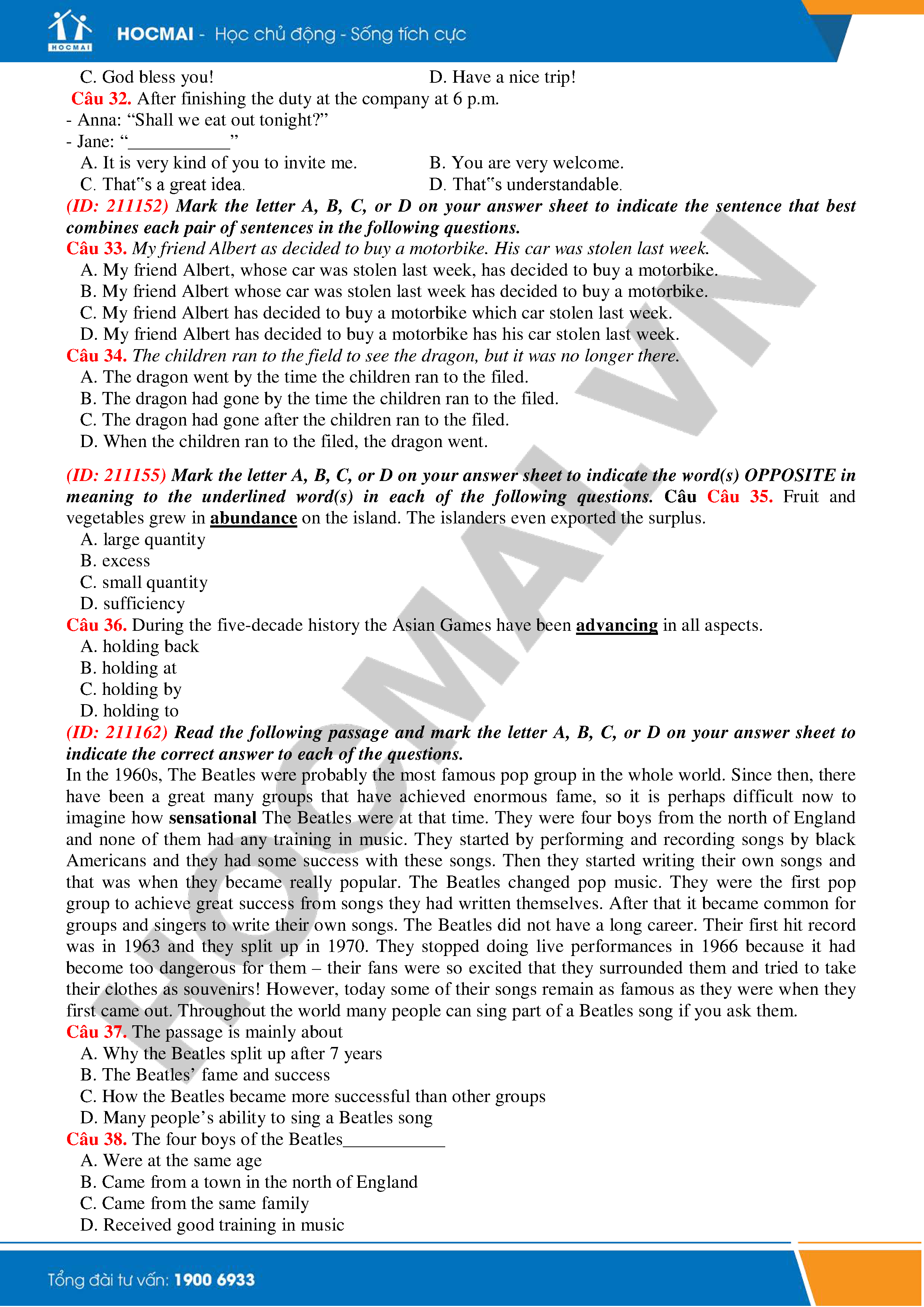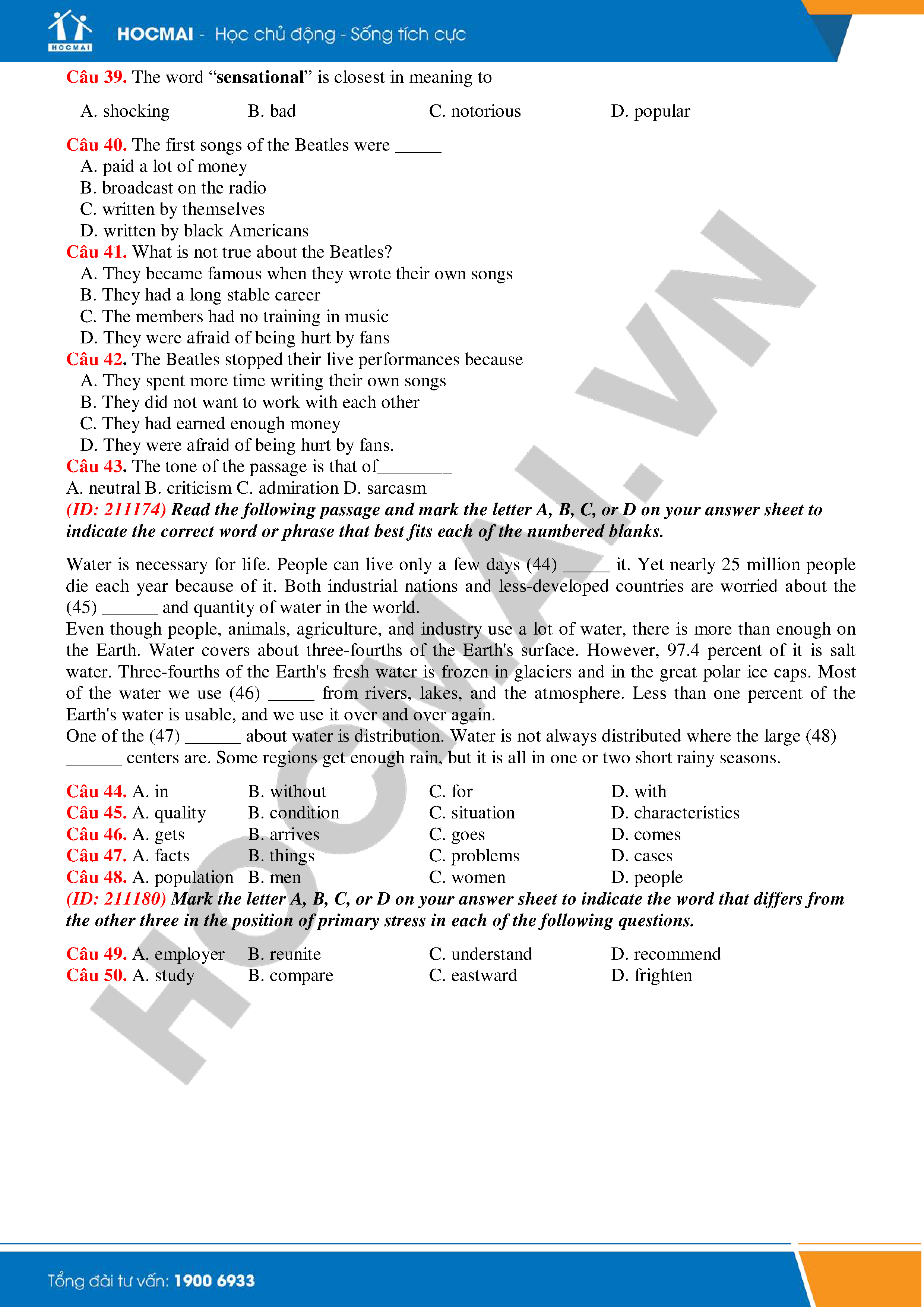 Đề thi thử THPTQG năm 2018 - Môn Tiếng Anh - THPT Hàn Thuyên - Bắc Ninh - Lần 1 là bộ đề cho HOCMAI sưu tầm với 50 câu trắc nghiệm. Bộ đề được tổng hợp kiến thức để chuẩn bị cho kì thi THPT quốc gia 2018. Các bạn cùng theo dõi nhé!
