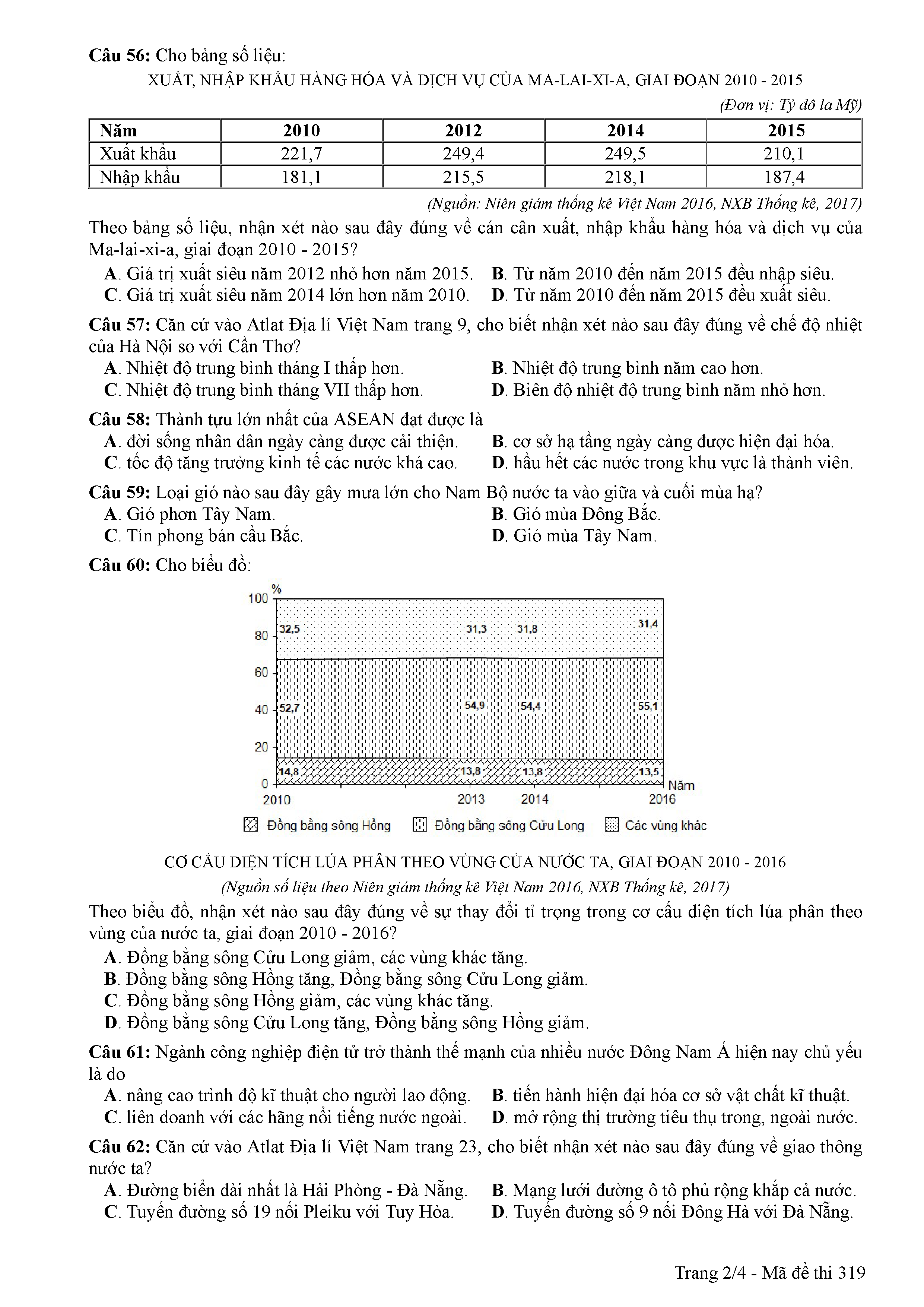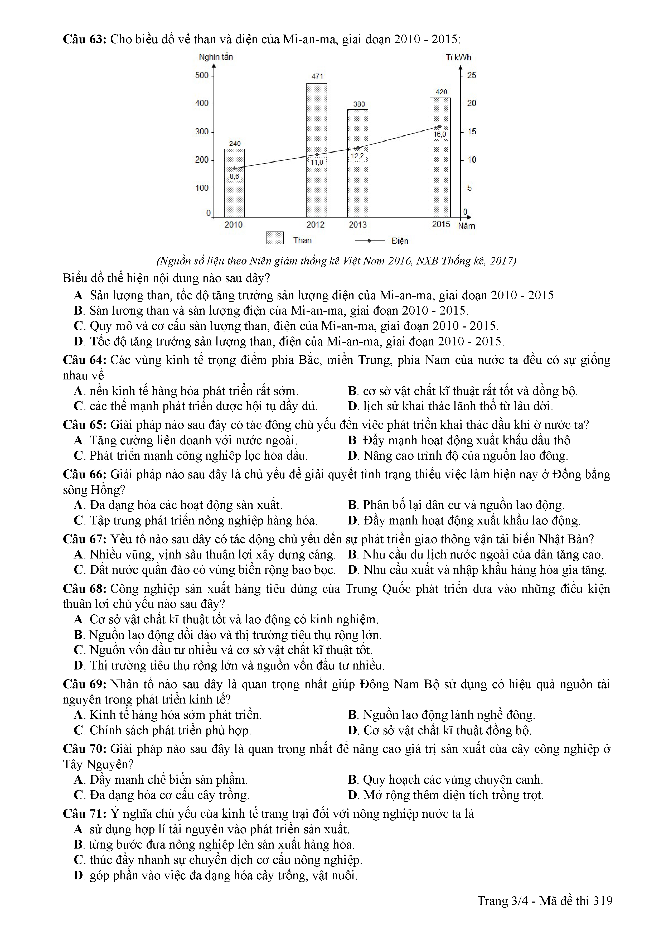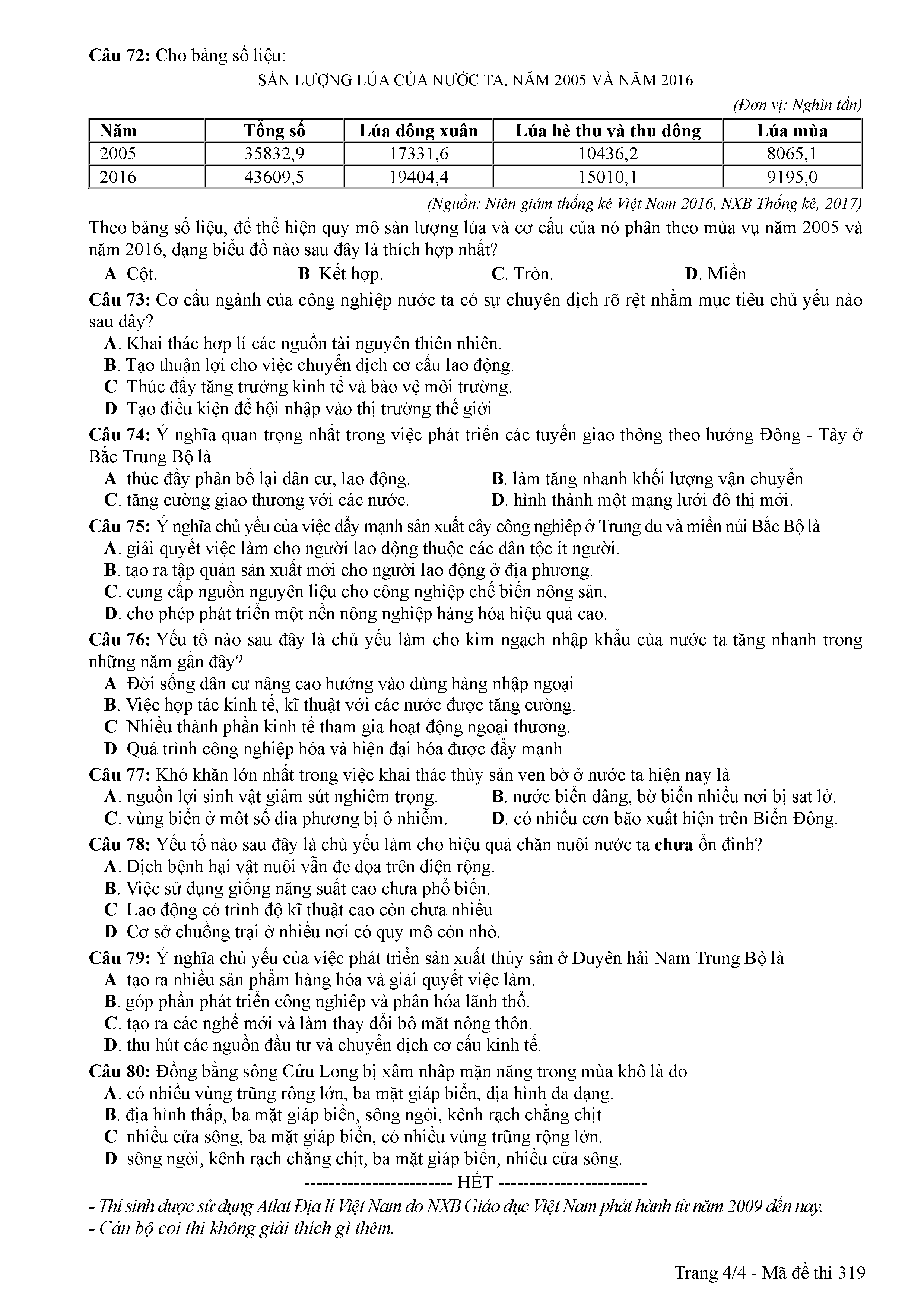 ĐỀ THI CHÍNH THỨC THPTQG NĂM 2017 - MÔN ĐỊA LÍ -MÃ ĐỀ 319