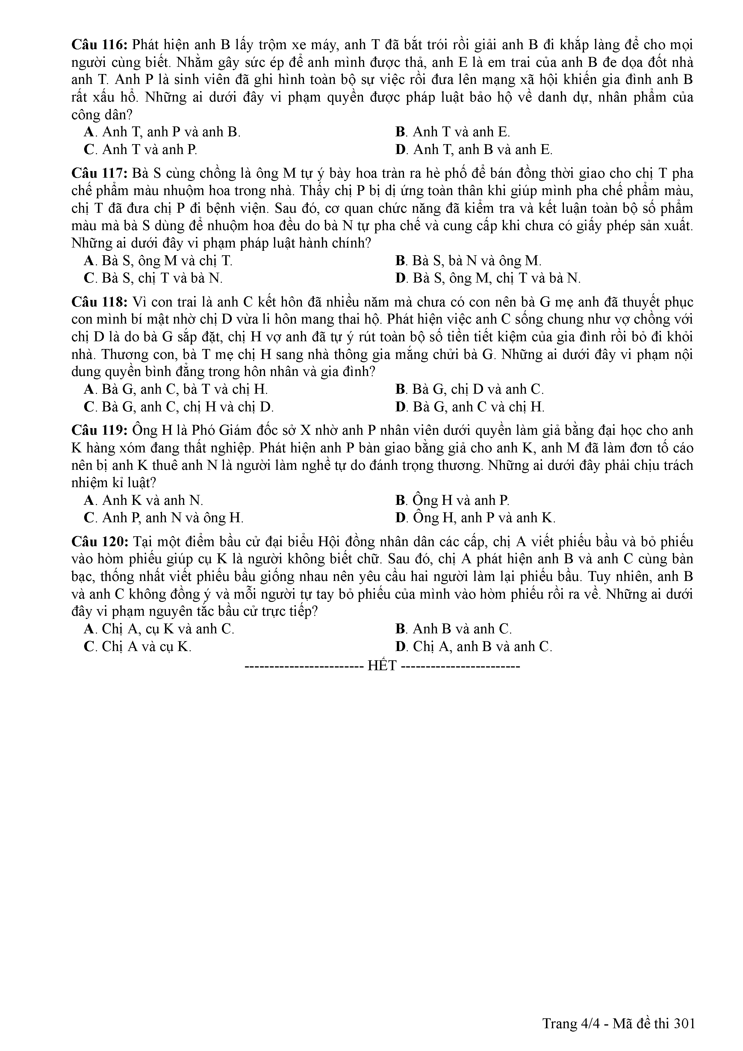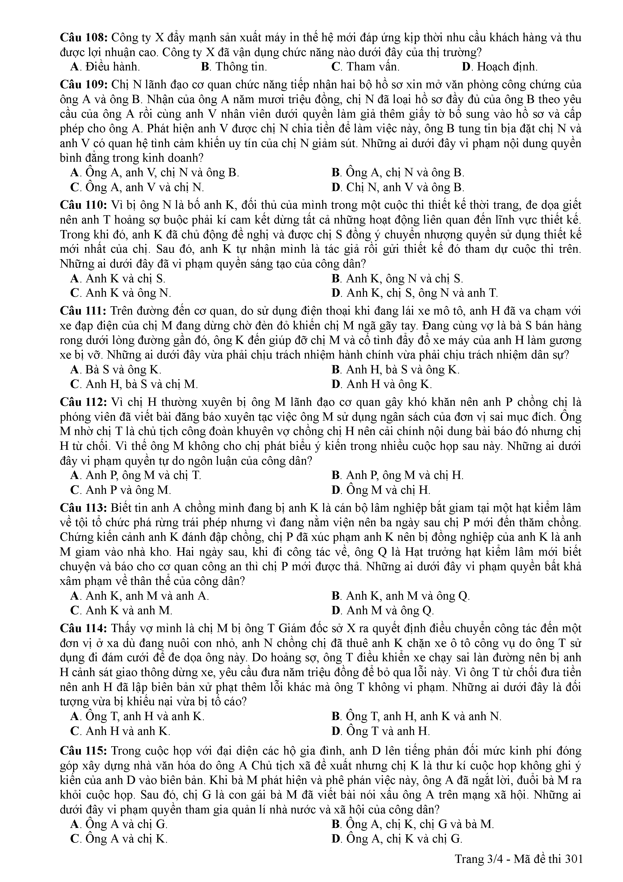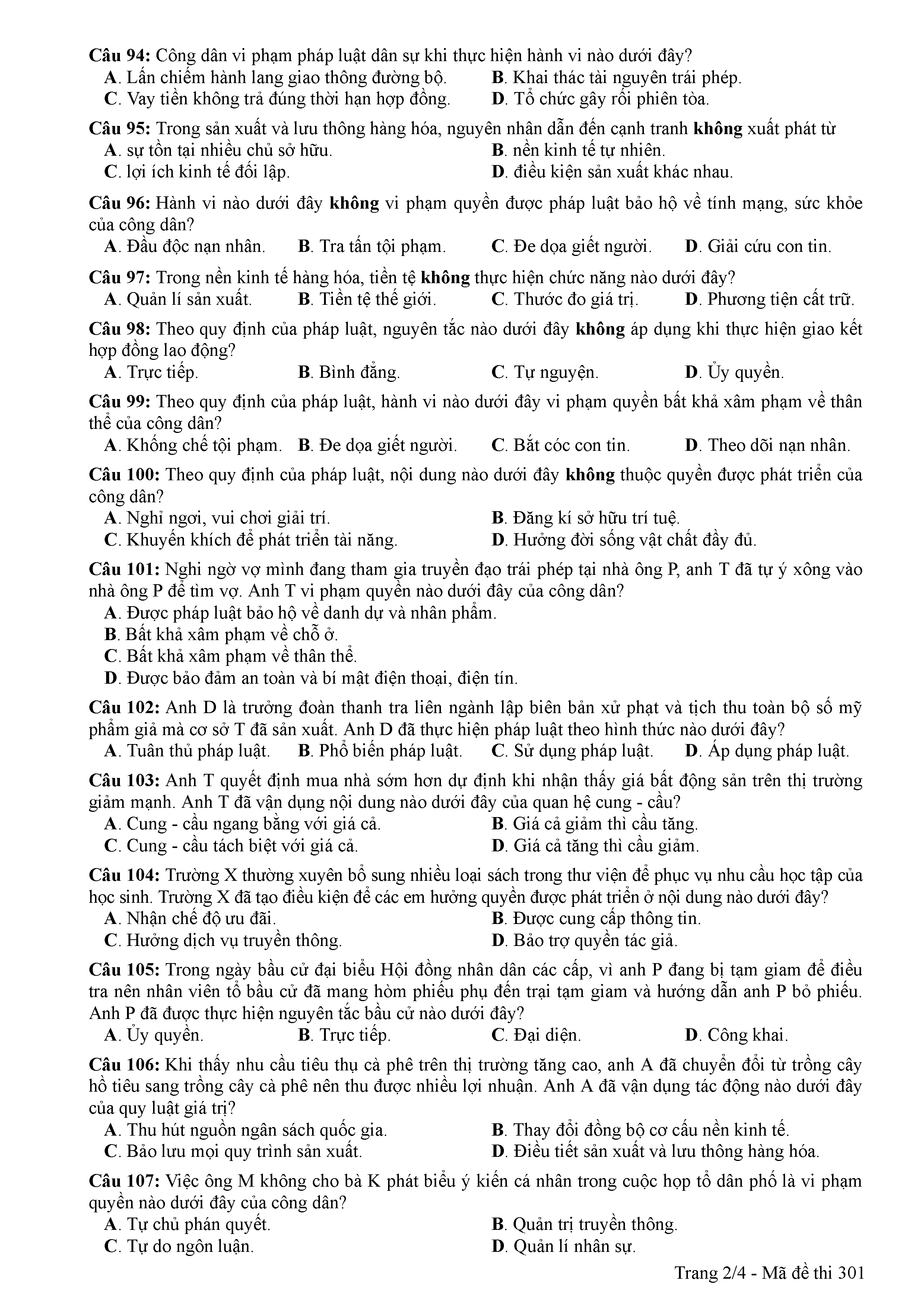ĐỀ THI CHÍNH THỨC THPTQG NĂM 2017 - MÔN GDCD -MÃ ĐỀ 301