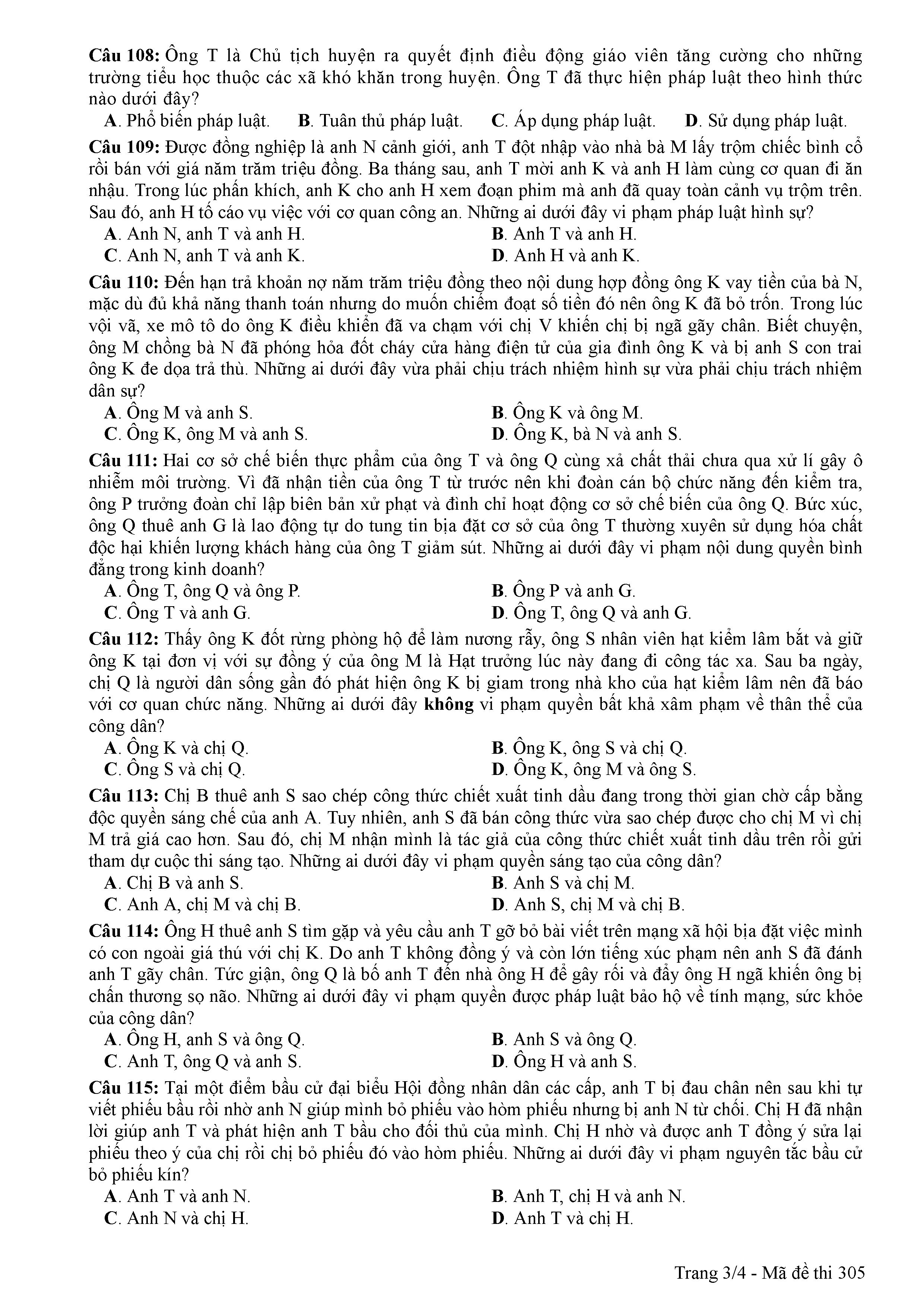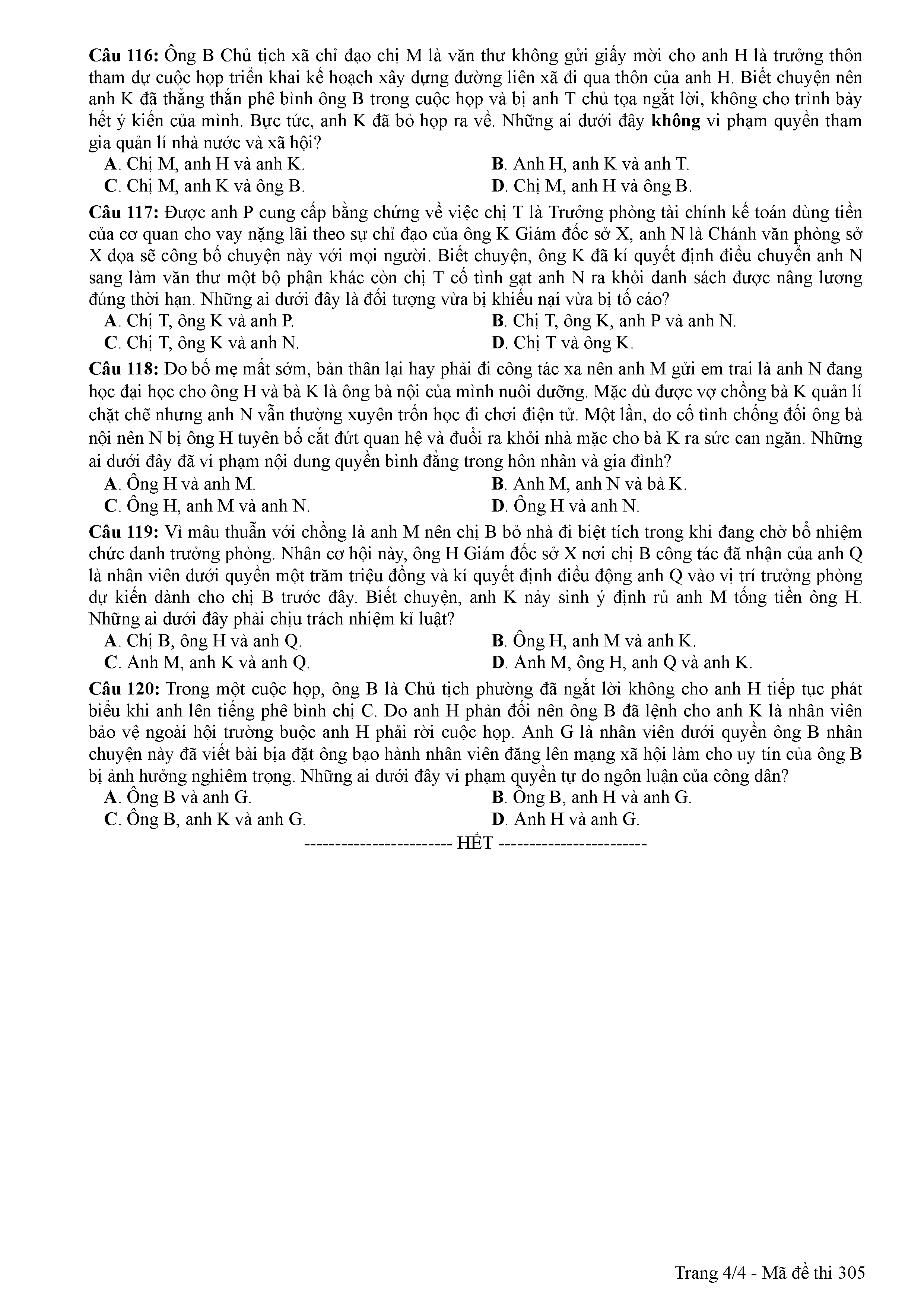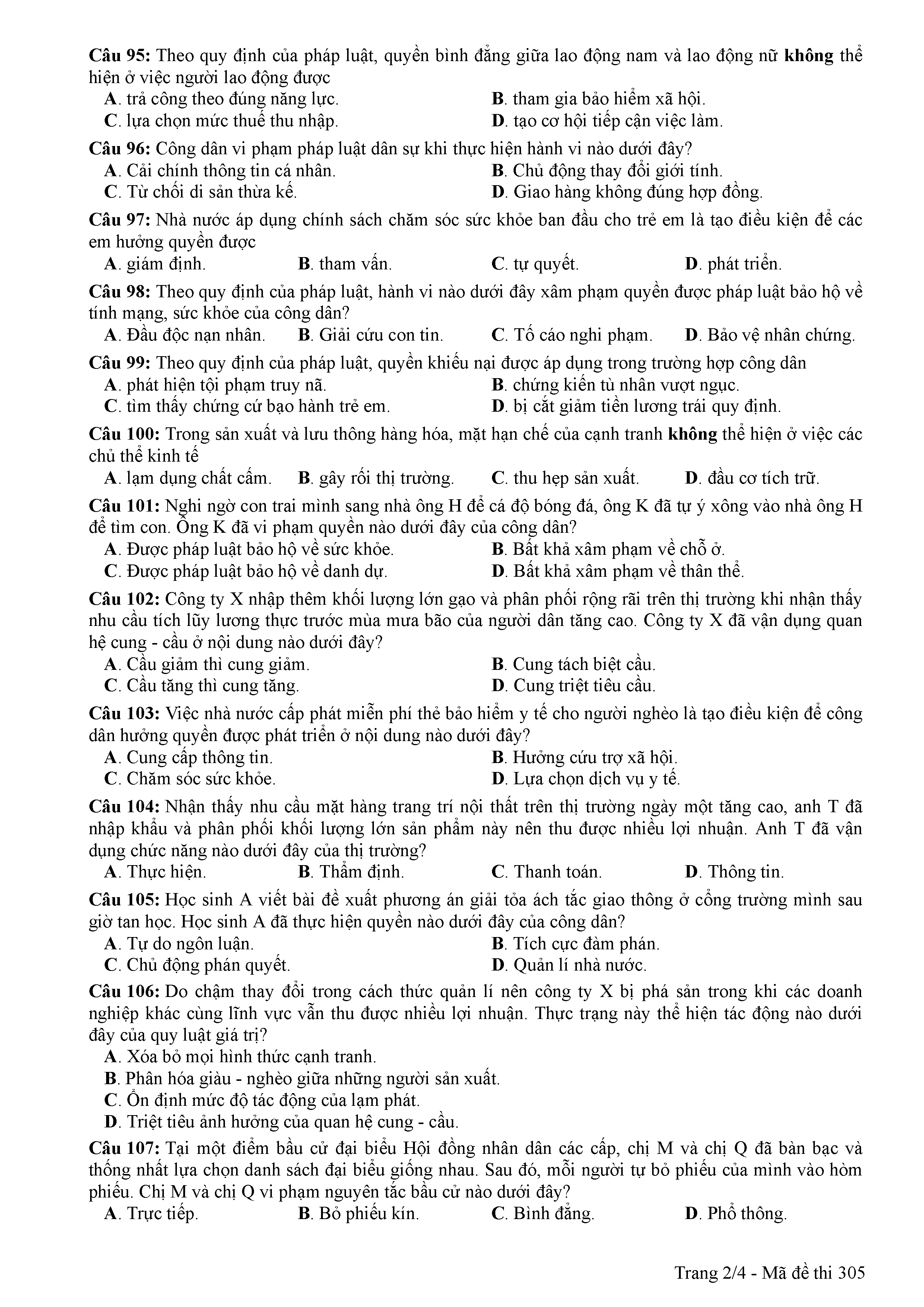 ĐỀ THI CHÍNH THỨC THPTQG NĂM 2017 - MÔN GDCD -MÃ ĐỀ 305