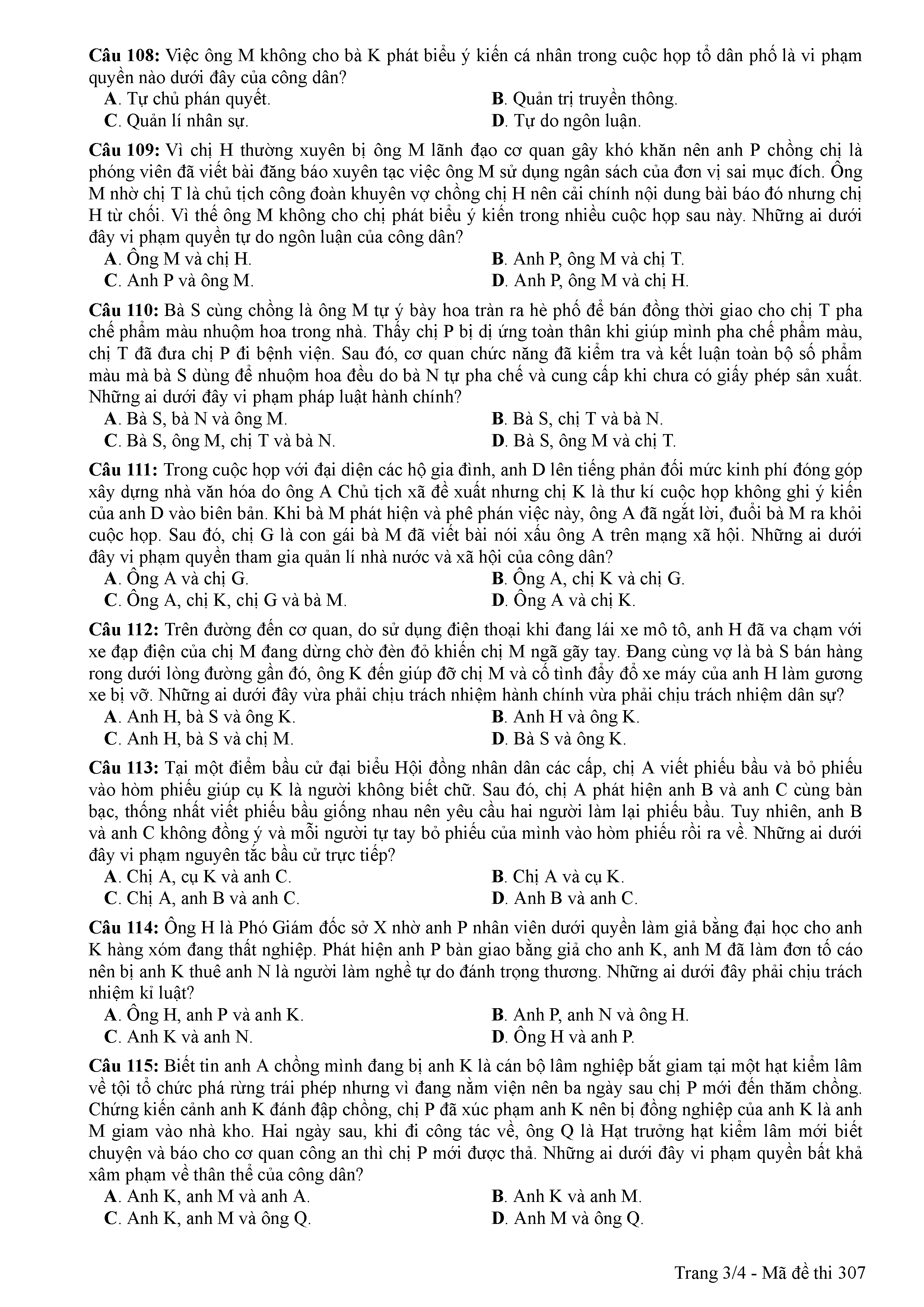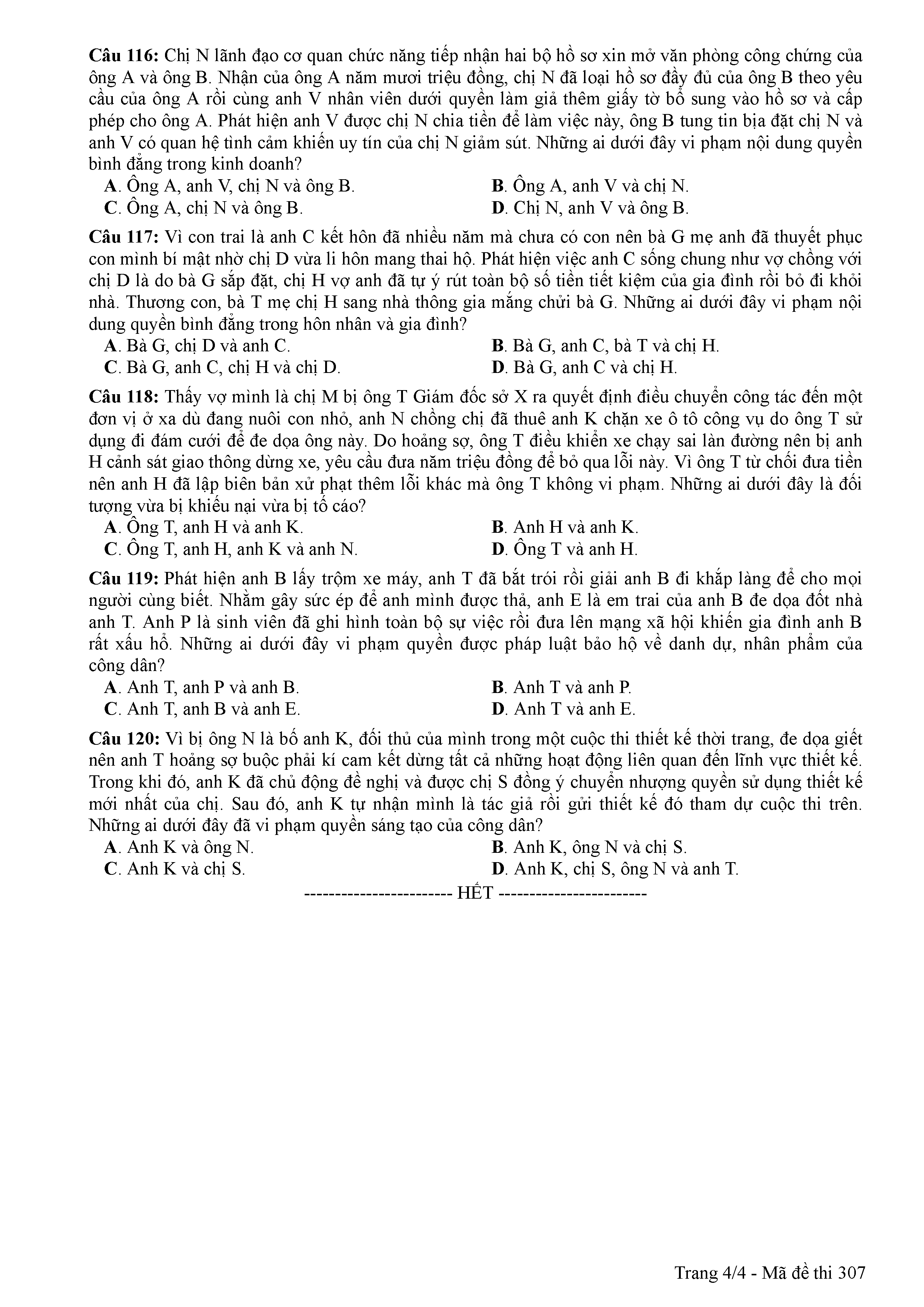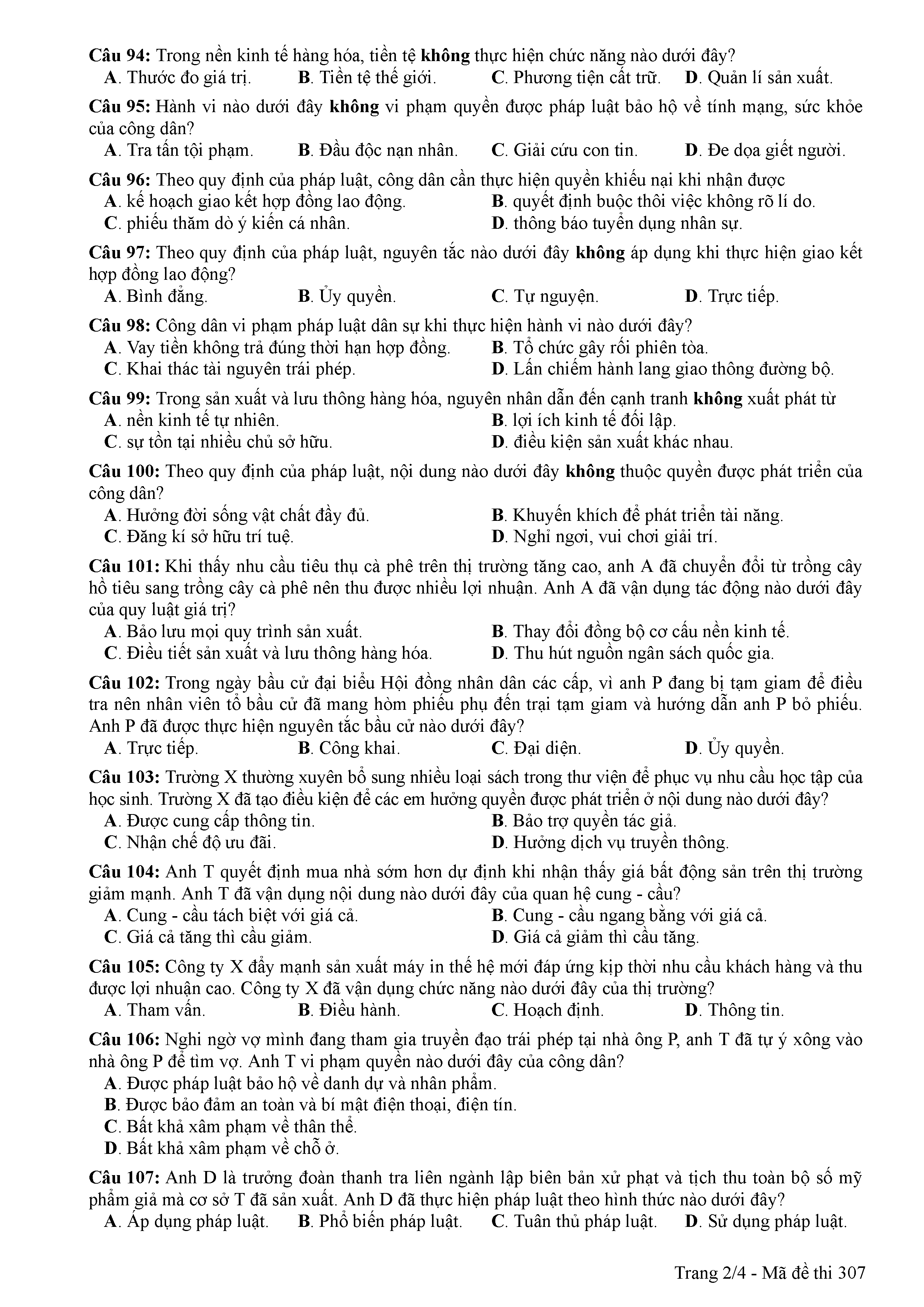 ĐỀ THI CHÍNH THỨC THPTQG NĂM 2017 - MÔN GDCD -MÃ ĐỀ 307