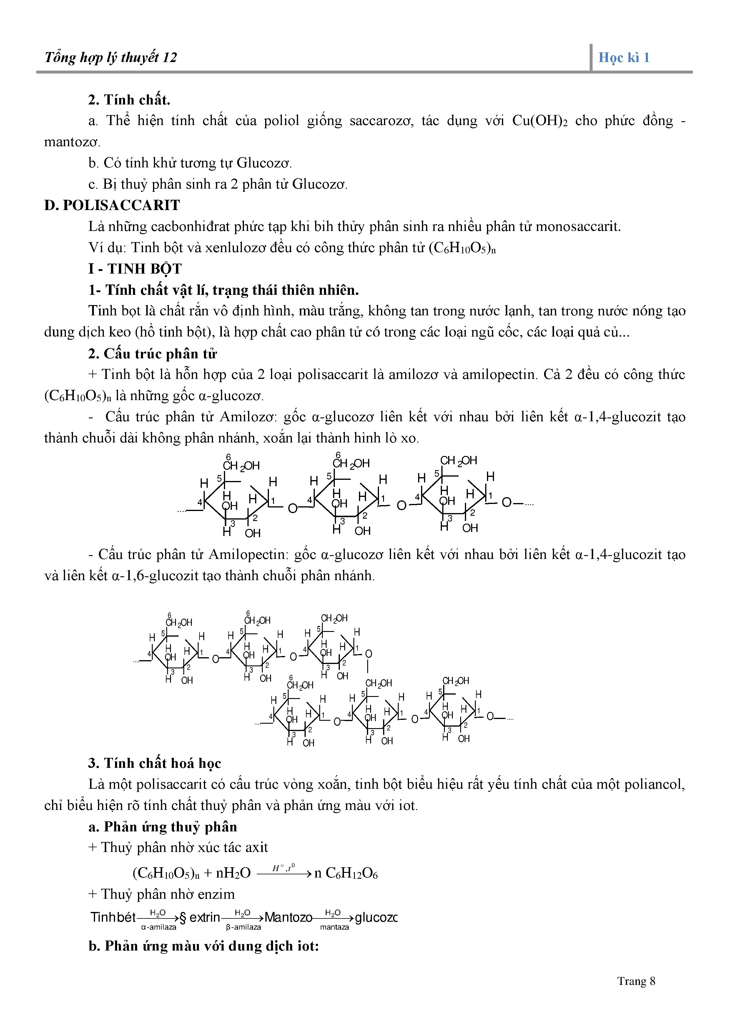+ Tinh bột: Tính chất vật lí, trạng thái tự nhiên; cấu trúc phân tử; tính chất hóa học; sự chuyển hóa trong cơ thể.