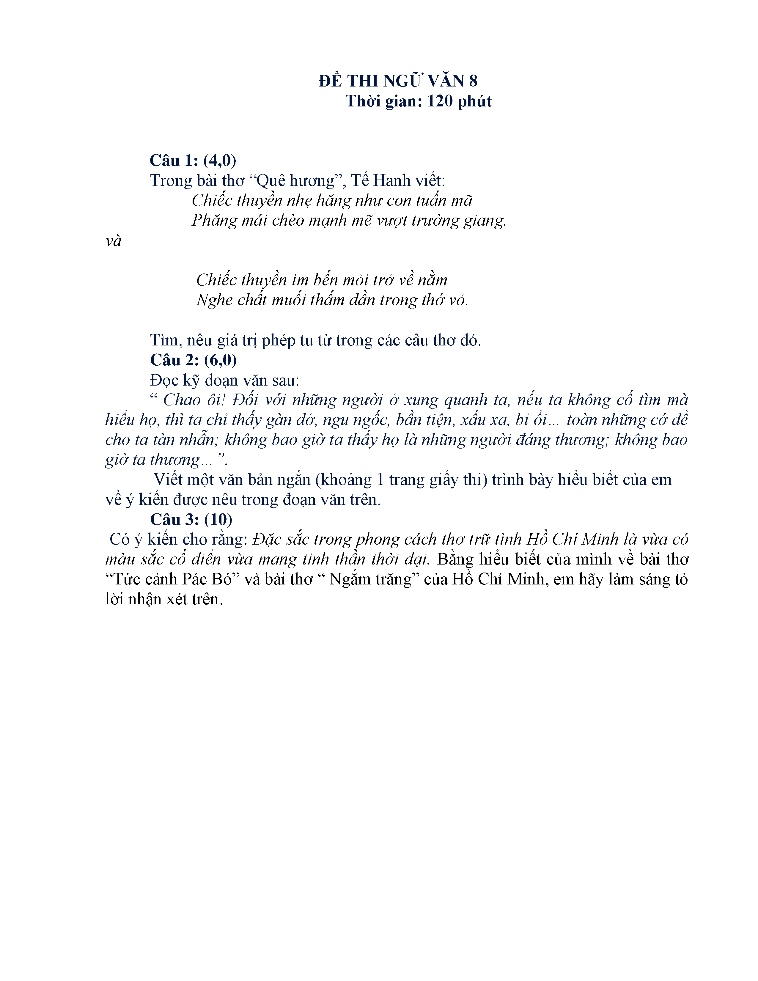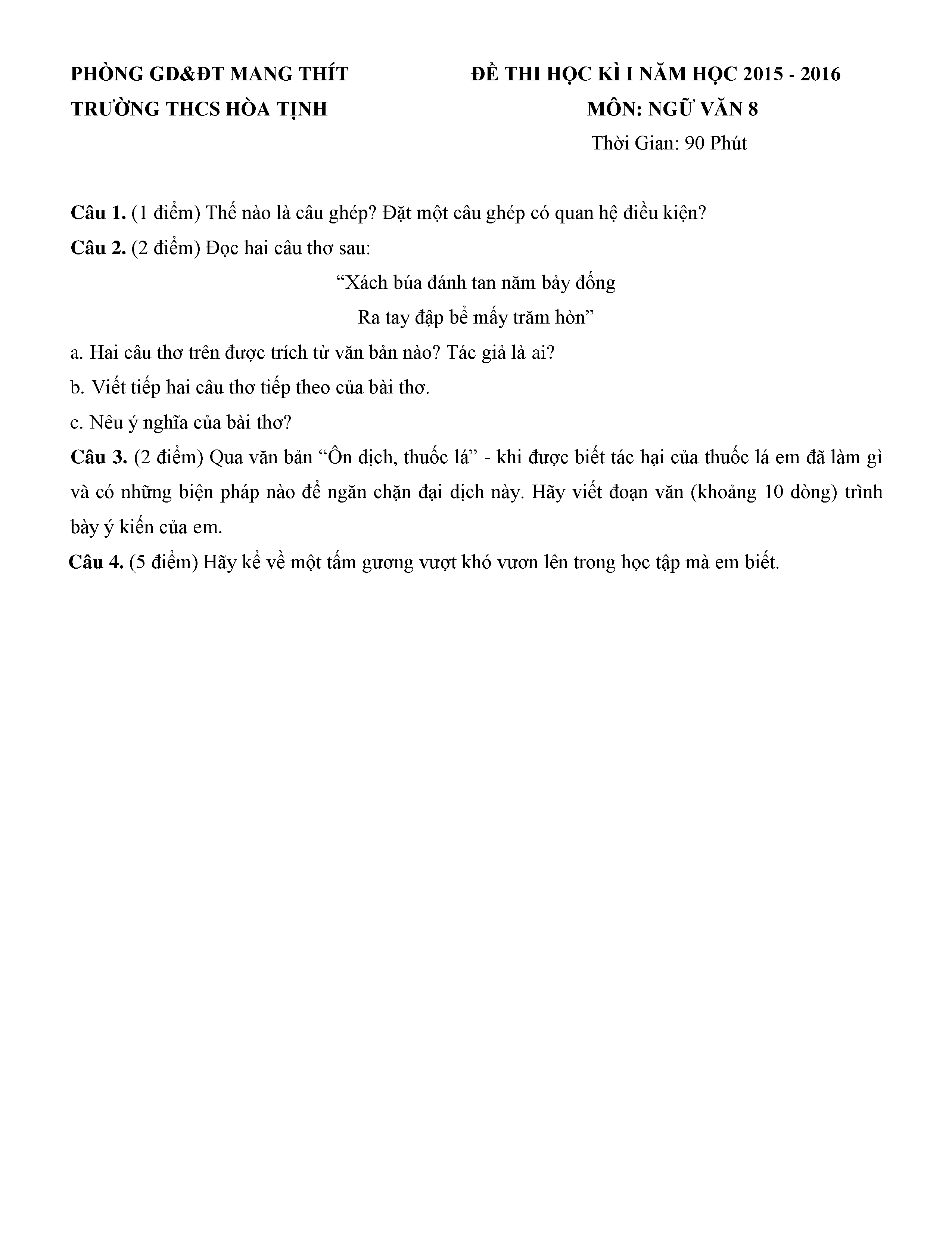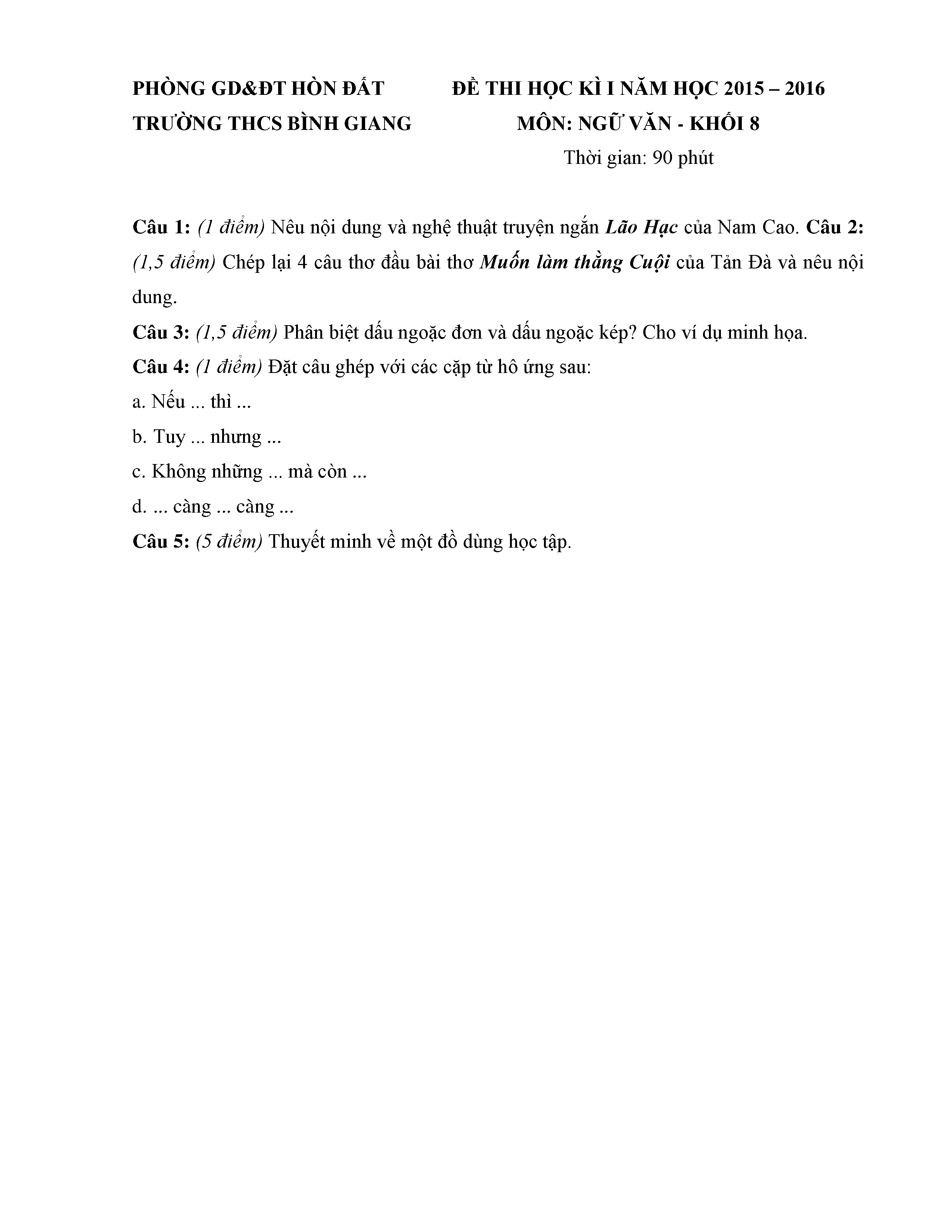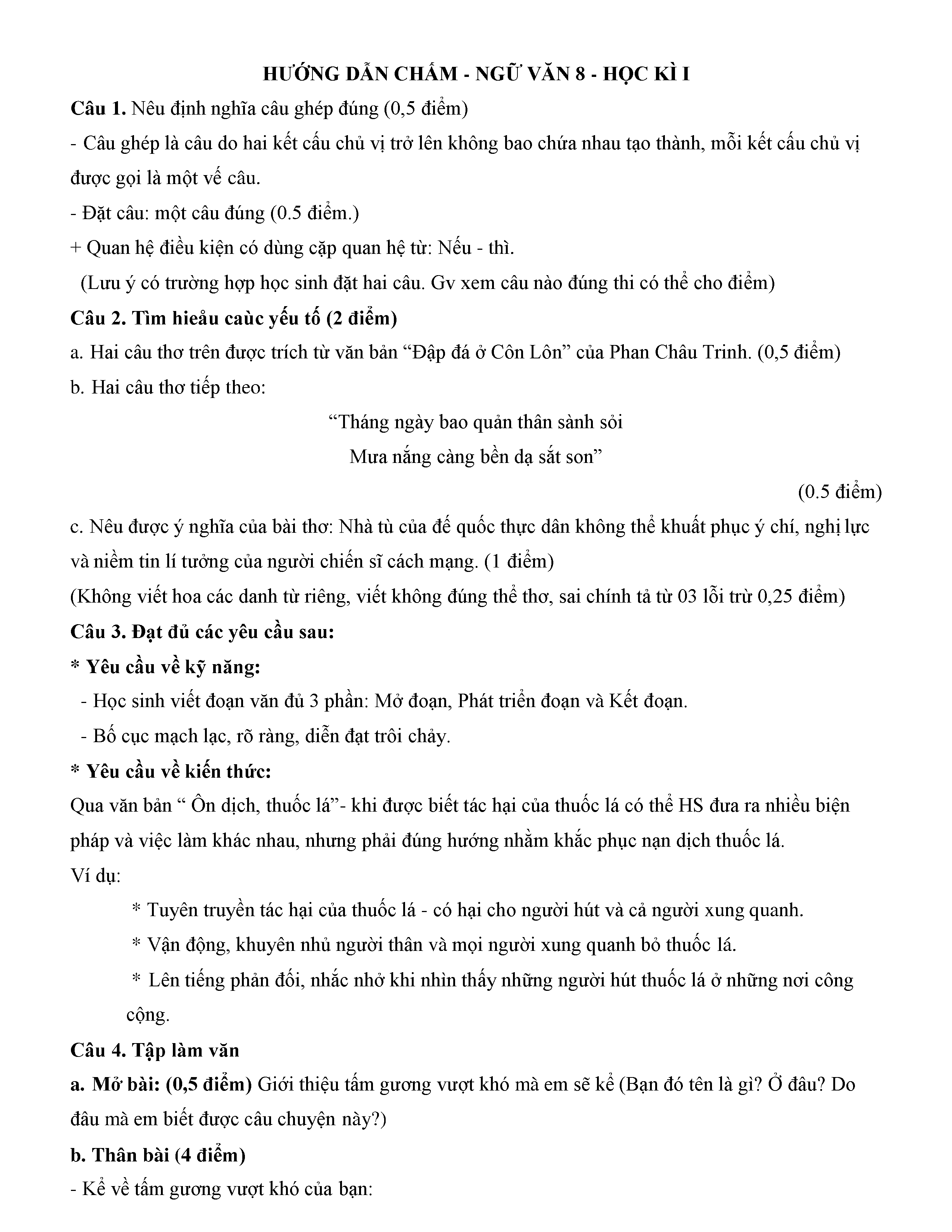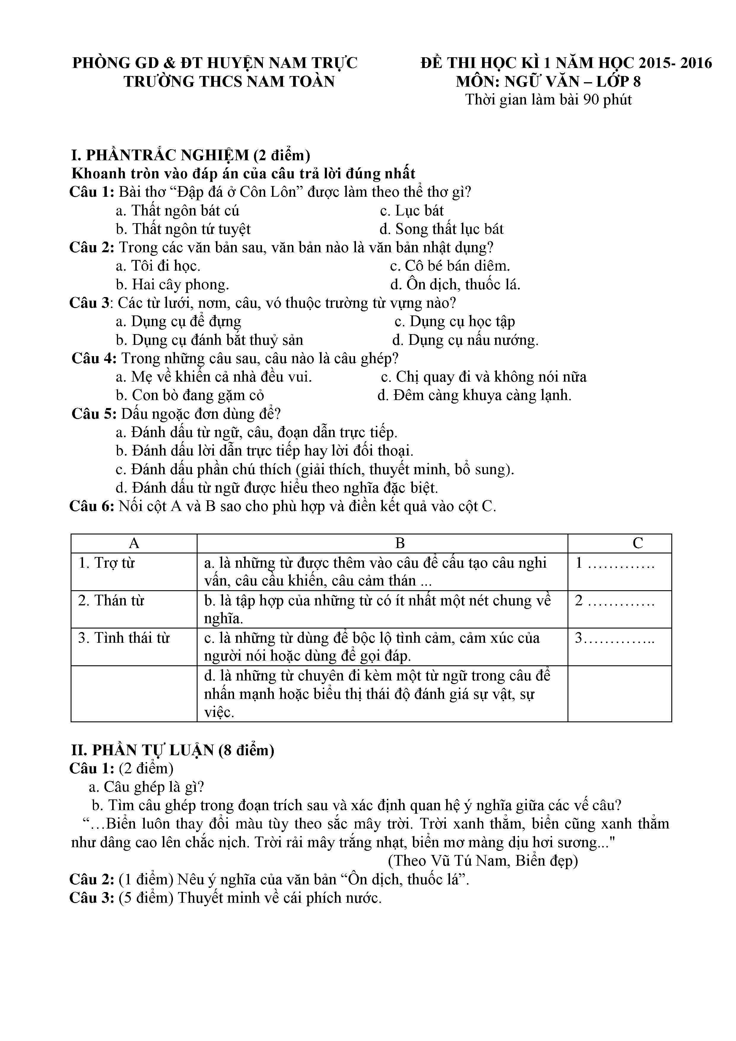 Đề thi học kì 1 lớp 8 môn Ngữ Văn (có đáp án)